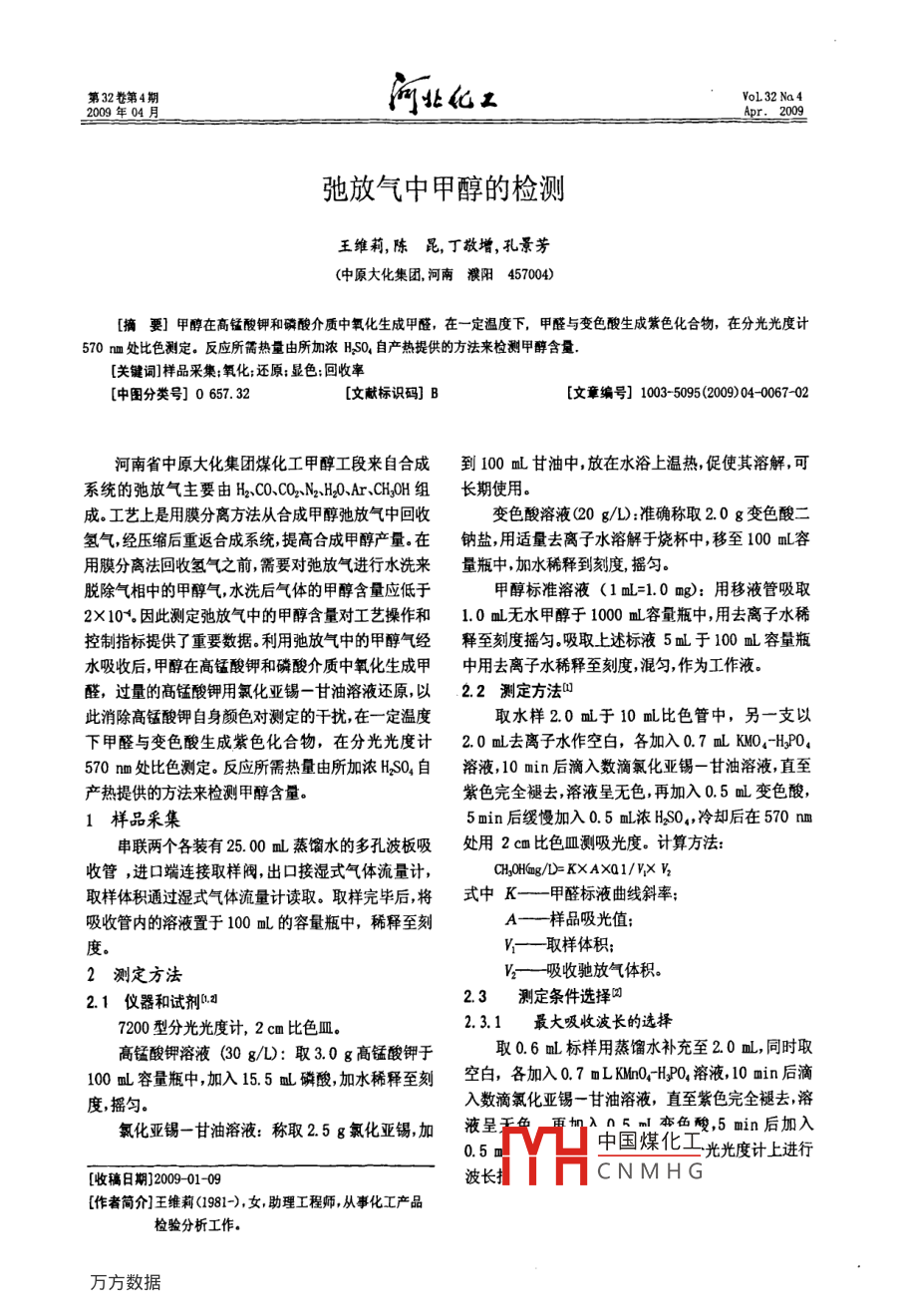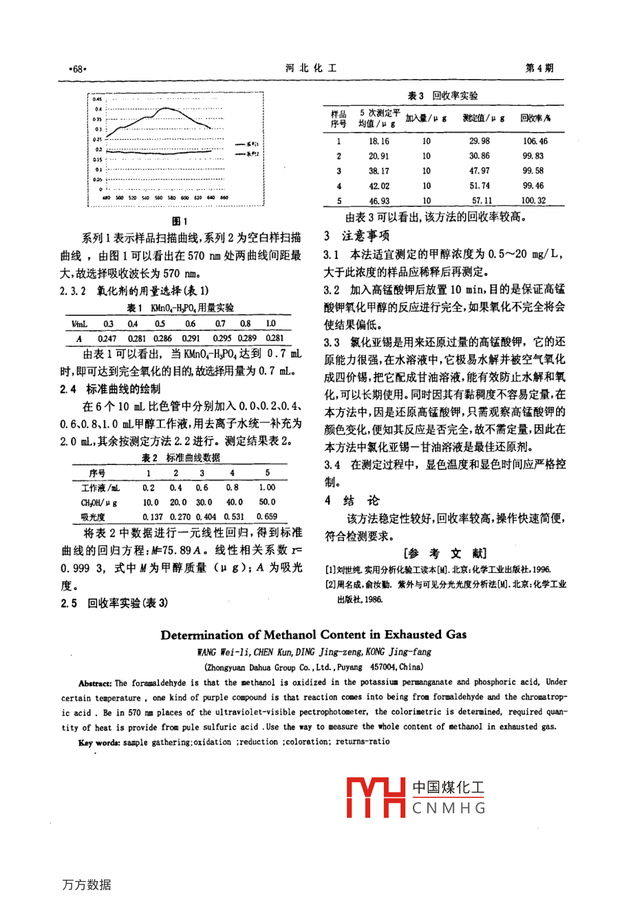 第32卷第4期32Na42009年04月弛放氣中甲醇的檢測王維莉,陳昆,丁敬增,孔景芳(中原大化集團(tuán),河南濮陽457004)[摘要甲醇在高錳酸鉀和磷酸介質(zhì)中氧化生成甲醛,在一定溫度下,甲醛與變色酸生成紫色化合物,在分光光度計570mm處比色測定。反應(yīng)所需熱量由所加濃H04自產(chǎn)熱提供的方法來檢測甲醇含量[關(guān)鍵詞]樣品采集氧化;還原:顯色:回收率[中圖分類號]0657[文獻(xiàn)標(biāo)識碼]B[文章編號]1003-5095(2009)04006702河南省中原大化集團(tuán)煤化工甲醇工段來自合成到100m甘油中,放在水浴上溫?zé)?促使其溶解,可系統(tǒng)的弛放氣主要由H2C0、CO2、N2H0Ar、CHOH組長期使用。成。工藝上是用膜分離方法從合成甲醇弛放氣中回收變色酸溶液(20g/L):準(zhǔn)確稱取20g變色酸氫氣經(jīng)壓縮后重返合成系統(tǒng)提高合成甲醇產(chǎn)量。在鈉鹽用適量去離子水溶解于燒杯中,移至100m容用膜分離法回收氫氣之前需要對弛放氣進(jìn)行水洗來量瓶中加水稀釋到刻度搖勻。脫除氣相中的甲醇?xì)?水洗后氣體的甲醇含量應(yīng)低于甲醇標(biāo)準(zhǔn)溶液(1皿L=1.0mg):用移液管吸取2×104因此測定弛放氣中的甲醇含量對工藝操作和1.0皿無水甲醇于1000m容量瓶中用去離子水稀控制指標(biāo)提供了重要數(shù)據(jù)。利用弛放氣中的甲醇?xì)饨?jīng)釋至刻度搖勻。吸取上述標(biāo)液5皿于100毗容量瓶水吸收后,甲醇在高錳酸鉀和磷酸介質(zhì)中氧化生成甲中用去離子水稀釋至刻度混勻,作為工作液醛,過量的高錳酸鉀用氯化亞錫一甘油溶液還原以22測定方法此消除高錳酸鉀自身顏色對測定的干擾,在一定溫度取水樣20叫于10m比色管中,另一支以下甲醛與變色酸生成紫色化合物,在分光光度計2.0叫去離子水作空白,各加入0.7LKMo4-HP0570m處比色測定。反應(yīng)所需熱量由所加濃HS04自溶液,10min后滴入數(shù)滴氯化亞錫一甘油溶液直至產(chǎn)熱提供的方法來檢測甲醇含量。紫色完全褪去溶液呈無色,再加入0.5m變色酸,1樣品采集5min后緩慢加入05叫濃HS0O4冷卻后在570nm串聯(lián)兩個各裝有25.00叫L蒸餾水的多孔波板吸處用2cm比色皿測吸光度。計算方法:收管,進(jìn)口端連接取樣閥,出口接濕式氣體流量計,CH OHg/D-KXAXQ1/YX V2取樣體積通過濕式氣體流量計讀取。取樣完畢后將式中K—甲醛標(biāo)液曲線斜率吸收管內(nèi)的溶液置于100mL的容量瓶中,稀釋至刻A—樣品吸光值;度V取樣體積2測定方法v吸收馳放氣體積。21儀器和試劑223測定條件選擇7200型分光光度計,2cm比色皿2.31最大吸收波長的選擇高錳酸鉀溶液(30g/L:取30g高錳酸鉀于取0.6叫標(biāo)樣用蒸餾水補(bǔ)充至2.0mL,同時取100c容量瓶中加入155磷酸加水稀釋至刻空白,各加入0.7mLm0HPo,溶液10min后滴度,搖勻。入數(shù)滴氯化亞錫一甘油溶液,直至紫色完全褪去溶氯化亞錫一甘油溶液:稱取2.5g氯化亞錫,加液呈YHEn5m痱伍酸,5min后加入0.5中國煤化工光光度計上進(jìn)行[收稿日期]200901-09波長打CNMHG作者簡介]王維莉(1981-),女助理工程師從事化工產(chǎn)品檢驗分析工作河北化工第4期表3回收率實驗樣品5汰測定平加入量/葛測定值/g回率20.9130.8699.831047.9799.5842025700.32圖由表3可以看出,該方法的回收率較高系列1表示樣品掃描曲線系列2為空白樣掃描3注意事項曲線,由圖1可以看出在570mm處兩曲線間距最31本法適宜測定的甲醇濃度為0.5~20mg/L,大,故選擇吸收波長為570mm。大于此濃度的樣品應(yīng)稀釋后再測定。232氧化劑的用量選擇(表1)3.2加入高錳酸鉀后放置10min,目的是保證高錳表1Kn0HP0用量實驗酸鉀氧化甲醇的反應(yīng)進(jìn)行完全如果氧化不完全將會06070810使結(jié)果偏低。02470281028602910295028902813.3氯化亞錫是用來還原過量的高錳酸鉀,它的還由表1可以看出,當(dāng)KQB0達(dá)到0.7毗原能力很強(qiáng),在水溶液中它極易水解并被空氣氧化時,即可達(dá)到完全氧化的目的故選擇用量為07m成四價錫,把它配成甘油溶液,能有效防止水解和氧2.4標(biāo)準(zhǔn)曲線的繪制化,可以長期使用同時因其有黏稠度不容易定量在在6個10毗比色管中分別加入0002.0.4、本方法中,因是還原高錳酸鉀,只需觀察高錳酸鉀的0.6、0.8、1.0叫甲醇工作液,用去離子水統(tǒng)一補(bǔ)充為顏色變化,便知其反應(yīng)是否完全,故不需定量因此在2.0皿L,其余按測定方法22進(jìn)行。測定結(jié)果表2本方法中氯化亞錫一甘油溶液是最佳還原劑表2標(biāo)準(zhǔn)曲線數(shù)據(jù)3.4在測定過程中,顯色溫度和顯色時間應(yīng)嚴(yán)格控序號23工作液m0.2040.60.81.00制HOH/u10.020.030.040.050.04結(jié)論吸光度0.1370.2700.4040.5310.659該方法穩(wěn)定性較好,回收率較高,操作快速簡便,將表2中數(shù)據(jù)進(jìn)行一元線性回歸,得到標(biāo)準(zhǔn)符合檢測要求。曲線的回歸方程:M75.89A。線性相關(guān)系數(shù)r[參考文獻(xiàn)]0.9993,式中M為甲醇質(zhì)量(μg);A為吸光]劉世純實用分析化驗工讀本.北京:化學(xué)工業(yè)出版社,196度[2]周名成,俞汝勤.紫外與可見分光光度分析法[M]北京:化學(xué)工業(yè)25回收率實驗(表3)出版社1986Determination of Methanol Content in Exhausted GasFANG Wei-li, CHEN Kun, DING Jing-zeng, KONG Jing-fangZhongyuan Dahua Group Co, Ltd, Puyang 457004, China)bstract:The formaldehyde is that the methanol is oxidized in the potassium permanganate and phosphoric acid, Undercertain temperature, one kind of purple compound is that reaction comes into being from formaldehyde an