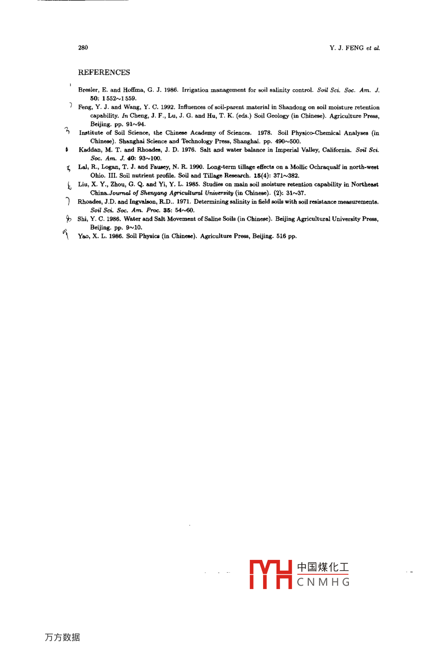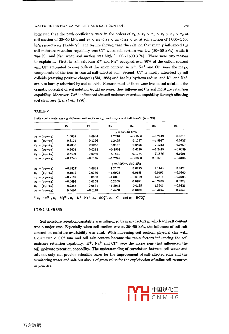 Pedosphere 10(3): 275~280, 20004422751ISSN 1002-0160/CN 32-1315/P回2000 SCIENCE PRES, BEIJINGCorrelation Between Soil Water Retention Capability andSoil Salt ContentFENG YONGJUNI, YANG JINGSONG2 and ZHENG JIUHUA1 College of Resource and Environment, Shandong Agriculture University, Taian 271018 (China)2 Institute of Soil Science, Chinese Academy of Sciences, Nanjing 210008 (China)(Received April 25, 2000; revised June 7, 2000)ABSTRACTThe soil moisture retention capability of Chao soil and coastal saline Chao soil in Shandong and Zhejiangprovincee were measured by pressure membrane method. The main factors infuencing soil moisture retentioncapability were studied by the metbods of correlation and path analyses. The results indicated that < 0.02mmphyaical clay and soil salt content were the main factors infuencing soil moisture retention capability. At soilsuction of 30~50 kPa, the soil salt content would be the dominant factor.Key Words; infuencing factor, physical clay, soil moisture retention capability, soil saltINTRODUCTIONSoil moisture is one of the main fertility factors directly affecting the growth and de-velopment of plants. Soil moiature is also the source of the water for all terrestrial plants(Yao, 1986). There is a close relationship between soil moisture retention capability and soilphysico- chemical properties such as mechanical composition, microaggregate, specfic surfacearea and organic matter content (Feng and Wang, 1992). However, litte quantitative analy-sis of soil salt effect on soil moisture retention capability has been found in published papers.In the present work soil moisture retention capability and physico-chemistry of Chao soil,coastal salinized soil and salinized Chao soil in Shandong and Zhejiang Provinces and theircorrelation were investigated to provide scientifc bases for soil improvement, field moisturecontrol and economic water utilization in agriculture.MATERIALS AND METHODSThe soil samples used in this study were Chao soil, coastal salinized Chao soil, salinesoil and continental salinized soil collected from Shouguang, Guangrao, Hekou, Lijin andBinzhou in Shangdong Province and Xiaoshan in Zhejiang Province, respectively. The sam-ples of each type of soil were taken from the surface layer of 0~20 cm and 20~40 cm. Soilorganic matter was tested by Walkley-Black wet oxidation method, soil mechanical com-position (based on international system) by hydrometer method (Institute of Soil Science,the Chinese Academy of Sciences, 1978), soil salt content by electric conductivity and dry中國煤化工MYHCNMHG276Y. J. FENG et al.evapotranspiration method (Rhoades and Ingvalson, 1971) and soil salt ions by routine de-termination method. Soil bulk density was measured by oven-drying method. Soil moistureretention capability was measured by presure membrane method at pressures of 10~30 kPa,30~50 kPa, 50~100 kPa, 100~300 kPa, 300~500 kPa, 500~1 000 kPa, and 1 000~1 500 kPa.RESULTS AND DISCUSSIONSoil suction for water absorption was caused by three factors: a) molecular attractionproduced by soil particle size or specific surface area; b) capillary force produced on water-airinterface in soil pore space; c) bydrophilic property and eletric property of soil colloid (Liuet al, 1985). But soil moisture, especially in salt-affected soil, was not pure water, becauseit constantly dissolves and carries many kinds of easily soluble salts (Kaddan and Rhoades,1976). In order to study the main factors that affected soil moisture retention ability, notonly moisture loss rates of diferent soils with diferent suctions (Table I) but also mainphysico-chemical properties (Table II) were measured. The results of correlation and pathanalysis are shown in Tables III and IV.TABLEIMcan moisture loss rates of diferent soilsSoil profleSuction (kPa)10~3030~5050~100 100~300300~500500~1 0001 000~1 500_%95H1016.8112.9010.722.250.320.7395H1028.3811.0412.822.500.690.0895H2017.548.425.723.892.380.480.8195H2027.2610.0812.445.930.850.520.8995H3016.569.8811.146.520.930.41.095H3025.828.8311.277.761.20.580.S95X02-13.056.683.411.990.771.5895X02-27.865.115.312.201.031.5295S003-15.707.529.445.170.650.9495S003-26.499.837.594.340.97.2195G01-18.565.957.304.651.352.3695G01-29.065.431.862.652.691.311.2795G02-119.004.985.992.861.001.1495G02-27.283.994.674.351.2695B01-17.323.954.902.876.362.161.2595B01-23.554.107.941.09.5595B02-18.093.474.213.631.9095B02-23.253.314.327.243.042.1495B03-18.938.046.615.400.9895B03-29.526.6712.800.530.5795B04-17.729.0217.391.10.9795B04-210.312.101.532.631.0695B05-16.895.101.880.861.5595B05-29.185.206.292.402.031.1895B06-19.114.782.661.961.9295B06-29.089.161.81 .2.891.221.30中國煤化工MYHCNMHGWATER RETENTION CAPABILITY AND SALT CONTENT277TABLE IIPhysical and chemical properties of the soilsSoil profleSaltOrganic matterMechanical composition< 0.02mm< 0.002mmgkg-1%95H1010.30.74421.164.0395H102 .0.637 .21.364.2395H2010.95424.595.0495H202).50.71925.225.4595H301.40.91049.619.9295H302).40.76549.249.7395X02-11.02843.1727.3695X02-2.60.90054.5628.8295S003-10.45532.7513.2295S003-20.64931.0612.9795G01-2).70.93359.5421.820.70.93059.1624.4895G02-10.40.82834.4622.0595G02-21.31053.3422.3895B01-125.01.42473.184.395B01-20.94992.378.36.095B02-17.01.61478.8813.0195B02-28.20.86590.956.6795B03-17.60.85147.465.5295B03-216.80.51828.883.4695B04-13.70.75128.848.1295B04-20.27518.6095B05-11.16246.2817.3295B05-20.59741.0116.8595B06-1.11,23048.4719.8095B06-20.84149.2720.36At a low soil suction (30~50 kPa), there were obviously negative correlations betweensoil suction (y) and the main soil physico chemical properties, including soil salinity (x1),organic matter (x2), < 0.02 mm physical clay (x3), and < 0.002 mm clay (zs), which couldaffect soil water potential; and the path coficint analysis showed that the path coeficientwas in the order ofx1 > x4> x3> 22 (Table II). It may be seen that when soil suction wasat 30~50 kPa, soil salt content was a vital factor infuencing soil moisture regime, and soilwater-h