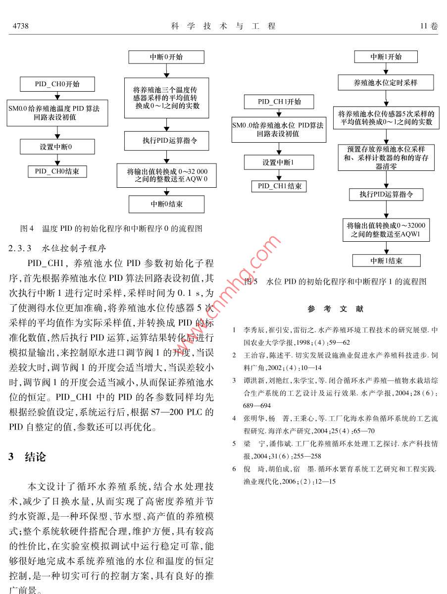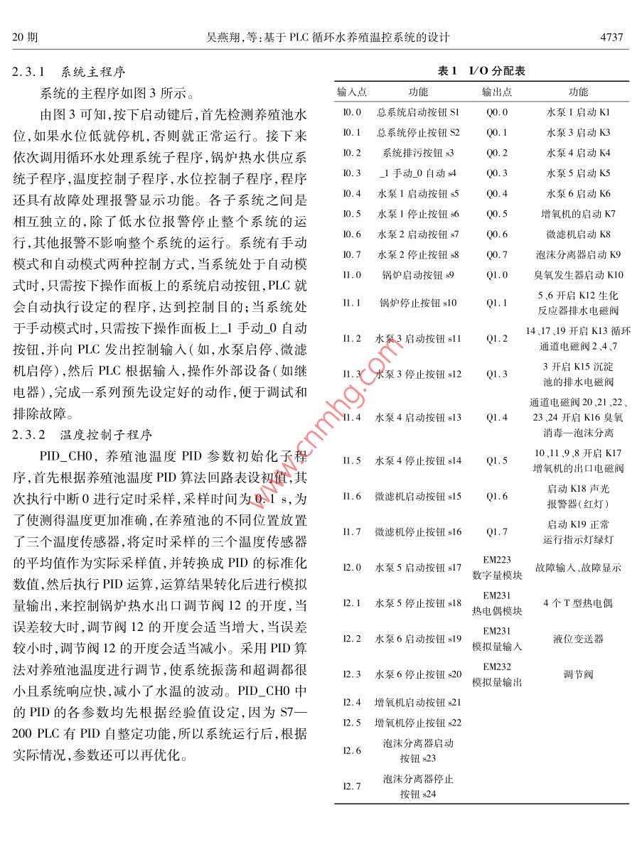 第11卷第20期20l年7月科學(xué)技術(shù)與工程Vol 11 No 20 July 2011671-1815(2011)20-4734-0nce lechnologyngneerInC2011 Sci Tech. Engng農(nóng)業(yè)科學(xué)基于PLC循環(huán)水養(yǎng)殖溫控系統(tǒng)的設(shè)計(jì)吳燕翔胡詠梅劉雨青(上海海洋大學(xué)工程學(xué)院,上海201306)摘要針對(duì)目前國(guó)內(nèi)水產(chǎn)養(yǎng)殖監(jiān)控系統(tǒng)較落后的研究現(xiàn)狀,設(shè)計(jì)了采用西門子7—200PLC的循環(huán)水養(yǎng)殖溫控系統(tǒng),采用PD控制算法,對(duì)養(yǎng)殖池的水位和溫度進(jìn)行實(shí)時(shí)監(jiān)控,實(shí)現(xiàn)養(yǎng)殖池溫度和水位的恒定控制。詳細(xì)介紹了系統(tǒng)的整體控制方案工作原理,并給出了系統(tǒng)的軟、硬件結(jié)構(gòu)設(shè)計(jì),有效地實(shí)現(xiàn)了系統(tǒng)的邏輯控制、安全控制、故障顯示及故障處理。關(guān)健詞 PLC PID算法循環(huán)水養(yǎng)殖系統(tǒng)水位溫度中圖法分類號(hào)S951.41TP273.1;文獻(xiàn)標(biāo)志碼A近年來(lái),國(guó)外水產(chǎn)養(yǎng)殖的技術(shù)發(fā)展較快,在水位進(jìn)行實(shí)時(shí)監(jiān)控,實(shí)現(xiàn)養(yǎng)殖池溫度和水位的恒定體消毒、凈化,池底排污,增氧及控溫方面,幾乎采控制。用了現(xiàn)代所有可以引用的先進(jìn)技術(shù),水產(chǎn)養(yǎng)殖已經(jīng)達(dá)到相當(dāng)高的自動(dòng)化程度1。但我國(guó)漁業(yè)現(xiàn)代化1系統(tǒng)的工藝設(shè)計(jì)和整體控制方案起步較晩,現(xiàn)代化水產(chǎn)養(yǎng)殖應(yīng)具備的高溶氧、控溫水質(zhì)凈化技術(shù)還比較落后,而從國(guó)外直接引進(jìn)現(xiàn)代1.1工藝設(shè)計(jì)化的養(yǎng)殖設(shè)備和控制系統(tǒng)價(jià)格高,運(yùn)行成本高2本系統(tǒng)采用循環(huán)水養(yǎng)殖系統(tǒng)的工藝36,結(jié)合在國(guó)內(nèi)無(wú)法推廣普及。因此,研制一種適合于我國(guó)水處理技術(shù),實(shí)現(xiàn)高密度養(yǎng)殖并節(jié)約水資源,與傳的水產(chǎn)養(yǎng)殖監(jiān)控系統(tǒng)具有十分重要的實(shí)際意義。統(tǒng)養(yǎng)殖模式相比,具有明顯的優(yōu)勢(shì),是一種環(huán)保型在水體循環(huán)的養(yǎng)殖系統(tǒng)中,需要監(jiān)測(cè)或控制的水質(zhì)節(jié)水型、高產(chǎn)值的養(yǎng)殖模式。主要由魚類養(yǎng)殖池、參數(shù)很多,其中溫度會(huì)影響許多其他的水質(zhì)參數(shù),調(diào)節(jié)池、循環(huán)水處理系統(tǒng)(包括微粒過(guò)濾機(jī)、沉淀所以溫度是一個(gè)很重要的參數(shù),也是本系統(tǒng)監(jiān)測(cè)和池水處理生化反應(yīng)器、泡沫分離—臭氧消毒裝控制研究的重點(diǎn)。置、增氧裝置)、鍋爐熱水供應(yīng)系統(tǒng)等功能單元組基于PC在工業(yè)控制系統(tǒng)中的良好應(yīng)用,本文成。該系統(tǒng)有60m2(1.2m×10m×5m)魚池1將S7200C用于水產(chǎn)養(yǎng)殖控制系統(tǒng)中。整個(gè)系個(gè),循環(huán)水處理系統(tǒng)1套,自來(lái)水作為綜合系統(tǒng)的原統(tǒng)的工作原理為:從控制現(xiàn)場(chǎng)傳感器送來(lái)的(4—水;放魚前,系統(tǒng)運(yùn)行2周,采用自然掛膜方法使生20)mA或(05)V的標(biāo)準(zhǔn)信號(hào)經(jīng)過(guò)AD轉(zhuǎn)換模塊化反應(yīng)器內(nèi)的濾料形成凈化功能選擇體質(zhì)健康送到現(xiàn)場(chǎng)控制單元(PC),經(jīng)過(guò)PID運(yùn)算后形成控?zé)o外傷的羅非魚作為研究對(duì)象。工藝流程圖如圖1制信號(hào),控制信號(hào)再經(jīng)過(guò)D/A轉(zhuǎn)換模塊返送到現(xiàn)場(chǎng)所示。執(zhí)行單元(調(diào)節(jié)閥或電磁閥),對(duì)養(yǎng)殖池的溫度和水2011年3月22日收到上海市教育委員會(huì)科研創(chuàng)新項(xiàng)目(09YZ273)資助期吳燕翔,等:基于PC循環(huán)水養(yǎng)殖溫控系統(tǒng)的設(shè)計(jì)4735輸出水位調(diào)節(jié)閥1開度大小的信號(hào)輸出臭氧發(fā)生器、泡沫分離器的啟停的信號(hào)光輸出水泵5、6的啟停信號(hào)出增氧機(jī)的啟停的信號(hào)警輸出微粒過(guò)濾機(jī)的啟停信號(hào)信輸出水泵3、4的啟停信號(hào)開度木小的信號(hào)輸出鍋爐、水泵2后停號(hào)養(yǎng)殖池鍋爐控制器養(yǎng)殖池種故降輸入信號(hào)器原水入口增氧機(jī)閥4調(diào)節(jié)閥閥7目循環(huán)泵泡沫分離器地面調(diào)節(jié)池閥養(yǎng)殖池淀污管道圖1循環(huán)水養(yǎng)殖系統(tǒng)工藝流程圖系統(tǒng)開始運(yùn)行后,首先,增氧機(jī)的岀口電磁閥閥和原水進(jìn)水口調(diào)節(jié)閥的開啟程度,經(jīng)調(diào)節(jié)后使得10、119、8開啟,增氧機(jī)啟動(dòng)。其次,循環(huán)水處理系養(yǎng)殖池的溫度和水位的實(shí)際值跟期望值一致。統(tǒng)啟動(dòng),循環(huán)通道的電磁閥247、14、17、19開啟,作面板顯示面板循環(huán)水系統(tǒng)啟動(dòng),此時(shí)有兩條支路,一條是泵3開始啟停個(gè)運(yùn)行報(bào)警啟動(dòng),將養(yǎng)殖用水從養(yǎng)殖池抽出,經(jīng)微粒過(guò)濾機(jī)過(guò)濾后送到沉淀池;另一條支路是當(dāng)系統(tǒng)運(yùn)行了一段時(shí)間,水質(zhì)凈化到一定程度,不存在大顆粒的固體懸浮物時(shí)采用,由泵4啟動(dòng),將養(yǎng)殖池的水直接泵給AD轉(zhuǎn)換D/A轉(zhuǎn)換沉淀池。由經(jīng)驗(yàn)值可知,這兩條支路4h切換一次。傳感器然后泵5自動(
