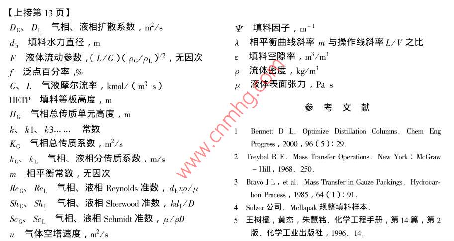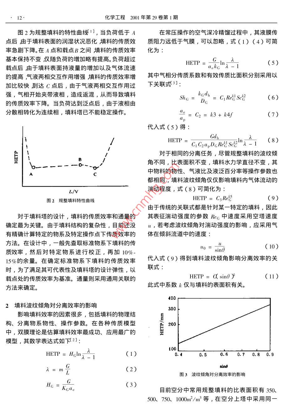 朱慧銘等空分上塔規(guī)整填料結(jié)構(gòu)優(yōu)化空分上塔規(guī)整填料結(jié)構(gòu)優(yōu)化——波紋規(guī)整填料傾角的確定朱慧銘②孫津生吳錦元陳慧〔天津大學化學工程研究所,天津300072)(天津理工學院化工系)空氣深冷分離是一個多精餾塔偶合過程,其中上塔處于核心位置,具有許多進岀料口,各段填料層內(nèi)氣液兩相負荷變化相當大。通過改變波紋規(guī)整填料的傾角可以避免塔體變徑。該文從雙膜理論岀發(fā),推導岀規(guī)整填料的重要結(jié)構(gòu)參數(shù)之———波紋傾角對效率影響的關(guān)聯(lián),同時給岀了規(guī)整填料的通用泛點關(guān)聯(lián)式。關(guān)鍵詞:空分規(guī)整填料傾角∞0年代初,規(guī)整填料開始應用于空分深冷精餾塔,取代傳統(tǒng)的篩板。目前國外推岀的空分裝置中,上塔和氬塔全部采用填料塔(見圖1)上塔采用低壓降的規(guī)整填料后,可以顯著地降低空氣進入下塔的壓力,從而降低空氣的壓縮比,節(jié)省5%10%的能耗;粗氬塔填料采用規(guī)整填料后,在允許的壓差下可以裝填180240塊理論板的填料,足以把氬氣中氧的濃度降至2×10-6以下,省去了安全要求高、工藝復雜的加氫除氧過程。國內(nèi)這方面的工作也已經(jīng)展開,到目前為止,天津大學化學工程研究所與中國空分設備公司、杭州制氧機集團有限公司等單位合作,在二十多座空分深冷精餾塔中成功地采用了規(guī)整填料塔技術(shù)空氣低溫分離是一個多精餾塔偶合的復雜過程,其中上塔處于核心位置,該塔性能的好壞關(guān)系圖1空分流程1-壓縮空氣;2-飽和空氣;3-膨脹空氣;4-液氮回流;到整套空分裝置性能的好壞。與一般的精餾塔相5-富氧液空;6-液空蒸氣;7-液空回流;8-氬餾分;比,空分上塔主要有三個特點:①分離精度高,氮9-氬餾分回流;10-氣相氮產(chǎn)品;11-氣相氧產(chǎn)品;產(chǎn)品濃度高達99.99%99.999%以上;②進出料口12-污氮;13-廢氣;14-液相氬產(chǎn)品;15-液相氧產(chǎn)品多,填料分段頻繁,氣液兩相負荷變化大;③各段A-增壓膨脹機;B-板式換熱器;C-下塔;D-上塔E-板式換熱器;F-粗氬一塔;G-粗氬二塔;H-精氬塔理論板數(shù)必須合理分配,確保各產(chǎn)品和側(cè)線的產(chǎn)量與純度。因此各段填料必須保持統(tǒng)一的彈性,才能目前應用于空分的規(guī)整填料都是采用板波紋結(jié)構(gòu),其最主要的結(jié)構(gòu)參數(shù)為比表面積和波紋傾角充分發(fā)揮填料的作用,確保分離精度。若采用同一單位體積填料表面積越高,效率越高,通量越低種填料,則塔體必須變徑,結(jié)構(gòu)復雜。根據(jù)氣液兩波紋與水平面間的夾角越大,通量越高,效率越相負荷的變化對上塔中各段填料的結(jié)構(gòu)參數(shù)作相應低。本文考察填料波紋傾角對填料性能的影響。調(diào)整,可以避免塔體變徑。1波紋規(guī)整填料的特性2化學工程2001年第29卷第1期圖2為規(guī)整填料的特性曲線11,當負荷低于A在常壓操作的空氣深冷精餾過程中,其液膜傳點后由于填料表面的潤濕狀況惡化填料的傳質(zhì)效質(zhì)阻力遠低于氣膜,可以忽略,式(1)(4)可簡率急劇下降。在A點和載點B之間填料的傳質(zhì)效率化為基本保持不變僅隨負荷的增加略有提高。負荷超過HETP=G(5)載點后由于填料表面持液量的增加以及氣體流速的提高氣液兩相交互作用增強填料的傳質(zhì)效率增其中氣相分傳質(zhì)系數(shù)和有效傳質(zhì)比面積分別采用以加比較快剄達C點后,由于氣液兩相交互作用過下關(guān)聯(lián)式3]強,氣相開始夾帶液相,造成返混,從而導致填料kgdDe=C Re sc42(6)的傳質(zhì)效率下降。當負荷達到泛點后,由于液相由分散相轉(zhuǎn)化為連續(xù)相,填料塔已不能穩(wěn)定操作。C2=k3+h4f(7)代入式(5)得HETPC1C2a,DcRed Sc22(8)對于相同的分離任務,盡管規(guī)整填料的波紋傾B角不同,比表面積不變,填料水力學直徑不變,其中物料的物性、氣液比及液泛百分率等操作參數(shù)也都相同,填料波紋傾角僅僅影響填料內(nèi)氣體流動的湍動程度,式(8)可簡化為圖2規(guī)整填料特性曲線hetp= CrRes(9)由于傳統(tǒng)的關(guān)聯(lián)式都是針對某一特定的填料,因此對于填料塔的設計,填料的傳質(zhì)效率和通量的其表征湍動強度的參數(shù)Rec中速度采用空塔速度確定最為關(guān)鍵。由于填料結(jié)構(gòu)的復雜性,目前還沒α,若考慮波紋傾角對湍動強度的影響,應采用氣有精確計算特定的物系及特定操作點下傳質(zhì)效率的體在傾斜流道中的速度:方法。在設計中,一般先查取標準物系下填料的傳(10)質(zhì)效率,然后對特定物系進行校正,再加10%15%的余量。在確定標準物系下填料的傳質(zhì)效率代入式(9)得到填料波紋傾角影響分離效率的關(guān)時,為了滿足其可代表性及填料塔的設計彈性,以聯(lián)式載點處的傳質(zhì)效率為基準。通量則采用通用關(guān)聯(lián)的HETP= C sine y方法來確定此式中系數(shù)k僅與填料的表面積有關(guān)4002填料波紋傾角對分離效率的影響300影響填料效率的因素很多,包括填料的物理結(jié)構(gòu)、分離物系物性、操作參數(shù)。在各種傳質(zhì)模型中,雙膜理論是估算填料效率最成功、應用最廣的模型,其數(shù)學表達式如下21HETP= HGIn;0.60.70.80.9(2)圖3波紋傾角對分離效率的影響(3)目前空分中常用規(guī)整填料的比表面積有500750、1000m2/m3等,在空分上塔中采用同朱
