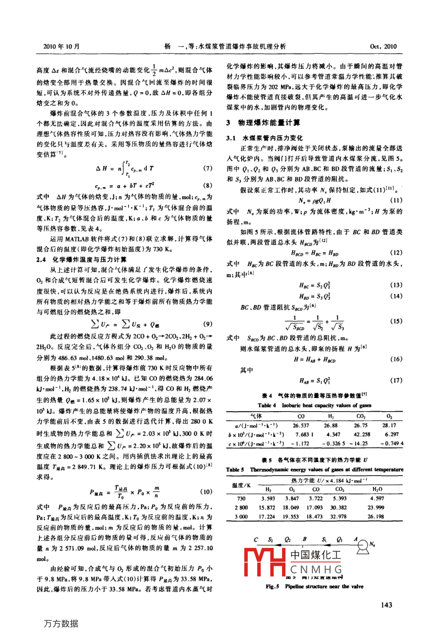 第10卷第5期Ⅴol,10No.52010年10月Journal of safety and Environment0et,2010文章編號:10096094(2010)050141-05出現(xiàn)分流,使輸送至氣化爐的水煤漿流體的壓力迅速下降,氣水煤漿管道爆炸事故機理分析0-起經(jīng)燒嘴倒沖同水煤漿哲管內(nèi)壓力爐內(nèi)合成氣和化爐內(nèi)和O2管線的壓力大于水煤楊一,張禮敬,陶剛,陳麗萍德士古氣化爐使用三流式外混燒嘴,見圖4。從燒嘴結(jié)(南京工業(yè)大學(xué)城市建設(shè)與安全工程學(xué)院,南京21000構(gòu)可知,水煤漿管道壓力下降后,爐內(nèi)的合成氣和O2將一起經(jīng)燒嘴內(nèi)的水煤漿流道回流。由于回流的合成氣中存在CO摘要:某化工廠水煤漿管線因誤操作發(fā)生管道爆裂,造成人員死亡和H2等可燃組分,形成的混合氣體為可燃性混合氣,問流過和財產(chǎn)損失。根據(jù)事故發(fā)生過程,從化學(xué)、物理角度分析了事故發(fā)生程中在燒嘴和水煤漿管道內(nèi)形成預(yù)混空間,同時,高速回流的的機理。研究表明,該起水煤漿管道爆炸事故是物理爆炸和化學(xué)爆炸高壓混合氣體中會混入一些殘解在壁面上的煤漿顆粒和水共同作用的結(jié)果,同流的高溫合成氣和化學(xué)爆炸產(chǎn)生的高溫使水煤漿分,與管壁摩擦而產(chǎn)生靜電,從燒嘴高速流出時會發(fā)生放產(chǎn)生物理變化,從而誘導(dǎo)和加劇了物理爆炸。物理爆炸產(chǎn)生的超壓是電5。當(dāng)混合氣處于爆炸極限范圍內(nèi)時即具有了發(fā)生化學(xué)爆管道破裂的主要原因。炸致使管道爆裂的可能性,從爐內(nèi)回流的高溫混合氣體和化關(guān)鍵詞:安全T程;事故機理分析;管線爆裂;壓力變化;超壓學(xué)爆炸產(chǎn)生的高溫,遇到水煤漿管道中處于常溫狀態(tài)的水,傳中圖分類號:X937文獻標(biāo)識碼:A熱作用將使接觸部分的水迅速氣化。水蒸氣所處空間因大碌DOl:10.3969/jisn.1006094.2010.05.032燕汽得不到及時釋放會使壓力驟然升高,也可導(dǎo)致管道破裂0引言2化學(xué)爆炸能量計算合成氨生產(chǎn)技術(shù)復(fù)雜多樣,其中德土古水煤漿加壓氣化根據(jù)燃燒爆炸的棊本條件,只有當(dāng)混合氣體中可燃組分技術(shù)為第2代煤氣化技術(shù)簡稱TCCP,是世界上較為先進的的濃度處于其爆炸極限范圍內(nèi)時才能發(fā)生化學(xué)爆炸且爆炸氣化方法之一1。該下藝主要為水煤漿經(jīng)泵輸送與空分裝置來的O2一起經(jīng)過燒嘴呈射流狀態(tài)進入氣化爐,在高溫高壓下反應(yīng),生成以C0和H2為主的粗合成氣2。TCPG氣化裝置核心設(shè)備為氣化爐,水煤漿的制備和輸送是TCPG的一個重要的組成部分自國內(nèi)實現(xiàn)工業(yè)化運行以來,T藝技術(shù)的缺陷和工程技術(shù)原因使裝置出現(xiàn)了各種問題,引起了廣泛的重視。對氣化裝置中燒嘴使用周期短、耐火材料磨蝕嚴(yán)重和碳洗塔黑水管線堵塞等問題,國內(nèi)外專家展開了深入研究,提出了各種改進圖1現(xiàn)場散落的碎片方案1。相對于煤漿粲故障和O2件線燃爆等常見事故,水Fig. l Scattered debris at the spot煤漿管線爆炸十分少見,尚未有相關(guān)研究。本文通過對一起德士古水煤漿管道爆炸事故,從管道壓力、物質(zhì)能量的變化及由此引發(fā)化學(xué)物理爆炸的可能性出發(fā),運用 MATLAB數(shù)學(xué)軟件計算過程參數(shù)變化,論證事故形成機理。1事故過程及分析某化T廠合成穌部采用 TCGP T藝制取合成氣。2008年的某一天,一位操作工誤開水煤漿管線上的排凈閥,5s后管道發(fā)生爆炸,造成I人死亡,管線嚴(yán)重破壞。通過現(xiàn)場觀測管道爆炸產(chǎn)生了大量碎片,其中以靠近氣化爐段的管線爆炸圖2斷裂的管段Fig 2 Frac最為劇烈,碎片小且數(shù)多,上游管線形成大塊碎片,甚至整段管道斷裂,見圖1和2。氧氣管線98MPa裝置正常運行時,水煤漿管線和O2管線內(nèi)的溫度都為常溫,壓力分別為95MPa和98MPa。氣化爐內(nèi)的反應(yīng)溫度約化爐為1300℃,壓力為8.7MPa。水煤漿管線長為100m,直徑為219mm,壁厚為23mm。L藝流程見圖3。從事故形成過程看,由于操作工誤開閥門,水煤漿管道內(nèi)水煤漿管線95MPa閥門水煤漿泵收稿日期:2009-1126作者簡介:楊一,碩士研究生,從事化工過程及裝置安全技術(shù)研中國煤化工○究;張禮敬(通信作者),教授,從事生產(chǎn)過程與裝置安全技術(shù)、事故調(diào)查與分析研究,han@judCNMHG基盒項目:國家863項目(2007AA06A402)水漿加壓氣化示意圖Fig 3 Diagram of coal shurry technology141Vol 10 No 5妻與環(huán)境爭報第10卷第5期時,物質(zhì)內(nèi)能的變化與混合氣體爆炸的初始溫度有關(guān),因此,水煤漿需首先進行化學(xué)爆炸條件計算21混合氣體濃度計算已知正常生產(chǎn)時,O2管線的流量為00907m3/s,管道面積為00177m2,計算得O2流速為5.12m/s,5s內(nèi)回流的O2量為0.4535m3。O2從管線進入燒嘴內(nèi)O2流道后流道截面積的變化使O2流速增加,從流道凵高速噴出用于剪切霧化水煤漿的達120m/s當(dāng)發(fā)生回流時,O2與合成氣一起流入燒嘴內(nèi)水煤漿流道,受O2卷吸作用的影響,近似認(rèn)為合成氣叫流進人燒嘴的速度也為120m/s。已知燒嘴噴頭的面積為196cm2,故5s內(nèi)回流合成氣為1.18m3。氣化爐內(nèi)合成氣組分見表1圖4三流式外混燒嘴流道結(jié)構(gòu)在工程計算中,能否將實際氣體簡化為理想氣體考慮outside mixed gasify視理想氣體狀態(tài)方程和實際氣體范德華方程的計算結(j
