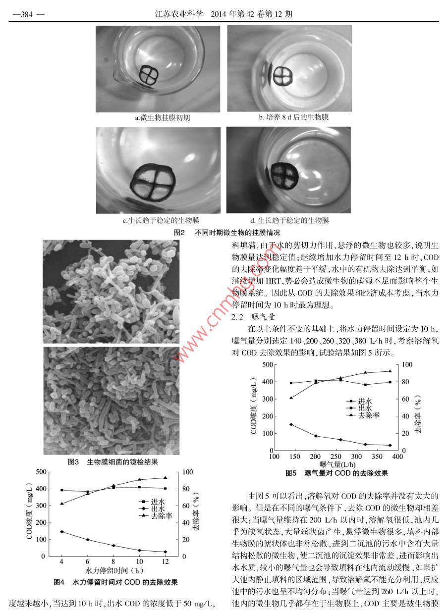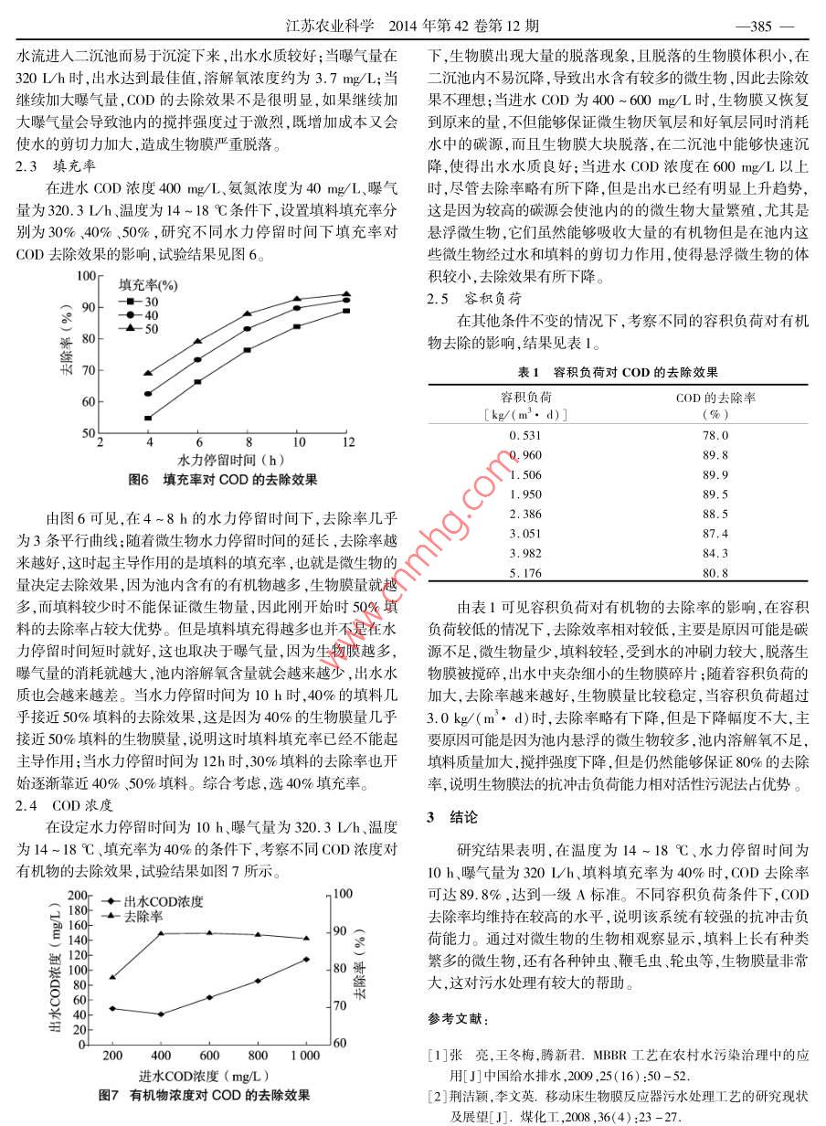 江蘇農(nóng)業(yè)科學(xué)2014 年第42卷第12期-383王京城MBBR處理生活污水技術(shù)研究[J].江蘇農(nóng)業(yè)科學(xué),2014 ,42(12):383 -385.doi: 10.15889/j. isn. 1002 - 1302. 2014.12. 128MBBR處理生活污水技術(shù)研究王京城(遼寧省環(huán)境科學(xué)研究院.遼寧沈陽110161)摘要:針對傳統(tǒng)填料親水性差、附著能力差的缺點,采用新型改性填料,較好地克服了以上缺點。試驗結(jié)果表明:移動床生物膜反應(yīng)器(movingbedbioflmreactor,MBBR)在采用排泥法掛膜時,在溫度為14~18C、水力停留時間為10h .曝氣量為320 L/h填料填充率為40%時,出水可達(dá)一-級A標(biāo)準(zhǔn)。關(guān)鍵詞:MBBR;生活污水;填料;填充率中圖分類號: X703文獻(xiàn)標(biāo)志碼: A文章編號:1002 - 1302 (2014)12 -0383 -03 :移動床生物膜反應(yīng)器( moving bed bioflm reactor , MBBR)構(gòu)會越來越復(fù)雜,生物膜會越來越厚,從而變得清晰可見,生作為一種新型的污水處理技術(shù),以其低能耗、低投資維護(hù)管物量也會越來越多,逐漸達(dá)到穩(wěn)定的狀態(tài)。理簡單等特性在農(nóng)村水污染治理中被逐步認(rèn)可并推廣田。移動床生物膜反應(yīng)器的研究方向主要包括生物膜載體的開發(fā)與改良、微生物的附著與膜機(jī)理的研究、反應(yīng)器工藝的改善、動力學(xué)研究等[2-3]。本試驗采用的新型填料具有比表面積大、粗糙度高、易掛膜、無堵塞、親水性好等優(yōu)點,本研究以期通過試驗驗證MBBR處理污染物的能力,探索該工藝處理生活污水的運(yùn)行參數(shù),包括HRT(水力停留時間)、化學(xué)需氧量( COD)去除能力、曝氣量、填料填充率等,從而為中試試驗及工程應(yīng)用提供基礎(chǔ)資料。1材料與方法1-水槽; 2-蠕動泵; 3-初沉池; 4-空氣泵; 5一轉(zhuǎn)子流量計: 6-二沉池; 7- 一填料; 8- 曝氣裝置; 9- -篩網(wǎng)1.1試驗用水圖1 MBBR試驗裝 置以某單位化糞池污水為處理對象,水質(zhì)成分為:COD350 ~450 mg/L,氨氬40~ 70 mg/L, 總氮50 ~ 80 mg/L,總磷圖2為不同時期內(nèi)微生物的掛膜情況,圖2 -a為微生物4~8 mg/L,pH值6.8~7.6。掛膜初期,填料上只有部分低等微生物附于填料表面,它們主1.2試驗裝置要是作用在填料表面形成黏膜,用肉眼還不能夠看清這些微研究用試驗裝置主體結(jié)構(gòu)由有機(jī)玻璃制成,固定在鐵架生物;圖2-b為培養(yǎng)8d后微生物的生長情況,填料表面出上,反應(yīng)池的長度為40 cm,寬度40 em,高91 cm,總有效體積現(xiàn)1層薄薄的絮狀體,這是--些以細(xì)菌為養(yǎng)料的微生物逐漸達(dá)0.1456 m。初沉池與二沉池均為豎流式沉淀池。曝氣裝增長的結(jié)果。圖2-c、圖2-d為生長趨于穩(wěn)定的生物膜,它置采用的是微孔曝氣。MBBR 工藝流程見圖1。們含有各種各樣的微生物,構(gòu)成--個完整的生態(tài)群體。1.3 啟動試驗(掛膜階段)移動床生物膜反應(yīng)器生物膜上細(xì)菌的鏡檢結(jié)果見圖3,可本試驗采用悶曝自然掛膜法,接種污泥來自于某污水處見生物膜上生長著大量桿菌和球菌類細(xì)菌,它們是生物膜中最理廠曝氣池內(nèi)活性污泥,接人放有填料的移動床生物膜反應(yīng)小的微生物群體,不但自身能夠利用污水中的有機(jī)物質(zhì)合成自器內(nèi),悶曝2 d。試驗用水為化糞池水與自來水的混合,將進(jìn)身細(xì)胞,還可以為其他微生物提供養(yǎng)料,在填料掛膜上也作為水C0D的濃度調(diào)到約400mg/L左右,氨氮濃度為40mg/L最基本的條件,因此在構(gòu)成生物膜中起著舉足輕重的作用。左右,連續(xù)進(jìn)水,水力停留時間為12 h,曝氣量逐漸從220 L/h2不同因素對COD去除效果的影響分析提高到300L/h,水溫為18 C。隨著時間的推移,填料上會逐漸出現(xiàn)肉眼能夠看見的生物膜,生物膜中的微生物的種類、結(jié)2.1水力停 留時間試驗采用連續(xù)進(jìn)水方式,在進(jìn)水C0D濃度400 mg/L、氨收稿日期:2014-02 -18氮濃度為40 mg/L曝氣量為320 I/h、填料填充率為40%、溫基金項目:國家水體污染控制與治理科技重大專項(編號:度為14-18 C的條件下,考察4.6 8、10、12 h水力停留時間2012zx07202 - 003)對C0D去除效果的影響。一384一江蘇農(nóng)業(yè)科學(xué)2014 年第42卷第12期a.微生物掛膜初期b.培養(yǎng)8d后的生物膜c.生長趨于穩(wěn)定的生物膜d.生長趨于穩(wěn)定的生物膜圖2不同時期微生 物的掛膜情況料填滿,由于水的剪切力作用,懸浮的微生物也較多,說明生物膜量達(dá)到穩(wěn)定值;繼續(xù)增加水力停留時間至12h時,COD的去除率變化幅度趨于平緩,水中的有機(jī)物去除達(dá)到平衡,如繼續(xù)增加HRT,勢必會造成微生物的碳源不足而影響整個生物膜系統(tǒng)。因此從COD的去除效果和經(jīng)濟(jì)成本考慮,當(dāng)水力停留時間為10h時最為理想。2.2曝氣量在以上條件不變的基礎(chǔ)上,將水力停留時間設(shè)定為10h,曝氣量分別選定140、200、260、320、380 L/h時,考察溶解氧對C0D去除效果的影響,試驗結(jié)果如圖5所示。5007 100400t 8(30060200◆一去除率+ 40100t 20100 150 200 250 300 350 400圖3生物 膜細(xì)菌的鏡檢結(jié)果曝氣量(L/h)圖5曝氣量對 COD的去除效果400 t80昌由圖5可以看出,溶解氧對C0D的去除率并沒有太大的00 t。進(jìn)李影響。但是在不同的曝氣條件下,去除COD的微生物卻相差士重-去除率神很大:當(dāng)曝氣量維持在200L/h以內(nèi)時,溶解氧很低,池內(nèi)幾乎為缺氧狀態(tài),大量絲狀菌產(chǎn)生,懸浮微生物很