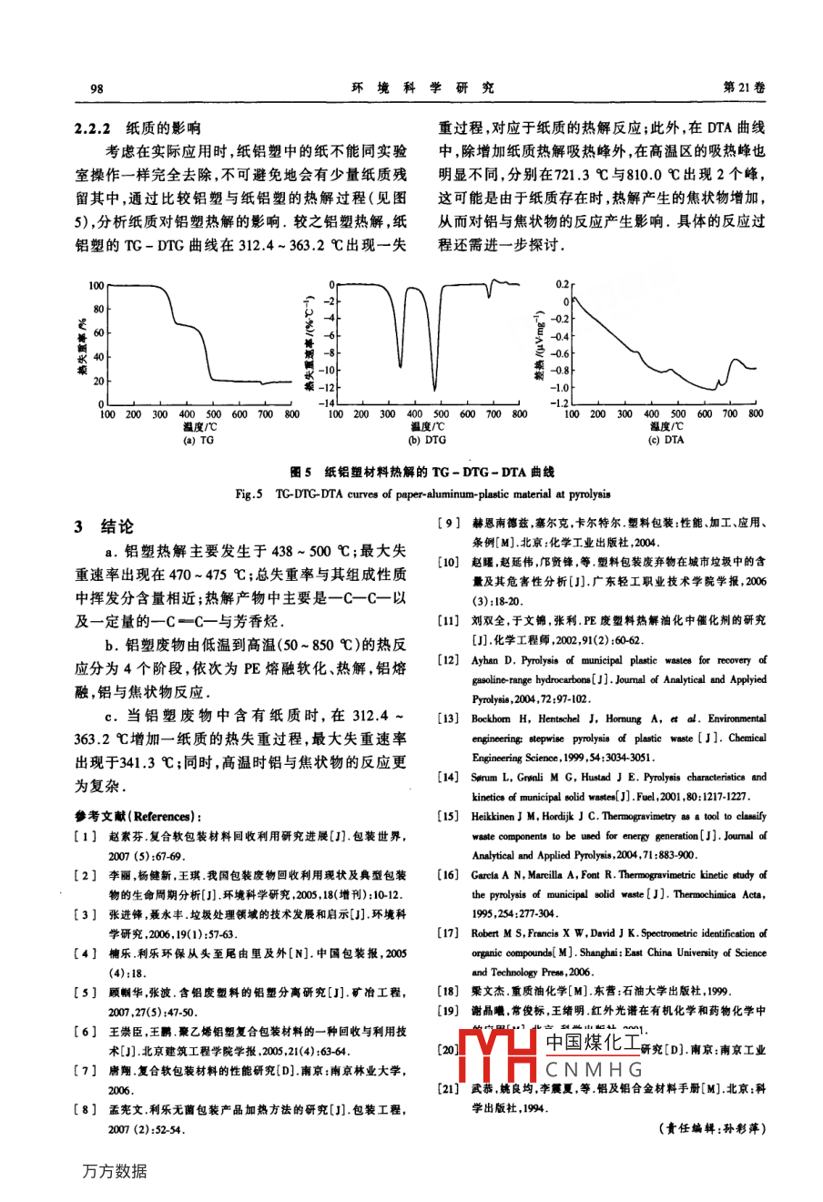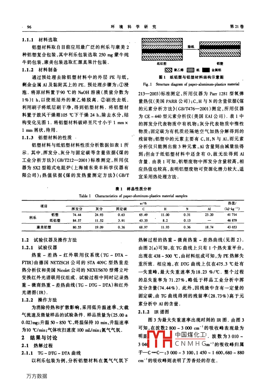 環(huán)境科學(xué)研究第21卷第6期Research of Environmental SciencesvoL.21,No.6,2008鋁塑包裝廢物的熱解特性研究宋薇,岳東北‘,劉建國,姚遠(yuǎn),劉富強(qiáng),聶永豐清華大學(xué)環(huán)境科學(xué)與工程系,北京100084摘要:利用熱重-差熱-傅立葉變換紅外光譜聯(lián)用儀對鋁塑包裝廢物熱解特性進(jìn)行分析,并對物料性質(zhì)、紙質(zhì)存在對熱解過程的影響進(jìn)行研究,結(jié)果表明:鋁塑包裝廢物熱解主要發(fā)生于438-500℃,最大失重速率出現(xiàn)在470-475℃;產(chǎn)物中主要是C一以及少量的一C一C—與芳香烴;反應(yīng)溫度由50℃升至850℃,鋁塑包裝廢物依次經(jīng)歷聚乙烯熔融軟化、熱解,鋁熔融鋁與焦?fàn)钗锓磻?yīng)等過程;鋁塑包裝廢物中含紙質(zhì)時,在3124~363.2℃增加了一個失重過程,同時高溫時的熱解反應(yīng)更為復(fù)雜關(guān)鍵詞:鋁塑包裝廢物;熱解特性;熱重-差熱分析;傅立葉變換紅外光譜中圖分類號:X79文獻(xiàn)標(biāo)志碼;A文章編號:1001-6929(2008)06-0095-04Study on the Pyrolysis Properties of Aluminum-Plastic Package WasteSONG Wei, YUE Dong-bei, LIU Jian-guo, YAO Yuan, LIU Fu-qiang, NIE Yong-fengDepartment of Environmental Science and Engineering, Tsinghua University, Beijing 100084,ChinaAbstract: Pyrolysis properties of aluminum-plastic package waste were studied by Thermo gravimetric analysis-Differential thermal analysis-Fourier transform infrared spectroscopy(TG-DTA-FTIR). The results indicated that the pyrolysis reaction mainly occurred at 438-500C, andthe maximum weight loss rate was observed at 470-475C. The main pyrolysis products were-C-C-,and aromatichydrocarbon. The thermal process included four phases: PE melting and softening, PE pyrolysis, and aluminum melting when the temperatureincreased from 50C to 850C. As for the aluminum-plastic waste containing paper, a new weight loss process was observed atmperature between 312. 4-363. C, and the thermKey words: aluminum-plastic package waste pyrolysis properties: Thermo gravimetric- Differential thermal analysis; Fourier transform infrare鋁塑包裝廢物是在牛奶、果汁等食品消費(fèi)同時此,分離回收技術(shù)已成為鋁塑包裝廢物資源化技術(shù)的產(chǎn)生的一類由鋁、聚乙烯( Polyethylene,PE)及紙質(zhì)主要研究方向.縱觀各分離技術(shù)4),雖然粉碎篩分、構(gòu)成的廢物,具有回收價值高、產(chǎn)生量大的特點.目化學(xué)溶劑處理與水力分解技術(shù)均有較好的紙去除回前鋁塑包裝廢物回收利用率僅為01%左右,絕收效果,但回收的鋁中總殘留部分P,嚴(yán)重降低了鋁大多數(shù)混入生活垃圾,以填埋或焚燒方式處理,造成的純度與應(yīng)用價值.究其原因,鋁塑包裝生產(chǎn)中使用了極大的資源浪費(fèi)與嚴(yán)重的環(huán)境問題2.除去管理熱壓合工藝1,致使鋁與黏附其上的塑料結(jié)合緊制度上的不足缺乏高效的回收利用技術(shù)是實現(xiàn)密;再加之PE耐酸堿特性,因此一般的物理化學(xué)方該類廢物資源化的主要制約因素法都難以分離鋁塑.PE具有熱穩(wěn)性差的特點鋁塑包裝廢物回收技術(shù)可分2類:將度物整體因此,通過熱解B叫可使塑料發(fā)生反應(yīng)析出,而鋁則直接加工成板材,但存在產(chǎn)品附加值低及品質(zhì)不穩(wěn)定仍保持原有性態(tài),以此實現(xiàn)鋁塑分離等問題;②將廢物中的紙、鋁和PE先分離,再分別加筆者在鋁塑包裝廢物組成分析的基礎(chǔ)上,采用以利用,可充分利用再生資源,產(chǎn)品附加值較高.因熱重-傅立葉變換紅外光譜聯(lián)用儀對熱解過程進(jìn)行全面分析,并研究了物料性質(zhì)紙質(zhì)2種因素的收稿日期:2008-07-17修訂日期:2008-08-28基金項目:國家“十一五”科技支撐計劃項目(2006BAC02A13)影響中國煤化工解技術(shù)的適用性作奢簡介:宋薇(1978-),女,山東濟(jì)南人,博士研究生,以及芹論依據(jù)CNMHG實任作者,岳東北(1978-),男,吉林榆樹人,助理研究員,博士,研究方向為固體廢物處理處置與資源化技術(shù), yuedb@ tsinghua. ed,cm1.1試驗材料環(huán)境科學(xué)研究第21卷1.1.1材料選取鋁塑材料取自目前應(yīng)用最廣泛的利樂與康美2種鋁塑復(fù)合包裝,其中利樂包裝選取250mg蒙牛純感圖牛奶包裝,康美包裝選取匯源真果汁包裝紙鋁塑11.2材料制備s秉乙烯圖紙金屬鋁通過預(yù)處理去除鋁塑材料中的外層PE與紙,圖1紙鋁塑與鋁塑材料結(jié)構(gòu)示意圖剩余金屬A及黏附其上的PE.預(yù)處理步驟為:①浸Fig.1 Structure diagram of paper-aluminum-plastics material泡.將原材料置于90℃的NaOH溶液(質(zhì)量分?jǐn)?shù)為213-2003)標(biāo)準(zhǔn)測定,所用儀器為Par181型氧彈1%)1h,以使紙層外的聚乙烯脫離.②刷洗去紙.量熱儀(美國PARR公司);C,H與N的含量依據(jù)《煤利用刷子將紙層刷干凈,得到鋁塑材料.將鋁塑材的元素分析方法》(GB/T476-2001)測定,所用儀器料置于鼓風(fēng)干燥箱105℃下干燥24h,除去水分,結(jié)為CE-440型元素分析儀(美國EA公司).表1中構(gòu)變化見圖1.將鋁塑材料破碎至尺寸小于1mmx的揮發(fā)分代表物質(zhì)中有機(jī)物;灰分代表物質(zhì)中情性1mm屑狀,待用物質(zhì);固定碳為有機(jī)質(zhì)經(jīng)隔絕空氣加熱分解得到的11.3鋁塑材料的性質(zhì)殘留物;鋁塑中的元素主要有C,H,N與A,而元素鋁塑材料與紙鋁塑材料性質(zhì)分析數(shù)據(jù)如表1所分析儀只能測出前3種元素,A含量則由減量法得示,其中揮發(fā)分、灰分與固定碳等含量依據(jù)《煤的到但由于紙鋁塑材料中還含有O,故
