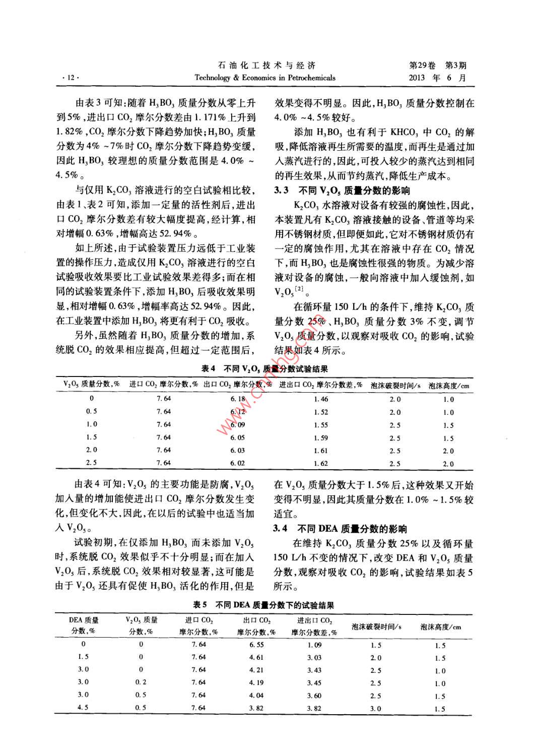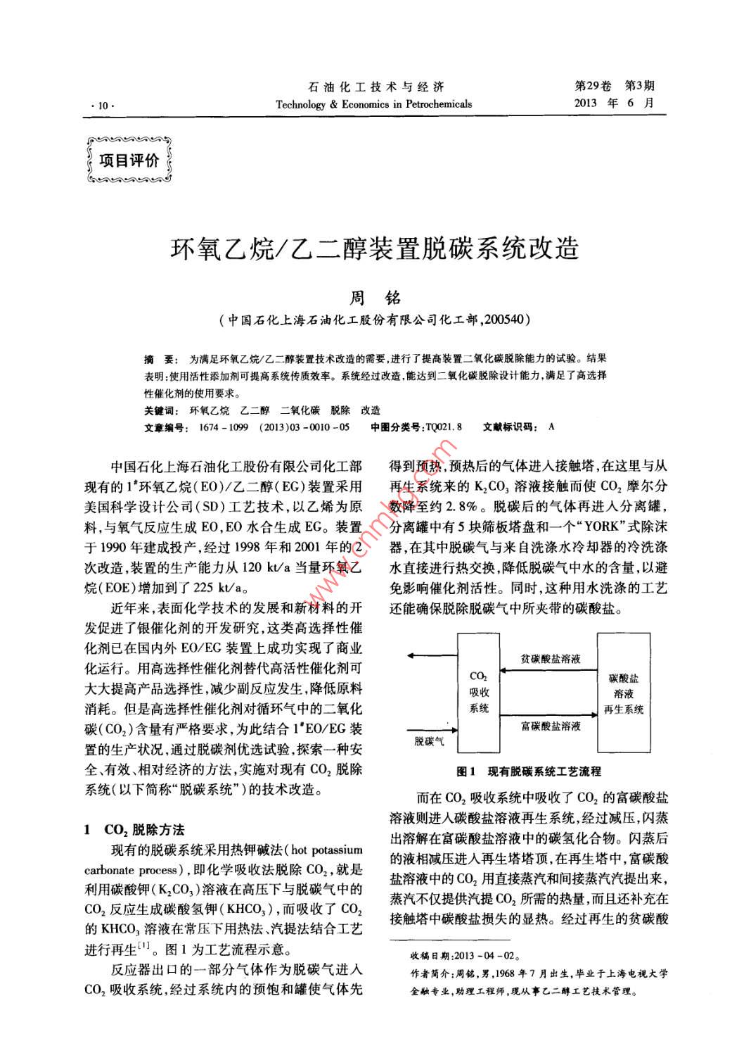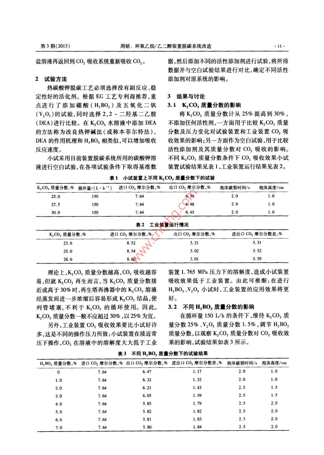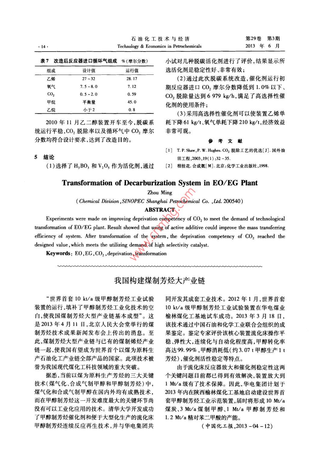 石油化工技術(shù)與經(jīng)濟第29卷第3期Technology Economics in Petrochemical2013年6月項目評價環(huán)氧乙烷/乙二醇裝置脫碳系統(tǒng)改造周銘(中國石化上海石油化工股份有限公司化工部,200540)摘要:為滿足環(huán)氧乙烷/乙二醇裝置技術(shù)改造的需要,進行了提高裝置二氧化碳脫除能力的試驗。結(jié)果表明:使用活性添加劑可提高系統(tǒng)傳質(zhì)效率。系統(tǒng)經(jīng)過改造能達到二氧化碳脫除設(shè)計能力滿足了高選擇性催化劑的使用要求。關(guān)鍵詞:環(huán)氧乙烷乙二醇二氧化碳脫除改造文章編號:1674-1099(2013)03-0010-05中圖分類號:TQ021.8文獻標識碼:A中國石化上海石油化工股份有限公司化工部得到預熱,預熱后的氣體進入接觸塔,在這里與從現(xiàn)有的1·環(huán)氧乙烷(EO)/乙二醇(EG)裝置釆用再生系統(tǒng)來的K2CO3溶液接觸而使CO2摩爾分美國科學設(shè)計公司(SD)工藝技術(shù),以乙烯為原數(shù)降至約2.8%。脫碳后的氣體再進入分離罐料,與氧氣反應(yīng)生成EO,EO水合生成EG。裝置分離罐中有5塊篩板塔盤和一個“YORK"”式除沫于1990年建成投產(chǎn),經(jīng)過1998年和2001年的2器,在其中脫碳氣與來自洗滌水冷卻器的冷洗滌次改造,裝置的生產(chǎn)能力從120kt/a當量環(huán)氧乙水直接進行熱交換,降低脫碳氣中水的含量,以避烷(FOE)增加到了225kUa。免影響催化劑活性。同時,這種用水洗滌的工藝近年來,表面化學技術(shù)的發(fā)展和新材料的開還能確保脫除脫碳氣中所夾帶的碳酸鹽。發(fā)促進了銀催化劑的開發(fā)研究,這類高選擇性催化劑已在國內(nèi)外EO/EG裝置上成功實現(xiàn)了商業(yè)化運行。用高選擇性催化劑替代高活性催化劑可貧碳酸鹽溶液碳酸鹽大大提高產(chǎn)品選擇性,減少副反應(yīng)發(fā)生,降低原料吸收溶液消耗。但是高選擇性催化劑對循環(huán)氣中的二氧化系統(tǒng)再生系統(tǒng)碳(CO2)含量有嚴格要求,為此結(jié)合1"EO/EG裝富碳酸鹽溶液置的生產(chǎn)狀況,通過脫碳劑優(yōu)選試驗探索一種安脫碳氣全、有效、相對經(jīng)濟的方法,實施對現(xiàn)有CO2脫除圖1現(xiàn)有脫碳系統(tǒng)工藝流程系統(tǒng)(以下簡稱“脫碳系統(tǒng)”)的技術(shù)改造。而在CO2吸收系統(tǒng)中吸收了CO2的富碳酸鹽1CO2脫除方法溶液則進人碳酸鹽溶液再生系統(tǒng),經(jīng)過減壓,閃蒸出溶解在富碳酸鹽溶液中的碳氫化合物。閃蒸后現(xiàn)有的脫碳系統(tǒng)采用熱鉀堿法( hot potassium的液相減壓進入再生塔塔頂在再生塔中,富碳酸carbonate process),即化學吸收法脫除CO2,就是利用碳酸鉀(K2CO3)溶液在高壓下與脫碳氣中的鹽溶液中的CO2用直接蒸汽和間接蒸汽汽提出來,CO2反應(yīng)生成碳酸氫鉀(KHCO3),而吸收了CO2蒸汽不僅提供汽提CO2所需的熱量,而且還補充在的KHCO3溶液在常壓下用熱法、汽提法結(jié)合工藝接觸塔中碳酸鹽損失的顯熱。經(jīng)過再生的貧碳酸進行再生。圖1為工藝流程示意。收稿日期:2013-04-02。反應(yīng)器出口的一部分氣體作為脫碳氣進入作者簡介:周銘,男,1968年7月出生,畢業(yè)于上海電視大學CO2吸收系統(tǒng),經(jīng)過系統(tǒng)內(nèi)的預飽和罐使氣體先金融專業(yè),助理工程師,現(xiàn)從事乙二醇工藝技術(shù)管理。第3期(2013)周銘.環(huán)氧乙烷/乙二醇裝置脫碳系統(tǒng)改造11鹽溶液再返回到CO2吸收系統(tǒng)重新吸收CO2據(jù)然后添加不同的活性添加劑進行試驗,將所得數(shù)據(jù)并與空白試驗結(jié)果進行對比,確定不同活性2試驗方法添加劑對原系統(tǒng)的影響。熱碳酸鉀脫碳工藝必須選擇沒有副反應(yīng)、穩(wěn)定性好的活化劑。根據(jù)EC工藝專利商推薦,重3結(jié)果與討論點進行了添加硼酸(H3BO3)及五氧化二釩3.1K2CO3質(zhì)量分數(shù)的影響(V2O3)的試驗,同時選擇2,2-二羥基二乙胺將K2CO3質(zhì)量分數(shù)計從25%提高到30%,(DEA)進行比較。在K2CO3水溶液中添加DEA不添加任何活性劑,一方面用于比較K2CO3質(zhì)量的方法稱為改良熱鉀堿法(或稱本菲爾特法),分數(shù)及壓力變化對試驗裝置和工業(yè)裝置CO2吸DEA的作用機理和H3BO3相類似,可以增加吸收收效果的影響;另一方面作為空白試驗,用于比較反應(yīng)速度活性添加劑及其質(zhì)量分數(shù)對CO2吸收的影響。小試采用目前裝置脫碳系統(tǒng)所用的碳酸鉀溶不同K2CO3質(zhì)量分數(shù)條件下CO2吸收效果小試液進行空白試驗,在各項試驗條件下取得基準數(shù)裝置試驗結(jié)果見表1,工業(yè)裝置運行結(jié)果見表2。表1小試裝置上不同K2CO3質(zhì)量分數(shù)下的試驗K2CO3質(zhì)量分數(shù)%循環(huán)量/(L·h-)進口CO2摩爾分數(shù),%出口CO2摩爾分數(shù)%泡沫破裂時間/泡沫高度/cm25.07.64.027.530.07.646.45表2工業(yè)裝置運行情況K2CO3質(zhì)量分數(shù)%進口CO2摩爾分數(shù),%出口CO2摩爾分數(shù),%進出口CO2摩爾分數(shù)差,%25.08.5428.08.603.015.59理論上,K2CO3質(zhì)量分數(shù)越高,CO2吸收越容裝置1.765MPa壓力下的溶解度,造成小試裝置易,但就K2CO3再生而言,當K2CO3質(zhì)量分數(shù)接吸收效果低于工業(yè)裝置。由此可推斷:在進行近或高于30%時,再生塔再沸器中的K2CO3溶液H3BO3、V2O3小試時,工業(yè)裝置的應(yīng)用效果將更經(jīng)蒸發(fā)而進一步濃縮后容易形成K2CO3結(jié)晶,使好列管堵塞,不利于K2CO3的循環(huán)使用。因此,3.2不同HBO3質(zhì)量分數(shù)的影響K2CO3質
