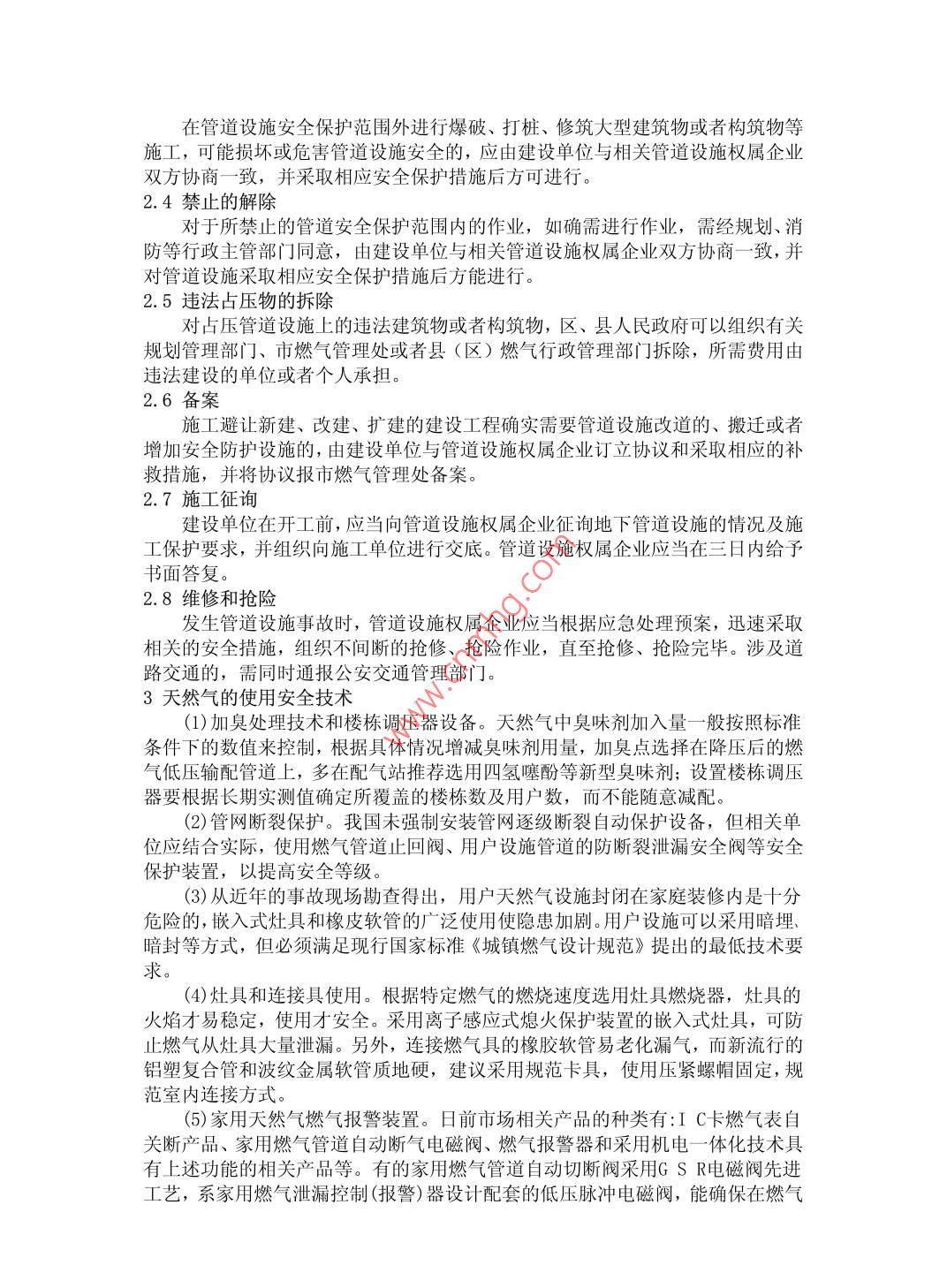 細(xì)談天然氣安全管理技術(shù)鄭文明518048摘要:天然氣安全相關(guān)安全檢測(cè)設(shè)備很多,技術(shù)成熟,然而普及率卻非常低。鑒于天然氣事故的危害,規(guī)范燃?xì)廨斉涔芫W(wǎng)末端的安全施工管理,實(shí)施經(jīng)濟(jì)可靠的安全管理與技術(shù)一體化解決方案,對(duì)于城鎮(zhèn)燃?xì)獍踩兄匾囊饬x。關(guān)鍵詞:天然氣安全管理技術(shù)中圖分類號(hào):TU714文獻(xiàn)標(biāo)識(shí)碼:A1天然氣安全概述天然氣是甲類火災(zāi)危險(xiǎn)性物質(zhì),其爆炸極限是5.3~15%,屬甲類火災(zāi)危險(xiǎn)性物質(zhì),其安全事故以天然氣燃燒、爆燃和爆炸產(chǎn)生的高溫輻射、沖擊波等為破壞方式。發(fā)生天然氣事故的基本條件是天然氣泄漏且已達(dá)到燃爆極限和存在點(diǎn)火源。致天然氣意外泄漏的原因很多,如燃?xì)庥镁哔|(zhì)量差或使用不當(dāng),管道超期運(yùn)行,管道腐蝕,供氣壓力不達(dá)標(biāo),野蠻施工致管道破裂,自然災(zāi)害等,人為破壞也是導(dǎo)致泄漏發(fā)生的原因之2天然氣管道的環(huán)境安全技術(shù)城市燃?xì)獾姆N類有液化石油氣、天然氣、煤氣等。鑒于天然氣是一種相對(duì)安全的清潔能源,隨著當(dāng)今對(duì)環(huán)保要求提高,天然氣在城市中的迅速增長,有了根本性的轉(zhuǎn)變,天然氣成為城市燃?xì)獾闹饕獨(dú)庠?形成了全國乃至跨國的供氣網(wǎng)絡(luò)。因此,保證燃?xì)夤艿赖沫h(huán)境安全至關(guān)重要的。下面我們分條介紹:2.1安全保護(hù)范圍內(nèi)的禁止行為禁止任何單位和個(gè)人在管道設(shè)施的安全保護(hù)范圍內(nèi)從事下列危及管道設(shè)施安全的活動(dòng)2.1.1在低壓、中壓、次高壓管道設(shè)施中心線兩側(cè)各0.7米以內(nèi)和未采取有效安全保護(hù)措施,在中心線兩側(cè)各0.7米~6.5米的安全保護(hù)范圍內(nèi),取土、修渠、種植深根植物、排放腐蝕性物質(zhì),堆放大宗物資及危險(xiǎn)化學(xué)品,修筑建筑物、構(gòu)筑物,打樁或者頂進(jìn)作業(yè)2.1.2在高壓、超高壓管道設(shè)施中心線兩側(cè)各6.5米以內(nèi)種植深根植物以及在高壓、超高壓管道設(shè)施中心線兩側(cè)各6.5米以內(nèi)和未采取有效安全保護(hù)措施在中心線兩側(cè)各6.5米~50米的安全保護(hù)范圍內(nèi),取土、修渠、排放腐蝕性物質(zhì),堆放大宗物資及危險(xiǎn)化學(xué)品,修建養(yǎng)殖場(chǎng)、碼頭或者其他建筑物、構(gòu)筑物,打樁或者頂進(jìn)作業(yè),新建、改(擴(kuò))建鐵路、公路、橋梁、河渠、架空電力線路,埋設(shè)地下電(光)纜,設(shè)置安全或者避雷接地體;2.1.3在高壓、超高壓管道設(shè)施中心線兩側(cè)各50米以內(nèi)和未采取安全保護(hù)措施在中心線兩側(cè)各50米~500米范圍內(nèi)實(shí)施爆破作業(yè):2.1.4未按國家和本市燃?xì)夤こ淘O(shè)計(jì)規(guī)范及消防技術(shù)規(guī)范要求,在管道設(shè)施兩側(cè)規(guī)定的距離內(nèi)敷設(shè)其它管道設(shè)施2.1.5其他危害管道設(shè)施安全的行為。2.2涉及河道的管道設(shè)施安全保護(hù)要求沿河、跨河、穿河、穿堤、臨河的管道設(shè)施,由管道設(shè)施權(quán)屬企業(yè)與河道管理部門根據(jù)國家有關(guān)規(guī)定確定安全保護(hù)范圍,并設(shè)置標(biāo)志。涉及航道的,還需征求航道管理部門的意見。2.3安全保護(hù)范圍外的作業(yè)要求在管道設(shè)施安全保護(hù)范圍外進(jìn)行爆破、打樁、修筑大型建筑物或者構(gòu)筑物等施工,可能損壞或危害管道設(shè)施安全的,應(yīng)由建設(shè)單位與相關(guān)管道設(shè)施權(quán)屬企業(yè)雙方協(xié)商一致,并采取相應(yīng)安全保護(hù)措施后方可進(jìn)行。2.4禁止的解除對(duì)于所禁止的管道安全保護(hù)范圍內(nèi)的作業(yè),如確需進(jìn)行作業(yè),需經(jīng)規(guī)劃、消防等行政主管部門同意,由建設(shè)單位與相關(guān)管道設(shè)施權(quán)屬企業(yè)雙方協(xié)商一致,并對(duì)管道設(shè)施采取相應(yīng)安全保護(hù)措施后方能進(jìn)行。2.5違法占?jí)何锏牟鸪龑?duì)占?jí)汗艿涝O(shè)施上的違法建筑物或者構(gòu)筑物,區(qū)、縣人民政府可以組織有關(guān)規(guī)劃管理部門、市燃?xì)夤芾硖幓蛘呖h(區(qū))燃?xì)庑姓芾聿块T拆除,所需費(fèi)用由違法建設(shè)的單位或者個(gè)人承擔(dān)。2.6備案施工避讓新建、改建、擴(kuò)建的建設(shè)工程確實(shí)需要管道設(shè)施改道的、搬遷或者增加安全防護(hù)設(shè)施的,由建設(shè)單位與管道設(shè)施權(quán)屬企業(yè)訂立協(xié)議和采取相應(yīng)的補(bǔ)救措施,并將協(xié)議報(bào)市燃?xì)夤芾硖巶浒?.7施工征詢建設(shè)單位在開工前,應(yīng)當(dāng)向管道設(shè)施權(quán)屬企業(yè)征詢地下管道設(shè)施的情況及施工保護(hù)要求,并組織向施工單位進(jìn)行交底。管道設(shè)施權(quán)屬企業(yè)應(yīng)當(dāng)在三日內(nèi)給予書面答復(fù)2.8維修和搶險(xiǎn)發(fā)生管道設(shè)施事故時(shí),管道設(shè)施權(quán)屬企業(yè)應(yīng)當(dāng)根據(jù)應(yīng)急處理預(yù)案,迅速采取相關(guān)的安全措施,組織不間斷的搶修、搶險(xiǎn)作業(yè),直至搶修、搶險(xiǎn)完畢。涉及道路交通的,需同時(shí)通報(bào)公安交通管理部門。3天然氣的使用安全技