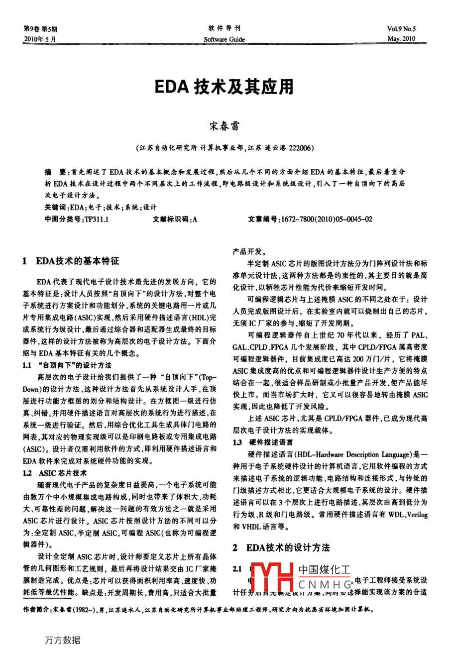 第9卷第5期軟件導(dǎo)刊Vol 9 No52010年5月Software GuiEDA技術(shù)及其應(yīng)用宋春雷(江蘇自動化研究所計算機事業(yè)部,江蘇連云港22006)摘要:首先闡了EDA技術(shù)的基本概念和發(fā)展過程,然后從幾個不同的方面介紹EDA的基本特征,最后著重分析EDA技術(shù)在設(shè)計過程中兩個不同層次上的工作流程,即電路級設(shè)計和系純級設(shè)計,引入了一種自頂向下的高層次電子設(shè)計方法。關(guān)鍵詞:EDA;電子;技術(shù);系統(tǒng);設(shè)計中圖分類號:TP31文獻標(biāo)識碼:A文章編號:1672-7800(2010)05-0045-02產(chǎn)品開發(fā)1EDA技術(shù)的基本特征半定制ASC芯片的版圖設(shè)計方法分為門陣列設(shè)計法和標(biāo)準(zhǔn)單元設(shè)計法,這兩種方法都是約束性的,其主要目的就是簡EDA代表了現(xiàn)代電子設(shè)計技術(shù)最先進的發(fā)展方向,它的化設(shè)計,以犧牲芯片性能為代價來縮短開發(fā)時間?;咎卣魇?設(shè)計人員按照“自頂向下”的設(shè)計方法對整個電可編程邏輯芯片與上述掩膜ASC的不同之處在于:設(shè)計子系統(tǒng)進行方案設(shè)計和功能劃分,系統(tǒng)的關(guān)鍵電路用一片或幾片專用集成電路(ASIC)實現(xiàn)然后采用硬件描述語言(HDL)完人員完成版圖設(shè)計后,在實驗室內(nèi)就可以燒制出自己的芯片,無須IC廠家的參與,縮短了開發(fā)周期。成系統(tǒng)行為級設(shè)計,最后通過綜合器和適配器生成最終的目標(biāo)可編程邏輯器件自上世紀(jì)70年代以來,經(jīng)歷了PAL器件,這樣的設(shè)計方法被稱為高層次的電子設(shè)計方法。下面介GAL CPLD、FGA幾個發(fā)展階段,其中CPLD/FPGA屬高密度紹與EDA基本特征有關(guān)的幾個概念可編程邏輯器件,目前集成度已高達200萬門/片,它將掩膜11“自頂向下”的設(shè)計方法ASC集成度高的優(yōu)點和可編程邏輯器件設(shè)計生產(chǎn)方便的特點高層次的電子設(shè)計給我們提供了一種“自頂向下”(TP結(jié)合在一起,很適合樣品研制或小批量產(chǎn)品開發(fā)使產(chǎn)品能盡Down)的設(shè)計方法,這種設(shè)汁方法首先從系統(tǒng)設(shè)計人手,在頂快上市。而當(dāng)市場擴大時,它又可以很容易地轉(zhuǎn)由掩膜ASC層進行功能方框圖的劃分和結(jié)構(gòu)設(shè)計。在方框圖一級進行仿實現(xiàn),因此也降低了開發(fā)風(fēng)險。真、糾錯。并用硬件描述語言對高層次的系統(tǒng)行為進行描述在系統(tǒng)一級進行驗證。然后,用綜合優(yōu)化工具生成具體門電路的上述ASC芯片,尤其是CPLD/FGA器件,已成為現(xiàn)代高層次電子設(shè)計方法的實現(xiàn)載體。網(wǎng)表,其對應(yīng)的物理實現(xiàn)級可以是印刷電路板或?qū)S眉呻娐?3硬件描述語言(ASIC)。設(shè)計者僅需利用軟件的方式,即利用硬件描述語言和硬件描述語言(HDL- Hardware Description Language)是一EDA軟件來完成對系統(tǒng)硬件功能的實現(xiàn)。12ASIC芯片技術(shù)種用于電子系統(tǒng)硬件設(shè)計的計算機語言,它用軟件編程的方式來描述電子系統(tǒng)的邏輯功能、電路結(jié)構(gòu)和連接形式,與傳統(tǒng)的隨著現(xiàn)代電子產(chǎn)品的復(fù)雜度日益提高,一個電子系統(tǒng)可能由數(shù)萬個中小規(guī)模集成電路構(gòu)成,同時也帶來了體積大、功耗門級描述方式相比,它更適合大規(guī)模電子系統(tǒng)的設(shè)計。硬件描述語言可以在3個層次上進行電路描述,其層次由高到低分為大、可靠性差的問題解決這一問題的有效方法之一就是采用ASC芯片進行設(shè)計。ASC芯片按照設(shè)計方法的不同可以分行為級、R級和門電路級。常用硬件描述語言有 WDL verily為:全定制ASIC,半定制ASIC,可編程ASC(也稱為可編程邏和ⅤHDL語言等。輯器件)。2EDA技術(shù)的設(shè)計方法設(shè)計全定制ASC芯片時,設(shè)計師要定義芯片上所有晶體管的幾何圖形和工藝規(guī)則,最后再將設(shè)計結(jié)果交由IC廠家掩21中國煤化工膜制造完成。優(yōu)點是:芯片可以獲得面積利用率高、速度快、功CNMHG電子工程師接受系統(tǒng)設(shè)耗低等最優(yōu)性能。缺點是:開發(fā)周期長費用高只適合大批量計任H刀乘,問時安選擇能實現(xiàn)該方案的合適作者簡介:宋春雷(1982-),男,江蘇漣水人,江蘇自動化研究所計算機事業(yè)部助理工程師研究方向為抗惡劣環(huán)境加圃計算機。46軟件導(dǎo)刊2010年元器件,然后根據(jù)所選元器件設(shè)計原理圖。接著進行第一次仿生成門級描述的網(wǎng)表這是將高層次描述轉(zhuǎn)化為硬件電路的關(guān)真,包括數(shù)字電路的邏輯模擬、故障分析、模擬電路的交直流分鍵步驟。綜合優(yōu)化是針對ASIC芯片供應(yīng)商的某一產(chǎn)品系列進析和瞬態(tài)分析。系統(tǒng)在進行仿真時,必須要有元件模型庫的支行的,需要在相應(yīng)的廠家綜合庫支持下才能完成綜合后,可利持,計算杋上模擬的輸入輸出波形代替了實際電路調(diào)試中的信用產(chǎn)生的網(wǎng)表文件進行適配前的時序仿真仿真過程不涉及具號源和示波器。這一次仿真主要是檢驗設(shè)計方案在功能方面的體器件的硬件特性較為粗略。正確性。仿真通過后,根據(jù)原理圖產(chǎn)生的網(wǎng)絡(luò)表進行PCB板的第五步:利用適配器將綜合后的網(wǎng)表文件針對某一具體的自動布局布線。在制作PCB板之前還可以進行后分析,包