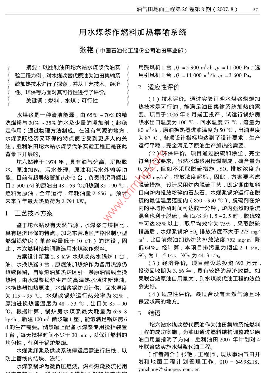 用水煤漿作燃料加熱集輸系統(tǒng)