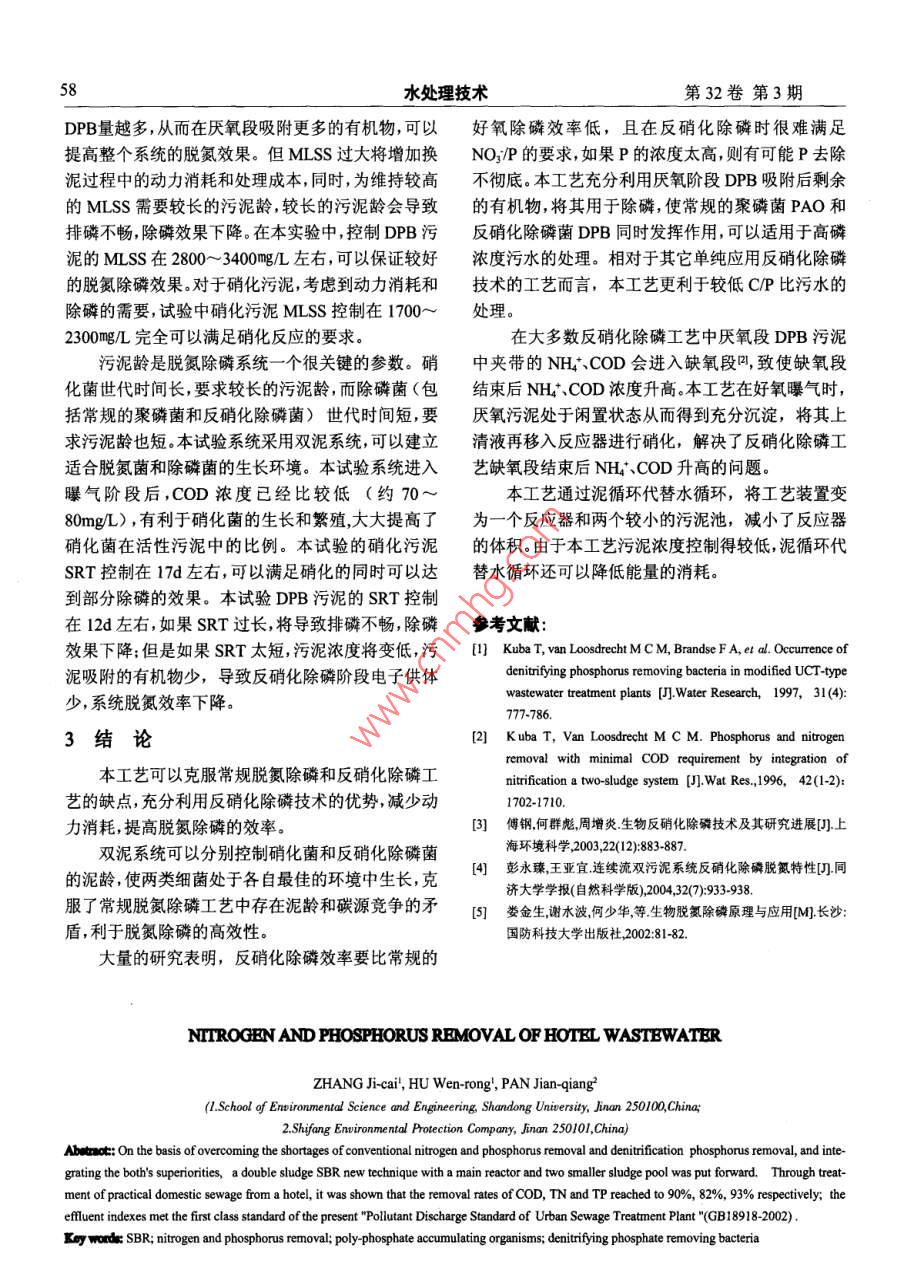 第33卷第3期水處理技術(shù)VoL.33 No.32007年3月TECHNOLOGY OF WATER TREATMENTMar,200755賓館生活污水的脫氮除磷張繼才',胡文容',潘建強(qiáng)2(1.山東大學(xué)環(huán)境科學(xué)與工程學(xué)院,山東濟(jì)南250100;2.濟(jì)南十方環(huán)保有限公司,山東濟(jì)南250101)摘要:在克服常規(guī)脫氮除磷與反硝化除磷技術(shù)缺點(diǎn)的基礎(chǔ) 上將兩者優(yōu)勢(shì)結(jié)合起來(lái),設(shè)計(jì)了具有一個(gè)主反應(yīng)池和兩個(gè)較小污泥池的雙泥SBR新工藝。處理某賓館實(shí)際生活污水,試驗(yàn)結(jié)果表明:COD.TN和TP的去除率達(dá)到90%、82%、93%。出水水質(zhì)指標(biāo)滿足現(xiàn)行的《城鎮(zhèn)污水處理廠污染物排放標(biāo)準(zhǔn)》(GB18918-2002 )-級(jí)標(biāo)準(zhǔn)的要求。同時(shí)討論了DO、污泥齡對(duì)系統(tǒng)運(yùn)行的影響。關(guān)鍵詞:SBR;脫氮除磷;聚磷菌;反硝化除磷菌中團(tuán)分類號(hào):X703.1文獻(xiàn)標(biāo)識(shí)碼:A文編號(hào): 000-3770(200)03055504氮、磷是造成水體富營(yíng)養(yǎng)化的主要原因。在傳統(tǒng)1試驗(yàn)裝置及方法生物脫氮除磷工藝中,脫氮和除磷是彼此獨(dú)立的過(guò)1.1試驗(yàn)裝i程,分別由不同的微生物完成,由于硝化菌、反硝化試驗(yàn)裝置如圖1所示。該試驗(yàn)裝置用工程塑料菌和聚磷菌(Poly-Phosphate Accumulating Organ-制成,由一個(gè)SBR反應(yīng)器和兩個(gè)較小的污泥池組isms,縮寫(xiě)為PAO)之間存在著碳源和泥齡的競(jìng)爭(zhēng)成。SBR反應(yīng)器長(zhǎng)、寬、高各80cm,底部泥斗為四棱等矛盾,工程實(shí)踐中往往出現(xiàn)脫氮效果好而除磷效錐形,傾角為60度,總有效容積為500L。兩個(gè)污泥果差或正好相反的情況。為了同時(shí)取得較好的脫氮池分別用來(lái)存放DPB污泥和硝化污泥,大小相等,除磷效果,污水往往需要在多個(gè)反應(yīng)器之間反復(fù)流長(zhǎng)、寬、高各60cm,底部泥斗為四棱錐形,總有效容積轉(zhuǎn)和補(bǔ)充碳源,從而增加了動(dòng)力消耗和處理成本。為200L。SBR反應(yīng)器內(nèi)設(shè)置曝氣管和攪拌器,轉(zhuǎn)速近年來(lái),許多研究中發(fā)現(xiàn)一類可以在缺氧 (無(wú)100r/min,反應(yīng)器底部設(shè)有污泥排放管,側(cè)壁設(shè)有排O,存在NO;)條件下吸磷的反硝化除磷菌(Denitri-水管。進(jìn)水和污泥的切換分別由水泵和污泥泵控制。fying Phosphorus Removing Bacteria,縮寫(xiě)為DPB)叼,排泥管、污泥回流管和排水管上均安裝電動(dòng)閥門(mén)。曝它們能以NO;為電子受體,利用內(nèi)碳源,可以在反攪拌器硝化的同時(shí)進(jìn)行缺氧吸磷,為污水脫氮除磷工藝的發(fā)展提供了新思路。但反硝化除磷工藝除磷效率比SR反應(yīng)器進(jìn)水泵好氧除磷相對(duì)低- -些, 進(jìn)水中的氮和磷很難恰好滿接水閥' oo足缺氧攝磷的要求,這給系統(tǒng)的控制帶來(lái)了困難印。本試驗(yàn)研究采用雙泥SBR工藝,將常規(guī)除磷原B理和反硝化除磷原理結(jié)合起來(lái),可以消除常規(guī)脫氮空氣壓縮機(jī)| 污泥池除磷工藝存在的碳源和泥齡競(jìng)爭(zhēng)的矛盾,同時(shí)SBR工藝具有投資少、效率高、操作簡(jiǎn)單、可在線控制等優(yōu)點(diǎn),適宜于中小水量的處理,通過(guò)合理地控制系統(tǒng)- t-運(yùn)行,可以有效克服反硝化除磷工藝的缺點(diǎn),從而使河泥回流泵圈1實(shí)驗(yàn)裝置示意圈本工藝更適合低CIN比和高含P污水的處理。Fig.1 Schematic for experimental device收稿日期: 2006-03-10作者簡(jiǎn)介:張繼才(1979-) ,男,碩士研究生,主要從事水處理技術(shù)的研究:聯(lián)系電話: 13455130967; E-mail:zhjcai@126 com.56水處理技術(shù)第32卷第3期氣設(shè)備采用空氣壓縮機(jī),并通過(guò)流量計(jì)顯示流量。1.5.分析項(xiàng)目及檢測(cè)方法電器設(shè)備由控制柜進(jìn)行控制,控制系統(tǒng)由手動(dòng)控水質(zhì)分析方法依據(jù)《水和廢水監(jiān)測(cè)分析方法》制和自動(dòng)控制兩種模式組成。自動(dòng)部分采用可編程控(國(guó)家環(huán)保局第4版) ,詳見(jiàn)表2。制器(PLC)作為控制核心,將試驗(yàn)裝置的各開(kāi)關(guān)信表2分析項(xiàng)目及檢測(cè)方法號(hào)引入PLC,經(jīng)過(guò)判別和計(jì)算輸出控制動(dòng)作;手動(dòng)部Table2 Analytic items and test methods項(xiàng)目測(cè)定方法分可根據(jù)實(shí)際運(yùn)行情況的需要改變裝置的運(yùn)行。)0溶解氧測(cè)定儀1.2 試驗(yàn)方法oD重鉻酸鉀標(biāo)準(zhǔn)法本試驗(yàn)具體操作流程如圖2所示。NH5-N納氏試劑光度法NO:酚二磺酸光度法在一個(gè)周期內(nèi),SBR反應(yīng)器依次處于狀態(tài):(1)TP鉬銻抗分光光度法厭氧I。污水進(jìn)入反應(yīng)器與DPB污泥(含反硝化除MLSS稱重法磷菌DPB)混合,然后厭氧攪拌;(2)靜置換泥。反應(yīng)器靜置沉淀,沉淀下來(lái)的DPB污泥排入DPB污泥2結(jié)果與討論池;(3)厭氧I。將硝化污泥泵入SBR反應(yīng)器,厭氧2.1反應(yīng)器各階段的污染物的去除攪拌;(4)曝氣階段。打開(kāi)空氣壓縮機(jī)進(jìn)行曝氣,硝化一個(gè)周期內(nèi)污染物去除率及各階段的變化情況菌將NHyN硝化成NO;-N。在曝氣階段結(jié)束前l(fā)h,見(jiàn)表3。將污泥池中經(jīng)過(guò)充分沉淀的DPB污泥上清液移入衰3一個(gè)周期內(nèi)污染物去除率及備階段的變化情況SBR反應(yīng)器,將DPB污泥中殘留的NH-N硝