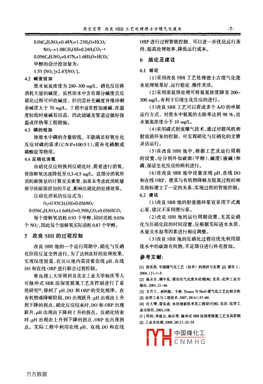 第23卷第6期能源環(huán)境保護Vol.23,No.62009年12月Energy Environmental ProtectionDec, 2009綜述與專論]改良SBR工藝處理德士古煤氣化廢水藥寶寶,高鶯2(1. 北京建工金源環(huán)保發(fā)展有限公司,北京100101;2.北京華福工程有限公司,北京100013)摘要:對德士古煤氣化廢水的產(chǎn)生及水質(zhì)特性進行了分析,廢水首先經(jīng)蒸氨,將氨氦濃度從1 300~2 700 mg/L降低至200~300 mg/L,后續(xù)處理采用具有生物脫氮功能的處理工藝。對A/O、SBR及其改良工藝進行了綜合評述,重點介紹了碟式射流曝氣在改良SBR工藝中的應(yīng)用,及該工藝的運行周期設(shè)置和特點。工程實踐表明,該工藝處理效果好、運行穩(wěn)定、操作及控制靈活,氨氦去除率達到98%,出水濃度小于10 m/L。關(guān)鍵詞:改良SBR;德士古;煤氣化廢水;碟式射流曝氣;硝化;反硝化中圖分類號:X703文獻標(biāo)識碼:A文章編號:1006- -8759(2009)06 -0004- -04TEXACO COAL GASIFICATION WASTEWATERTREATMENT WITH MODIFIED SBR PROCESSYAO Bao- -bao', GAO Ying'(I.Bejing BCEG Golden Sources E.P.D. Co, Ltd. ,Bejing 100101,China;2. Beijing Huafu Engineering Co, Lid. , Beijing 100013,China)Abstract: The origin and characteristic of Texaco coal gasification wastewater was analyzed.The concentration of ammonia nitrogen would be decreased from 1 300~2 700 mg/L to 200~300 mg/L by ammonia still pretreatment. The enhanced biological denitrification process mustbe used in the post treatment. A/0, SBR and modified SBR process was separatelysummarized. The application of disk jet aeration, operation cycle and characteristic of themodified SBR process was described in detail. The treatment process featured positivepollutant removal, stable running and simple control and operation, therefore, the effluentconcentration of ammonia nitrogen would be lower than 10 mgl and the removal rate wouldbe over 98%.Keywords: modified SBR process ;Texaco; coal gasification wastewater;disk jet aeration;nitration; denitrification我國是世界上煤炭資源最豐富的國家之一-,應(yīng)的環(huán)境污染,尤其是廢水污染的問題。采用改良作為一種重要能源,煤的用途主要包括:燃燒、煉SBR工藝處理德上古煤氣化廢水,處理效果好、運焦、氣化、干餾加氫液化等。煤氣化是一種潔凈的行穩(wěn)定,尤其是氨氮去除率達到98%,為高氨氮煤炭綜合利用技術(shù),是煤化工、加氫工藝、煤液化煤氣化廢水的治理提供了一條切實可行的工藝路等的基礎(chǔ)"。然而在煤氣化生產(chǎn)過程中也帶來了相中國煤化工MHCNMHG收稿日期:2009. -08-24藥寶寶等改良SBR工藝處理德士古煤氣化廢水.5.煤氣化過程是一個熱化學(xué)過程, 是以煤為原2.3出水水質(zhì)要求料,以氧氣、蒸汽或氫氣等作氣化劑,在高溫條件目前國內(nèi)采用德士古煤氣化技術(shù)的生產(chǎn)企下通過化學(xué)反應(yīng)將煤中的叮燃部分轉(zhuǎn)化為氣體燃業(yè),出水水質(zhì)執(zhí)行《污水綜合排放標(biāo)準(zhǔn)>(GB8978-料的過程。煤氣化本質(zhì)上是將煤由高分子固態(tài)物1996)一級標(biāo)準(zhǔn)或《合成氨工業(yè)水污染物排放標(biāo)質(zhì)轉(zhuǎn)化為低分子氣態(tài)物質(zhì),由固態(tài)變?yōu)闅鈶B(tài)的過準(zhǔn)》(CB13458- 2001)- -級標(biāo)準(zhǔn)。程,也是改變?nèi)剂现刑?氫比結(jié)構(gòu)的過程"。氨氮作為一項最重要的水質(zhì)考核指標(biāo),上述德士古煤氣化技術(shù)也稱為水煤漿氣化技術(shù),兩個排放標(biāo)準(zhǔn)分別執(zhí)行15mg/L和大型企業(yè)40是由美國Texaco公司在重油氣化的基礎(chǔ)上:開發(fā)m/L(或中型企業(yè)70 mg/L)。出的第二代氣流床氣化工藝。氣化過程包括煤漿3廢水處理工藝的確定制備、煤漿氣化、灰水處理和CO變換等工序,氣化壓力2.6~8.5 MPa,氣化溫度1 360 C~1 450 C對廢水水質(zhì)特性分析可知,廢水氨氮濃度高,田。該技術(shù)運行操作的經(jīng)驗豐富,設(shè)備國產(chǎn)化率高,經(jīng)蒸氨預(yù)處理后可降低至200~300 mg/L,但仍需在投資和運行成本上具有明顯優(yōu)勢,是目前商業(yè)采用具有脫氨功能的生化處理工藝。國內(nèi)常用的業(yè)績最多的第二代氣流床氣化工藝。國內(nèi)采用該處理工藝為:A/O .SBR及其改良型工藝。技術(shù)的生產(chǎn)企業(yè)包括:魯南化肥廠、陜西渭化、山3.1 AO工藝東華魯恒升、兗礦國泰.南京金陵石化等。AO工藝是前置反硝化生物脫氮工藝,應(yīng)用較為廣泛,積累了一定的設(shè)計和運行經(jīng)驗,主要特2德士古煤氣化廢水特性點是:(1)缺氧池設(shè)置在好氧池前,可起生物選擇2.1廢水的產(chǎn)生器作用,改善污泥沉降性能。(2)好 氧池設(shè)置在缺德士古煤氣化生產(chǎn)過程中,粗煤氣在冷凝冷氧池后,可進一步去除有機污染物,改善出水水卻時所含的飽和水分( 主要是加壓氣化過程加入質(zhì)。(3)反硝化產(chǎn)生的堿度可部分補償硝化過程的的水蒸氣和煤本身所含的水分)形成了冷凝水。這堿度消耗。(4)反硝化可利用原水中的碳源,減輕些冷凝水匯入噴淋冷卻系統(tǒng)循環(huán)使用,多余的水好氧池的有機負(fù)荷。排出即形成廢水。因此,廢水實質(zhì)上是來源于盈水但采用A/0 T藝處理高濃度氨氮廢水,具有循環(huán)系統(tǒng)的排污水,其中溶解或懸浮有粗煤氣中一定的局限性,主要表現(xiàn)為:(1)A/0 T.藝需分別的多種成分,典型的廢水水質(zhì)見表1。設(shè)置污泥回流和混合液回流系統(tǒng),尤其是混合液回流比通常設(shè)計為200 %~400 %,動力消耗大。表1典型的德士 古煤