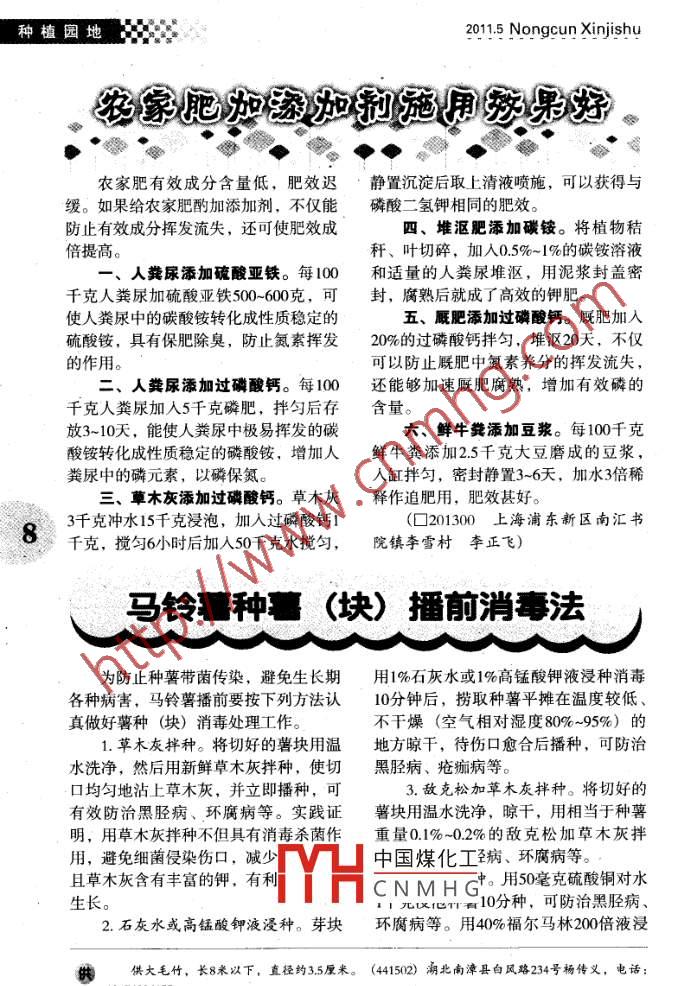 種植園地2011.5 Nongcun Xinjishu農(nóng)家肥加添加打施用秀果好農(nóng)家肥有效成分含量低,肥效遲.靜置沉淀后取上清液噴施,可以獲得與緩。如果給農(nóng)家肥酌加添加劑,不僅能磷酸 二氫鉀相同的肥效。防止有效成分揮發(fā)流失,還可使肥效成四、堆漚肥添加碳銨。將植物秸倍提高。稈、葉切碎,加入0.5%~1%的碳銨溶液一、人糞尿添加硫酸亞鐵。每100和適量的人糞尿堆漚,用泥漿封蓋密千克人糞尿加硫酸亞鐵500~-600克,可封,腐熟后就成了高效的鉀肥。使人糞尿中的碳酸銨轉(zhuǎn)化成性質(zhì)穩(wěn)定的五、廄肥添加過磷酸鈣。廄肥加入硫酸銨,具有保肥除臭,防止氮素?fù)]發(fā)20%的過磷酸鈣拌勻,堆漚20天,不僅的作用。可以防止廄肥中氮素養(yǎng)分的揮發(fā)流失,二、人糞尿添加過磷酸鈣。每100還能夠加速廄肥腐熟,增加有效磷的千克人糞尿加入5千克磷肥,拌勻后存含量。放3~10天,能使人糞尿中極易揮發(fā)的碳六、鮮牛糞添加豆?jié){。每100千克酸銨轉(zhuǎn)化成性質(zhì)穩(wěn)定的磷酸銨,增加人鮮牛糞添加2.5千克大豆磨成的豆?jié){,糞尿中的磷元素,以磷保氮。人缸拌勻,密封靜置3~6天,加水3倍稀三、草木灰添加過磷酸鈣。草木灰釋作追肥用,肥效甚好。83千克沖水15千克浸泡,加入過磷酸鈣1(口201300.上海浦東新區(qū)南匯書千克,攪勻6小時(shí)后加入50千克水?dāng)噭?院鎮(zhèn)李雪村李正飛)馬鈴亳種薯(塊)播前消毒法為防止種薯帶菌傳染,避免生長期用1%石灰水或1%高錳酸鉀液浸種消毒各種病害,馬鈴薯播前要按下列方法認(rèn)10分鐘后,撈取種薯平攤在溫度較低、真做好薯種(塊) 消毒處理工作。不干燥(空氣相對(duì)濕度80%~95%)的1.草木灰拌種。將切好的薯塊用溫地方晾干,待傷口愈合后播種,可防治水洗凈,然后用新鮮草木灰拌種,使切黑脛病、瘡癡病等??诰鶆虻卣瓷喜菽净?,并立即播種,可3.敵克松加草木灰拌種。將切好的有效防治黑脛病、環(huán)腐病等。實(shí)踐證薯塊用溫水洗凈,晾干,用相當(dāng)于種薯明,用草木灰拌種不但具有消毒殺菌作重量0.1%~0.2%的敵克松加草木灰拌用,避免細(xì)菌侵染傷口,減少中國煤化工病、環(huán)腐病等。,且草木灰含有豐富的鉀,有利MYHCN M H c。用50毫克硫酸銅對(duì)水生長。1元1化T 10分種, 可防治黑脛病、2.石灰水或高錳酸鉀液浸種。芽塊環(huán)腐病等。用40%福爾馬林200倍液浸供大毛竹,長8米以下,直徑約3.5厘米。(441502) 潮北南漳縣白風(fēng)路234號(hào)楊傳義,電話:萬勞數(shù)鋸°。