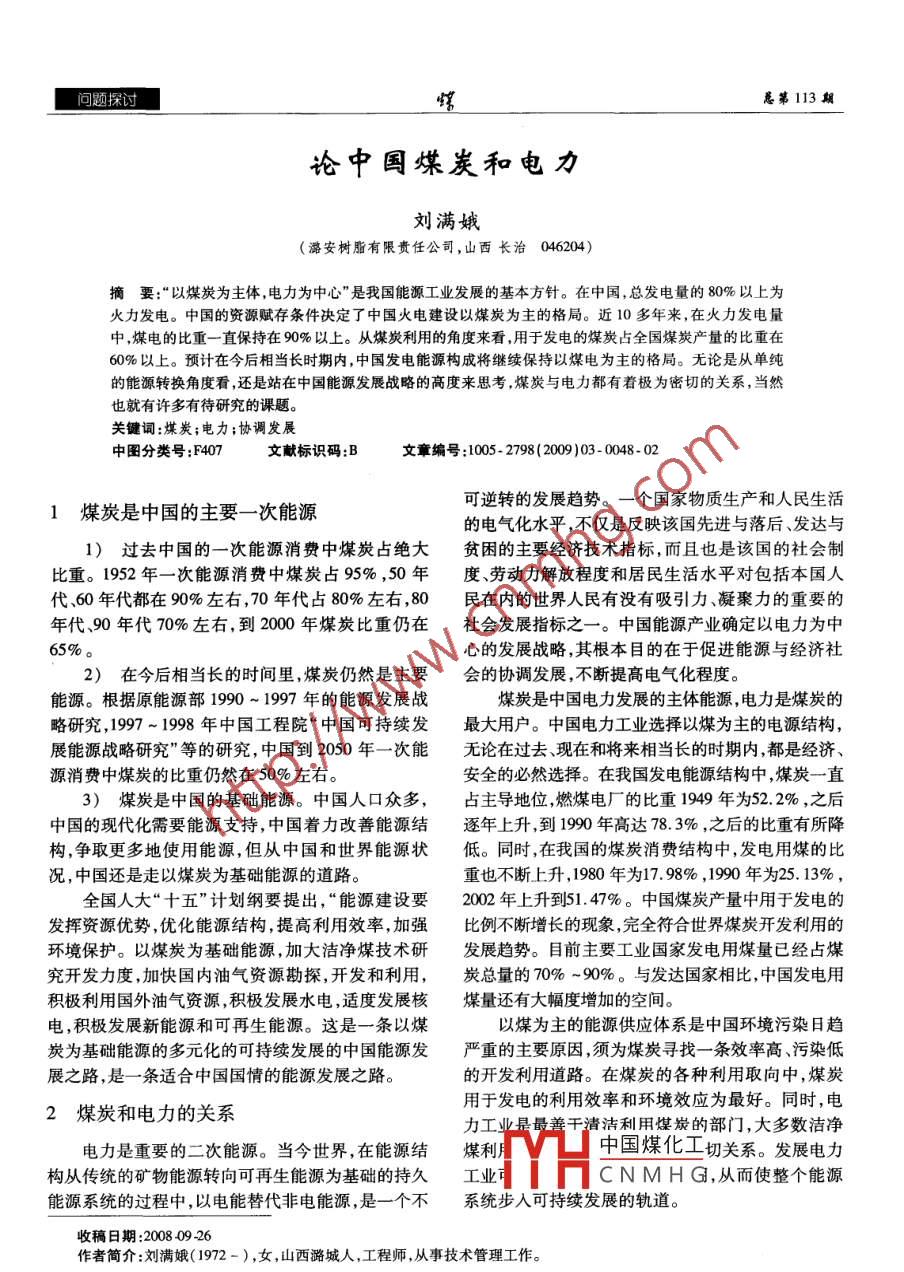 問題探討蝶總第113期論中國煤炭和電力劉滿娥(潞安樹脂有限責(zé)任公司,山西長治046204)摘要:“以煤炭為 主體,電力為中心”是我國能源工業(yè)發(fā)展的基本方針。在中國,總發(fā)電量的80%以上為火力發(fā)電。中國的資源賦存條件決定了中國火電建設(shè)以煤炭為主的格局。近10多年來,在火力發(fā)電量中,煤電的比重- -直保持在90%以上。從煤炭利用的角度來看,用于發(fā)電的煤炭占全國煤炭產(chǎn)量的比重在60%以上。預(yù)計在今后相當(dāng)長時期內(nèi),中國發(fā)電能源構(gòu)成將繼續(xù)保持以煤電為主的格局。無論是從單純的能源轉(zhuǎn)換角度看,還是站在中國能源發(fā)展戰(zhàn)略的高度來思考,煤炭與電力都有著極為密切的關(guān)系,當(dāng)然也就有許多有待研究的課題。關(guān)鍵詞:煤炭;電力;協(xié)調(diào)發(fā)展中圖分類號:F407文獻標(biāo)識碼:B文章編號:1005.2798(2009 )03.0048- 02可逆轉(zhuǎn)的發(fā)展趨勢。一個國家物質(zhì)生產(chǎn)和人民生活1煤炭是中國的主要- -次能源的電氣化水平,不僅是反映該國先進與落后、發(fā)達與1)過去中國的一次能源消費中煤炭占絕大貧困的主要經(jīng)濟技術(shù)指標(biāo),而且也是該國的社會制比重。1952年- -次能源消費中煤炭占95% ,50年度、勞動力解放程度和居民生活水平對包括本國人代、60年代都在90%左右,70年代占80%左右,80民在內(nèi)的世界人民有沒有吸引力、凝聚力的重要的年代、90年代70%左右,到2000年煤炭比重仍在.社會發(fā)展指標(biāo)之一-。中國能源產(chǎn)業(yè)確定以電力為中65%。心的發(fā)展戰(zhàn)略,其根本目的在于促進能源與經(jīng)濟社2)在今后相當(dāng)長的時間里,煤炭仍然是主要會的協(xié)調(diào)發(fā)展,不斷提高電氣化程度。能源。根據(jù)原能源部1990~ 1997年的能源發(fā)展戰(zhàn)煤炭是中國電力發(fā)展的主體能源,電力是煤炭的略研究,1997~1998年中國工程院“中國可持續(xù)發(fā)最大用戶。中國電力工業(yè)選擇以煤為主的電源結(jié)構(gòu),展能源戰(zhàn)略研究”等的研究,中國到2050年- -次能無論在過去、現(xiàn)在和將來相當(dāng)長的時期內(nèi),都是經(jīng)濟、源消費中煤炭的比重仍然在50%左右。安全的必然選擇。在我國發(fā)電能源結(jié)構(gòu)中,煤炭- -直3)煤炭是中 國的基礎(chǔ)能源。中國人口眾多,占主導(dǎo)地位,燃煤電廠的比重1949年為52.2% ,之后中國的現(xiàn)代化需要能源支持,中國著力改善能源結(jié)逐年上升,到1990年高達78. 3% ,之后的比重有所降構(gòu),爭取更多地使用能源,但從中國和世界能源狀低。同時,在我國的煤炭消費結(jié)構(gòu)中,發(fā)電用煤的比況,中國還是走以煤炭為基礎(chǔ)能源的道路。重也不斷上升, 1980年為17.98% ,1990年為25. 13% ,全國人大“十五”計劃綱要提出,“能源建設(shè)要2002年上升到51.47%。中國煤炭產(chǎn)量中用于發(fā)電的發(fā)揮資源優(yōu)勢,優(yōu)化能源結(jié)構(gòu),提高利用效率,加強比例不斷增長的現(xiàn)象,完全符合世界煤炭開發(fā)利用的環(huán)境保護。以煤炭為基礎(chǔ)能源,加大潔凈煤技術(shù)研發(fā)展趨勢。目前主要工業(yè)國家發(fā)電用煤量已經(jīng)占煤究開發(fā)力度,加快國內(nèi)油氣資源勘探,開發(fā)和利用,炭總量的70% ~90%。與發(fā)達國家相比,中國發(fā)電用積極利用國外油氣資源,積極發(fā)展水電,適度發(fā)展核煤量還有大幅度增加的空間。電,積極發(fā)展新能源和可再生能源。這是一條以煤以煤為主的能源供應(yīng)體系是中國環(huán)境污染日趨炭為基礎(chǔ)能源的多元化的可持續(xù)發(fā)展的中國能源發(fā)嚴重的主要原因,須為煤炭尋找-條效率高污染低展之路,是- -條適合中國國情的能源發(fā)展之路。的開發(fā)利用道路。在煤炭的各種利用取向中,煤炭用于發(fā)電的利用效率和環(huán)境效應(yīng)為最好。同時,電2煤炭和電力的關(guān)系力工業(yè)是最善干清潔利用煤炭的部門,大多數(shù)潔凈電力是重要的二次能源。當(dāng)今世界,在能源結(jié)煤利中國煤化工切關(guān)系。發(fā)展電力構(gòu)從傳統(tǒng)的礦物能源轉(zhuǎn)向可再生能源為基礎(chǔ)的持久工業(yè)YHCNMHG,從而使整個能源能源系統(tǒng)的過程中,以電能替代非電能源,是一一個不系統(tǒng)步入可持續(xù)發(fā)展的軌道。收稿日期:2008 09 -26作者簡介:劉滿娥( 1972 - ),女,山西潞城人,工程師,從事技術(shù)管理工作。482009年3月劉滿娥:論中國煤炭和電力第18卷第3期1)提高煤炭轉(zhuǎn)換 為電力的比例,可以節(jié)約能漿比較方便。我國已經(jīng)擁有先進的水煤漿技術(shù),2 t源和保護環(huán)境。煤炭轉(zhuǎn)換為電力及其熱力的梯級利水煤漿可以替代1 t 重油,1 t水煤漿的到廠價為用,其能源轉(zhuǎn)換效率是最高的,而且電力是最清潔、350 ~400元左右,而1 t重油價格在1 500元以上,使用最方便的能源,特別是對中國以煤煙型污染為用水煤漿代油可以節(jié)省大量費用,煙氣排放可以符主的狀況而言,發(fā)展電力、提高煤炭轉(zhuǎn)換為電力的比合國家環(huán)保要求。例,是減少大氣污染、保護環(huán)境使能源可持續(xù)發(fā)展的4)電力工 業(yè)要采用潔凈燃煤技術(shù)。中國的重要和有效的措施?;痣姀S已經(jīng)廣泛使用電除塵器,大機組上成功使用2)以電力為中心發(f