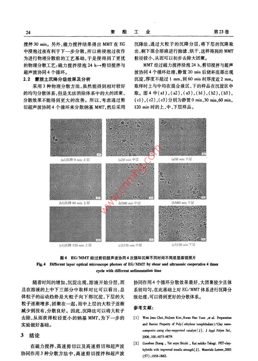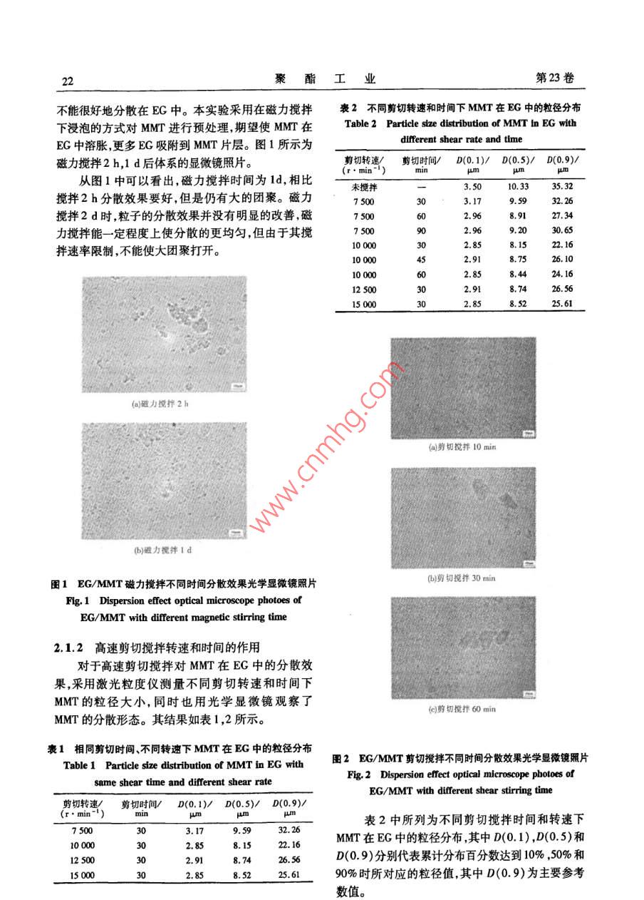 第23卷第1期聚酯工業(yè)VoL 23 No. 1201001Polyester IndustryJan.2010doi:10.3969/j,isn.10088261,2010.01.006蒙脫土在乙二醇中的分散性研究史君,郝翔,聶聰2,王小群(1.北京化工大學理學院北京100013;2.北京航空航天大學材料學院北京100083)摘要:以乙二醇(BG)為分散介質研究了不同分散及處理方法對蒙脫土(MMT)在乙二醇中分散性的彰響用激光粒度儀和光均勻的EGMT分散體系。在此基礎上對EGMM分散體系進行沉降分級可以有效除去難于分散的MMT大團W之散學顯微鏡對分散效果進行表征。結果表明采用高速剪切攪拌與超聲波分散結合的方法有助于形成蒙脫土粒徑相對小關鍵詞:蒙脫土,乙二醇分散中圖分類號:TQ223.162文獻標識碼:A文章編號:10088761(2010)0140021405聚對苯二甲酸乙二醇酯(PET)具有剛性和強京東方康明科技開發(fā)有限公司。度大、抗蠕變和尺寸穩(wěn)定性好等優(yōu)點,廣泛應用于纖13實驗步驟維薄膜和包裝瓶等工程塑料領域12,采用納米蒙1.3.1MMT在EG中的分散脫土(MMT)改性的PET復合材料具有更好的耐熱、室溫下將一定量的MMT和EG配制成質量比阻隔和阻燃性能。然而,納米MMT由于粒徑小、為1:15的混合液采用磁力攪拌高速剪切以及超表面能大,具有自發(fā)團聚的趨勢,而且其層間親聲波分散等方法分散一定時間待用。水極性大在極性較小的乙二醇中不易分散,團聚13.2MMT的沉降分級體的存在將大大影響納米MMT在PET復合材料中室溫下將MMT在磁力攪拌條件下浸泡24h,高發(fā)揮作用。速剪切攪拌與超聲波協(xié)同作用4個周期(剪切分散本課題前期研究發(fā)現(xiàn),通過原位聚合法制備10mn,超聲波5min為1個周期)后靜置沉降不同PET/MMT復合材料,MMT在組分乙二醇(EG)中的時間待用。分散好壞對MMT在 PET/MMT復合材料的分散以1.4表征及測試及該復合材料的性能有重要影響。因此,將MMT1.4.1激光粒度儀以較小粒徑均勻分散在EG中是至關重要的。用 Mastersizer000型激光粒度儀測量分散液中國內(nèi)研究者有將納米AT0,納米SO2以及MMr的粒徑大小。將分散液稀釋到一定比例,攪拌數(shù)細Cu粉體國等用不同處理方法分散在乙二醇轉速為1700r/mino中通過原位聚合法改性PET的研究,但關于MMT1.42光學顯微鏡在EG中的分散性研究鮮有報道。本文報告MMT將分散液取樣滴在載玻片上,用蓋玻片壓緊,用分散在EG中的研究,不同的分散及處理方法對 Motic BA300型光學顯微鏡(放大倍數(shù)為400)觀察MMT在EG中分散效果的影響。MMT在EG中的分散形態(tài)。光學顯微鏡分辨率低1實驗部分能觀察到的顆粒大小有限并且取樣代表性較差但是對于分散性不很好的 EG/MMT體系,可以大致11實驗原料及試劑觀察MMT的分散形態(tài),并且是一種快速在線觀察鈉基MMT,工業(yè)級,浙江豐虹粘土化工有限公分散效果的方法,避免了分散液中溶劑揮發(fā)造成的司,陽離子交換容量為100mmol/100g;EC,工業(yè)表面張力影響。級,中石油遼陽化纖分公司。12設備2結果及討論CL3型恒溫加熱磁力攪拌器,鞏義市予華儀器2.1不同分散方法對MMT在EG中分散效果作用有限責任公司;實驗室高剪切分散乳化機FSLI,上2.1.1磁力攪拌時間的影響海法孚萊機電科技發(fā)展有限公司;超聲波均化器,北由于MMT層間極性大,EG極性相對較小,MMT收稿日期:20091021。作者簡介:史君(1967-),女,江寧黑山人,高級工程師博士在讀,從事石油化工領域研究工作。2聚酯工業(yè)第23卷不能很好地分散在EG中。本實驗采用在磁力攪拌表2不同剪切轉速和時間下MMT在EG中的粒徑分布下浸泡的方式對MM進行預處理期望使MM在T-e2 Particle size distribution of MMT In EG withEG中溶脹更多EG吸附到MMT片層。圖1所示為Ifferent shear rate and time磁力攪拌2h,1d后體系的顯微鏡照片。剪切轉速/剪切時間′D(0.1)/D(0.5)/D(0.9)/從圖1中可以看出,磁力攪拌時間為1d,相比(r·min-1)未攪拌攪拌2h分散效果要好,但是仍有大的團聚。磁力3.179.5932.26攪拌2d時,粒子的分散效果并沒有明顯的改善磁75008.912734力攪拌能一定程度上使分散的更均勻,但由于其攪00050002.9630.拌速率限制,不能使大團聚打開。100022.16100008.7526.100002.85150002.858.5225.61(a)磁力攪拌2ha)剪切攪拌10minb)磁力攪拌1d圖1 EG/MMT磁力攪拌不同時間分散效果光學顯微鏡照片(b剪切攪拌30minFig 1 Dispersion effect optical microscope photoes ofEG/MMT with different magnetic stirring time21.2高速剪切攪拌轉速和時間的作用對于高速剪切攪拌對MMT在EG中的分散效果,采用激光粒度儀測量不同剪切轉速和時間下MMT的粒徑大小,同時也用光學顯微鏡觀察了)剪切攪拌60minMMT的分散形態(tài)。其結果如表1,2所示。表1相同剪切時間不同轉速下MMT在EG中的粒徑分布Table 1 Particle size distribution of mMT血nEGw圖2EG/MMT剪切攪拌不同時間分散效果光學顯微鏡照片same shear time and different shear rateFig. 2 Dispersion effect optical microscope photoes ofEG/MMT with different shear stirring time剪切轉速/剪切時間/D(0.1)′D(0.5)/D(0.9)/表2中所列為不同剪切攪拌時間和轉速下10002.858.1522.16MMT在EG中的粒徑分布,其中D(0.1),D(0.5)和125002.918.74265D(0.9)分別代表累計分布百分數(shù)達到10%,50%和2858.5225690%時所對應的粒徑值,其中D(0.9)為主要參考數(shù)值第1期史君,等:蒙脫土在乙二醇中的分散性研究由剪切分散和未剪切的粒徑比較可以得出,未超聲波分散作用的機理目前普遍認為與空化作用有剪切時,MMT在EG中各個分布水平的粒徑都要比關,這種空化作用導致液體分子的劇烈運動壓力和剪切后要大,說明剪