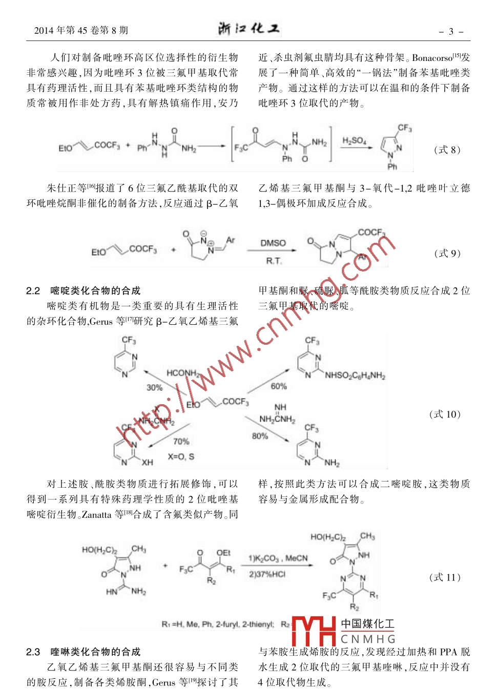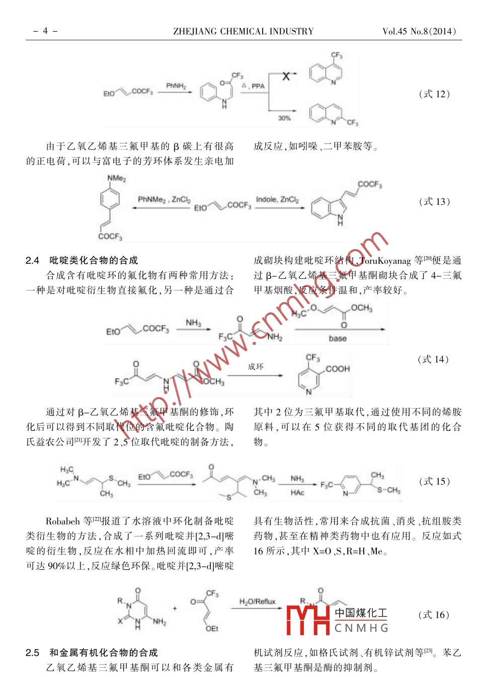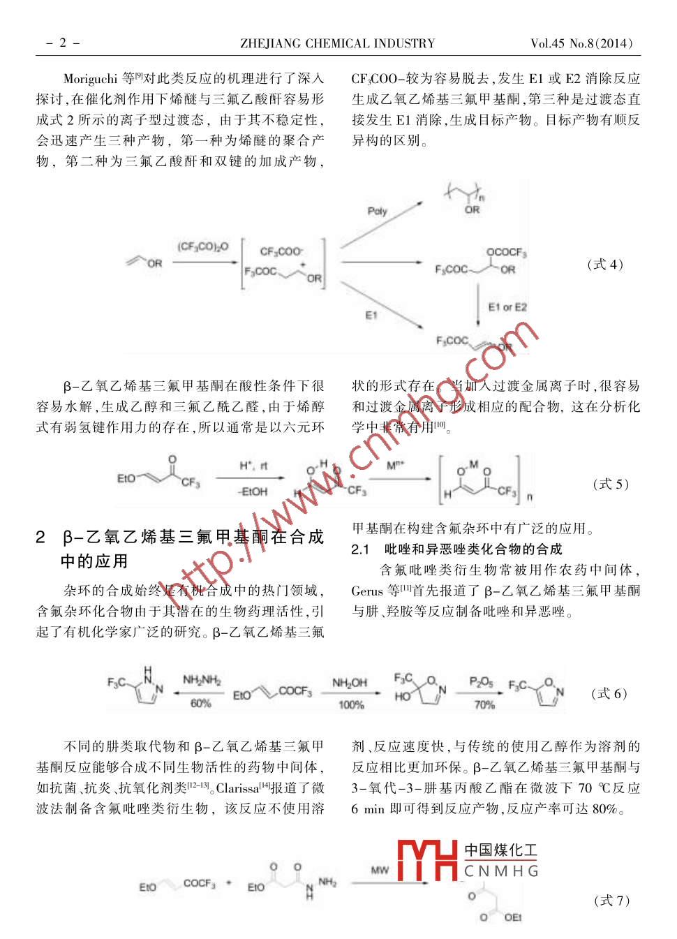 2014年第45卷第8期.浙江化工氟化工β-乙氧乙烯基三氟甲基酮的合成及應(yīng)用陳偉1,羅霞2,李華',徐衛(wèi)國1(1.浙江省化工研究院有限公司,浙江杭州310023;2.中化藍(lán)天集團(tuán)有限公司,浙江杭州310051)摘要:簡述了β-乙氧乙烯基三氟甲基酮的合成,以及作為基本的含氟砌塊在含三氟甲基雜環(huán)類物質(zhì)合成中的應(yīng)用。關(guān)鍵詞:含氟砌塊;雜環(huán)合成;應(yīng)用文章編號: 1006-4184(2014)8-0001 -06通過把甲基轉(zhuǎn)化為三氟甲基四是合成具有生個反應(yīng)位點(diǎn),不僅能夠和常用的化學(xué)試劑醇類、胺物活性化合物的有效手段,科研人員開發(fā)了許多類 、金屬有機(jī)試劑等反應(yīng),還能夠構(gòu)筑雜環(huán)類化氟化試劑,可以對分子的特定位置進(jìn)行氟化,進(jìn)而合物,這在合成農(nóng)藥、醫(yī)藥中間體5時(shí)非常重要。構(gòu)建需要的含氟分子。通過直接引人三氟甲基基1β-乙氧乙烯基三氟甲基酮的合成團(tuán)也不失為一一個好策略,典型的如含有三氟甲基的1,3二酮類凹β -酮酸酯類甲,然而人們對三氟乙Gambaryan等在1967 年首次合成了β-乙酰乙醛及其衍生物β-烷氧乙烯基三氟甲基酮4氧乙烯基三氟甲基酮,反應(yīng)通過全氟硝基丙酮和作為二酮類合成砌塊的關(guān)注較少,由于其含有多乙基乙烯基醚經(jīng)過三步合成,總產(chǎn)率52%。EIOCH=CH23ateps.Ero COCFFxC CF:NO2(式1)52%1976年,日本研究人員發(fā)現(xiàn)三氟乙酸酐和乙基乙烯基醚反應(yīng)可以較高產(chǎn)率得到目標(biāo)產(chǎn)物。(CFgCO)2OPy(式2)95%Gorbunova等8發(fā)現(xiàn)通過乙基乙烯醚和各類全氟烷基酮,但是二氟甲基乙?;a(chǎn)率只有全氟烷基酰氯反應(yīng)可以制備多種β-烷氧乙烯基23%,而單氟甲基在同等條件下不能夠發(fā)生反應(yīng)。yrr .COR=E10-● R-Coc60%~90%R:= CF2SO2F. C2Fs. CgFr.中國煤化工(式3)Yield, % 6377 83MYHCNMHG修回日期:2014-07-29作者簡介:陳偉(1985-),男,江蘇徐州人,工程師,碩士,從事含氟精細(xì)化學(xué)品研究。E-mail:chenwei17@sinochem.com。2-ZHEJIANG CHEMICAL INDUSTRYVol.45 No.8(2014)Moriguchi等對此類反應(yīng)的機(jī)理進(jìn)行了深人.CFCO0-較為容易脫去,發(fā)生E1或E2消除反應(yīng)探討,在催化劑作用下烯醚與三氟乙酸酐容易形生成乙氧乙烯基三氟甲基酮,第三種是過渡態(tài)直成式2所示的離子型過渡態(tài),由于其不穩(wěn)定性,接發(fā)生E1消除,生成目標(biāo)產(chǎn)物。目標(biāo)產(chǎn)物有順反會迅速產(chǎn)生三種產(chǎn)物,第一種為烯醚的聚合產(chǎn)異構(gòu)的區(qū)別。物,第二種為三氟乙酸酐和雙鍵的加成產(chǎn)物,PalyOR(CF;CO)20CF:COOQCOCF:A OR(式4)FycOCFyCOC~ ORE1or E2E1β-乙氧乙烯基三氟甲基酮在酸性條件下很狀的形式存在。當(dāng)加人過渡金屬離子時(shí),很容易容易水解,生成乙醇和三氟乙酰乙醛,由于烯醇和過渡金屬離子形成相應(yīng)的配合物,這在分析化式有弱氫鍵作用力的存在,所以通常是以六元環(huán)學(xué)中非常有用"。H*, rtM"*E1IO--EtOH"。~CFs(式5)2β-乙氧乙烯基三氟甲基酮在合成甲基酮在構(gòu)建含氟雜環(huán)中有廣泛的應(yīng)用。2.1吡唑和異惡唑類化合物的合成中的應(yīng)用含氟吡唑類衍生物常被用作農(nóng)藥中間體,雜環(huán)的合成始終是有機(jī)合成中的熱門領(lǐng)域,Gerus等叫首先報(bào)道了β-乙氧乙烯基三氟甲基酮含氟雜環(huán)化合物由于其潛在的生物藥理活性,引與肼、羥胺等反應(yīng)制備吡唑和異惡唑。起了有機(jī)化學(xué)家廣泛的研究。β-乙氧乙烯基三氟FsCNHNHNH2OHFzC aP2Os心60%EIoVCOCFs100%HO70%(式6)不同的肼類取代物和β-乙氧乙烯基三氟甲劑、反應(yīng)速度快,與傳統(tǒng)的使用乙醇作為溶劑的基酮反應(yīng)能夠合成不同生物活性的藥物中間體,反應(yīng)相比更加環(huán)保。β-乙氧乙烯基三氟甲基酮與如抗菌、抗炎、抗氧化劑類12-1。Clarisal4報(bào)道了微3-氧代-3-肼基丙酸乙酯在微波下70 C反應(yīng)波法制備含氟吡唑類衍生物,該反應(yīng)不使用溶6min即可得到反應(yīng)產(chǎn)物,反應(yīng)產(chǎn)率可達(dá)80%。中國煤化工0。MYHCNMHGEro COCFg * EO。(式7)0 OEI2014年第45卷第8期.浙江化工-3-人們對制備吡唑環(huán)高區(qū)位選擇性的衍生物近、殺蟲劑氟蟲腈均具有這種骨架。Bonacorsol5'發(fā)非常感興趣,因?yàn)檫吝颦h(huán)3位被三氟甲基取代常展了一種簡單、高效的“一鍋法”制備苯基吡唑類具有藥理活性,而且具有苯基吡唑環(huán)類結(jié)構(gòu)的物產(chǎn)物。通過這樣的方法可以在溫和的條件下制備質(zhì)常被用作非處方藥,具有解熱鎮(zhèn)痛作用,安乃吡唑環(huán)3位取代的產(chǎn)物。E1O、COCFs + Ph-^~NH2FsC(式8)Ph朱仕正等呵報(bào)道了6位三氟乙?;〈碾p.乙烯基三氟甲基酮與3-氧代-1,2吡唑葉立德環(huán)吡唑烷酮非催化的制備方法,反應(yīng)通過β-乙氧1,3-偶極環(huán)加成反應(yīng)合成。COCF:ArDMSOEto COCFs9(式9)R.T.2.2嘧啶類化合物的合成甲基酮和脲、硫脲、胍等酰胺類物質(zhì)反應(yīng)合成2位嘧啶類有機(jī)物是一-類重要的具有生理活性三氟甲基取代的嘧啶。的雜環(huán)化合物,Gerus等7研究β-乙氧乙烯基三氟CFsHCONH2N個 ^NHSO2CgHNH230%60% .XEto、COCF3NH(式10)NH2CNH2、NH2CNH2CF380%70%~XHX=O,SNH2對上述胺、酰胺類物質(zhì)進(jìn)行拓展修飾,可以樣,按照此類方法可以合成二嘧啶胺,這類物質(zhì)得到一系列具有特殊藥理學(xué)性質(zh