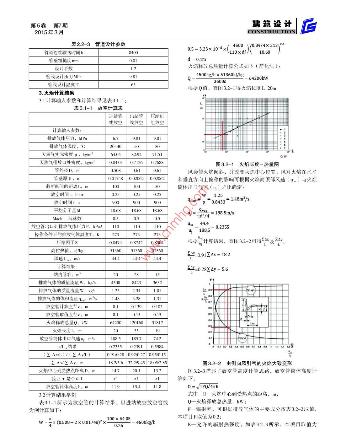 后建筑設(shè)計第5卷第7期CONSTRUCTION2015年3月天然氣火炬系統(tǒng)設(shè)計淺析張欣彭立劉佳中國石油工程建設(shè)公司北京市100101摘要:本文以一個天然氣壓氣站為例,對天然氣火炬系統(tǒng)的工藝設(shè)計進行介紹,火炬尺寸計算按照API-521規(guī)范進行設(shè)計,通過泄放計算確定了放空量;通過計算馬赫敫確定了火炬筒體直徑;通過熱輻射值的計算確定了火炬筒體高度和火炬輻射聿徑關(guān)鍵詞:火炬;放空;熱輻射值;筒體高度計算中圖分類號:S611文獻標(biāo)識碼:A為保障天然氣集輸管網(wǎng)安全平穩(wěn)運行,各集輸站場均設(shè)置p一放空氣體操作工況下密度,kgm2了放空立管,泄放超高限的壓力,排放運行作業(yè)中的廢氣或?qū)峵一放空時間現(xiàn)緊急狀態(tài)下的事故放空。放空天然氣是一種嚴(yán)重的污染源根據(jù) APISTD521對站場放空管筒體直徑、高度計熱輻射距而且其主要組分甲烷對遠(yuǎn)紅外輻射的吸收比二氧化碳更強烈,離進行計算因而具有更強的溫室效應(yīng)。一般情況下均應(yīng)點火,通過燃燒,ZT o5Ma=3.23×10-3x使這種可燃、有毒、腐蝕性氣體危害變小,同時燃燒釋放的熱能也將加速排放氣體在大氣中擴散。設(shè)計合理的放空立管能保式中Ma馬赫數(shù);火炬燃燒效率、熱輻射、噪聲和氣體擴散等完全滿足環(huán)境保W一放空氣體質(zhì)量流量,kgh護有關(guān)要求,有效減輕污染和其它公害,改善環(huán)境質(zhì)量,使工P2放空管出口處排放氣體壓力,kPaA程設(shè)計的社會效益、經(jīng)濟效益和環(huán)境效益相統(tǒng)本文以一個壓氣站的放空計算為例對火炬系統(tǒng)設(shè)計進行了T一放空氣體溫度,K;M一放空氣體分子量1.站場放空系統(tǒng)描述d一放空管直徑,m。通常,站場放空分為正常放空和緊急放空,設(shè)備檢修、壓2.1設(shè)計輸入條件縮機組啟停時,放空量較小、放空時間較短,可以直接放空221氣質(zhì)組分及輸送條件氣站發(fā)生事故或干線事故放空屬于緊急放空,此時需考慮閥氣質(zhì)組分如表22-1所示門關(guān)閉后,管道內(nèi)氣體的放空,這種放空量很大,放空操作時表22-1氣質(zhì)組分需要調(diào)節(jié)放空閥的開度或開啟速度來調(diào)節(jié)放空時間和放空量,組分體積含量%以減少放空時的氣體流速、降低噪音。N,(Nitrogen壓氣站的壓縮機組自帶ESD停車系統(tǒng),當(dāng)機組故障時(如高溫報警,高、低壓報警,機組振動等),機組ESD系統(tǒng)啟動,組停機,并對機組進行放空。H2S( Hydrogen Sulphide壓氣站進、出站管線上設(shè)有緊急截斷系統(tǒng)(ESD,該系統(tǒng)包括緊急切斷閥和緊急放空閥,當(dāng)站內(nèi)事故時(如火災(zāi)、C2( Ethane地震等),緊急截斷閥立即自動關(guān)斷,將干線來氣管線和站場C3( Propane隔開。同時進出站放空管線上的緊急放空閥自動打開,放空i-C4( i-Butane管內(nèi)天然氣本項目站內(nèi)的放空采用的是帶點火裝置的放空管n-C4( n-Butane0.212站場放空計算根據(jù) APISTD521規(guī)定,確定緊急放空系統(tǒng)的尺寸,一般情0.0l況下要求約在15min,設(shè)備內(nèi)壓力從最初的壓力降到設(shè)計壓力氣體的輸送條件如表22-2所示的50%或者690kPa(取小值)表22-2氣體輸送條件放空系統(tǒng)泄放量按照放空管的最大排放量確定,氣體質(zhì)量輸送流量Sm33×10流率根據(jù)站內(nèi)需要放空天然氣的管容計算,計算公式如下起始端輸送溫度℃W=×(D-282xLxρ進站壓力MPa出站壓力要求MPa式中W一放空氣體質(zhì)量流量,kg/hD—一放空管外徑,m進/出站管線尺寸δ一放空管壁厚222管道設(shè)計參數(shù)L一兩個截斷閥之間的長度,m;管道設(shè)計參數(shù)如表22-3所示第5卷第7期建筑設(shè)計2015年3月CONSTRUCTIONI表22-3管道設(shè)計參數(shù)管道連續(xù)輸送時間h0.5=323×X10-5×4500/08474×313058400110Xd2管壁粗糙度mm0.01d=0.1m設(shè)計系數(shù)火焰釋放總熱量計算公式如下(簡化法):管線設(shè)計壓力MPa4500kg/h×51360k/kgQ3600s=64200kW管線設(shè)計溫度℃根據(jù)Q值,查圖3.2-1得火焰長度L=20m3.火炬計算結(jié)果3.1計算輸入?yún)?shù)和計算結(jié)果見表3.1-1:表31-1放空計算表進站管出站管壓縮機線放空線放空組放空計算輸入?yún)?shù):排放氣體壓力,MPa6.79.819.81排放氣體溫度,℃C20-40天然氣實際密度p,kg/m364.0582927151天然氣排放口處密度,kgmn3043307607688圖32-1火焰長度一熱量圖0.61風(fēng)會使火焰傾斜,并改變火焰中心位置。風(fēng)對火焰在水平管壁厚8,m001440002402和垂直方向上偏移的影響可根據(jù)火焰筒頂部風(fēng)速(u)與火炬截斷閥間的距離L,m筒體出口氣速(u)之比確定放空時間t,hr025W1.25放空時間t,sqap p 0.8433平均分子量M18.681885m/Mach--馬赫數(shù)放空管出口處排放氣體壓力PkPA101010操作條件下的排放氣體溫度T,K=18520235壓縮因子Z0.84740.874208304根據(jù)計算結(jié)果,查圖32.2可得圖及A高位熱值,kJ/kg=0.91∑△x=182計算結(jié)果站內(nèi)管容排放氣體的質(zhì)量流量w,kgh|450084233632排放氣體的質(zhì)量流量W,kgs1.25234101排放氣體的體積流量qm,m1.31放空管計算直徑d,m0.0390102放空管取值直徑d,m火焰釋放總量Q,AW642012068587火焰長度放空管簡體出口氣速…,m74.2結(jié)果0.23550.23910.5984(∑△x/L)/(∑△yL)0.91/0.28092027|0∑Δx/ΣΔy,m182/5.632.2/94518.052:5圖32-2由側(cè)向風(fēng)引氣的火焰大致變形火焰中心到受熱點距離D,m14.7圖3.2-3描述了放空管高度計算思路,放空管筒體高度計驗證T是