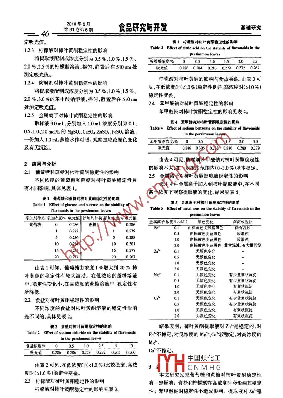 2010年6月基礎(chǔ)研究食品研究與開(kāi)發(fā)第31卷第6期一-45一食品添加劑對(duì)柿葉黃酮穩(wěn)定性的影響杜海珍(廣州市清香農(nóng)產(chǎn)有限公司,廣東廣州510925)摘要:研究常用食品添 加劑對(duì)柿葉黃酮穩(wěn)定性的影響。結(jié)果表明:葡萄糖和蔗糖對(duì)穩(wěn)定性有一定影響;食鹽和檸檬酸在高濃度時(shí)會(huì)影響其穩(wěn)定性;苯甲酸鈉對(duì)穩(wěn)定性不造成影響;提取液對(duì)Zzn^穩(wěn)定,對(duì)Fe2不穩(wěn)定,對(duì)低濃度的Mg^*、Car較穩(wěn)定,而對(duì)高濃度的Mg2、Ca2不穩(wěn)定。關(guān)鍵詞:柿葉;黃酮;食品添加劑;穩(wěn)定性Research on the Stability of Flavonoids in the Persimmon Leaves Influenced by the Food AdditiveDU Hai- -zhen(Guangzhou Fragrance Agricultural Products Co, Ld, Guangzhou 510925, Guangdong, China)Abstract: The stability of flavonoids in the persimmon leaves infuenced by the food additive was studied in thepaper. The results were as follows: Glucose and sucrose somewhat influenced stability; it was influenced in highsalt and citric acid concentration; sodium benzoate has no effect on stability; it was stabled with Zn2+ andinstability with Fe*, for Mg2° and Ca*, stabled in low concentration, instability in high concentration.Key words: persimmon leaves ; flavonoids; food additive; stability柿葉具有較高的營(yíng)養(yǎng)價(jià)值和醫(yī)療保健作用,資源提取一次,抽濾,濾渣再提取一次,抽濾,合并兩次的濾豐富,使用方便,療效確切,正日益受到人們的重視。液,旋轉(zhuǎn)蒸發(fā)回收乙醇至浸膏狀,浸膏加水溶解,以隨著對(duì)柿葉研究和應(yīng)用的不斷擴(kuò)大,這一天然植物資5 000 r/min的轉(zhuǎn)速離心20 min,加水定容至2 L得澄源被越來(lái)越多的人所認(rèn)可和接受,開(kāi)發(fā)和利用柿葉勢(shì)清提取液,冷藏備用。在必行。因此,本文將著重于從實(shí)際角度來(lái)考察食品1.1.1.3試劑添加劑對(duì)柿葉黃酮性質(zhì)的影響,使其作為一種天然可葡萄糖果糖.食鹽檸檬酸、防腐劑:均為食品級(jí)。利用資源在食品I業(yè)中發(fā)揮更大作用提供-定的理1.1.2儀器與設(shè)備論參考。FA2004.上皿電子天平(d=0.1 mg):上海精科天平儀器廠;UV755B紫外可見(jiàn)分光光度計(jì):上海精密科學(xué)1材料與方法儀器有限公司;電熱恒溫水浴鍋:上海滬南化學(xué)儀器聯(lián)1.1材料與儀器合廠;FD-P0.3( I )真空冷凍干燥設(shè)備:廣州市瑞欣機(jī)1.1.1材料 與試劑電設(shè)備T.程有限公司;DCG- -9420A 型電熱恒溫鼓風(fēng)千1.1.1.1材料 .燥箱:上海森信實(shí)驗(yàn)儀器有限公司。柿葉,4月.6月、10月采于廣東省從化市。挑選完1.2試驗(yàn)方法整、無(wú)蟲眼、無(wú)污染的柿葉.清洗除雜,于烘箱中60 C~1.2.1葡萄糖 和蔗糖對(duì)柿葉黃酮穩(wěn)定性的影響65 C烘干至水分含量6%,粉碎后過(guò)60目~80目篩,將提取液分別配制成濃度為1 % .5 % .10%.15%、柿葉粉末置于干燥器中備用。20 %{中國(guó)煤化工%、20%的蔗糖溶1.1.1.2提取液制備液,搖YHCNMHG光值。.柿葉黃酮提取液的制備:稱取- -定量柿葉粉末,1.2.2食鹽對(duì)柿葉黃酮穩(wěn)定性的影響作者簡(jiǎn)介:杜海珍( 1971-),女(漢),工程師,學(xué)士,研究方向:農(nóng)產(chǎn)品將提取液配制成濃度分別為0.5 %.1.0%、2.5 %、貯藏與加工。5.0%.10%的食鹽溶液,搖勻,靜置后在510nm處測(cè)2010年6月食品研究與開(kāi)發(fā)基礎(chǔ)研究第31卷第6期一46-表3檸檬酸對(duì)柿葉黃酮穩(wěn)定性的影響定吸光值。Tabe3 Eret of dirte acid on the sbily of favooido in the1.2.3檸檬酸對(duì)柿葉 黃酮穩(wěn)定性的影響persimmon leaves將提取液配制成濃度分別為0.5 %、1.0 %、1.5 %、檸檬酸濃度院0 0.5 - 1.0 1520252.0% .2.5 %的檸檬酸溶液,搖勻,靜置后在510 nm處吸光值0.286 0.284 0.283 0.279 0.272 0.267測(cè)定吸光值。檸檬酸對(duì)柿葉黃酮的影響與食鹽類似,由表3可1.2.4防腐劑對(duì)柿葉黃酮穩(wěn)定性的影響見(jiàn),在低濃度時(shí)(<1.0%)穩(wěn)定性良好,高濃度時(shí)(>1.0%)將提取液配制成濃度分別為0.5 %.1.0%.1.5%、穩(wěn)定性變差。2.0%.3.0%的苯甲酸鈉溶液,搖勻,靜置后在510nm2.4苯甲 酸鈉對(duì)柿葉黃酮穩(wěn)定性的影響處測(cè)定吸光值。苯甲酸鈉對(duì)柿葉黃酮穩(wěn)定性的影響見(jiàn)表4。1.2.5金屬離子對(duì)柿葉黃酮穩(wěn)定性的影響表4苯甲酸鈉對(duì)柿葉黃酮穩(wěn)定性的影響取樣液9.0 mL,分別加入1.0 mL濃度分別為0.1、Table4 Etfect of sodium benzoate on the stability of flavonoids0.5.1.0.2.0 mol/L的MgSOvCaSO, .ZnSO.FeSO溶液,in the persimmon leaves一份加入 1.0mL蒸餾水作對(duì)照。觀察提取液顏色變化苯甲微鈉濃度局 0 0.5_ 10 5 20 3.0及有無(wú)沉淀。0.286 0.306 0.288 0.286 0.280 0.279由表4可見(jiàn),防腐劑苯甲酸鈉對(duì)柿葉黃酮穩(wěn)定性2結(jié)果與分析的影響不大,在- -定濃度范圍內(nèi)(0-~3.0 % )基本穩(wěn)定。2.1葡萄糖和蔗糖對(duì)柿葉黃酮穩(wěn)定性的影響2.5金屬離子對(duì)柿葉黃酮提 取液穩(wěn)定性的影響不同濃度的葡萄糖和蔗糖對(duì)柿葉黃酮穩(wěn)定性具選用4種金屬離子加入到柿葉提取液中,在不同有不同影響,具體見(jiàn)表1。離子濃度下觀察提取液的變化,結(jié)果見(jiàn)表5。表1葡萄糖和蔗糖對(duì)柿葉黃酮穩(wěn)定性的影響表5金屬離子對(duì)柿葉黃麗穩(wěn)定性的影響Table 1 Eftect of glucose and sucrose on the sability oTable5 Eect of metal ions on the sabili of flavonoids in thefavonoids in the persimmon leaves黍加利種