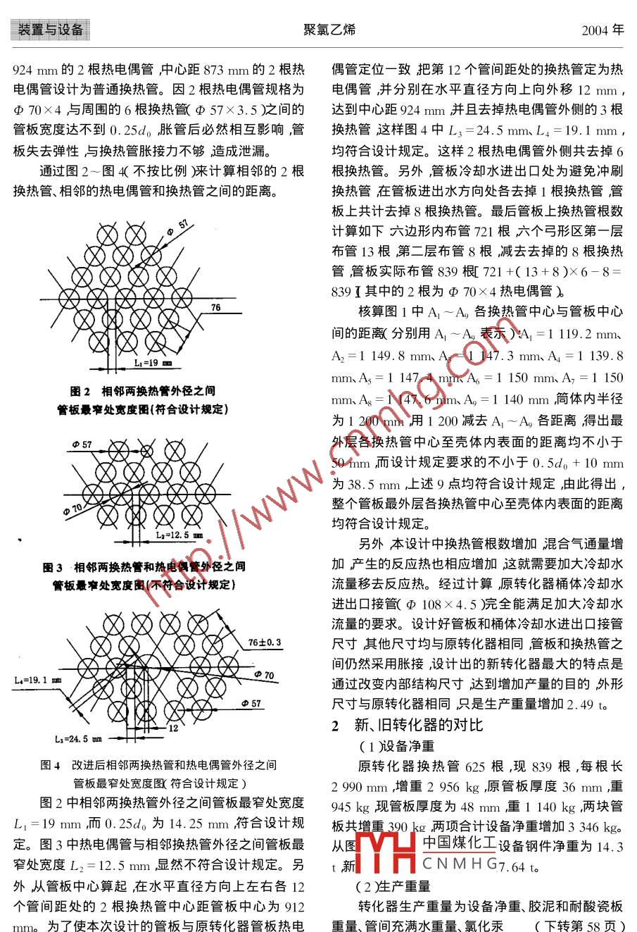 第5期聚氯乙烯No 52004年9月Polyvinyl Chloridesep.2004【裝置與設(shè)備】轉(zhuǎn)化器擴(kuò)產(chǎn)改造孫占峰(唐山三友集團(tuán)冀東化工有限公司河北唐山063021)[關(guān)鍵詞]聚氯乙烯轉(zhuǎn)化器管板管心距換熱管脹接[摘要]介紹了聚氯乙烯生產(chǎn)過(guò)程中原轉(zhuǎn)化器的使用情況和新轉(zhuǎn)化器的改造情況在設(shè)備外形不變的情況下達(dá)到了增加產(chǎn)量的目的[中圖分類號(hào)]TQ325.3江IQ052[文獻(xiàn)標(biāo)識(shí)碼]B[文章編號(hào)]1009-793x2004)5-0053-0冀東化工有限公司簡(jiǎn)稱翼東公司臊氯乙烯樹1.25do=1.25×57=71.25(mm)符合設(shè)計(jì)要脂產(chǎn)能4.5萬(wàn)ta規(guī)模較小而聚氯乙烯樹脂產(chǎn)量、求。原管板厚度36mm現(xiàn)開孔率增加管板強(qiáng)度成本的高低直接關(guān)系到冀東公司的生存和發(fā)展。下降故需增加管板厚度。通過(guò)計(jì)算根據(jù)以往的經(jīng)冀東公司采用電石法生產(chǎn)聚氯乙烯樹脂要想驗(yàn)并考慮加工的經(jīng)濟(jì)性選取管板厚度48mmo提高聚氯乙烯樹脂產(chǎn)量必須提高轉(zhuǎn)化器的換熱面管心距和管板厚度選好后用畫圖法在管板上積和通氣體積也就是說(shuō)要增加換熱管的數(shù)量。冀原布管范圍內(nèi)按照正三角形排列法布置換熱管同東公司原來(lái)用的轉(zhuǎn)化器尺寸為簡(jiǎn)體直徑2400時(shí)符合最外層列管中心至殼體內(nèi)表面的距離不小于mm、璧厚10mm管板厚36mm管心距84mm換0.5a+10mm,畫出管板圖共計(jì)布置換熱管839熱管Φ57×3.孓長(zhǎng)度2980mm共計(jì)625根)管板根見管板局部俯視圖1。和換熱管之間采用脹接,設(shè)備凈重(鋼件重)4.3t,膠泥和耐酸瓷板重1.84t。通過(guò)到天津化工廠參觀交流發(fā)現(xiàn)可以適當(dāng)縮義風(fēng)小現(xiàn)有管板的管心距增加管板開孔率在原布管區(qū)內(nèi)布置更多的換熱管,可以增加轉(zhuǎn)化器的換熱面積和混合氣氯化氫氣體和乙炔氣體)的通氣體積在保證原系統(tǒng)壓力不變的情況下增加混合氣流量從而增加聚氯乙烯產(chǎn)量1新轉(zhuǎn)化器的設(shè)計(jì)管心距主要應(yīng)考慮管板的強(qiáng)度和清洗管子外面時(shí)所需的空隙并考慮脹接法管子與管板之間的彈性連接力。如管心距太小管板脹接時(shí)在擠壓力的作用下會(huì)發(fā)生變形失去彈性破壞管子與管板之間風(fēng)義義區(qū)的密封但管心距太大造成布管減少換熱面積減少不利于提高產(chǎn)量參考GB151-199《管殼式換熱器》和《化工過(guò)程及設(shè)備設(shè)計(jì)X華南理工大學(xué)化工原理教研組編)管圖1管板局部俯視簡(jiǎn)圖換熱管間管板最小寬度為025,且最外層列管中兩務(wù)聲煤化電草。管板上心距L≥1.25a(式中d0為換熱管外徑)即相鄰本次設(shè)計(jì)最主要的改動(dòng)部分是管板4)至殼體內(nèi)依據(jù)上述規(guī)定本設(shè)計(jì)選用管心距76mm:比使用,L. CNMHG次設(shè)計(jì)只保留中心距[收稿日期]2004-07-15[作者簡(jiǎn)介]孫占1970-)男992年畢業(yè)于河北工業(yè)大學(xué)化學(xué)工程系化工機(jī)械與設(shè)備專業(yè)工程師副主任。53裝置與設(shè)備聚氯乙烯2004年924mm的2根熱電偶管中心距873mm的2根熱偶管定位一致把第12個(gè)管間距處的換熱管定為熱電偶管設(shè)計(jì)為普通換熱管。因2根熱電偶管規(guī)格為電偶管并分別在水平直徑方向上向外移12mm,Φ0×4與周圍的6根換熱氜Φ57×3.5之間的達(dá)到中心距924mm并且去掉熱電偶管外側(cè)的3根管板寬度達(dá)不到0.25a脹管后必然相互影響管換熱管這樣圖4中L3=24.5mm、L4=19.1mm,板失去彈性與換熱管脹接力不夠造成泄漏。均符合設(shè)計(jì)規(guī)定。這樣2根熱電偶管外側(cè)共去掉6通過(guò)圖2~圖4不按比例)來(lái)計(jì)算相鄰的2根根換熱管。另外管板冷卻水進(jìn)出口處為避免沖刷換熱管、相鄰的熱電偶管和換熱管之間的距離。換熱管在管板進(jìn)岀水方向處各去掉1根換熱管管板上共計(jì)去掉8根換熱管。最后管板上換熱管根數(shù)計(jì)算如下六邊形內(nèi)布管721根六個(gè)弓形區(qū)第一層布管13根第二層布管8根減去去掉的8根換熱管管板實(shí)際布管839根721+(13+8)×6-8:839其中的2根為Φ70×4熱電偶管核算圖1中A~A各換熱管中心與管板中間的距離分別用A1~A表示)A1=1119.2mmA2=1149.8mmA3=1147.3mmA4=1139.8mmA5=1147.4mm、A6=1150mm、A7=1150圖2相鄰兩換熱管外徑之間mmA3=1147.6mmA=1140mm簡(jiǎn)體內(nèi)半徑管板最窄處寬度圖(符合設(shè)計(jì)規(guī)定為1200mm用1200減去A1~A各距離得出最外層各換熱管中心至殼體內(nèi)表面的距離均不小于50mm而設(shè)計(jì)規(guī)定要求的不小于0.5d+10mm為38.5mm,上述9點(diǎn)均符合設(shè)計(jì)規(guī)定由此得出,整個(gè)管板最外層各換熱管中心至殼體內(nèi)表面的距離均符合設(shè)計(jì)規(guī)定L=12.5m另外本設(shè)計(jì)中換熱管根數(shù)增加混合氣通量增圖3相鄰兩換熱管和熱電偶管外徑之聞加產(chǎn)生的反應(yīng)熱也相應(yīng)增加這就需要加大冷卻水管板最窄處寬度圖(不符合設(shè)計(jì)規(guī)定流量移去反應(yīng)熱。經(jīng)過(guò)計(jì)算原轉(zhuǎn)化器桶體冷卻水進(jìn)出口接管(Φ108×4.5)浣全能滿足加大冷卻水流量的要求。設(shè)計(jì)好管板和桶體冷卻水進(jìn)出口接管76±0.3尺寸其他尺寸均與原轉(zhuǎn)化器相同管板和換熱管之間仍然采用脹接設(sh