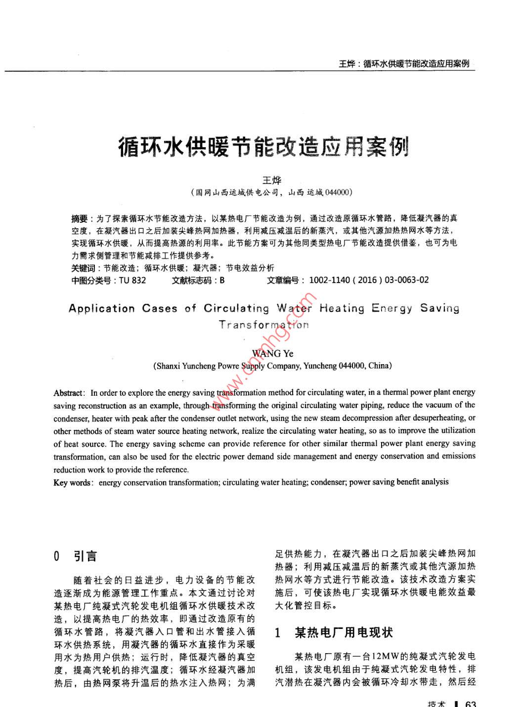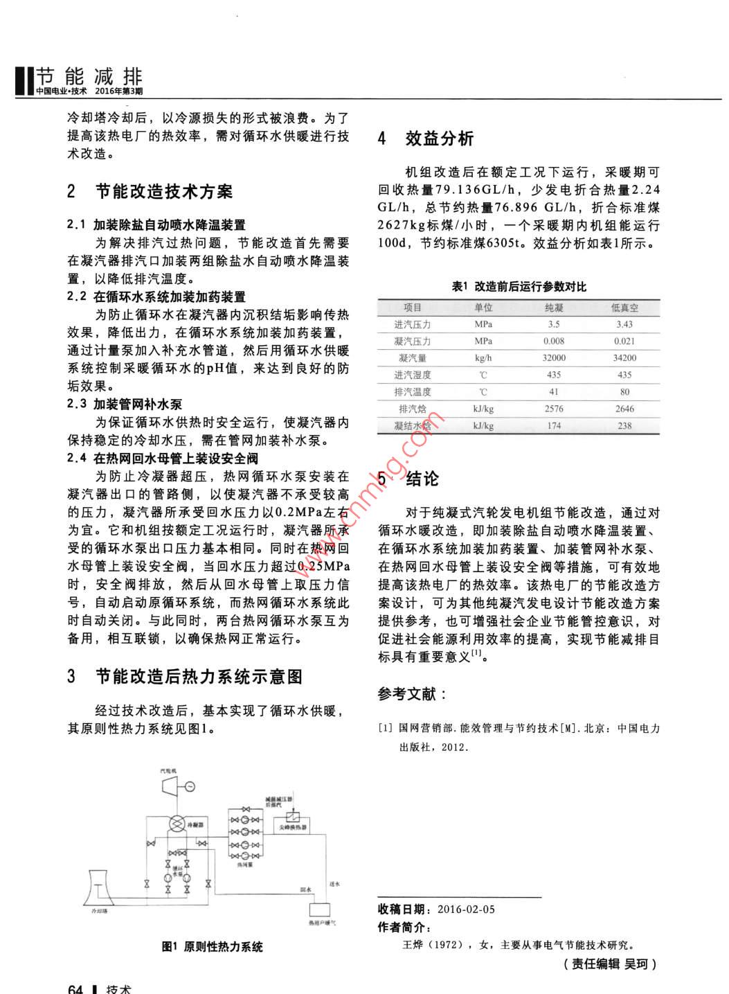 王燁:循環(huán)水供暖節(jié)能改造應(yīng)用案例循環(huán)水供暖節(jié)能改造應(yīng)用案例王燁(國網(wǎng)山西運城供電公司,山西運城0400摘要:為了探素循環(huán)水節(jié)能改造方法,以某熱電廠節(jié)能改造為例,通過改造原循環(huán)水管路,降低凝汽器的真空度,在凝汽器出口之后加裝尖峰熱網(wǎng)加熱器,利用減壓減溫后的新蒸汽,或其他汽源加熱熱網(wǎng)水等方法實現(xiàn)循環(huán)水供暖,從而提高熱源的利用率。此節(jié)能方案可為其他同類型熱電廠節(jié)能改造提供借鑒,也可為電力需求側(cè)管理和節(jié)能減排工作提供參考。關(guān)鍵詞:節(jié)能改造;循環(huán)水供暖;凝汽器;節(jié)電效益分析中圖分類號:TU832文獻標志碼:B文章編號:1002-1140(2016)03-0063-02Application Cases of circulating Water Heating Ener gy SavingTrans formationWANG Ye( Shanxi Yuncheng Powre Supply Company, Yuncheng 044000, China)Abstract: In order to explore the energy saving transformation method for circulating water, in a thermal power plant energysaving reconstruction as an example, through transforming the original circulating water piping, reduce the vacuum of thecondenser, heater with peak after the condenser outlet network, using the new steam decompression after desuperheating, orother methods of steam water source heating network, realize the circulating water heating, so as to improve the utilizationof heat source. The energy saving scheme can provide reference for other similar thermal power plant energy savingtransformation, can also be used for the electric power demand side management and energy conservation and emissionsreduction work to provide the referenceKey words: energy conservation transformation; circulating water heating; condenser; power saving benefit analysis0引言足供熱能力,在凝汽器出口之后加裝尖峰熱網(wǎng)加熱器;利用減壓減溫后的新蒸汽或其他汽源加熱隨著社會的日益進步,電力設(shè)備的節(jié)能改熱網(wǎng)水等方式進行節(jié)能改造。該技術(shù)改造方案實造逐漸成為能源管理工作重點。本文通過討論對施后,可使該熱電廠實現(xiàn)循環(huán)水供暖電能效益最某熱電廠純凝式汽輪發(fā)電機組循環(huán)水供暖技術(shù)改大化管控目標。造,以提高熱電廠的熱效率,即通過改造原有的循環(huán)水管路,將凝汽器入口管和出水管接入循1某熱電廠用電現(xiàn)狀環(huán)水供熱系統(tǒng),用凝汽器的循環(huán)水直接作為采暖用水為熱用戶供熱;運行時,降低凝汽器的真空某熱電廠原有一臺12MW的純凝式汽輪發(fā)電度,提高汽輪機的排汽溫度;循環(huán)水經(jīng)凝汽器加機組,該發(fā)電機組由于純凝式汽輪發(fā)電特性,排熱后,由熱網(wǎng)泵將升溫后的熱水注入熱網(wǎng);為滿汽潛熱在凝汽器內(nèi)會被循環(huán)冷卻水帶走,然后經(jīng)能滅排冷卻塔冷卻后,以冷源損失的形式被浪費。為了提高該熱電廠的熱效率,需對循環(huán)水供暖進行技4效益分析術(shù)改造。機組改造后在額定工況下運行,采暖期可2節(jié)能改造技術(shù)方案回收熱量79.136GL/h,少發(fā)電折合熱量2.24GL/h,總節(jié)約熱量76.896GL/h,折合標準煤2.1加裝除鹽自動噴水降溫裝置2627kg標煤/小時,一個采暖期內(nèi)機組能運行為解決排汽過熱問題,節(jié)能改造首先需要100d,節(jié)約標準煤6305t。效益分析如表1所示在凝汽器排汽口加裝兩組除鹽水自動噴水降溫裝置,以降低排汽溫度表1改造前后運行參數(shù)對比2.2在循環(huán)水系統(tǒng)加裝加藥裝置為防止循環(huán)水在凝汽器內(nèi)沉積結(jié)垢影響傳熱單位純凝低真空3.43效果,降低出力,在循環(huán)水系統(tǒng)加裝加藥裝置,進汽壓力凝汽壓力0.0080.021通過計量泵加入補充水管道,然后用循環(huán)水供暖凝汽量32000系統(tǒng)控制采暖循環(huán)水的pH值,來達到良好的防進汽濕度垢效果。排汽溫度23加裝管網(wǎng)補水泵排汽焓KJ/kg2576為保證循環(huán)水供熱時安全運行,使凝汽器內(nèi)凝結(jié)水焓174保持穩(wěn)定的冷卻水壓,需在管網(wǎng)加裝補水泵。24在熱網(wǎng)回水母管上裝設(shè)安全閥為防止冷凝器超壓,熱網(wǎng)循環(huán)水泵安裝在5·結(jié)論凝汽器出口的管路側(cè),以使凝汽器不承受較高的壓力,凝汽器所承受回水壓力以02MPa左右對于純凝式汽輪發(fā)電機組節(jié)能改造,通過對為宜。它和機組按額定工況運行時,凝汽器所承循環(huán)水暖改造,即加裝除鹽自動噴水降溫裝置、受的循環(huán)水泵出口壓力基本相同。同時在熱網(wǎng)回在循環(huán)水系統(tǒng)加裝加藥裝置、加裝管網(wǎng)補水泵、水母管上裝設(shè)安全閥,當回水壓力超過02MPa在熱網(wǎng)回水母管上裝設(shè)安全閥等措施,可有效地時,安全閥排放,然后從回水母管上取壓力信提高該熱電廠的熱效率。該熱電廠的節(jié)能改造方號,自動啟動原循環(huán)系統(tǒng),而熱網(wǎng)循環(huán)水系統(tǒng)此案設(shè)計,可為其他純凝汽發(fā)電設(shè)計節(jié)能改造方案時自動關(guān)閉。與此同時,兩臺熱網(wǎng)循環(huán)水泵互為提供參考,也可增強社會企業(yè)節(jié)能管控意識,對備用,相互聯(lián)鎖,以確保熱網(wǎng)正常運行。促進社會能源利用效率的提高,實現(xiàn)節(jié)能減排目標具有重要意義。3節(jié)能改造后熱力系統(tǒng)示意圖參考文獻:經(jīng)過技術(shù)改造后,基本實現(xiàn)了循環(huán)水供暖,其原則性熱力系統(tǒng)見圖1[]國網(wǎng)營