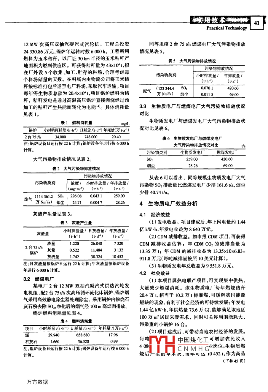 環(huán)境保護(hù)與循環(huán)經(jīng)濟(jì)生物質(zhì)發(fā)電的效益分析趙蔚李朝旭(遼寧省環(huán)境科學(xué)研究院,遼寧沈陽(yáng)110031)摘要:介紹了我國(guó)生物質(zhì)資源利用現(xiàn)狀及存在的主要問(wèn)題,以某電廠利用生物質(zhì)發(fā)電為例,從原燃料的用量、污染物排放情況及環(huán)境經(jīng)濟(jì)效益等方面進(jìn)行分析,說(shuō)明利用生物質(zhì)發(fā)電是節(jié)能減排的重要途徑。關(guān)鍵詞:生物質(zhì);發(fā)電;效益分析;節(jié)能減排Abstract: The status and difficulty in the use of biomass in China were described, taking a power plant of biomass electricity generation asan example, the fuel consumption, pollutant discharge,ic and environmental benefits were analyzed, furthermore it was explainedthat the use of biomass in electricity generation was an important approach for energy saving and pollutant reduction.Key words: biomass; electricity generation; cost-benefit analysis; energy saving and pollutant reduction中圖分類號(hào):TK229文獻(xiàn)標(biāo)識(shí)碼:A文章編號(hào):1674-1021(2009)11-0040021引言點(diǎn)。生物質(zhì)在生長(zhǎng)過(guò)程中通過(guò)光合作用吸收CO2,在其作為能源利用過(guò)程中,排放的CO2又有效地通過(guò)隨著我國(guó)經(jīng)濟(jì)的快速發(fā)展,在今后相當(dāng)長(zhǎng)一段光合作用而被生物質(zhì)吸收因而其產(chǎn)生和利用過(guò)程時(shí)期能源需求也將保持快速的增長(zhǎng)。預(yù)計(jì)到2020構(gòu)成了一個(gè)CO2的閉路循環(huán)。即年,能源需求總量將超過(guò)30億噸標(biāo)準(zhǔn)煤。而我國(guó)人CO2+HO+太陽(yáng)能葉雄(CHO)+HO均能源資源僅為世界平均水平的40%。另一方面,我(CHO)想CO2+熱量國(guó)的能源消費(fèi)結(jié)構(gòu)以煤為主,煤炭所占的比重接近(CH4O)是生物質(zhì)生長(zhǎng)過(guò)程中吸收的碳水化合70%,煤煙型污染將成為我國(guó)大氣污染的最主要因素。大規(guī)模發(fā)展煤電造成SO2排放增加,對(duì)環(huán)境造成物的總稱。當(dāng)上述兩個(gè)反應(yīng)的CO2達(dá)到平衡時(shí)較大的壓力。將對(duì)緩解日趨嚴(yán)重的溫室氣體效應(yīng)產(chǎn)生重要的作農(nóng)作物的秸稈屬于清潔的生物質(zhì)能源生物質(zhì)用。能具有資源種類多、分布范圍廣、環(huán)境影響較小、可22利用現(xiàn)狀及主要問(wèn)題再生利用等特點(diǎn)。利用生物質(zhì)發(fā)電,其所產(chǎn)生的廢我國(guó)的生物質(zhì)資源非常豐富據(jù)統(tǒng)計(jì),目前每年物主要是CO2和灰渣,排出的CO2能夠被植物重新僅農(nóng)作物產(chǎn)生的秸稈量就達(dá)7億t,預(yù)計(jì)到2010年吸收,放出氧氣,改善了環(huán)境;灰渣含有豐富的鉀會(huì)增至8億t?,F(xiàn)有秸稈大約有145億t用做畜牧飼鎂、磷鈣等營(yíng)養(yǎng)成分,可作為高效農(nóng)業(yè)肥料,直接用料091億t用做還田肥料014億t用做工業(yè)原料,于農(nóng)田。故開(kāi)發(fā)利用生物質(zhì)能等可再生能源,對(duì)緩解28億t作為農(nóng)民傳統(tǒng)的生活燃料剩余的秸稈幾乎我國(guó)能源供應(yīng)緊張狀況和保護(hù)環(huán)境具有重大意義。全部被焚燒極大地浪費(fèi)了生物質(zhì)資源;焚燒秸稈最本文以某電廠利用生物質(zhì)發(fā)電為例,從原燃料的用大的危險(xiǎn)是容易引起火災(zāi),并可造成嚴(yán)重的大氣環(huán)量、污染物排放情況及環(huán)境經(jīng)濟(jì)效益等方面進(jìn)行分境污染。為此,利用生物質(zhì)發(fā)電是解決秸稈浪費(fèi)和析,說(shuō)明利用生物質(zhì)發(fā)電是節(jié)能減排的重要途徑減少火災(zāi)的有效途徑;不僅可節(jié)能減排,而且?guī)?dòng)相2生物質(zhì)資源利用現(xiàn)狀及存在的主要問(wèn)題關(guān)產(chǎn)業(yè)發(fā)展還可解決農(nóng)民的就業(yè)問(wèn)題。3電廠概述21生物質(zhì)資源的特點(diǎn)生物質(zhì)能是唯一可再生的碳源2。生物質(zhì)能與3.1生物質(zhì)電廠煤炭等化石燃料相比,具有低硫、低氮、灰分小等特中國(guó)煤化工稈鍋爐,配置2臺(tái)收稿日期:2009-10-16;修訂日期:2009-10-30。CNMHG作者簡(jiǎn)介:趙蔚,女,1963年生,教授級(jí)高級(jí)工程師,主要從事環(huán)境工程及環(huán)境影響評(píng)價(jià)研究吹丹技術(shù)下12MW次高壓雙抽汽凝汽式汽輪機(jī)。工程總投資同等規(guī)模2臺(tái)75h燃煤電廠大氣污染物排放243086萬(wàn)元,鍋爐年運(yùn)轉(zhuǎn)時(shí)數(shù)6000h。工程所用情況見(jiàn)表5。燃料為玉米秸稈,以廠址30km半徑的玉米秸稈產(chǎn)表5大氣污染物排放情況地面積為燃料供應(yīng)區(qū)??色@得秸稈量為43x10t,擬在廠外設(shè)5個(gè)收集加工、貯存的料場(chǎng),合理考慮每污染物排放情況個(gè)料場(chǎng)儲(chǔ)量的天數(shù)。在料場(chǎng)內(nèi)由物流公司將玉米秸污染物類別小時(shí)排放量/年排放量(t·h1)稈按標(biāo)準(zhǔn)打包后運(yùn)至電廠料場(chǎng),采取汽車運(yùn)輸。項(xiàng)目廢氣(1233444SO20070142060每年需生物質(zhì)總量為204×10t,項(xiàng)目鍋爐燃料為秸00115稈,秸稈發(fā)電是通過(guò)高溫高壓鍋爐直接燃燒經(jīng)過(guò)預(yù)加工的秸稈產(chǎn)生熱能而轉(zhuǎn)化為電能。具體消耗量33生物質(zhì)電廠與燃煤電廠大氣污染物排放狀況見(jiàn)表1對(duì)比表1燃料消耗量生物質(zhì)發(fā)電廠與燃煤發(fā)電廠大氣污染物排放狀鍋爐小時(shí)精稈耗量/+h)