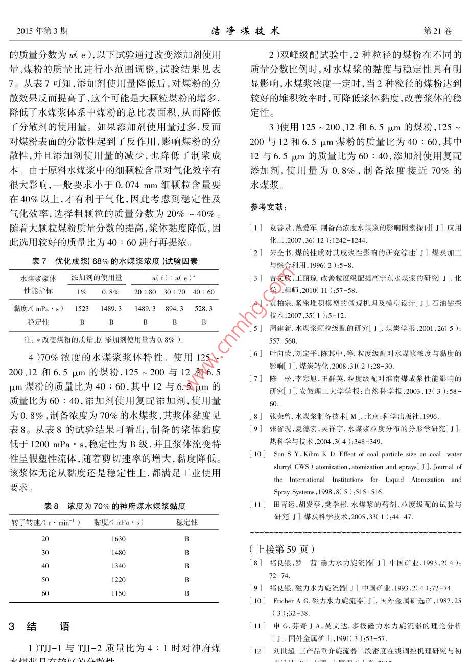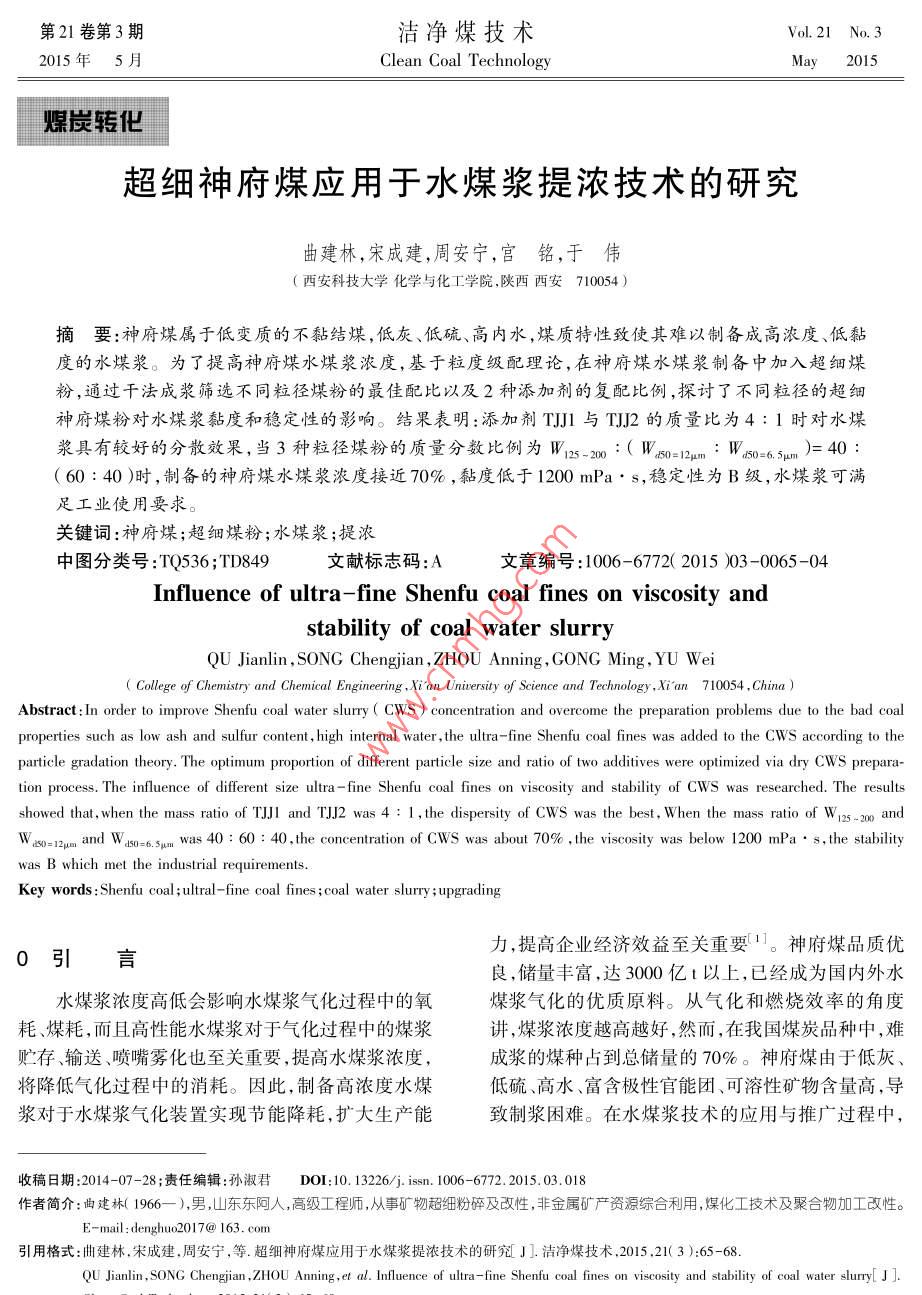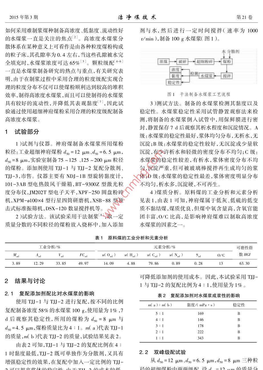 第21卷第3期潔凈煤技術Vol 21 No. 32015年5月Clean Coal Technology爆度轉(zhuǎn)世超細神府煤應用于水煤漿提濃技術的研究曲建林,宋成建,周安寧,宮銘,于偉(西安科技大學化學與化工學院,陜西西安710054)摘要:神府煤屬于低變質(zhì)的不黏結(jié)煤,低灰、低硫、髙內(nèi)水,煤質(zhì)特性致使其難以制備成高濃度、低黏度的水煤漿。為了提高神府煤水煤漿濃度,基于粒度級配理論,在神府煤水煤漿制備中加入超細煤粉,通過干法成漿篩選不冋粒徑煤粉的最佳配比以及2種添加劑的復配比例,探討了不同粒徑的超細神府煤粉對水煤漿黏度和穩(wěn)定性的影響。結(jié)果表明:添加劑TJ與們J!的質(zhì)量比為4:1時對水煤漿具有較好的分散效果,當3種粒徑煤粉的質(zhì)量分數(shù)比例為W1-2m0:(W0=1m:W6065m)=40(60:40)時,制備的神府煤水煤漿濃度接近70%,黏度低于1200mPa·s,穩(wěn)定性為B級,水煤漿可滿足工業(yè)使用要求。關鍵詞:神府煤;超細煤粉;水煤漿;提濃中圖分類號:TQ536;TD849文獻標志碼:A文章編號:1006-6772(2015)03-0065-04Influence of ultra-fine Shenfu coal fines on viscosity andstability of coal water slurryQU Jianlin, SONG Chengjian, ZHOU Anning, GONG Ming, YU Weollege of Chemistry and Chemical Engineering, Xi an University of Science and Technology, Xi'an 710054, ChinaAbstract: In order to improve Shenfu coal water slurry( Cws )concentration and overcome the preparation problems due to the bad coalproperties such as low ash and sulfur content, high internal water, the ultra-fine Shenfu coal fines was added to the Cws according to theparticle gradation theory. The optimum proportion of different particle size and ratio of two additives were optimized via dry Cws prepara-tion process. The influence of different size ultra-fine Shenfu coal fines on viscosity and stability of CWs was researched. The resultsat,when the mass ratio of T JI and TJ.J2 was 4: 1, the dispersity of Cws was the best, When theWaosl2um and Waso=6.sam was 40: 60: 40, the concentration of Cws was about 70%, the viscosity was belowmPa.s, the stabilitywas B which met the industrial requirementsKey words: Shenfu coal; ultral-fine coal fines; coal water slurry; upgrading力,提高企業(yè)經(jīng)濟效益至關重要11。神府煤品質(zhì)優(yōu)良,儲量豐富,達3000億t以上,已經(jīng)成為國內(nèi)外水水煤漿濃度高低會影響水煤漿氣化過程中的氧煤漿氣化的優(yōu)質(zhì)原料。從氣化和燃燒效率的角度耗、煤耗,而且高性能水煤漿對于氣化過程中的煤漿講,煤漿濃度越高越好,然而,在我國煤炭品種中,難貯存、輸送、噴嘴霧化也至關重要,提髙水煤漿濃度成漿的煤種占到總儲量的70%。神府煤由于低灰將降低氣化過程中的消耗。因此,制備高濃度水煤低硫、高水、富含極性官能團、可溶性礦物含量高,導漿對于水煤漿氣化裝置實現(xiàn)節(jié)能降耗,擴大生產(chǎn)能致制漿困難。在水煤漿技術的應用與推廣過程中,收稿日期:2014-07-28;責任編輯:孫淑君DOI:10.13226/j.iss.1006-6772.2015.03.018作者簡介:曲建林(1966-),男,山東東阿人,高級工程師,從事礦物超絀粉碎及改性,非金屬礦產(chǎn)資源綜合利用,煤化工技術及聚合物加工改性。E-mail:denghuo2017@163.com引用格式:曲建林宋成建周安寧,等超細神府煤應用于水煤漿提濃技術的硏究J].潔凈煤技術,2015.21(3):65-68QU Jianlin, SONG Chengjian, ZHOU Anning, et al. Influence of ultra-fine Shenfu coal fines on viscosity and stability of coal water slurry[ J]2015年第3期潔凈煤技術第21卷如何采用難制漿煤種制備高濃度、低黏度、流動性好劑與水,然后進行一定時間攪拌(速率為1000的水煤漿一直是關注的焦點2。高濃度水煤漿分r/min),制備100g水煤漿(圖1)。散體系在某種意義上可看作是由各種粒度煤粉構成的粒子床,其孔隙率為0.4左右,當這些孔隙被水完車分能劑全填充時,水煤漿濃度可達65%3。顆粒級配46“好→直是水煤漿制備研究的熱點與重點,有關研究表明,由于在制漿過程中采用合理的粒度級配實現(xiàn)合定性理的粒度分布不僅可以使煤粉順利達到較高的堆積效率,制得高濃度水煤漿,而且可以使制得的水煤漿圖1干法制備水煤漿工藝流程具有較好的流動性,并降低其表觀黏度,因此試3)測試方法。制備的水煤漿檢測其黏度以及驗通過使用超細神府煤粉采用合理的粒度級配制備穩(wěn)定性。水煤漿穩(wěn)定性采用試管靜置觀察法來檢高濃度水煤漿。測,將制備的水煤漿倒入試管中,用保鮮膜進行密1試驗部分封,靜置保存7d后觀察其析水程度和沉淀情況。A級:水煤漿的穩(wěn)定性最好,漿體均勻分布,無析水,無1)試劑與儀器。神府煤制備水煤漿所用煤粉沉淀;B級:水煤漿的穩(wěn)定性較好,無沉淀或少量軟粒徑:工業(yè)超細神府煤粉do=12μm、d0=6.5μm沉淀,有少許析水和輕微的密度分布不均勻;C級do=8μm,實驗室制備75~125、125~200μm粒徑水煤漿的穩(wěn)定性較差,有析水,漿體密度分布不均的煤粉。添加劑使用TJ-1與TJ-2復配分散劑勻,沉淀嚴重,但可被玻璃棒攪拌再生成均勻的漿們J-3,市售。儀器主要有NDJ-1B型旋轉(zhuǎn)黏度計體;D級:水煤漿的穩(wěn)定性最差,漿體密度明顯分布101-3AB型電熱鼓風干燥箱,BT-9300Z型激光粒不均勺,析水多,沉淀硬,不可再生。度分布儀,JM202T型電子天平,XPF-250圓盤粉碎4)煤質(zhì)分析。原料煤的工業(yè)分析和元素分析機,XPM-l00×4型行星四筒研磨機,XSB-88型頂見表1,由表1可知,神府煤屬于低灰、低硫的低變擊式標準振篩機,DsⅩ-120數(shù)顯攪拌機等。質(zhì)不黏結(jié)煤,煤質(zhì)優(yōu)