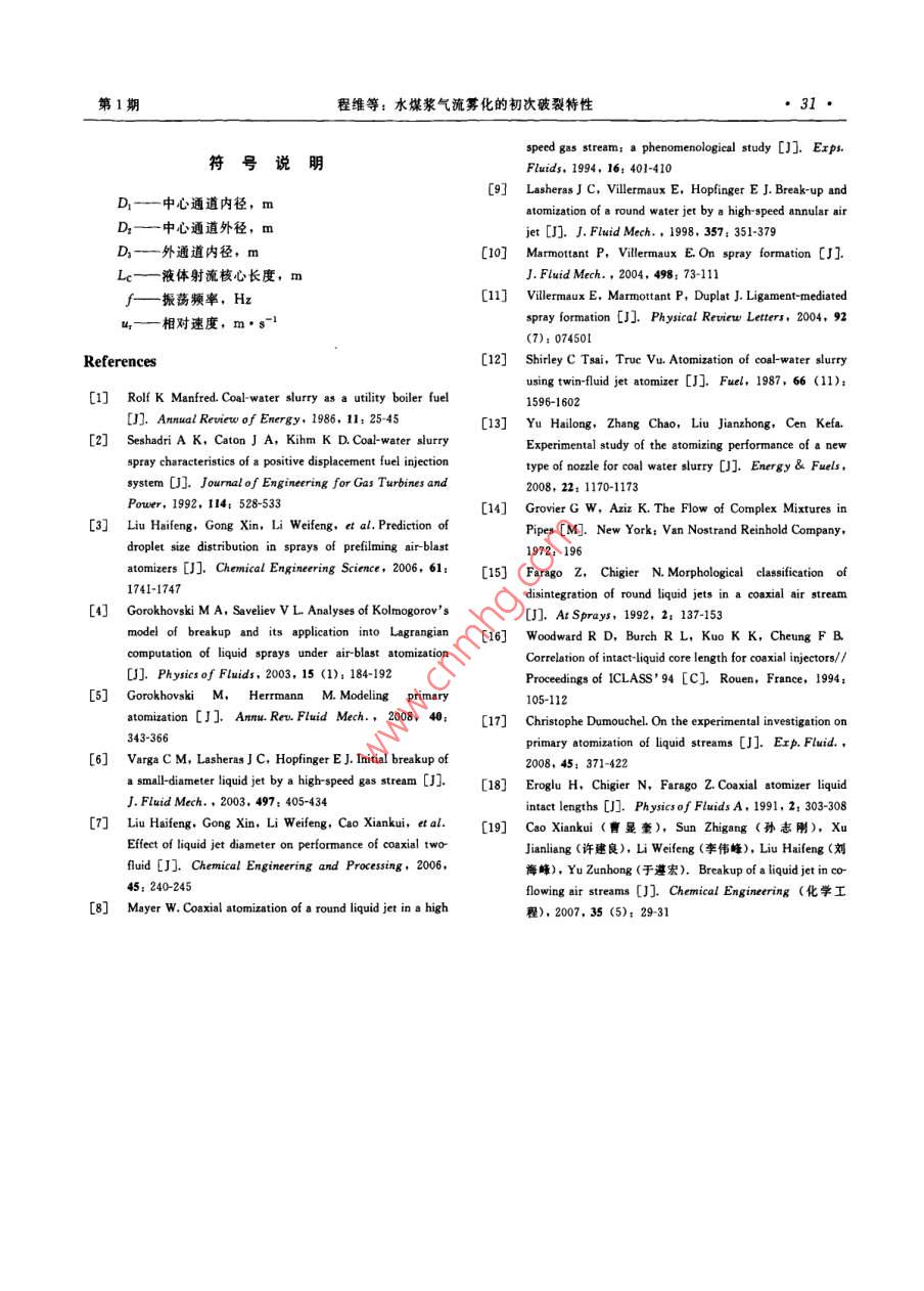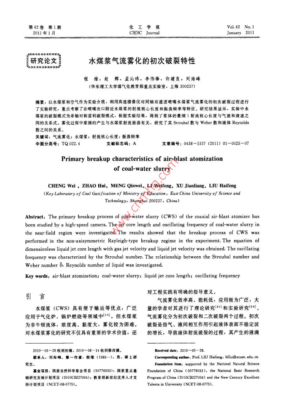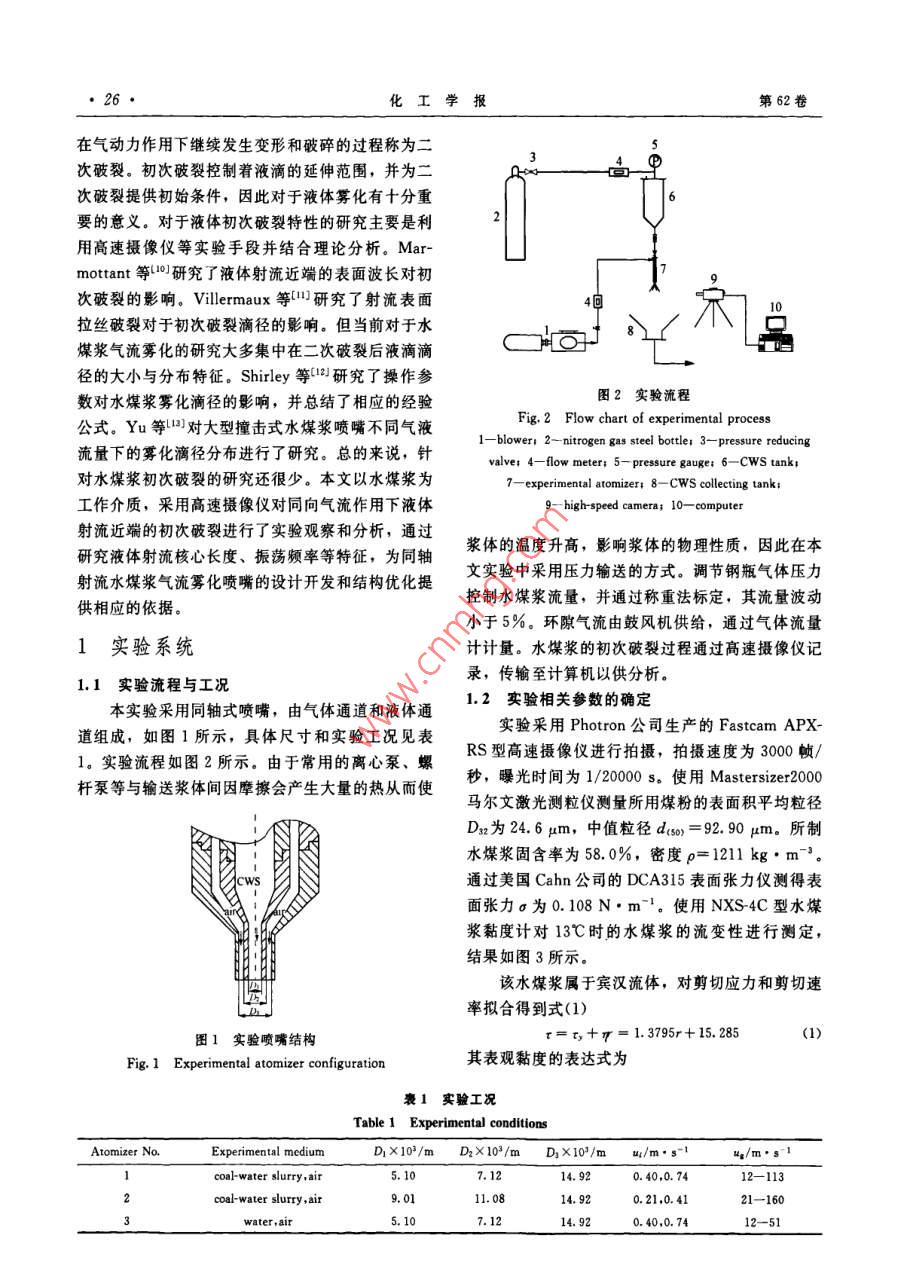 第62卷第1期化工學報Vol. 62 No. 12011年1月CIESC JournalJanuary 2011研究論文水煤漿氣流霧化的初次破裂特性程維,趙輝,孟沁瑋,李偉鋒,許建良,劉海峰(華東理工大學煤氣化教育部重點實驗室,上海200237)摘要:以水煤漿和空氣作為實驗介質,利用高速擾像儀對同軸雙通道噴嘴水煤漿氣流霧化的初次破裂過程進行了實驗研究,重點考察了在噴嘴出口附近水煤漿的射流核心長度和振蕩頻率等特征。研究結果顯示,實驗中水煤漿的破裂模式為非軸對稱雷利破裂模式,根據(jù)實驗結果,得到了漿體的量綱1射流核心長度與氣速和液速之間的關系式。霧化過程中漿滴的產(chǎn)生與水煤漿射流振蕩有關,研究了其 Strouhal數(shù)與 Weber數(shù)和液體 Reynolds數(shù)之間的關系關鍵詞:氣流霧化;水煤漿;射流核心長度;振蕩頻率中圖分類號:TQ022.4文獻標志碼:A文章編號:0438-1157(2011)01-0025-07Primary breakup characteristics of air-blast atomizationof coal-water slCHENG Wei, ZHAO Hui, MENG Qinwei, LI Weifeng, xU Jianliang, LIU Haifeng(Key Laboratory of Coal Gasification of Ministry of Education, East China University of Science andTechnology, Shanghai 200237, China)Abstract: The primary breakup process of coal-water slurry (CWS)of the coaxial air-blast atomizer hasbeen studied by a high-speed camera. The jet core length and oscillating frequency of coal-water slurry inthe near-fieldigated. The results showed that the breakup process of Cws wasperformed in the non-axisymmetric Rayleigh-type breakup regime in the experiment. The equation ofdimensionless liquid jet core length with gas jet velocity and liquid jet velocity was obtained. The oscillatingfrequency was characterized by the Strouhal number. The relationship between the Strouhal number andWeber number & Reynolds number of liquid was investigatedKey words: air-blast atomization; coal-water slurry; liquid jet core length; oscillating frequency對工程實踐有明確的指導意義氣流霧化效率高、能耗低,應用極為廣泛,大水煤漿(CWS)具有便于輸運等優(yōu)點,廣泛量的學者對其進行了理論研究3和實驗研究應用于氣化爐、鍋爐燃燒等領域中口2。但水煤漿氣流霧化分為初次破裂和二次破裂兩個過程。初次為非牛頓流體,濃度高、黏度大,霧化較為困難。破裂是指氣、液間相互作用引起液體表面不穩(wěn)定波對水煤漿霧化的研究不僅具有重要的學術價值,還的增長,導致液體射流破裂的過程,其產(chǎn)生的液滴2010—05-28收到初稿,2010-08-14收到修改稿Received date: 2010-05-28.聯(lián)系人:劉海峰。第一作者:程維(1985-),男,碩士研Corresponding author: Prof. LIU Haifeng, hfliuGecust. edu. cn究生Foundation item: supported by the National Natural Science基金項目:國家自然科學基金項目(50776033);國家重點基 Foundation of China(50776033), the National Basic Research礎研究發(fā)展計劃項目(2010CB227004);教育部新世紀優(yōu)秀人才支 Program of China(2010B227004) and the New Century Excellent持計劃項目(NCET08-0775)Talents in University(NCET-08-0775)化工學報第62卷在氣動力作用下繼續(xù)發(fā)生變形和破碎的過程稱為二次破裂。初次破裂控制著液滴的延伸范圍,并為二次破裂提供初始條件,因此對于液體霧化有十分重要的意義。對于液體初次破裂特性的研究主要是利用高速攝像儀等實驗手段并結合理論分析。Marmottant等10研究了液體射流近端的表面波長對初次破裂的影響。 Villermaux等{研究了射流表面拉絲破裂對于初次破裂滴徑的影響。但當前對于水煤漿氣流霧化的研究大多集中在二次破裂后液滴滴徑的大小與分布特征。 Shirley等山2研究了操作參數(shù)對水煤漿霧化滴徑的影響,并總結了相應的經(jīng)驗圖2實驗流程公式。Yu等山對大型撞擊式水煤漿噴嘴不同氣液Fig 2 Flow chart of experimental process流量下的霧化滴徑分布進行了研究??偟膩碚f,針I(yè)-blower: 2-nitrogen gas steel bottle 3-pressure reducingvalve 4-flow meter: 5-pressure gauge: 6-CwS tank,對水煤漿初次破裂的研究還很少。本文以水煤漿為experimental atomizer 8-CwS collecting tank工作介質,采用高速攝像儀對同向氣流作用下液體9-high-speed camera: 10-computes射流近端的初次破裂進行了實驗觀察和分析,通過研究液體射流核心長度、振蕩頻率等特征,為同軸漿體的溫度升高,影響漿體的物理性質,因此在本射流水煤漿氣流霧化噴嘴的設計開發(fā)和結構優(yōu)化提文實驗中采用壓力輸送的方式。調節(jié)鋼瓶氣體壓力供相應的依據(jù)。小于5%。環(huán)隙氣流由鼓風機供給,通過氣體流量1實驗系統(tǒng)計計量。水煤漿的初次破裂過程通過高速攝像儀記1.1實驗流程與工況錄,傳輸至計算機以供分析。本實驗采用同軸式噴嘴,由氣體通道和液體通1.2實驗相關參數(shù)的確定道組成,如圖1所示,具體尺寸和實驗工況見表實驗采用 Photron公司生產(chǎn)的 Fastcam APX1,實驗流程如圖2所示,由于常用的離心泵、螺S型高速攝像儀進行拍攝,拍攝速度為3000幀桿泵等與輸送漿體間因摩擦會產(chǎn)生大量的熱從而使秒,曝光時間為1/20000。使用 Mastersizer2000馬爾文激光測粒儀測量所用煤粉的表面積平均粒徑Dx為24.6m,中值粒徑dsy=92.90gm。所制水煤漿固含率為580%,密度p=1211kg·m3。通過美國Cahn公司的DCA315表面張力儀測得表面張力a為0.108N·m-1。使用NXS4C型水煤漿黏度計對13℃時的水煤漿的流變性進行測定,結果如圖3所示。該水煤漿屬于賓漢流體,對剪切應力和剪切速率擬合得到式(1)圖1實驗噴嘴結構r=t;+丌=1.3795r+15.285(1)Fig 1 Experimental atomizer configuration其表觀黏度