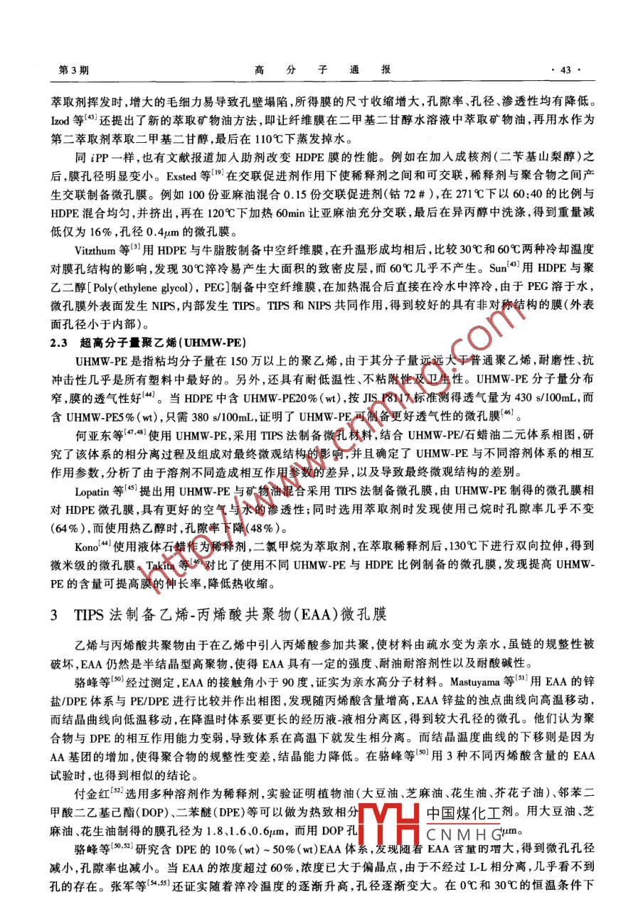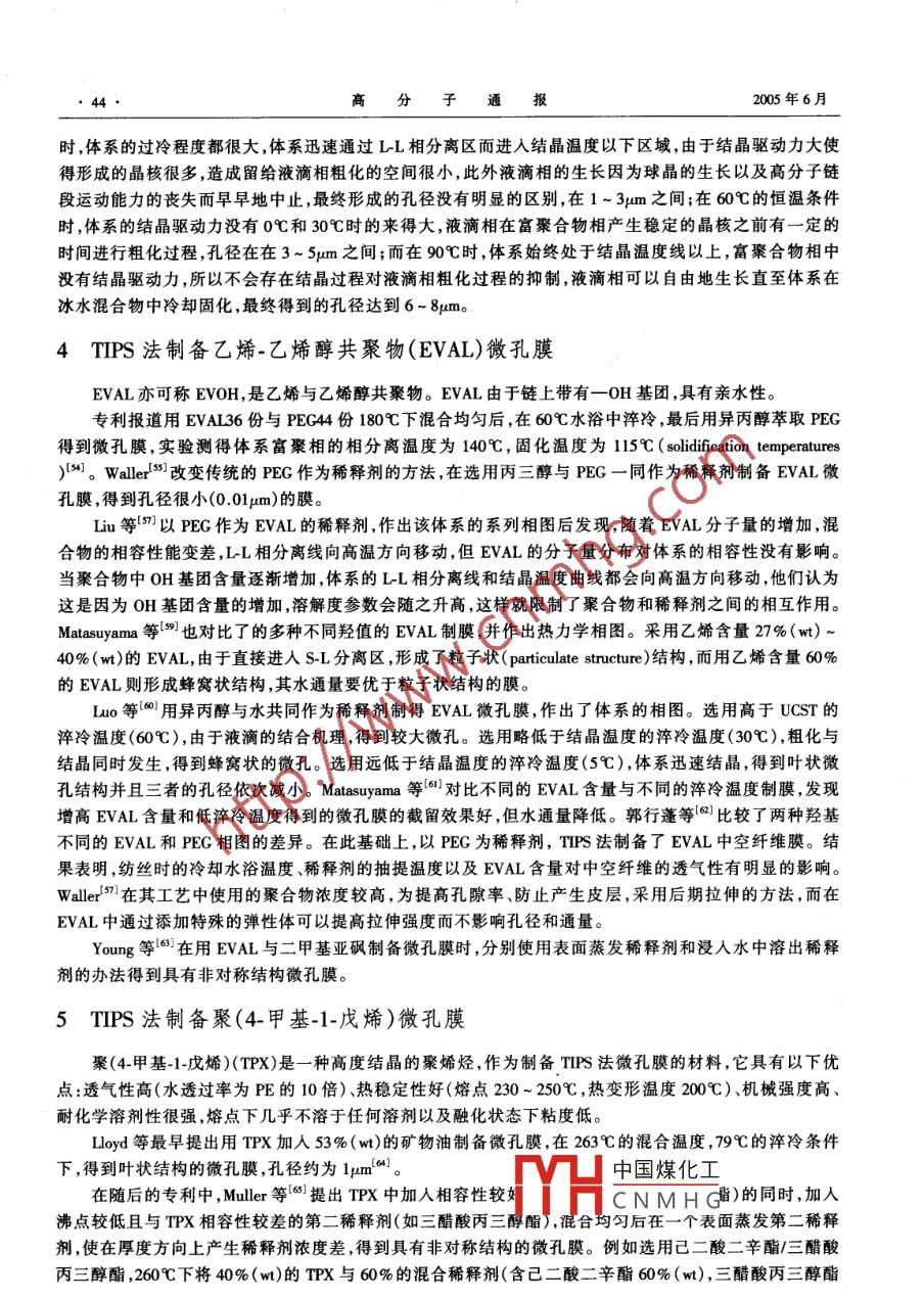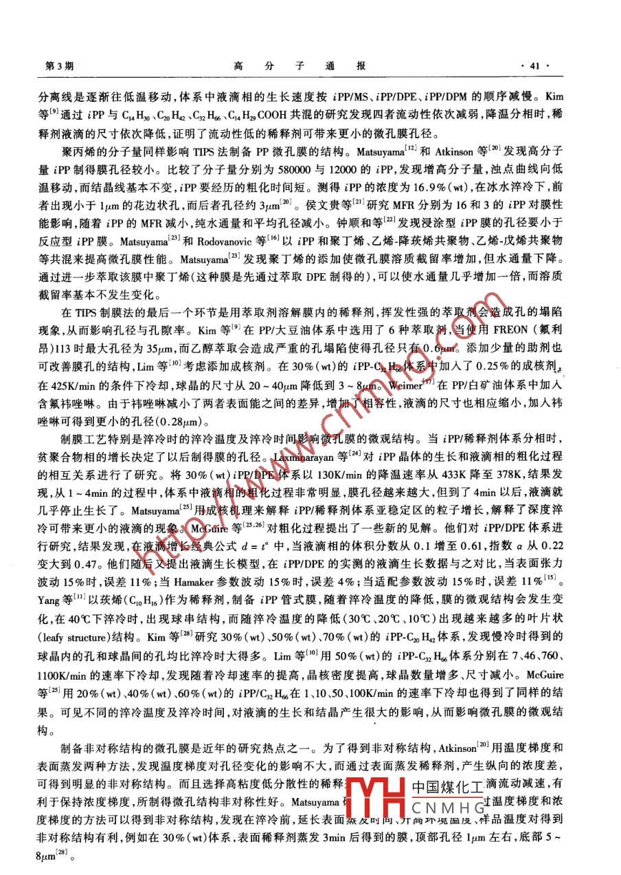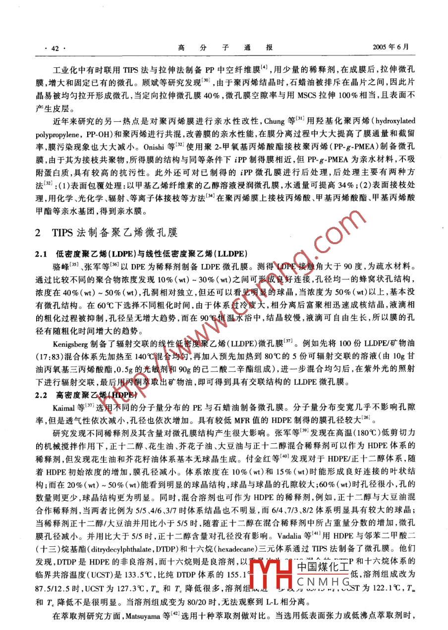 高分子通報2005年6月熱致相分離法制備聚烯烴微孔膜研究進展羅本喆,張軍1,王曉林2(1南京工業(yè)大學材料科學與工程學院,南京21000;2清華大學化學工程系,北京100084)摘要:非極性及弱極性的結(jié)晶高聚物常溫下無合適的良溶劑,所以無法使用傳統(tǒng)的非溶劑致相分離法制取微孔膜,而近年來發(fā)展的熱致相分離法解決了這一問題。研究發(fā)現(xiàn)聚乙烯、聚丙烯、乙烯-乙烯醇共聚物、乙烯丙烯酸共聚物、聚(4甲基1-戊烯)等聚烯烴是可采用熱致相分離法制備微孔膜的材料。本文綜述了近年來在熱致相分離法制備聚烯烴微孔膜方面的研究進展,重點介紹各種制膜材料(聚合物、稀釋劑、萃取劑和助劑)與各種制膜工藝對制得的聚烯烴微孔膜孔徑、膜通量和非對稱結(jié)構(gòu)等的影響。關鍵詞:聚烯烴;微孔膜;熱致相分離引言微孔膜的傳統(tǒng)制造方法有粉末燒結(jié)法、熔融拉伸法(MSCS)、徑跡蝕刻法、非溶劑致相分離(NIPS)法等。但是對于非極性結(jié)晶高聚物來說,室溫下沒有合適的溶劑,難以用NIPS法制成微孔膜。20世紀80年代初, Castro發(fā)表專利2),提出溫度改變驅(qū)動相分離的制備微孔膜方法,稱為熱致相分離( thermallyinduced phase separation,簡稱Trs)法。對于許多非極性或弱極性熱塑性結(jié)晶高聚物,在常溫下與某些高沸點的小分子液體(稀釋劑)互不相溶,但在升高溫度(一般高于結(jié)晶高聚物的熔點T)下可形成均相溶液,降低溫度后由于溶解能力下降和聚合物結(jié)晶因素誘發(fā)產(chǎn)生液液(LL)或固液(SL)相分離,聚合物相與稀釋劑相形成相間的結(jié)構(gòu),而后用萃取劑脫除稀釋劑,混合物中原稀釋劑所占空間變?yōu)榭斩?最終形成連貫的微孔結(jié)構(gòu)。TIPS過程拓寬了膜材料的應用范圍,開辟了相分離法制備微孔膜的新途徑。TPS法制備微孔膜的過程,成膜條件與孔結(jié)構(gòu)形態(tài)的關系正引起人們的濃厚興趣并已有較系統(tǒng)的研究。美國Akzona公司已用該法生產(chǎn)聚丙烯板式膜和中空纖維膜(商品名 Accurel)23)。3 M, Millpore、 Akzo-Nobel等公司已經(jīng)成功應用TPS法工業(yè)化生產(chǎn)平板過濾膜與中空纖維膜46。聚丙烯、聚乙烯等聚烯烴是典型的非極性結(jié)晶高聚物,多種低分子量,高沸點的有機溶劑可與融化狀態(tài)下的聚烯烴形成均相溶液,所以可采用TS法制備微孔膜。本文重點介紹了用TFS法制備各種聚烯烴微孔膜的研究進展。1TIPs法制備聚丙烯微孔膜采用TIPS法制備全同聚丙烯(iPP)微孔膜的研究很多,主要集中在研究稀釋劑、iPP的型號(如分子量、熔體流動速率(MFR)、萃取劑、成膜機理、制膜工藝以及膜的親水性改性等方面。TIPS法制取聚丙烯微孔膜中的一個重要影響因素是稀釋劑的選擇。研究發(fā)現(xiàn),可作為iPP的稀釋劑種類很多,其中包括有機溶劑(如烷烴、酸、醛、酰胺、脂肪胺、酯、醚等)3和天然植物油(如大豆油、蓖麻油、亞麻油等)789。 Matsuyama等選用了水楊酸甲酯(Ms)、二苯醚(DPE)、二苯基甲烷(DPM)三種稀釋劑,探討了三種體系相分離平衡相圖,發(fā)現(xiàn)MS、DPE、DPM對iP的溶解能力依次增強,各體系的L-L相中國煤化工基金項目:國家“863”(No:2002AA328020),江蘇省教育廳(o2KJD43000作者簡介:羅本喆(1977-),男,江蘇南京人,在讀碩士研究生,主要CNMHGil: vincentluobenzheeyou. como通訊聯(lián)系人第3期高分子通報41分離線是逐漸往低溫移動,體系中液滴相的生長速度按iPP/MS、iP!DPE、iP!DPM的順序減慢。Kim等通過iPP與CAH、CH2、C2H、CH2COOH共混的研究發(fā)現(xiàn)四者流動性依次減弱降溫分相時,稀釋劑液滴的尺寸依次降低,證明了流動性低的稀釋劑可帶來更小的微孔膜孔徑。聚丙烯的分子量同樣影響TPS法制備P微孔膜的結(jié)構(gòu)。 Matsuyama2和 Atkinson等測發(fā)現(xiàn)高分子量iPP制得膜孔徑較小。比較了分子量分別為58000012000的iPP,發(fā)現(xiàn)增高分子量,濁點曲線向低溫移動,而結(jié)晶線基本不變,iPP要經(jīng)歷的粗化時間短。測得iP的濃度為16.9%(wt),在冰水淬冷下,前者出現(xiàn)小于1m的花邊狀孔,而后者孔徑約3pm。侯文貴等研究MFR分別為16和3的iP對膜性能影響,隨著iPP的MFR減小,純水通量和平均孔徑減小。鐘順和等2發(fā)現(xiàn)浸涂型iPP膜的孔徑要小于反應型iP膜。 Matsuyama和 Radovanovic等以iPP和聚丁烯、乙烯-降莰烯共聚物、乙烯戊烯共聚物等共混來提高微孔膜性能。 Matsuyama-發(fā)現(xiàn)聚丁烯的添加使微孔膜溶質(zhì)截留率增加,但水通量下降。通過進一步萃取該膜中聚丁烯(這種膜是先通過萃取DPE制得的),可以使水通量幾乎增加一倍,而溶質(zhì)截留率基本不發(fā)生變化。在TPS制膜法的最后一個環(huán)節(jié)是用萃取劑溶解膜內(nèi)的稀釋劑,揮發(fā)性強的萃取劑會造成孔的塌陷現(xiàn)象,從而影響孔徑與孔隙率。Kim等在PP/大豆油體系中選用了6種萃取劑,當使用 FREON(氟利昂)13時最大孔徑為35m,而乙醇萃取會造成嚴重的孔塌陷使得孔徑只有0.6μm。添加少量的助劑也可改善膜孔的結(jié)構(gòu),Lim等考慮添加成核劑。在30%(wt)的 iPP-CaH體系中加入了0.25%的成核劑,在42K/mn的條件下冷卻球晶的尺寸從20~40m降低到3~8m。 Weimer在PP/白礦油體系中加入含氟祎唑啉。由于袆唑啉減小了兩者表面能之間的差異,增加了相容性,液滴的尺寸也相應縮小,加人袆唑啉可得到更小的孔徑(0.28m)。制膜工藝特別是淬冷時的淬冷溫度及