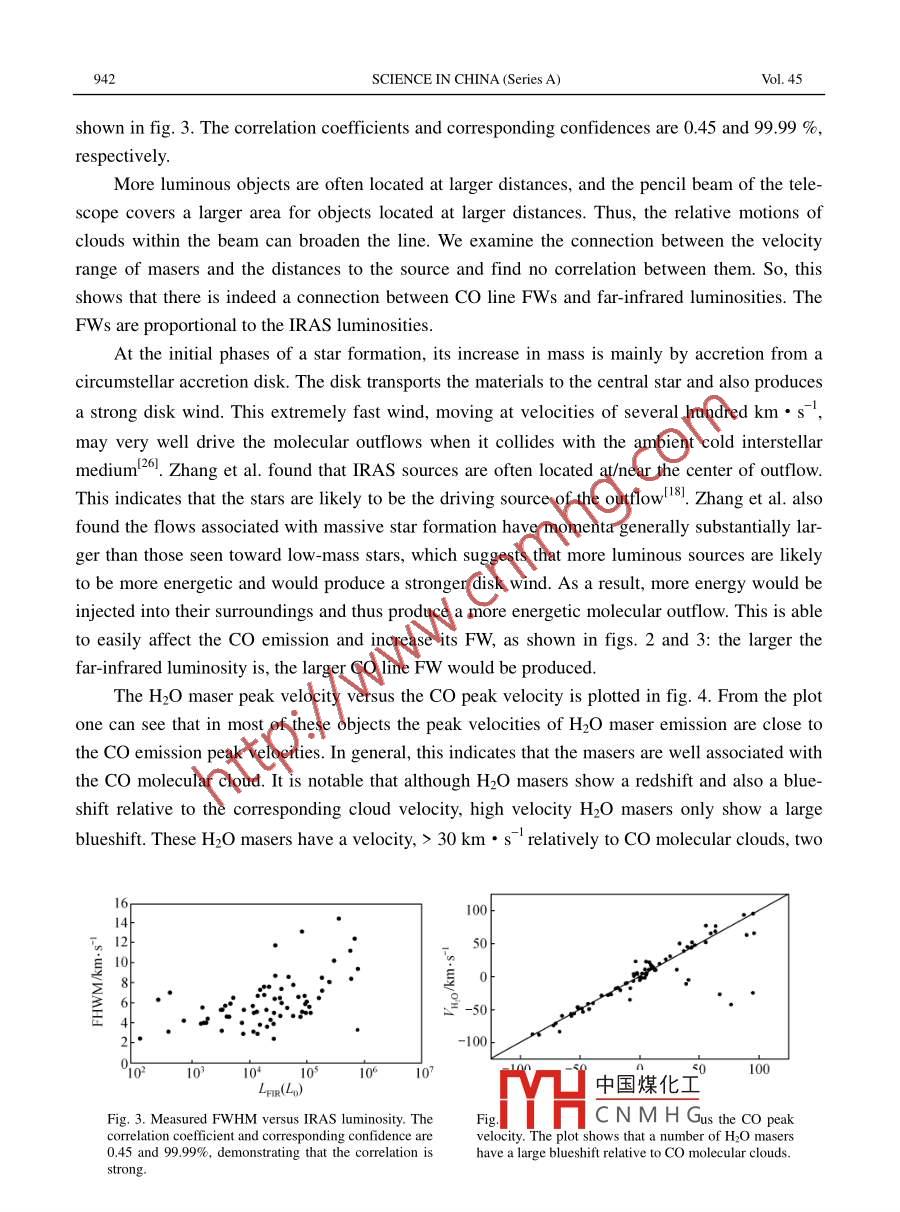 Vol. 45 No. 7SCIENCE IN CHINA(Series A)July 200ASTRONOMYHigh-velocity gas associated ultracompact Hl regionsⅫUYe(徐燁)2, JIANG Dongrong(蔣棟榮)2, YANG Chuanyi(楊傳義)°,ZHENG Xingwu(鄭興武)4, GU Minfeng(顧敏峰)2& PEI Chunchuan(裴春傳)1. Shanghai Astronomical Observatory, Chinese Academy of Sciences, Shanghai 200030, China;2. National Astronomical Observatories, Chinese Academy of Sciences, Beijing 100012, China3. Astronomy Department, Columbia University, New York, NY, 10027, US:4. Department of Astronomy, Nanjing University, Nanjing 210093, China;5. Purple Mountain Observatory, Nanjing 210008, ChinaCorrespondenceshouldbeaddressedtoXuYe(email:xy@center.shaoac.cn)Received August 6, 2001abstract We present the results of a survey for high-velocity 2co(1-0)emission associated H2Omasers and ultracompact(UC)Hll regions. The aim is to investigate the relationship between H2Omasers, Co high-velocity gas(HVG) and their associated infrared sources. Our sample satisfiesWood Churchwell criterion. Almost 70 % of the sources have full widths(FWs)greater than 15km.s at Ta=100 mk and 15% have FWs greater than 30 km.s. In most of our objects thereis excess high velocity emission in the beam. There is a clear correlation between CO line FWsand far-infrared luminosities: thecreases with the FIR luminosity. The relation suggests thatmore luminous sources are likely to be more energetic and able to inject more energy into theirsurroundings. As a result, larger FW of the Co line could be produced. In most of our sources, thevelocities of peak of the H2O emission are in agreement with those of the co cloud, but a numberof them have a large blueshift with respect to the Co peak. These masers might stem from theamplifications of a background source, which may amplify some unobservable weak masers to anobservable levelKeywords: HIl regions, ISM: jets and outflows, stars: formation, masersIt is now generally believed that during the earliest stages of evolution, most, if not all,starundergo a phase of very energetic mass ejection, frequently characterized by the occurrence ofmassive bipolar outflows of cold molecular gas. These outflows appear to be driven by strongstellar disk winds, whose other notable manifestations include rapidly moving Herbig-Haro(HH)objects, high-velocity water maser sources, shock-excited molecular hydrogen emission regionsand optically visible jets appearing to emanate directly from the immediate circumstellar environsof the young driving stars themselvesSome relationships between H2O masers, iraS obiects and outflow properties have beenfound!4,6,8,13-16 For instance. H,o luminosities correl中國(guó)煤化工 d thpeak velocity of the H2O are close to central velocityCNMHGSt of thples were associated with low and intermediate mass formation regions. This is partly becauselow-mass young stellar objects (YSOs) are far more abundant than high-mass ones and massive938SCIENCE IN CHINA (Series A)Vol 45star formation occurs in distant(> 500 pc), dense stellar clusters. So identification of the drivingsource is rather difficultShepherd Churchwell(hereafter SC) surveyed high velocity gas in 122 massive star for-mation regions and found that 90 of their samples were associated with high-velocity gas(fullwidth greater than 15 km.S), which are generally significantly higher than those toward lowmass outflow sources. At the same time, they also found that the full widths are also far less thanose seen inlow star formation regions" 7. Later, by mapping the co line toward a sample of 69luminous iras point sources, Zhang et al. found 90 %o of the sample to possess molecular outflows. This value is also far higher than those seen in low star formation regions 8Based on the far-infrared spectra of the known ultra-compact HIl regions, WoodChurchwell (hereafter wC criterion) evolved a two-color criterion that characterizes themg(F2m/F12m)>0.57 and lg(F6m/F12m)>1319In this paper, we produce a sample to further study the relationships betweeCO HVG and associated IRas objects. We choose a sample of H2O masers for high-velocitymolecular emission 20-22. The whole sample consists of 77 objects and all sources coincide withIRAS point sources. Our selection criteria are the following: (i) Colors satisfy WC criterion;(ii)8>-10ObservationThe observations of the J=1-0 transition of Co were made with the 13. 7 m telescope atthe Qinghai Station of Purple Mountain Observatory, United Radio Astronomy Laboratory of theChinese academy of Sciences, in March and December, 2000. This antenna is located in the gobidesert, a very dry and arid region 3200 m above sea level in western China. The beam size at thefrequency 115 GHz is 54. The pointing and tracing accuracy are better than 10". A cooled superonducting mixer and a FET IF-I were employed. Its double-side band system temperature islower than 250 K. The acoustic-optical spectrometer provides 1024 channels for a total bandwidth of 170 MHz. The frequency resolution is 255 kHz. The antenna efficiency is 45%050%depending on the elevation. The observations were made in position-Switching mode. The integration time is 4 minutes. The rms is about 0.20 K and the absolute calibration for flux density wasabout 202 Results and data reductionData reduction was performed using the Draspec package. In order to increase the signal-to-noise ratio, several spectra of the same source were added to lead the integration time to bemore than 8 minutes for every source. All data were spa中國(guó)煤化工way to a reso-lution of 108". After smoothing, the rms noise was reduCNMHGH,O maser sources and the observationaltabulated in table 1. The first three columns of table I present the corresponding IRAS sourceHIGH-VELOCITY GAS ASSOCIATED ULTRACOMPACT HII REGIONS939Table I Parameters of CO spectra and H2ODEC(1950)FWHMFWm/km·s00211+6542109.66549267.1112.12.7×1000260+5624002600.0563.6389-40.69.014×103-28.716.102232+6138022317.761385822148448.818.19.8×103259+310503255793105