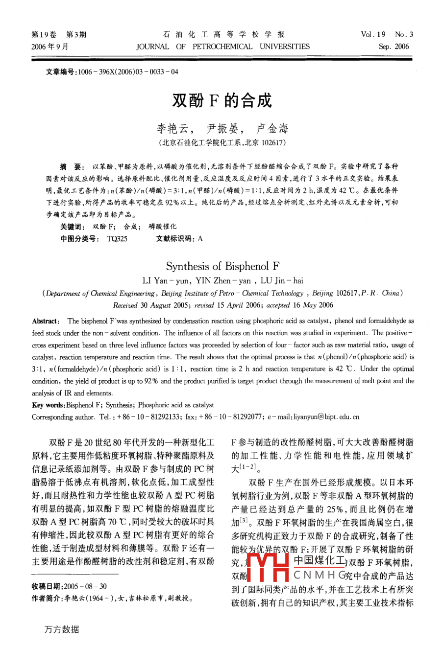 第19卷第3期石油化工高等學(xué)校學(xué)報(bào)Vol. 19 No. 32006年9月JOURNAL OF PETROCHEMICAL UNIVERSITIESSep. 2006文章編號(hào):1006 - 396X(2006)03 - 0033- 04雙酚F的合成李艷云,尹振晏,盧金海(北京石油化工學(xué)院化工系,北京102617)摘要:以苯酚、甲醛為原料,以磷酸為催化劑,無(wú)溶劑條件下經(jīng)酚醛縮合合成了雙酚F。實(shí)驗(yàn)中研究了各種因素對(duì)該反應(yīng)的影響。選擇原料配比、催化劑用量、反應(yīng)溫度及反應(yīng)時(shí)間4因素,進(jìn)行了3水平的正交實(shí)驗(yàn)。結(jié)果表明,最優(yōu)工藝條件為:n(苯酚)/n(磷酸)=3:1,n(甲醛)/n(磷酸)=1:1,反應(yīng)時(shí)間為2h,溫度為42C。在最優(yōu)條件下進(jìn)行實(shí)驗(yàn),所得產(chǎn)品的收率可穩(wěn)定在92%以上。純化后的產(chǎn)品,經(jīng)過(guò)熔點(diǎn)分析測(cè)定紅外光譜以及元素分析,可初步確定該產(chǎn)品即為目標(biāo)產(chǎn)品。關(guān)鍵詞:雙酚F; 合成; 磷酸催化中圖分類(lèi)號(hào): TQ325文獻(xiàn)標(biāo)識(shí)碼: A .Synthesis of Bisphenol FLI Yan- yun, YIN Zhen- yan,LU Jin- hai .(Department of Chemical Enginering,Beijing Instiute of Ptro - Chemical Technology,Bejing 102617,P. R. Chia)Receired 30 August 2005; revised 15 April 2006; accepted 16 May 2006Abstract: The bisphenol Fwas synthesized by condensation reaction using phosphoric acid as catalyst, phenol and formaldehyde asfeed stock under the non - solvent condition. The influence of all factors on this reaction was studied in experiment. The positive -cross experiment based on three level influence factors was proceeded by selection of four - factor such as raw material ratio, usage ofcatalyst, reaction tenperature and reaction time. The result shows that the optimal proces is that n(phenol)/n( phosphoric acid) is3:1, n( formaldehyde)/n (phosphoric acid) is 1:1, reaction time is2 h and reaction temperature is 42 C. Under the optimalcondition, the yield of product is up to 92% and the product purified is target product through the measurement of melt point and theanalysis of IR and elements.Key words: Bisphenol F; Synthesis; Phosphorie acid as catalystCorresponding author. Tel. : + 86- 10 - 81292133; fax: + 86 - 10 - 81292077; e- mail: liyanyun@bipt. edu. cn雙酚F是20世紀(jì)80年代開(kāi)發(fā)的一種新型化工F參與制造的改性酚醛樹(shù)脂,可大大改善酚醛樹(shù)脂原料,它主要用作低粘度環(huán)氧樹(shù)脂、特種聚酯原料及的加 工性能、力學(xué)性能和電性能,應(yīng)用領(lǐng)域擴(kuò)信息記錄紙?zhí)砑觿┑?。由雙酚F參與制成的PC樹(shù)大[1-2]。脂易溶于低沸點(diǎn)有機(jī)溶劑,軟化點(diǎn)低,加工成型性雙酚F生產(chǎn)在國(guó)外已經(jīng)形成規(guī)模。以日本環(huán)好,而且耐熱性和力學(xué)性能也較雙酚A型PC樹(shù)脂氧樹(shù)脂行業(yè)為例,雙酚F等非雙酚A型環(huán)氧樹(shù)脂的有明顯的提高,如雙酚F型PC樹(shù)脂的熔融溫度比產(chǎn)量已經(jīng)達(dá)到總產(chǎn)量的25%,而且比例仍在增雙酚A型PC樹(shù)脂高70C,同時(shí)受較大的破壞時(shí)具加[3]。雙酚F環(huán)氧樹(shù)脂的生產(chǎn)在我國(guó)尚屬空白,很有伸縮性,因此較雙酚A型PC樹(shù)脂有更好的綜合多研究機(jī)構(gòu)正致力于雙酚F的合成研究,制備了性性能,適于制造成型材料和薄膜等。雙酚F還有一能較 為優(yōu)異的雙酚F;開(kāi)展了雙酚F環(huán)氧樹(shù)脂的研主要用途是作酚醛樹(shù)脂的改性劑和穩(wěn)定劑,有雙酚究,中國(guó)煤化工雙酚F環(huán)氧樹(shù)脂,雙酚YHCNMHG究中合成的產(chǎn)品達(dá)收稿日期:2005 -08 - 30到了國(guó)際同類(lèi)產(chǎn)品的水平,并在工藝技術(shù)上有所突作者簡(jiǎn)介:李艷云(1964- ),女,吉林松原市,副教授。破創(chuàng)新,擁有自己的知識(shí)產(chǎn)權(quán),其主要工業(yè)技術(shù)指標(biāo)34石油化工高等學(xué)校學(xué)報(bào)第19卷已接近國(guó)外水平。但催化劑問(wèn)題仍顯突出。1.3 實(shí)驗(yàn)過(guò)程催化劑是雙酚F合成工藝中的重要工藝條件將42.5 g苯酚加人到帶有電動(dòng)攪拌、溫度計(jì)和之一,最初人們想借鑒雙酚A合成的工藝條件,選回流冷凝管的 250 mL三口瓶中,水浴加熱,待苯酚用強(qiáng)無(wú)機(jī)酸作催化劑,但存在著強(qiáng)腐蝕性,氯化氫氣充分熔融后 ,滴人質(zhì)量分?jǐn)?shù)為85%磷酸溶液并強(qiáng)力體的揮發(fā),氯乙醚、氯甲基酚、磺化產(chǎn)物等副反應(yīng)產(chǎn)攪拌 ,使苯酚與磷酸充分混合,然后以較慢的速度滴物的產(chǎn)生,以及水溶液與有機(jī)相分離難等問(wèn)題,所以人甲醛溶液(質(zhì)量分?jǐn)?shù)37%)12.2 g,溫度控制在42人們最終要尋求腐蝕性低催化活性高、易于回收等心,反應(yīng)2 h,然后升溫至65 C ,緩慢攪拌30 min,停特點(diǎn)的催化劑[4]。止攪拌,分離出酸,油相用碳酸氫鈉中和至pH約為本實(shí)驗(yàn)探索以磷酸為催化劑,工藝流程簡(jiǎn)單,產(chǎn)5.6,再將水與有機(jī)相分離,并減壓蒸餾,除去苯酚與量較高,有利于產(chǎn)物的分離和催化劑的回收利水,冷卻、結(jié)晶。用[5]。雙酚F通常由二羥基二苯基甲烷的3種異將粗產(chǎn)品溶解到NaOH溶液中,靜置0.5h后構(gòu)體組成,即4,4'-二羥基二苯基甲烷、2,4'-二羥減壓抽濾,除去不溶物,向?yàn)V液中滴加鹽酸,調(diào)pH基二苯基甲烷和2,2'-二羥基二苯基甲烷。其中為4~5,產(chǎn)品酚析出,抽濾,得晶體。再用甲苯重結(jié)性能最佳的為4,4'-二羥基二苯基甲烷。至今單晶,冷至室溫后,放