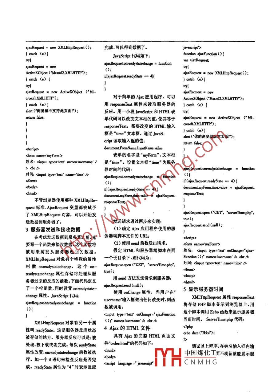 2008年12胃電腦學(xué)習(xí)第6期Ajax編程技術(shù)谷洪彬*摘要: 通過(guò)一個(gè)簡(jiǎn)單的與服務(wù)器時(shí)間同步的例子說(shuō)明J如何用Ajax開(kāi)發(fā)WEB應(yīng)用程序。關(guān)鍵詞: Ajax WEB 應(yīng)用程序用戶友好界面交互性中圖分類號(hào): TP311.1 文獻(xiàn)標(biāo)識(shí)碼: B文章編號(hào) : 1002 -2422( 2008 )06 0048-02Ajax Programming TechniqueGu HongbinAbstract: The peper demonstrates wsing Ajax to develop WEB aplications by an example of time eynchronizaionwith server.Keyword: AjaxWEB ApplicationsClent Interface Internction.1創(chuàng)建標(biāo)準(zhǔn)的HTML表單<body>個(gè)新的XMLHtpRequest對(duì)象。每當(dāng)失做一個(gè)標(biāo)準(zhǔn)的HTML表單不需要在文本編輯器中拷貝或輸入以上敗的時(shí)候?qū)?huì)得到一個(gè)錯(cuò)誤,接著將“提交"按鈕.這個(gè)表單在后面將加入捕捉(ceatch) 到這個(gè)錯(cuò)誤然后嘗試Ajax功能,但現(xiàn)在只做一個(gè)有幾個(gè)輸代碼,然后保存此文件為order.html.(try)下- 一個(gè)不同的命令:如果嘗試入框的基本的HTML表單。為了讓2創(chuàng)建XMLHtp Request 對(duì)象(tuy)成功,那么捕捉(catch)代碼將Ajax容易理解,只創(chuàng)建- 一個(gè)有兩個(gè)文不僅要?jiǎng)?chuàng)建關(guān)鍵的XMLHtpRe-不會(huì)運(yùn)行。本框name和time的HTML表單。quest對(duì)象,而且要解決不同瀏覽器:下面是包含以上嘗試和捕捉的創(chuàng)name文本框?qū)⒂捎脩糨斎?time文本Intemet Exlorer.Opera.Pirefox 和Sa-建XMLHtpRequest對(duì)象的完整代碼框?qū)⒂肁jax來(lái)填充。頁(yè)面文件order.fari在創(chuàng)建XMLHupRequest對(duì)象時(shí)的(HTML和JavaScript) :huml的HTML代碼:不同方式。為了創(chuàng)建這個(gè)Ajax對(duì)象,需要使用“ry and calch" 的特殊編程技術(shù)。姓名: 嘗試(try)三種不同的方式來(lái)創(chuàng)建一ry{(4)用鼠標(biāo)選中播放界面,然后單擊鼠標(biāo)右鍵,從彈出+ 字線狀,按住左鍵在工作區(qū)中拖拉出-一個(gè)合適大小的矩的快捷菜單中選擇“屬性”命令,打開(kāi)媒體播放界面的“屬形框;性”窗口;(3)右擊上述矩形框,在隨后彈出的快捷菜單中,選(5)在“屬性"窗口中,在”URL"后面的文本框中正“屬性”選項(xiàng),打開(kāi)“屬性”對(duì)話框,在“Movie"選項(xiàng)后面的確輸入需要插入到幻燈片中的視頻文件的詳細(xì)路徑及文件文本框中輸入需要插入的Flash動(dòng)畫文件名(* .SWF格式.名這樣在打開(kāi)幻燈片時(shí),就能通過(guò)"播放"控制按鈕來(lái)播的文件)及完整路徑,然后關(guān)閉“屬性"窗口.放指定的視頻了;這樣在放映幻燈片的時(shí)候,動(dòng)畫就會(huì)自動(dòng)播放了.(6)在播放的過(guò)程中,可以通過(guò)媒體播放器中的“播為便于移動(dòng)演示文稿,最好將聲音文件、視頻文件、放”、“停止”、“暫停”和“調(diào)節(jié)音量”等按鈕對(duì)視頻進(jìn)行Flash 動(dòng)畫文件與演示文稿保存在同一文件夾中。控制。參考文獻(xiàn)3添加Flash動(dòng)畫[1]趙瑋. PowerPoint&Authorware課件制作經(jīng)典實(shí)例教程.操作步驟如下:西安:電子科技大學(xué)出版社,2003.(1)執(zhí)行“視圖V工具欄/控件工具箱”命令,顯示"[2]李輝場(chǎng)凼君宏側(cè)學(xué)B03中文版.北京:控件工具箱"工具欄;中國(guó)煤化工(2)單擊工具欄上的“其它挖件”按鈕,在彈出的下拉[3]韓YHC N M H G民郵電出版社,20-列表中,選“Shockwave Flash 0bject" ,這時(shí)鼠標(biāo)變成了細(xì)05.收稿日期: 208-0-14.谷洪彬遼寧盤錦職業(yè)技術(shù)學(xué)院信息系講師(盤錦124000 .ajaxReoquest = new XMLHtpRequet();完成,可以得到數(shù)據(jù)了。jevescripr>} ealch (e){JavaSeript代碼如下:function ujaxFuncion(){tyvar ajaxRequest;gjaxRequet.oreadyotatecbenge = function(){ActiveXObjeca ("Msxml2.XMLHTTP*);sjexRequet = new XMLHtpRequest();ilejaxRaquesreadyState = 4){} calch (e) {. } catch (e){ajarReoquest = ner ActiveXObjet (" Mi-sjarRequest = newcrof,XMLHTP");對(duì)于簡(jiǎn)單的Ajax應(yīng)用程序,可以ActiveXObject ("Msxml2.XMLHTTP");] catch (e){用reeponseText屬性來(lái)讀取服務(wù)器的) cach (e) (alent (“惻覽器不支持此頁(yè)面!"); .反應(yīng)。用一小段JavaScript和HTM表t單代碼可以改變文本框的值,使其等于sjauRequet = new ActiveXObjet (Mi-responseText需要改變的HTML輸入croftXMLHTP");} catch (e){框是"time"文本框。通過(guò)JavsS-alert ("你的瀏覽器版本太低");cript讀取輸入框的值:retum falbe;document.FormnName.InputName.value 要寫一個(gè)函數(shù)來(lái)接收數(shù)據(jù)。這個(gè)函數(shù)將(2)使用send函數(shù)送出請(qǐng)求。被用來(lái)捕捉從服務(wù)器返回的數(shù)據(jù).假定HTML和服務(wù)器端腳本在同姓名: 叫做onreadystatechange. 這個(gè)on-ajaxRequstopen ("GET", 'serveTime.php",時(shí)間: readystatechange屬性存儲(chǔ)將處理從服務(wù)器過(guò)來(lái)的反應(yīng)的函數(shù).下面代碼定義用send方法發(fā)送請(qǐng)求到服務(wù)器:了一個(gè)空函數(shù),同時(shí)設(shè)置oneadystate -ejexRequest.send (null);使用onChange屬性,當(dāng)用戶在"5顯示服務(wù)器時(shí)間change屬性。JavaSeript 代碼:usermame"輸入框做出任何改變時(shí),則函XMLTtpRequest屬性responseTextgjurRequestoneadytatechenge = function將存儲(chǔ)PHP腳本顯示到瀏覽器上,用數(shù)被調(diào)用:處理、被下載或者完成。每次readyState件"order.html"的代碼如下:調(diào)試以上程序,在姓名輸入框內(nèi)輸屬性改變,onedytatechange