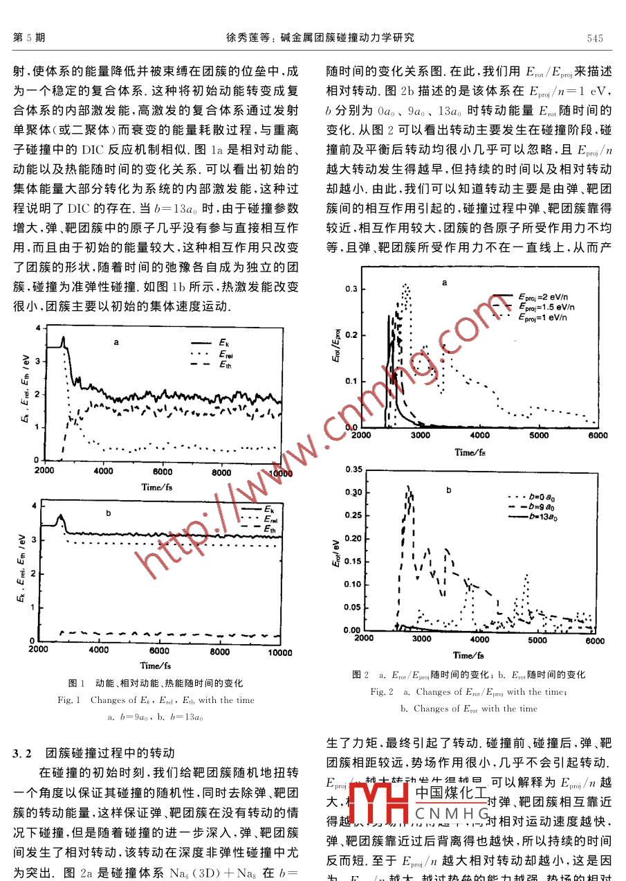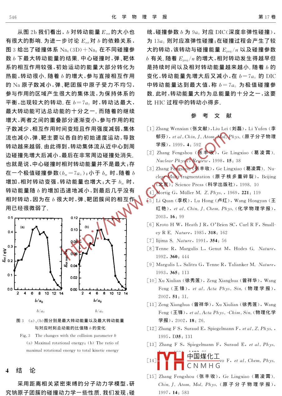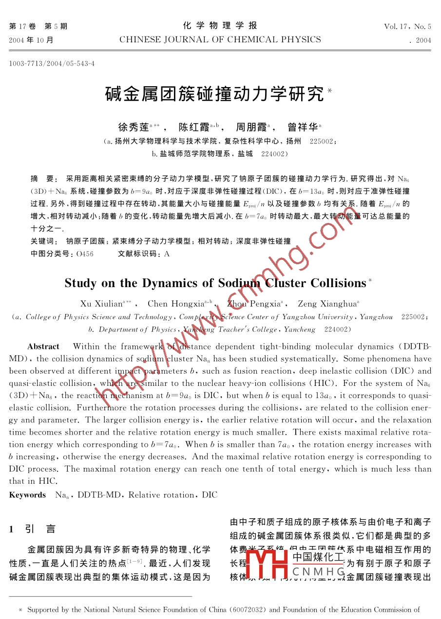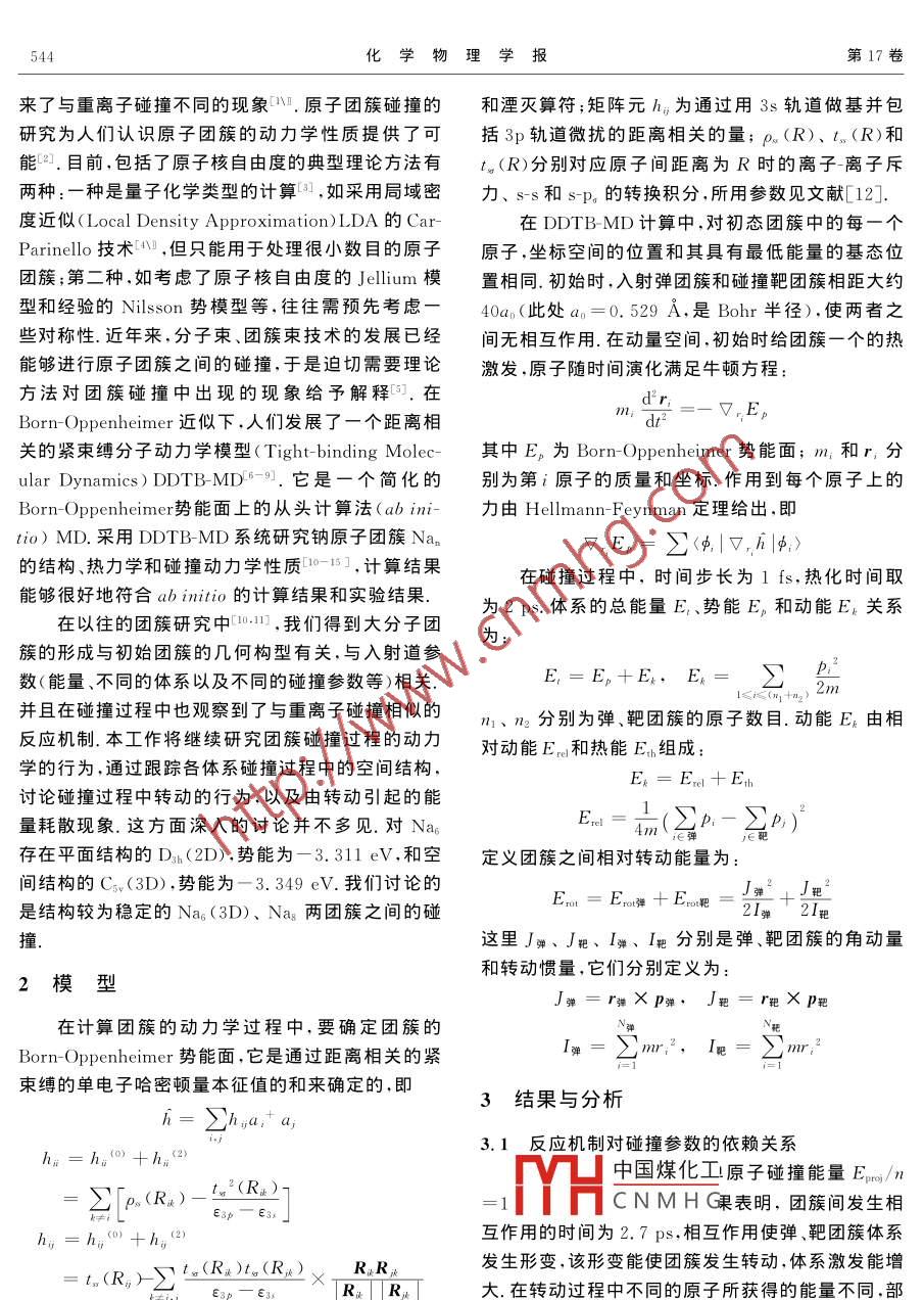 第17卷第5期化學(xué)物理學(xué)報(bào)Vo.17,No.52004年10月CHINESE JOURNAL OF CHEMICAL PHYSICS20041003-7713/2004/05-543-4堿金屬團(tuán)簇碰撞動(dòng)力學(xué)研究徐秀蓮*,陳紅霞,周朋霞",曾祥華a.揚(yáng)州大學(xué)物理科學(xué)與技術(shù)學(xué)院,復(fù)雜性科學(xué)中心,揚(yáng)州225002b,鹽城師范學(xué)院物理系,鹽城224002)摘要:采用距離相關(guān)緊密束縛的分子動(dòng)力學(xué)模型,研究了鈉原子團(tuán)簇的碰撞動(dòng)力學(xué)行為.研究得出,對(duì)Na3D)十Nas系統(tǒng),碰撞參數(shù)為b=Ωa。時(shí),對(duì)應(yīng)于深度非彈性碰撞過(guò)程(DC),在b=13a。時(shí),則對(duì)應(yīng)于準(zhǔn)彈性碰撞過(guò)程.另外,得到碰撞過(guò)程中存在轉(zhuǎn)動(dòng),其能量大小與碰撞能量E-/n以及碰撞參數(shù)b均有關(guān)系.隨著E/n的增大,相對(duì)轉(zhuǎn)動(dòng)減小;隨著b的變化,轉(zhuǎn)動(dòng)能量先增大后減小.在b=7a。時(shí)轉(zhuǎn)動(dòng)最大,最大轉(zhuǎn)動(dòng)能量可達(dá)總能量的十分之關(guān)鍵詞:鈉原子團(tuán)簇;緊束縛分子動(dòng)力學(xué)模型;相對(duì)轉(zhuǎn)動(dòng);深度非彈性碰撞中圖分類(lèi)號(hào):O456文獻(xiàn)標(biāo)識(shí)碼:AStudy on the dynamics of Sodium Cluster CollisionsXu Xiulian", Chen Hongxia.b, Zhou Pengxia, Zeng Xianghua"(a. College of Physics Science and Technology, Com plexity Science Center of Yangzhou University, Yangzhou 225002b. De partment of Physics, Yancheng Teachers College, Yancheng 224002)Abstract Within the framework of distance dependent tight-binding molecular dynamics DDtB-MD), the collision dynamics of sodium cluster Na, has been studied systematically. Some phenomena havebeen observed at different impact parameters b, such as fusion reaction, deep inelastic collision(DIC)andquasi-elastic collision, which are similar to the nuclear heavy-ion collisions (HIC). For the system of nap(3D)+Nas, the reaction mechanism at b=9ao is DIC, but when b is equal to 13ap. it corresponds to quasi-elastic collision. Furthermore the rotation processes during the collisions, are related to the collision energy and parameter. The larger collision energy is, the earlier relative rotation will occur, and the relaxationtime becomes shorter and the relative rotation energy is much smaller. There exists maximal relative rotation energy which corresponding to b=7ao. When b is smaller than 7ao, the rotation energy increases withb increasing, otherwise the energy decreases. And the maximal relative rotation energy is corresponding toDIC process. The maximal rotation energy can reach one tenth of total energy, which is much less thanthKeywords Nan, DDTB-MD, Relative rotation, DIC1引言由中子和質(zhì)子組成的原子核體系與由價(jià)電子和離子組成的堿金屬團(tuán)簇體系很類(lèi)似,它們都是典型的多金屬團(tuán)簇因?yàn)榫哂性S多新奇特異的物理、化學(xué)體費(fèi)體但由工閉能休系中電磁相互作用的性質(zhì),一直是人們關(guān)注的熱點(diǎn),最近,人們發(fā)現(xiàn)長(zhǎng)程中國(guó)煤化為有別于原子和原子堿金屬團(tuán)簇表現(xiàn)出典型的集體運(yùn)動(dòng)模式,這是因?yàn)楹梭w、CNMHG金屬團(tuán)簇碰撞表現(xiàn)出Supported by the National Natural Science Foundation of China (60072032)and Foundation of the Education Commission of芳數(shù)據(jù) of china(031B140152* Corresponding author, E-mail: xuxiulian@ sina, com Received 19 June 2003; in final form 5 December 2003544化學(xué)物理學(xué)報(bào)第17卷來(lái)了與重離子碰撞不同的現(xiàn)象.原子團(tuán)簇碰撞的和湮滅算符;矩陣元h為通過(guò)用3s軌道做基并包研究為人們認(rèn)識(shí)原子團(tuán)簇的動(dòng)力學(xué)性質(zhì)提供了可括3p軌道微擾的距離相關(guān)的量;p(R)、t(R)和能2.目前,包括了原子核自由度的典型理論方法有。(R)分別對(duì)應(yīng)原子間距離為R時(shí)的離子離子斥兩種:一種是量子化學(xué)類(lèi)型的計(jì)算,如采用局域密力、ss和spn的轉(zhuǎn)換積分,所用參數(shù)見(jiàn)文獻(xiàn)[12]度近似( Local Density Approximation)LDA的Car在 DDTB- MD計(jì)算中,對(duì)初態(tài)團(tuán)簇中的每一個(gè)Parinello技術(shù),但只能用于處理很小數(shù)目的原子原子,坐標(biāo)空間的位置和其具有最低能量的基態(tài)位團(tuán)簇;第二種如考慮了原子核自由度的 Jellium模置相同初始時(shí),入射彈團(tuán)簇和碰撞靶團(tuán)簇相距大約型和經(jīng)驗(yàn)的 Nilsson勢(shì)模型等,往往需預(yù)先考慮40a0(此處a0=0.529A,是Bohr半徑),使兩者之些對(duì)稱(chēng)性近年來(lái),分子束、團(tuán)簇束技術(shù)的發(fā)展已經(jīng)間無(wú)相互作用在動(dòng)量空間,初始時(shí)給團(tuán)簇一個(gè)的熱能夠進(jìn)行原子團(tuán)簇之間的碰撞,于是迫切需要理論激發(fā),原子隨時(shí)間演化滿(mǎn)足牛頓方程:方法對(duì)團(tuán)簇碰撞中岀現(xiàn)的現(xiàn)象給予解釋。.在d 2Born- Oppenheimer近似下,人們發(fā)展了一個(gè)距離相VER關(guān)的緊束縛分子動(dòng)力學(xué)模型( Tight-binding Molec-其中E,為 Born-Oppenheimer勢(shì)能面;m;和r分ular Dynamics) DDTB-MD6.它是一個(gè)簡(jiǎn)化的別為第i原子的質(zhì)量和坐標(biāo).作用到每個(gè)原子上的Born-Oppenheimer勢(shì)能面上的從頭計(jì)算法(abin力由 Hellmann-Feynman定理給出,即tio)MD.采用 DDTB-MD系統(tǒng)研究鈉原子團(tuán)簇Nan的結(jié)構(gòu)、熱力學(xué)和碰撞動(dòng)力學(xué)性質(zhì)0-151,計(jì)算結(jié)果在碰撞過(guò)程中,時(shí)