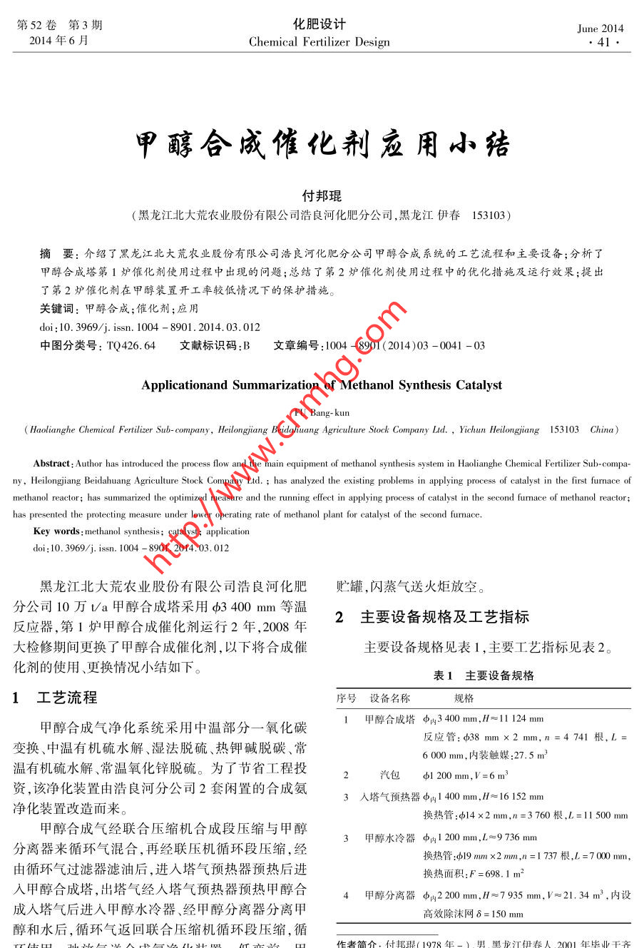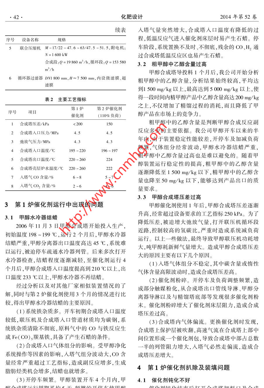 第52卷第3期化肥設(shè)計June 20142014年6月Chemical Fertilizer Design●41甲醇合成催化劑應(yīng)用小結(jié)付邦琨(黑龍江北大荒農(nóng)業(yè)股份有限公司浩良河化肥分公司,黑龍江伊春153103)摘要:介紹了黑龍江北大荒農(nóng)業(yè)股份有限公司浩良河化肥分公司甲醇合成系統(tǒng)的工藝流程和主要設(shè)備;分析了甲醇合成塔第1爐催化劑使用過程中出現(xiàn)的問題;總結(jié)了第2爐催化劑使用過程中的優(yōu)化措施及運行效果;提出了第2爐催化劑在甲醇裝置開工率較低情況下的保護措施。關(guān)鍵詞:甲醇合成;催化劑;應(yīng)用doi : 10.3969/j. issn.1004 - 8901. 2014. 03. 012中圖分類號: TQ426. 64.文獻標(biāo)識碼:B文 章編號:1004 - 8901 (2014)03 -0041 -03Applicationand Summarization of Methanol Synthesis CatalystFU Bang- kun( Haolianghe Chemical Fertilizer Sub- company, Heilongjiang Beidahuang Agriculture Stock Company Ld.,Yichun Heilongjiang 153103 China)Abstract : Author has introduced the process flow and the main equipment of methanol synthesis system in Haolianghe Chemical Fertilizer Sub-compa-ny, Heilongjiang Beidahuang Agriculture Stock Company Ltd. ; has analyzed the existing problems in applying process of catalyst in the first furnace ofmethanol reactor; has summarized the optimized measure and the running effect in applying process of catalyst in the second furnace of methanol reactor;has presented the protecting measure under lower operating rate of methanol plant for catalyst of the second furnace.Key words:methanol synthesis; catalyst; applicationdoi;10. 3969/j. isn.1004 - 8901.2014.03.012黑龍江北大荒農(nóng)業(yè)股份有限公司浩良河化肥貯罐,閃蒸氣送火炬放空。分公司10萬/a甲醇合成塔采用φ3400mm等溫2主要設(shè)備規(guī)格及工藝指標(biāo)反應(yīng)器,第1爐甲醇合成催化劑運行2年,2008年大檢修期間更換了甲醇合成催化劑,以下將合成催主要設(shè)備規(guī)格見表1,主要工藝指標(biāo)見表2?;瘎┑氖褂?、更換情況小結(jié)如下。表1主要設(shè)備規(guī)格1工藝流程序號設(shè)備名稱規(guī)格1 甲醇合成塔φ內(nèi)3 400 mm,H≈11 124 mm .甲醇合成氣凈化系統(tǒng)采用中溫部分一氧化碳.反應(yīng)管:φ38 mm x2 mm,n =4 741根,L =變換、中溫有機硫水解、濕法脫硫、熱鉀堿脫碳、常6000mm,內(nèi)裝觸媒:27.5m3溫有機硫水解、常溫氧化鋅脫硫。為了節(jié)省工程投汽包φ1 200 mm,V=6 m3資,該凈化裝置由浩良河分公司2套閑置的合成氨3入塔氣預(yù)熱器 φμ1400 mm,H≈16152 mm .凈化裝置改造而來。換熱管:φ14 x2 mm,n=3 760根,L=11 500 mm甲醇合成氣經(jīng)聯(lián)合壓縮機合成段壓縮與甲醇3甲醇水冷器中內(nèi)1200mm,L≈9736mm分離器來循環(huán)氣混合,再經(jīng)聯(lián)壓機循環(huán)段壓縮,經(jīng)換熱管:19 mm x2 mm,n=1 737根,L =7000 mm,由循環(huán)氣過濾器濾油后,進人塔氣預(yù)熱器預(yù)熱后進換熱面積:F =698. 1 m2人甲醇合成塔,出塔氣經(jīng)人塔氣預(yù)熱器預(yù)熱甲醇合4甲醇分離器φ內(nèi)2200 mm,H≈7935 mm,V≈21.34 m' ,內(nèi)設(shè)成人塔氣后進人甲醇水冷器、經(jīng)甲醇分離器分離甲高效除沫網(wǎng)δ=150mm.醇和水后,循環(huán)氣返回聯(lián)合壓縮機循環(huán)段壓縮,循環(huán)使用。弛放氣送合成氨凈化裝置- -低變前。甲作者簡介:付邦琨(1978年-),男,黑龍江伊春人,2001年畢業(yè)于齊齊哈爾大學(xué)化學(xué)工程與工藝專業(yè),工程師,現(xiàn)從事甲醇裝置生產(chǎn)技醇分離器內(nèi)的粗甲醇經(jīng)閃蒸槽閃蒸后送往粗甲醇術(shù)管理工作?!?2●化肥設(shè)計2014年第52卷續(xù)表人塔氣量突然增大,合成塔人口溫度有降低的過序號設(shè)備名稱規(guī)格程,低溫反應(yīng)氣進人催化劑床層時易產(chǎn)生石蠟。停.聯(lián)合壓縮機M-17/22 - 47.6-63/47.5 -51.5,附電機:車階段,系統(tǒng)置換不及時、不徹底,殘余的C0、H2通N=1600 kW過合成塔低溫反應(yīng)區(qū)也易產(chǎn)生石蠟。合成段:Q = 19860 m2/h,循環(huán)段:Q= 153 5803.2粗甲醇中乙醇含量過高m'/h甲醇合成塔導(dǎo)投料1個月后,我公司開始分析6循環(huán)器過濾器DNI800mm,H≈7500mm,內(nèi)設(shè)微濾膜、超粗甲醇中的乙醇含量,分析結(jié)果始終較高,平均達濾膜到1 500 mg/kg以上,最高達到5000 mg/kg以上,使表2主要工藝指標(biāo)得一段時間內(nèi)精甲醇產(chǎn)品中乙醇含量高達200 mg/kg之上,不僅增加了精餾過程的消耗,而且降低了甲第1爐第2爐催化劑序號項目催化劑(110%負荷)醇產(chǎn)品在市場上的競爭力。合成塔壓差/kPa .< 200150粗甲醇中的乙醇含量是判斷甲醇合成反應(yīng)副2合成塔 人口壓力/MPa4.5.5反應(yīng)多少的主要依據(jù)。我公司甲醇開車以來的半年內(nèi),由于裝置穩(wěn)定性能較差,開停車及加減負荷3弛放 氣壓力/MPa .4.4.3頻繁,氣體組分經(jīng)常波動,甲醇水冷器結(jié)蠟嚴(yán)重,4合成塔入口溫度/C195 ~ 220196~ 197粗甲醇中乙醇含量過高也是難以避免的。隨著甲5合 成塔出口溫度/C220 ~ 26024醇裝置運行穩(wěn)定性的提高,粗甲醇中的乙醇含量6合成塔殼層爐水溫度/C 220 ~26022逐漸降低至1 500 mg/kg以下,精甲醇中的乙醇含7人塔氣CO含量/%6~85~7量也降至50mg/kg以下,能夠達到產(chǎn)品出口的質(zhì)8人塔氣CO2含量/%2~64~6量要求。3.3甲醇合 成塔壓差過高3第1爐催化劑運行中出現(xiàn)的問題甲醇催化劑使用1年后,甲醇合成塔壓差逐漸升高,經(jīng)常超過設(shè)備要求的工藝指標(biāo)250kPa。為了3.1甲醇水冷器結(jié)蠟2006年11月3日甲醇合