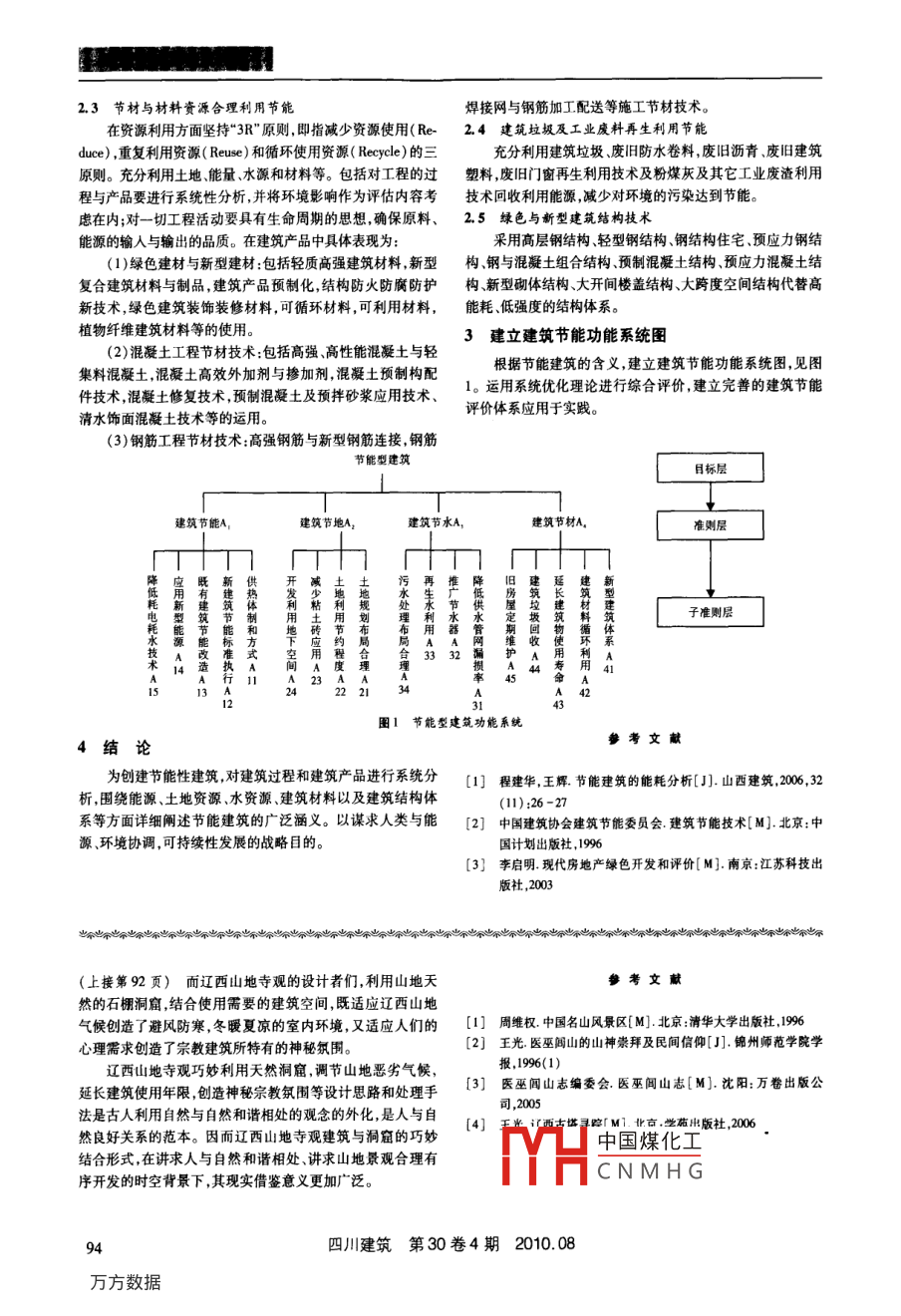 建筑節(jié)能的舉措楊虹,言景(西華大學(xué)建筑與土木工程學(xué)院,四川成都610039)【摘要】文聿提出推廣建筑節(jié)能的緊迫性,并圍繞能源、土地資源、水資源、建筑材料以及建筑結(jié)構(gòu)體系等方面詳細(xì)闡述建筑節(jié)能的廣泛涵義,在此基礎(chǔ)上建立建筑節(jié)能功能系統(tǒng)圖以便進(jìn)行系統(tǒng)優(yōu)化評(píng)價(jià)?!娟P(guān)鍵詞】節(jié)能建筑;緊迫性;措施;功能系統(tǒng)圖【中圖分類號(hào)】TU.195【文獻(xiàn)標(biāo)識(shí)碼】A1推廣建筑節(jié)能的緊迫性窗高比。(3)封閉型陽(yáng)臺(tái)節(jié)能:可減少外界的粉塵和噪聲對(duì)房間建筑消耗大量的自然資源(土地資源、能源資源、水資源,木材和其他資源),導(dǎo)致日趨嚴(yán)重的資源消耗和環(huán)境問(wèn)“呼吸作用”產(chǎn)生很好的空間效果和生態(tài)效應(yīng)達(dá)到節(jié)能。其中“中介效應(yīng)”具體指將陽(yáng)臺(tái)空間形成一個(gè)單獨(dú)的陽(yáng)光室,介環(huán)境的破壞使資源的稀缺性日益明顯,生態(tài)環(huán)境急劇惡化,于室內(nèi)與室外之間,起到冷熱變化的緩沖帶和過(guò)渡帶。夏天其中與建筑有關(guān)的污染占環(huán)境總體污染的30%左右。就水為“隔熱層”,冬天為“緩沖區(qū)”,減少室內(nèi)溫度的熱損失。泥生產(chǎn)一項(xiàng)就是高耗資源、高耗能污染環(huán)境的行業(yè),按生產(chǎn)“呼吸作用”指人們通過(guò)陽(yáng)臺(tái)進(jìn)行氣流的導(dǎo)入和導(dǎo)出來(lái)帶動(dòng)1水泥平均消耗1石灰石消耗150kg標(biāo)準(zhǔn)煤,消耗熱量的轉(zhuǎn)移。具體方法:放低窗臺(tái)的高度,形成大面積的玻l10kw·h電計(jì),其能源耗量占全國(guó)能源消耗量的7%左右。從能源利用效率來(lái)看,我國(guó)單位產(chǎn)品的能耗水平較高,以建璃窗強(qiáng)化陽(yáng)光室的概念;通過(guò)采用雙層或多層的保溫性能好筑業(yè)為例,目前我國(guó)現(xiàn)有建筑總面積400億m2估計(jì),95%以的玻璃加上保溫窗簾加強(qiáng)陽(yáng)臺(tái)空間的保溫性能;通過(guò)采用上是高耗能建筑,還未包括建筑在使用過(guò)程中采暖、空調(diào)、通石材、地磚、鵝卵石等鋪裝材料增加陽(yáng)臺(tái)空間的貯熱容量;通風(fēng)照明等方面的能量消耗,因此建筑中不合理的高能耗是過(guò)在陽(yáng)光室種植花草,美化環(huán)境增加含氧量改善陽(yáng)臺(tái)空間到令行禁止的時(shí)候了。國(guó)家主席胡錦濤在2008年日本札幌的生態(tài)環(huán)境。舉行的八國(guó)峰會(huì)上,提出到2010年單位GDP能耗比2005年(4)屋面節(jié)能:采用保溫層置于防水層之上的施工工藝,降低20%的目標(biāo)以及節(jié)能減排的主張、政策和實(shí)踐,包括擬增加節(jié)能效果;綠化屋面,作為夏季隔熱有著顯著效果,可節(jié)對(duì)重污染產(chǎn)品開(kāi)征消費(fèi)稅等措施表明政府提倡建筑節(jié)能的約大量空調(diào)用電量;采用淺色坡屋面在太陽(yáng)輻射最強(qiáng)的中力度和舉措。建筑節(jié)能是社會(huì)經(jīng)濟(jì)發(fā)展的必然需求,它可午時(shí)間,太陽(yáng)線對(duì)坡屋面為斜射減少太陽(yáng)輻射強(qiáng)度,同時(shí)采緩解能源資源的緊張局面;減輕大氣污染;保護(hù)生態(tài)環(huán)境和用非金屬淺色系可反射65%的日照,節(jié)省能耗。提高建筑環(huán)境的質(zhì)量,滿足人們對(duì)舒適建筑環(huán)境的需求。2.2節(jié)地與地下空間開(kāi)發(fā)利用節(jié)能(1)建筑規(guī)劃設(shè)計(jì)節(jié)地技術(shù):根據(jù)建筑功能要求和當(dāng)?shù)?節(jié)能建筑的含義的氣候參數(shù)在總體規(guī)劃和單體設(shè)計(jì)中,科學(xué)合理地確定建節(jié)能建筑從狹義指通過(guò)提髙建筑圍護(hù)結(jié)構(gòu)的熱工性能,筑物的朝向、平面形狀、空間布局、外觀體型、間距、層高、選同時(shí)節(jié)約采暖供熱、空調(diào)制冷、采光照明以及調(diào)節(jié)室內(nèi)空氣、用節(jié)能型建筑材料保證建筑外維護(hù)結(jié)構(gòu)的保溫隔熱等熱工濕度,改變居室環(huán)境質(zhì)量的能源消耗。也包括利用太陽(yáng)能、特性及對(duì)建筑周圍環(huán)境進(jìn)行綠化設(shè)計(jì),最大限度地減少建筑地?zé)崮茉?、風(fēng)能等可再生資源達(dá)到節(jié)約能源的目的。從廣義物能耗量,獲得理想的節(jié)能效果。講建筑節(jié)能不僅僅是簡(jiǎn)單純粹的能源節(jié)約,而是指在建筑中(2)地下空間開(kāi)發(fā)利用技術(shù):地下交通工程地下建筑開(kāi)合理使用和有效利用資源,不斷提高資源利用率生命全過(guò)發(fā)利用、市政公共地下綜合管廊與地下管線敷設(shè)技術(shù)和地下程。包括以下幾方面的內(nèi)容和節(jié)能措施。(照明、通風(fēng)、環(huán)境)工程配套技術(shù)的實(shí)施21建筑外圍護(hù)結(jié)構(gòu)保溫隔熱節(jié)能(3)地下工程施工技術(shù):采用深基坑開(kāi)挖與支護(hù)技術(shù),逆(1)外墻節(jié)能:使用環(huán)保、節(jié)能型建筑材料,可有效地減作法與半逆作法、暗挖法(新奧法)質(zhì)構(gòu)法和非開(kāi)挖法施工少通過(guò)圍護(hù)結(jié)構(gòu)的傳熱,從而減少各主要設(shè)備的容量,達(dá)到技術(shù)等運(yùn)用。顯著的節(jié)能效果;也可采用新型墻體材料與復(fù)合墻體圍護(hù)結(jié)構(gòu);對(duì)垂直
