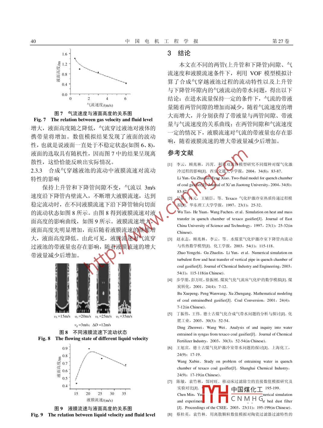 第27卷第8期中國電機工程學(xué)報VoL, 27 No 8 Mar 20072007年3月Proceedings of the cseeC2007 Chin. Soc. for Elec Eng文章編號:02588013(2007)08-0037-05中圖分類號:TK284文獻標識碼:A學(xué)科分類號:47010激冷室內(nèi)合成氣穿越液池過程流動特性與帶水問題謝海燕,袁竹林東南大學(xué)潔凈煤發(fā)電及燃燒技術(shù)教育部重點實驗室,江蘇省南京市2100906)Flowing Characteristics and Problem of Entraining Water about mixedGas Crossing the Cistern in Quench ChamberXIE Hai-yan, YUAN Zhu-lin(The Key Laboratory of Clean Coal Power Generation and Combustion Technology of the Ministry of Education, SoutheastUniversity, Nanjing 210096, Jiangsu Province, ChinaABSTRACT: The entrainment properties of mixed gas passing 0 3IEthrough a cistem in quench chamber of Texaco gasifier were在 Texaco氣化爐中,高溫合成氣經(jīng)過激冷環(huán)-dimensional numerical simulation Theeffects of the space between the ascending and descending進入激冷室,在激冷室內(nèi)進行冷卻及除渣。激冷室pipes, gas velocity and liquid film velocity on the entrainil主要由激冷環(huán)、下降管、上升管和液池組成圖1)water flux were discussed№ umerical results indicate that th激冷環(huán)位于下降管上方,下降管下端浸入液池中training water flux decreases with the increase of the space激冷水從激冷環(huán)內(nèi)流出,沿下降管內(nèi)壁流入液池between two pipes, and increases with the increase of gas高溫合成氣與下降管內(nèi)壁水膜直接接觸發(fā)生強烈velocity when the water inlet flux keeps constant. The relation的熱質(zhì)交換,合成氣中熔融態(tài)灰渣發(fā)生聚并與凝between the level height and parameters are also obtained. The結(jié)。合成氣沿著下降管進入液池后,從下降管與上iquid film velocity has obvious effect on the entraining water升管的環(huán)隙流出,在合成氣穿越液池過程中,大部Ix asremains constant. It is found that the entraining water flux分凝渣與氣體發(fā)生分離而留在液池中,合成氣得到decreases at first. reaches a minimum. and then increases with初步凈化。由于存在密度差,在激冷室床層和下the increase of the liquid film velocity降管與上升管的環(huán)隙間形成了一個黑水的整體、脈KEY WORDS: Texaco gasifier; quench chamber;εsqud沖式的循環(huán)流動,水的流動方向與氣體流向相同,two-phase flow; entraining water; numerical simulation因此激冷室內(nèi)液相的黑水極易被合成氣大量夾帶至后續(xù)的洗滌塔,從而影響裝置正常運行。氣化爐摘要:采用三維數(shù)值模擬方法對德士古氣化爐激冷室內(nèi)合成合成氣帶水的問題對氣化系統(tǒng)穩(wěn)定運行的危害很氣穿越液池過程的流動特性以及合成氣帶水等關(guān)鍵問題進行了研究,探討了兩管(上升管和下降管)間隙、氣流速度以大,而在氣化爐下部激冷室內(nèi)都不同程度地出現(xiàn)及液膜流速對帶液量的影響。模擬結(jié)果表明:在進水流量保持一定的條件下,氣流的帶液量隨著兩管間隙的增加而減激冷環(huán)少,隨著氣流速度的增大而增大,并分別獲得了帶液量與兩管間隙、帶液量與氣流速度的關(guān)系曲線;在兩管間隙和氣流下降管速度一定的條件下,液膜流速對氣流的帶液量也存在影響,隨著液膜流速的增大帶液量先減少后增加。上升管關(guān)鍵詞: Texaco氣化爐;激冷室:氣液兩相流動;帶液數(shù)值模擬中國煤化工基金項目:國家重點基礎(chǔ)研究發(fā)展規(guī)劃基金項目(2004CB21CNMHGProject Subsidized by the Special Funds for Major State Basic圖1激冷室Research Projects of China(2004CB217707)Fig 1 Quench chamber38中國電機工程學(xué)報第27卷“帶水”問題,嚴重影響著裝置的穩(wěn)定運行。關(guān)于 Texaco氣化爐內(nèi)合成氣帶水實驗,由于測試方法上有困難,目前很多文獻上56僅僅分析了合成氣帶+G-p8水問題的影響因素,而數(shù)值模擬往往能有效地發(fā)揮出探討其內(nèi)在機理的作用9,本文采用VOFda+[(μ( volume of fluid模型對氣化爐激冷室內(nèi)合成氣穿越液池的流動特性進行了數(shù)值模擬,并定性分析了兩出)]+CG-C2p管(上升管和下降管)間隙、氣流速度以及液膜流速對帶液量的影響,在此基礎(chǔ)上獲得了相應(yīng)的研究結(jié)果。1.2.2界面捕捉方法1數(shù)值模擬平臺的建立VOF模型通過求解單獨的動量方程和處理穿過區(qū)域的每一流體的容積份額來模擬2種不能混合1.1物理模型的流體。它是基于時間和空間平均方程及耦合兩相為著重探討激冷室內(nèi)合成氣穿越液池的流動流體模型,采用界面跟蹤算法來對兩相流進行模過程,根據(jù)本文的工程背景,簡化得到了以下的物擬,可用于模擬流體中大泡的運動和氣液界面的穩(wěn)理模型:液膜沿著下降管內(nèi)壁流入液池,氣流與液態(tài)和瞬態(tài)處理。針對氣體與液體互不融和的特點,膜同向流動,穿越液池后從下降管與上升管間環(huán)隙即不考慮傳質(zhì)問題,本文中數(shù)學(xué)模型采用ⅤOF方向上流出,并攜帶一定的水量,如圖2所示。在數(shù)法捕捉氣液兩相的界面。值計算中,不考慮氣液兩相間的傳熱問題和氣流中連續(xù)性方程為凝渣的分離,在冷態(tài)條件下對相關(guān)流動問題進行研究。分析可知,若帶水量與進入液池的水量相同+l2V,=0則液池高度基本保持不變。兩相體積比滿足歸一化條件:氣流入口C1+Cx,=1↓1氣流出為了很好的求解VOF方程(3),本文采用DLYoungs提出的的單個網(wǎng)格內(nèi)的斜直線近似,在單個網(wǎng)格上構(gòu)造有斜