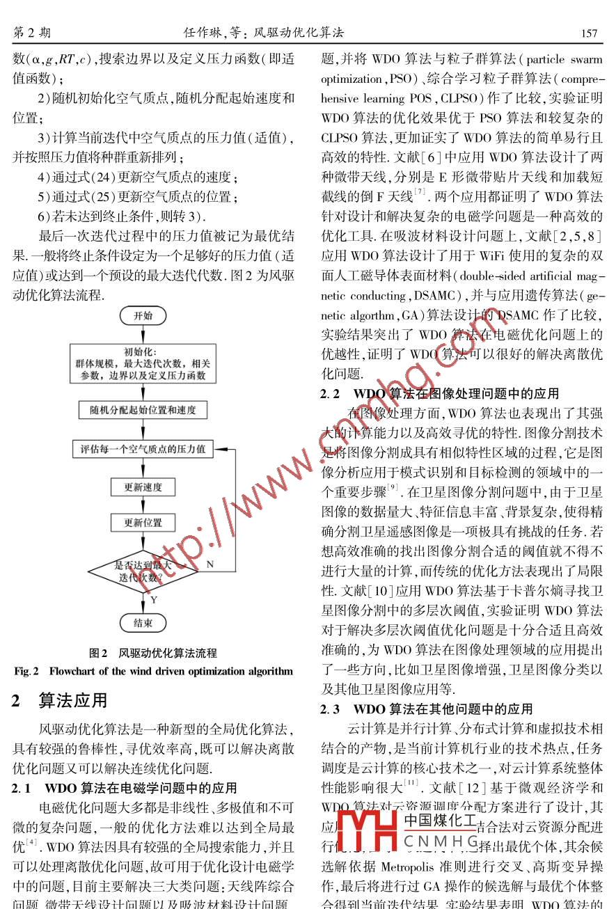 第29卷第2期江蘇科技大學(xué)學(xué)報(bào)(自然科學(xué)版)Vol. 29 No. 22015年4月Journal of Jiangsu University of Science and Technology ( Natural Science Edition )Apr.2015doi :10.3969/j. issn. 1673 - 4807.2015. 02.010風(fēng)驅(qū)動(dòng)優(yōu)化算法任作琳',張儒劍”,田雨波'(1.江蘇科技大學(xué)電子信息學(xué)院,江蘇鎮(zhèn)江212003)(2.南京郵電大學(xué)海外教育學(xué)院,江蘇南京210046)摘要:風(fēng)驅(qū)動(dòng)優(yōu)化( wind driven optimization, WDO)算法是一種新興的基于群體的迭代啟發(fā)式全局優(yōu)化算法.該算法是對(duì)物理學(xué)中大氣運(yùn)動(dòng)的簡(jiǎn)單模擬,其概念清晰,高效易實(shí)現(xiàn),且可調(diào)參數(shù)較少,魯棒性強(qiáng),尋優(yōu)效率高,全局搜索能力較強(qiáng),適用于解決多維和多模態(tài)問題,可以處理連續(xù)和離散優(yōu)化問題.文中首先介紹了該算法的物理學(xué)基礎(chǔ),以及基本原理,并給出--些應(yīng)用實(shí)例,最后對(duì)內(nèi)容做出總結(jié),并對(duì)該算法未來的研究提出了-.些建議.關(guān)鍵詞:風(fēng)驅(qū)動(dòng)優(yōu)化算法;群體智能;全局優(yōu)化中圖分類號(hào):TP301. 6文獻(xiàn)標(biāo)志碼: A文章編號(hào): 1673 - 4807(2015 )02 -0153 -06Wind driven optimization algorithmRen Zuolin',Zhang Rujian^ ,Tian Yubo'(1. School of Electronics and Information, Jiangsu University of Science and Technology ,Zhenjiang Jiangsu 212003 , China)(2. School of Oversea Education , Nanjing University of Posts and Telecommunications , Nanjing Jiangsu 210046 , China)Abstract : The wind driven optimization ( WDO) algorithm is a population -based iterative heuristic global optimi -zation algorithm. It is a simple copy of atmospheric motion in physics. WDO algorithm is easily understood withless parameters and better robustness,for multi- dimensional and multi +modal problems , which is also well -suitedfor problems with both discrete and continuous valued parameters. It is easy to execute and highly effective withfaster convergence speed and stronger ability for the global optimum . This paper presents the physical knowl -edge, and then a detailed introduction of WDO 's basic principle and its applications are covered. Finally, a briefconclusion and some suggestions for future research are given .Key words: wind driven optimization algorithm ; swarm itelligent ; global optimization智能優(yōu)化算法具有全局的、并行高效的優(yōu)化性rithm and its application to electromagnetic ”的論能、魯棒性、通用性強(qiáng)、無(wú)需問題特殊信息等優(yōu)點(diǎn),文[2] ,標(biāo)志著風(fēng)驅(qū)動(dòng)優(yōu)化( WDO)算法的誕生.已經(jīng)被廣泛應(yīng)用于計(jì)算機(jī)科學(xué)、優(yōu)化調(diào)度、運(yùn)輸問風(fēng)驅(qū)動(dòng)優(yōu)化算法是一種基 于群體的迭代啟發(fā)題組合優(yōu)化、工程優(yōu)化設(shè)計(jì)等眾多領(lǐng)域,并引起了式全局優(yōu)化算法,該算法是基于對(duì)簡(jiǎn)化的空氣質(zhì)點(diǎn)國(guó)內(nèi)外學(xué)者的廣泛關(guān)注".美國(guó)賓夕法尼亞州立受力運(yùn)動(dòng)模型的模擬.其核心是研究空氣質(zhì)點(diǎn)在大大學(xué)電氣工程系的Bayraktar Z和WernerDH博士氣中的受力運(yùn)動(dòng)情況,應(yīng)用牛頓第二定律并結(jié)合理以及氣象學(xué)系的Komurcu M博士在2010年IEEE想氣體狀態(tài)方程,推導(dǎo)出空氣質(zhì)點(diǎn)在每一次迭代中Antennas and Propagation Society International Sym-的速度和位置的更新方程.該算法簡(jiǎn)單,易于實(shí)現(xiàn),posium.上發(fā)表了名為“Wind Driven Optimization :可調(diào)中國(guó)煤化工局部極值尋找到最優(yōu)( WDO): A novel nature Hinspired optimization algo-YHCN M H C問題,也可以處理連續(xù)收稿日期: 2014-10-15基金項(xiàng)目:國(guó)家自然科學(xué)基金資助項(xiàng)目(61401179)作者簡(jiǎn)介:任作琳(1991- -) ,女,碩士研究生,研究方向?yàn)橹悄芩惴捌鋺?yīng)用. E-mail: lebaishi.2014@ 163. com通訊作者:田雨波(1971-),男 ,博士,教授,研究方向?yàn)閮?yōu)化算法在電子學(xué)和電磁學(xué)中的應(yīng)用. E-mail :tianyubo@ just. edu. cn154江蘇科技大學(xué)學(xué)報(bào)(自然科學(xué)版)2015年優(yōu)化問題和離散優(yōu)化問題.下述表達(dá)式對(duì)所有矢量普遍成立:相比于其他智能優(yōu)化算法(如粒子群優(yōu)化算d.A dA+QxA(5)法)該算法更新方程具有實(shí)際的物理意義,其全局dtd搜索能力較強(qiáng),收斂速度較快,尋優(yōu)效率高,魯棒性式中A為某- -矢量.將式(2)代人式(5):強(qiáng),且可以通過微調(diào)系數(shù)達(dá)到不同的優(yōu)化拓?fù)浣Y(jié)d.V._l.,+Qx}V。=構(gòu),應(yīng)用前景十分廣泛.目前國(guó)內(nèi)剛剛開始關(guān)注.dt'WDO算法的研究,文中介紹了WD0算法的原理lt \(V+Qxr)+Qx(V+nxr)=和目前的研究情況,進(jìn)而給致力于研究WD0算法dV的研究者們提供一- 些借鑒.+2(IxV)+nx(Q2xr)1風(fēng)驅(qū)動(dòng)優(yōu)化算法式(6)中最后一個(gè)等號(hào)右邊第- -項(xiàng)為相對(duì)于地球表面的加速度;第二項(xiàng)為科氏( Coriolis)加速1.1算法物理基礎(chǔ)大氣動(dòng)力學(xué)是經(jīng)典力學(xué)中牛頓定律在地球大度,只有當(dāng)氣塊相對(duì)地表運(yùn)動(dòng)時(shí)(V≠0)才出現(xiàn);氣中的應(yīng)用,大氣運(yùn)動(dòng)和經(jīng)典流體力學(xué)的一一個(gè)主要第三項(xiàng)為氣塊隨地球旋轉(zhuǎn)而具有的向心加速度,只區(qū)別是:大氣運(yùn)動(dòng)是處于一個(gè)旋轉(zhu