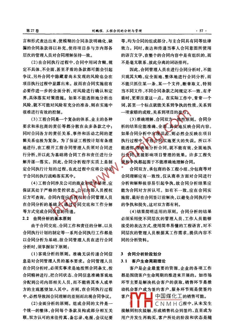 鰾述石油化工設(shè)計(jì)Petrochemical Design2010,27(3) 56 ~58工程合同的分析與管理劉鵬程(中國(guó)石化工程建設(shè)公司,北京100101)摘要:分析和設(shè)計(jì),作為工程中的常用語(yǔ),將其引入合同生命周期的管理中,從合同分析的基礎(chǔ)入手,將合同生命周期分為四個(gè)階段:招投標(biāo)階段、合同談判與簽訂階段、合同執(zhí)行階段、合同完工后關(guān)閉階段。其目的是保證合同管理的全過(guò)程能夠始終貫徹如下的思想:即在合同生命周期中,合同管理“手段”的選擇,應(yīng)優(yōu)先做到保證自己一方達(dá)到最佳利益,服務(wù)于整個(gè)項(xiàng)目管理目標(biāo),這是對(duì)合同管理的本質(zhì)要求。關(guān)鍵詞:工程合同;合同分析;生命周期1工程合同與合同管理帶,把建設(shè)項(xiàng)目的實(shí)施主體(項(xiàng)目利益相關(guān)者)集工程合同是建設(shè)工程合同的簡(jiǎn)稱(chēng)。根據(jù)《合中到工程項(xiàng)目之中,形成了一個(gè)動(dòng)態(tài)的、開(kāi)放的項(xiàng)同法》第269條規(guī)定:建設(shè)工程合同,又稱(chēng)為建設(shè)目組織。但是,在這個(gè)組織中,業(yè)主和承包商須緊工程承包合同和基本建設(shè)承包合同,是承包人進(jìn)密合作,才能夠使工程順利完成,并給各方帶來(lái)效行工程建設(shè),發(fā)包人支付價(jià)款的合同。在其他國(guó)益。同時(shí),雙方又是一個(gè)相互獨(dú)立的經(jīng)濟(jì)實(shí)體,在家,法律均沒(méi)有專(zhuān)門(mén)單獨(dú)地規(guī)定建設(shè)工程合同,工程建設(shè)過(guò) 程中不可避免地會(huì)發(fā)生利益上的沖各國(guó)立法無(wú)-例外地都將建設(shè)工程合同納人承攬突,合同就成為調(diào)整雙方利益關(guān)系重要的法律文合同的范疇并予以規(guī)定。件,合同條款是業(yè)主和承包商執(zhí)行項(xiàng)目的依據(jù)。我國(guó)《合同法》將建設(shè)工程合同規(guī)定在承攬合在項(xiàng)目執(zhí)行過(guò)程中,承包商的各職能人員和同之后,作為15種有名合同和典型合同之一,突項(xiàng)目組人員都必須熟練地掌握合同,以合同作為出了建設(shè)工程合同的特殊地位,以及建設(shè)工程與行為準(zhǔn)則,用合同指導(dǎo)工程實(shí)施。但在實(shí)際工作承攬合同的法律淵源和差別。由于建設(shè)工程合同中,承包商的各職能人員和項(xiàng)目組人員不能都手從承攬合同中分離出來(lái),且現(xiàn)在除我國(guó)大陸以外執(zhí)一份合同,遇到具體問(wèn)題都由各人查閱合同。的各國(guó)仍然將其列入承攬合同中予以規(guī)定,故此為避免出現(xiàn)對(duì)合同歧義理解、合同不能按約履行《合同法》第287條規(guī)定:“本章沒(méi)有規(guī)定的,適用的情況,進(jìn)行合同分析,將合同工作和責(zé)任分解后層層落實(shí),尤為必要。承攬合同的有關(guān)規(guī)定?!痹诠こ添?xiàng)目的建設(shè)管理中,合同管理發(fā)揮著2.1 合同分析的必要性重大作用,許多行業(yè)專(zhuān)家和企業(yè)管理者已將它作(1)語(yǔ)義的模糊與語(yǔ)句的歧義是造成合同意為一項(xiàng)基本制度納人工程項(xiàng)目管理中,并將這種思表示不明確或漏洞的主要原因。執(zhí)行人法律知制度稱(chēng)為合同管理制。合同管理在工程項(xiàng)目管理識(shí)的缺乏,締約履約環(huán)境的差異與分離也會(huì)導(dǎo)致中發(fā)揮了重要作用。合同管理水平高,則項(xiàng)目易合同意思表示的不明確與缺漏。只有在合同實(shí)施成功;合同管理水平低,項(xiàng)目則有可能失敗。即:前進(jìn)行合同分析,將合同規(guī)定用最簡(jiǎn)單易懂的語(yǔ)工程合同具有鎖定交易平臺(tái)、鎖定交易內(nèi)容、鎖定中國(guó)煤化工交易方式、鎖定假定處置四項(xiàng)功能"。-34年畢業(yè)于天津大CNMHG價(jià)工程師,企業(yè)法2合同分析的必要性及基本原則律顧問(wèn),一直從事市場(chǎng)開(kāi)發(fā)和合同管理工作。聯(lián)系電項(xiàng)目法人(業(yè)主)以市場(chǎng)為載體,以合同為紐話:010-84876157 ;E -mail : liupe. sei@ sinopec. com第27卷劉鵬程.工程合同的分析與管理.●57●言和形式表達(dá)出來(lái),使模糊的合同條款明確化、缺等,均為合同的組成部分,與主合同具有同等法律漏的合同條款得以補(bǔ)充,使得項(xiàng)目參與方內(nèi)部各效力。同時(shí),表達(dá)和傳遞當(dāng)事人合同意圖所使用層次的管理人員對(duì)合同理解保持一致。的語(yǔ)言文字,在整個(gè)的合同內(nèi)容中是有組織的,而(2)在合同執(zhí)行過(guò)程中,合同中用詞含糊,規(guī)不是毫無(wú)聯(lián)系、彼此分離的詞語(yǔ)排列。定不具體、不全面、甚至矛盾的條款都可能會(huì)引起因此,合同管理人員在進(jìn)行合同分析時(shí),不能爭(zhēng)議,另外合同中隱藏著尚未發(fā)現(xiàn)的風(fēng)險(xiǎn)也會(huì)在只觀其大略,應(yīng)全面地、整體地進(jìn)行合同分析,而項(xiàng)目執(zhí)行過(guò)程中顯露出來(lái)。故而在合同實(shí)施前有不能只抓住某一條、某-一個(gè)文件,斷章取義,特別必要作進(jìn)一步的全面分析,對(duì)風(fēng)險(xiǎn)進(jìn)行確認(rèn)和定當(dāng)不同文件、不同合同條款之間規(guī)定不- -致、有矛界,具體落實(shí)對(duì)策措施。如果不能透徹地分析出盾時(shí),更要注意這一一點(diǎn)。 在實(shí)際工作中,常常-一個(gè)