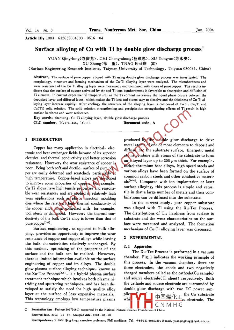 Vol.14 No. 3Trans. Nonferrous Met. Soc. ChinaJun. 2004Article ID: 1003 - 6326(2004)03 - 0516 - 04Surface alloying of Cu with Ti by double glow discharge process"YUAN Qing-long(袁慶龍), CHI Cheng zhong(池成忠), SU Yong-an(蘇永安),XU Zhong(徐重), TNAG Bin(唐賓)(Surface Engineering Research Institute, Taiyuan University of Technology, Taiyuan 030024, China)Abstract: The surface of pure copper alloyed with Ti using double glow discharge process was investigated. Themorphology, structure and forming mechanism of the Cu-Ti alloying layer were analyzed. The microhardness andwear resistance of the Cu-Ti alloying layer were measured, and compared with those of pure copper. The results in-dicate that the surface of copper activated by Ar and Ti ions bombardment is favorable to absorption and diffusion ofTi element. In current experimental temperature, as the Ti content increases, the liquid phase occurs between thedeposited layer and diffused layer, which makes the Ti ions and atoms easy to dissolve and the thickness of Cur-Ti al-loying layer increase rapidly. After cooling, the structure of the alloying layer is composed of CuTi, CuTi andCu(Ti) solid solution. The solid solution strengthening and precipitation strengthening efcts of Ti result in highsurface hardness and wear resistance.Key words: titanizing; CurTi aloying layer; double glow discharge processCLC number: TG174. 445; TG113Document code: A1 INTRODUCTIONproduced by the double glow discharge to driveCopper has many application in electrical, elec-metal atoms of one or more elements to deposit andtronic and heat exchanger fields because of its superiordiffuse into the substrate surface. Energetic metalelectrical and thermal conductivity and better corrosionatoms combine with atoms of the substrate to formresistance. However, the wear resistance of copper isan alloyed layer up to 300 μm thick. For example,poor. Being both soft and ductile, surface of pure cop-nickel-chromium base alloys, high speed steels andper are easily deformed and scratched, particularly atvarious alloys have been formed on the surface ofhigh temperature. Copper -based alloys are developedcommon carbon steels and other conductive materi-to improve some properties of copper. For example,als6-10]. Compared with ion implantation or laserCur Ti alloys have high tensile properties and reasona-surface alloying, this process is simple and versa-ble wear resistance, and are applied in relatively hightile in that a large number of metals and their com-wear applications such as plastic injection mouldingbinations can be diffused into the substrate.dies where the relatively high thermal conductivity ofIn the current study, pure copper substratethe copper alloy when compared with, for example,was alloyed with Ti using the Xu-Tec Process.tool steel, is damended, However, the thermal con-The distributions of Ti, hardness from surface toductivity of the bulk Cu-Ti alloy is lower than that ofsubstrate and the wear characteristics on the sur-pure copperf1-].face were measured and analyzed. The formationSurface engineering, as opposed to bulk allo-mechanism of Cu-Ti alloying layer was discussed.ying, provides an opportunity to improve the wearresistance of copper and copper alloys while leaving2 EXPERIMENTALthe bulk characteristics relatively unchanged. By2.1 Apparatusthis method, optimizing of the properties of theThe Xu-Tec Process is performed in a vacuumsurface and the bulk can be realized. However,there is limited information available on the surfacechamber. Fig. 1 indicates the working principle ofengineering of copper and its alloys. The doublethis process. In the vacuum chamber, there areglow plasma surface alloying technique, known asthree electrodes: the anode and two negativelythe Xu-Tec Processft.5], is a hybrid plasma surfacecharged members called as the cathode(Cu sample)treatment technique which involves both plasma ni-and source electrode(Ti sheet) respectively. Bothtriding and sputtering techniques, and has been de-the cathode and source electrode are surrounded byveloped to satisfy the need for high quality alloydouble glow discharge with two DC power sup-layer at the surface of less expensive materials.plithe Cu substrateThis technology employs low temperature plasmaw中國(guó)煤化Ieeterede "nTYHCNMHGD Foundation item: Proect(50371060) supported by the National Naturel Seience Foundation of ChinaReeived date: 2003 - 06 - 02; Accepted date: 2004 -01 -04Crrespadene YUAN Qinglong, 8sciate pofessor PhD candidate Tel: +86-351 60650898 E-mail; yunginglong@tyut. edu. enVol. 14 No. 3Surface alloying of Cu with Ti by double glow discharge process●517.Ti ions or atoms sputtered from the source elec-Based on the considerable experiment, the op-trode are accelerated toward the Cu substrate at aerating parameters of Xu-Tec process in the testshigher negative potential, then deposit and diffuseare gained and listed in Table 1 together with theinto the copper surface forming a Cu-Ti alloy. Thefinal thickness of Cu-Ti alloying layer.vacuum chamber was kept at 2 - 3 Pa, then back-The morphology and structure of Cu-Ti alloyfillel with argon to 20 - 40 Pa before double glowlayers were investigated by scanning electron mi-discharging. The cathode(Cu sample) was heatedcroscopy( SEM). The distributions of Ti elementby ion bombardment to 940 - 950 C and was main-were examined by SEM ( LEO-438VP) equippedtained at that temperature for several hours. Thewith EDS. The micro-hardness from surface toholding time depended on the thickness requiredsubstrate and the wearesistance of the alloyingand on the actual temperature. After titanizing op-layers were measured with micro-sclerometereration was completed, let the sample cool down in(M400- H1) and MM200 wear tester, respectively.the chamber under the protection of Ar. In currentThe surface phase structure of Cu-Ti alloy layerexperiment, the source electrode potential waswas measured with Rigaku D/max 2500 X-ray dif-more ne