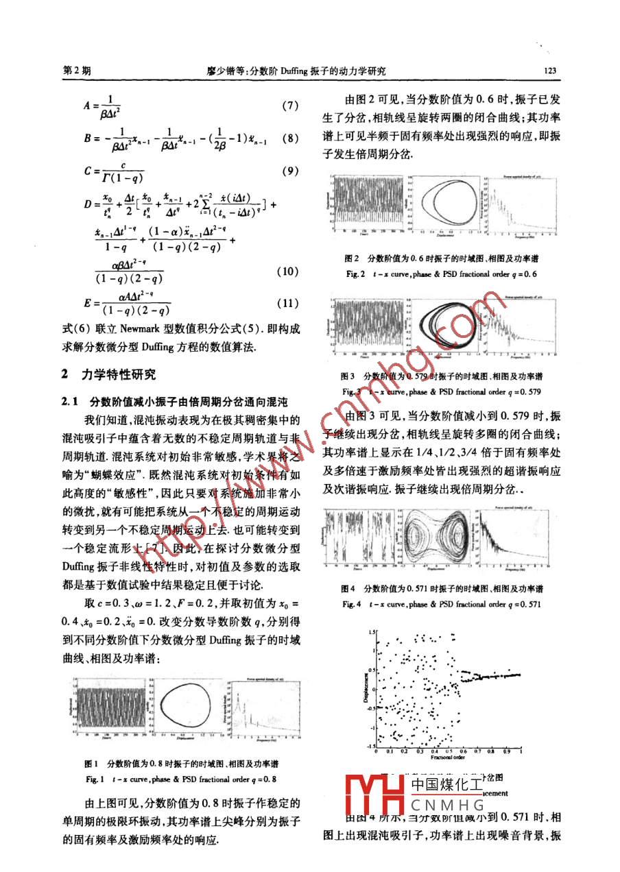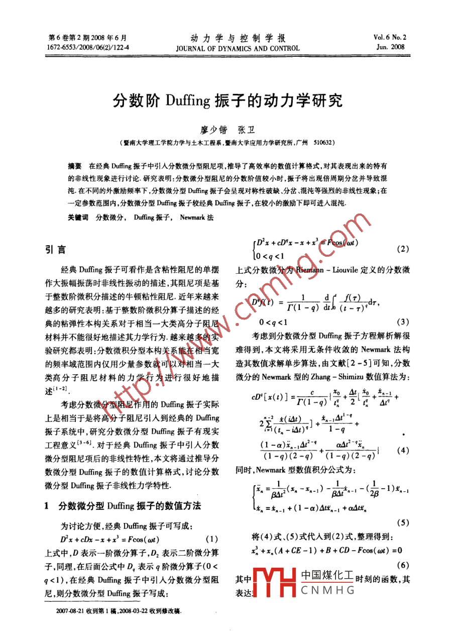 第6卷第2期2008年6月動(dòng)力學(xué)與控制學(xué)報(bào)Vol 6 No. 216726553/2008/0621224JOURNAL OF DYNAMICS AND CONTROLJun.2008分?jǐn)?shù)階 Duffing振子的動(dòng)力學(xué)研究廖少鍇張衛(wèi)(暨南大學(xué)理工學(xué)院力學(xué)與土木工程系,暨南大學(xué)應(yīng)用力學(xué)研究所,廣州510632)摘要在經(jīng)典 Duffing振子中引人分?jǐn)?shù)微分型阻尼項(xiàng)推導(dǎo)了高效率的數(shù)值計(jì)算格式,對(duì)其表現(xiàn)出來(lái)的特有的非線性現(xiàn)象進(jìn)行討論研究表明:分?jǐn)?shù)微分型阻尼的分?jǐn)?shù)階值較小時(shí)振子將出現(xiàn)倍周期分岔并導(dǎo)致混沌在不同的外激勵(lì)頻率下,分?jǐn)?shù)微分型 Duffing振子會(huì)呈現(xiàn)對(duì)稱(chēng)性破缺分岔混沌等強(qiáng)烈的非線性現(xiàn)象;在參數(shù)范圍內(nèi),分?jǐn)?shù)微分型 Duffing振子較經(jīng)典 Duffing振子,在較小的激勵(lì)下即可進(jìn)入混沌關(guān)鍵詞分?jǐn)?shù)微分, Duffing振子, Newmark法引言經(jīng)典 Duffing振子可看作是含粘性阻尼的單擺上式分?jǐn)?shù)微分為 Riemann- Liouville定義的分?jǐn)?shù)微作大振幅振蕩時(shí)非線性振動(dòng)的描述,其阻尼項(xiàng)是基分于整數(shù)階微積分描述的牛頓粘性阻尼.近年來(lái)越來(lái)Df(r)=dr(r-d越多的研究表明:基于整數(shù)階微積分算子描述的經(jīng)-g)dto(t-r)典的粘彈性本構(gòu)關(guān)系對(duì)于相當(dāng)一大類(lèi)高分子阻尼0