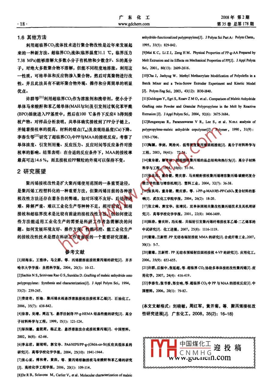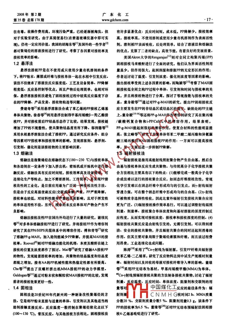 東化工2008年第2期16www.gdchem.com第35卷總第178期聚丙烯接枝改性研究進展劉曉敏,周紅軍,黃開菊,羅炎容,梁劍輝(仲愷農業(yè)技術學院化學與化工系,廣東廣州510000摘要]文章對聚丙烯(PP)接枝改性的幾種方法及其研究進展進行了綜述,其中包括溶液法接枝、懸浮法接枝、熔融法接枝、固相法接枝、輻射法接枝以及超臨界CO2法接枝等,并且對各種不同接枝方法的優(yōu)劣性進行了討論,指出固相法接枝和超臨界CO2法接枝是相對環(huán)保、實用的聚丙烯接枝改性方法。并且對聚丙烯接枝改性的發(fā)展方向進行了展望。[關鍵詞]聚丙烯;接枝;改性;進展Research Development on the Modification of Polypropylene by graftingLiu Xiaomin, Zhou Hongjun, Huang Kaiju, Luo Yanrong, Liang Jianhui(Department of Chemistry and ChemicalZhongkai University of Agriculture and Technology, Guangzhou 510000, China)Abstract: The paper reviewed the advances of a few methods in the polypropylene(PP)modification by grafting, the methodsincluding solvent graft, suspension graft, melt graft, solid phase graft, radiate graft and supercritical COz graft, the advantages of eachmethod were discussed as well. It was pointed out that the solid phase graft and supercritical Co2 graft methods were the relatively practicaland green methods. The coming development trends were discussedKeywords: polypropylene; grafting; modification; progress聚丙烯(PP)在五大通用樹脂中發(fā)展歷史最短、增長最快其酯、丙烯腈、丙烯酰胺、苯乙烯、甲基丙烯酸縮水甘油酯等PP具有良好的力學性能、電性能、化學性能等,且其價格低廉,接枝改性實施方法多樣,常用的有溶液法、懸浮法、熔融法故被廣泛應用于日常生活、工農業(yè)和軍事等許多領域。但由于固相法、輻射法及光引發(fā)法等。文章綜述了PP接枝改性方法的PP是典型的非極性聚合物,它的染色性、黏合性、抗靜電性以研究進展及與其他極性聚合物、無機填料的相容性差。這些不足限制了PP的應用。通過接枝改性可以賦予PP極性,從而改進它的1PP接枝改性方法及進展結性、油墨印刷性、涂飾性等,按枝后的PP可以用作PP與其1.1溶液法他極性聚合物共混的增容劑,也可以用作復合膜的熱溶膠等溶液法是接枝方法中應用最早的一種。PP溶液接枝法所采這樣就擴大了PP的用途。用的溶劑通常為甲苯、二甲苯或苯等有機物。該方法反應溫度PP接枝改性就是在PP分子中引入其他基團,既可賦予PP較低(100~-140℃,副反應少,產物純度高,PP降解程度低某些特殊功能,又能很好地保持P的優(yōu)異特性。用來接枝的單接枝中國煤化工的溶劑量大,需要蒸餾分體主要有馬來酸MA丙爆酸A及其廊甲基丙烯酸及離,4CNMHG燥。過程麻煩且溶劑往收稿日期]2007-10-24基金項目仲愷農業(yè)技術學院大學生創(chuàng)新基金資助項目作者簡介劉曉敏(1983),女,廣東增城人,學士,主要研究方向為高分子改性。串為聯系人:周紅軍2008年第2期廣東化工第35卷總第178期www.gdchem.com17往有毒,故操作費用高,環(huán)境污染嚴重,已經逐漸被淘汰。但有許多顯著優(yōu)點:反應時間短,成本低,PP降解少,接枝效率對于實驗室研究,由于其簡便易行(在普通玻璃儀器中即可實高,接枝率高,不使用溶劑或使用少量有機溶劑作為表面活性現),仍有一定應用價值。我國的胡海東等及國外的一些學者劑,溶劑被P表面吸收,后處理筒單,結合了溶液法和熔融法都對聚烯烴的溶液接枝進行了研究,考察了各因素對接枝率及的優(yōu)點,克服了二者的缺點,高效節(jié)能,有著良好的發(fā)展前景接枝效率的影響。美國Aon大學的 Rengarajan1則對全同立構聚丙烯(IPp12懸浮法固相接枝馬來酸酐進行了全面的研究,他們認為界面活性劑用懸浮法接枝P是在不使用或只使用少量有機溶劑的條件量雖少,但作用很大,起到潤濕和溶脹PP的無定形區(qū)的作用;下,將PP粉末、薄膜或纖維與接枝單體一起在水相中引發(fā)反應。作者還討論了溫度、引發(fā)劑濃度、催化劑濃度等因素的影響,該法不但繼承了溶液法反應溫度低、工藝及設備簡單、PP降解指出接枝率受到上述各因素的影響。而陶穎等考察了MAH程度低、反應易控制等優(yōu)點,而且產物后處理簡單,也相對環(huán)相接枝低全同立構PP過程中單體、引發(fā)劑和時間與接枝率的關保。懸浮溶脹接枝法避免了固相接枝過程中較高反應溫度下存系,并且將接枝物進行了分離,探討了等規(guī)指數與接枝率的關在的PP降解、產品發(fā)黃、接枝物粘連等問題系。童身毅等通過對 PP-g-MAH的研究,提出P固相接枝反費建奇等采用懸浮溶脹法合成了苯乙烯的P接枝乙烯基應主要發(fā)生在P的非結晶區(qū)或結晶區(qū)的微空、缺陷處的P主鏈單體共聚物,徐春等“利用懸浮法制得甲基丙烯酸B一羥乙酯接上。童身毅5等還將 PP-g-MAH作為增容劑研究了其在聚丙烯枝PP,并對接枝前后P結品形態(tài)作了比較,結果發(fā)現,按枝鏈碳酸鈣復合物和iPP/CaSO4中的增容作用,結果表明增加了P的不規(guī)整性,使共聚物結晶度有所下降。鄔潤德等 PP-g-MAH能起到很好的增容作用,使復合材料的性能明顯提采用水相懸浮溶脹法合成了接枝PP,通過研究反應條件、組分高。張立峰等研究了共聚單體鄰苯二甲酸二烯丙酯和異氰脲等因素對P接枝率和接枝效率的影響,發(fā)現溶脹劑、懸浮劑、酸三烯丙酯對MAH固相接枝PP的作用:一方面可以提高接枝引發(fā)劑、催化劑是該接枝物的主要影響因素率,另一方面還進一步