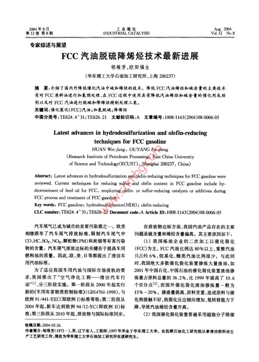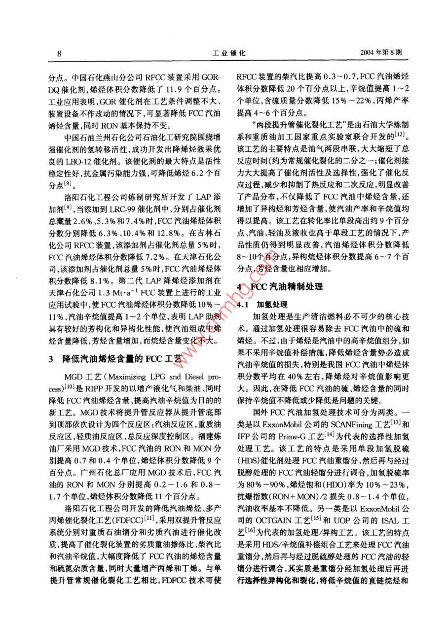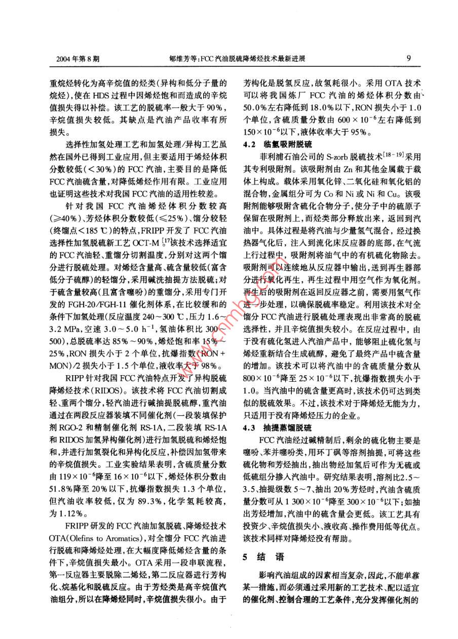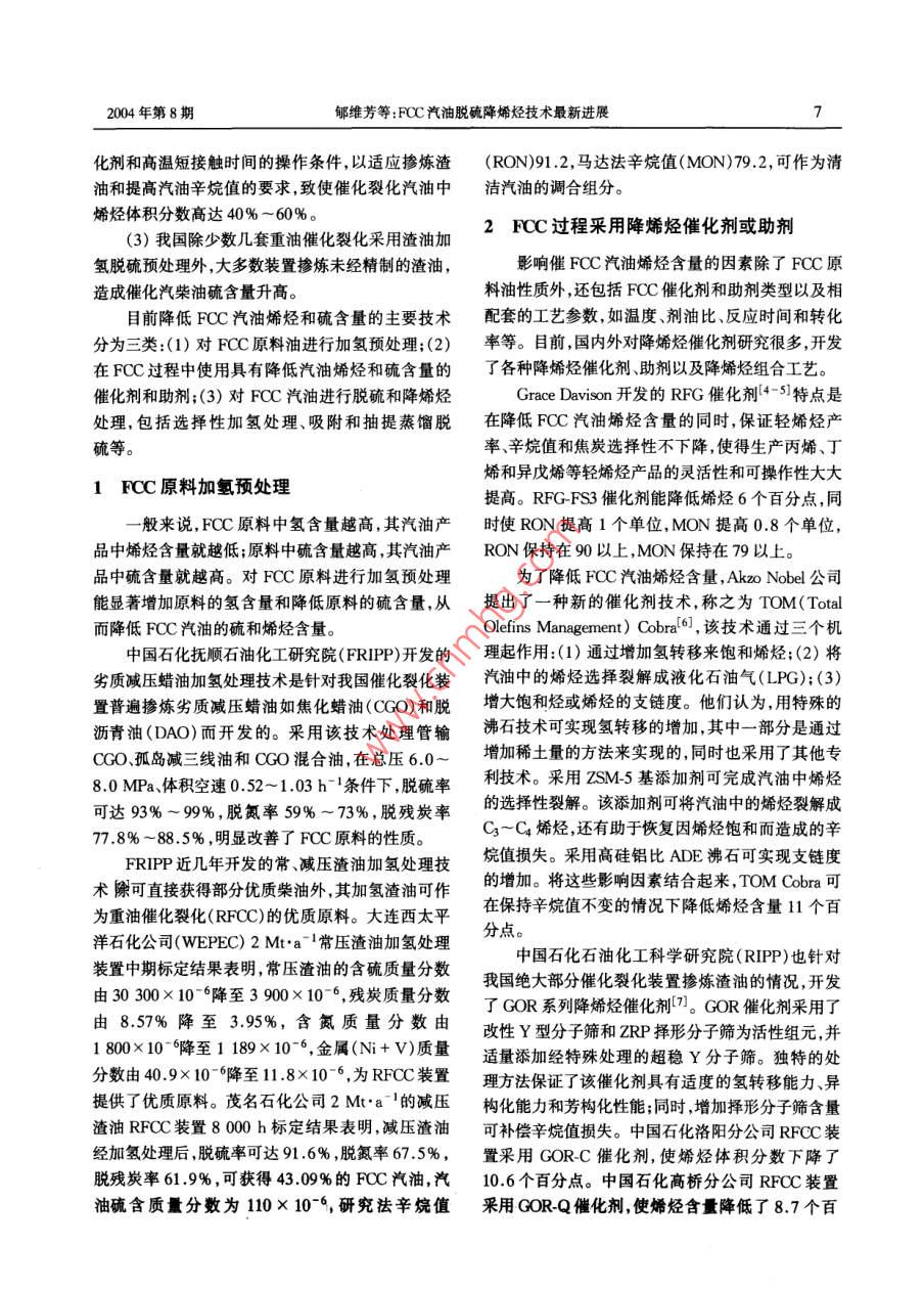 2004年8月工業(yè)催化第12卷第8期INDUSTRIAL CATALYSISVol.12" No.8專家綜述與展望FCC汽油脫硫降烯烴技術(shù)最新進展郇維芳,歐陽福生(華東理工大學石油加工研究所,上海200237)摘要:介紹了 國內(nèi)外降低催化汽油中硫和烯烴的技術(shù)。降低FCC汽油烯烴和硫含量的主要技術(shù)有對FCC原料油進行加氫預處理、在FCC過程中使用具有降低汽油烯烴和硫含量的催化劑或助劑以及對FCC汽油進行脫硫和降烯烴精制處理三類。關(guān)鍵詞:催化裂化(FCC)汽油;加氫脫硫;降烯烴中圖分類號:TE624.4*31;TE626.21文獻標識碼:A 文章編號 1008-1143(2004)8-0006-05Latest advances in hydrodesulfurization and olefin-reducingtechniques for FCC gasolineHUAN Wei-fang,OUYANG Fu-sheng(Research Institute of Petroleum Processing, East China Universityof Science and Technology(ECUST), Shanghai 200237, China)Abstract: Latest advances in hydrodesulfurization and olefin- reducing techniques for FCC gasoline werereviewed. Current techniques for reducing sulfur and olefin content in FCC gasoline include hy-drotreatment of feed oil for FCC, employing olefin- or sulfur reducing catalysts or additives duringFCC process and treatment of FCC gasoline.Key words: FCC gasoline; hydrodesulfurization(HDS); olefin- reducingCLC number: TE624.4+ 31;TE626. 21 Document code:A Article ID: 1008-1 143(2004 )08-0006-05汽車尾氣已成為城市的首要污染源之一一。歐美在排放物達標方面,我國汽油產(chǎn)品存在的主要相繼頒布了汽車尾氣排放標準,限制汽車尾氣中問題是硫含量和烯烴含量偏高。其主要原因如下:CO、HC、SOx .NOx顆粒物(PM)和炭煙等有害污染(1)我國煉油企業(yè)的二次加工以催化裂化物的含量。汽車尾氣排放達標的關(guān)鍵在于提高車用(FCC)為主,F(xiàn)CC汽油比例達80%以上,重整汽油,燃料油的質(zhì)量。因此,歐、美、日等都提出了清潔車只占約6% ,烷基化、醚類汽油比例很少。與此同用汽油標準。時,我國絕大多數(shù)催化裂化裝置摻煉大量渣油,如為了適應我國車用汽油與國際市場接軌的要2001年中國石化、中國石油的催化裂化裝置渣油摻求,我國推出了“空氣凈化工程一清 潔汽車行煉量占原料總量的36.2%,比1999年提高了10.6動”叫,分三階段實施。第- -階段從2000年起實行個百分點(2),而國外催化裂化渣油摻煉量-般為新的《車用有害物質(zhì)控制標準>(GB14761-1999),與15%~20%。摻渣量提高,原料變重,造成原料與催歐洲91/441/EEC(即歐洲I)標準等效;第二階段從化劑接觸不好,熱裂化反應傾向增加,氫轉(zhuǎn)移能力下2004年起,新車達到歐洲94/12/EC(即歐洲II)標降,導致汽油烯烴含量升高。準;第三階段從2010年起,排放物與國際標準同步。(2)我國催化裂化裝置普遍采用超穩(wěn)分子篩催收稿日期:200405-26作者簡介:郇維芳(1973 - ),男,遼寧省人,工程師,1997年畢業(yè)于華東理工大學。在撫順石油化工研究院從事清潔燃料油生產(chǎn)工藝研究工作,現(xiàn)在為華東理工大學石油加工研究所在讀研究生。2004年第8期郇維芳等: FCC汽油脫硫降烯烴技術(shù)最新進展7化劑和高溫短接觸時間的操作條件,以適應摻煉渣(RON)91 .2,馬達法辛烷值(MON)79.2,可作為清油和提高汽油辛烷值的要求,致使催化裂化汽油中潔汽油的調(diào)合組分。烯烴體積分數(shù)高達40% ~ 60%。(3)我國除少數(shù)幾套重油催化裂化采用渣油加2 FCC 過程采用降烯烴催化劑或助劑氫脫硫預處理外,大多數(shù)裝置摻煉未經(jīng)精制的渣油,影響催FCC汽油烯烴含量的因素除了FCC原造成催化汽柴油硫含量升高。料油性質(zhì)外,還包括FCC催化劑和助劑類型以及相目前降低FCC汽油烯烴和硫含量的主要技術(shù)配套的工藝參數(shù), 如溫度、劑油比、反應時間和轉(zhuǎn)化分為三類:(1)對FCC原料油進行加氫預處理;(2)率等。 目前,國內(nèi)外對降烯烴催化劑研究很多,開發(fā)在FCC過程中使用具有降低汽油烯烴和硫含量的了各種降烯烴催化劑、助劑以及降烯烴組合工藝。催化劑和助劑;(3)對FCC汽油進行脫硫和降烯烴Grace Davison開發(fā)的RFG催化劑[4-5]特點是處理,包括選擇性加氫處理、吸附和抽提蒸餾脫在降低FCC汽油烯烴含量的同時,保證輕烯烴產(chǎn)硫等。率、辛烷值和焦炭選擇性不下降,使得生產(chǎn)丙烯、丁烯和異戊烯等輕烯烴產(chǎn)品的靈活性和可操作性大大1 FCC 原料加氫預處理提高。RFG-FS3 催化劑能降低烯烴6個百分點,同-般來說,F(xiàn)CC原料中氫含量越高,其汽油產(chǎn)時使RON提高1個單位,MON提高0.8個單位,品中烯烴含量就越低;原料中硫含量越高,其汽油產(chǎn)RON保持在90以上,MON保持在79以上。品中硫含量就越高。對FCC原料進行加氫預處理為了降低FCC汽油烯烴含量,Akzo Nobel公司能顯著增加原料的氫含量和降低原料的硫含量,從提出了一種新的催化劑技術(shù),稱之為TOM(Total而降低FCC汽油的硫和烯烴含量。Olefins Managenent) Cobral ,該技術(shù)通過三個機中國石化撫順石油化工研究院(FRIPP)開發(fā)的理起作用:(1)通過增加氫轉(zhuǎn)移來飽和烯烴;(2)將劣質(zhì)減壓蠟油加氫處理技術(shù)是針對我國催化裂化裝汽油中的烯烴選擇裂解成液化石油氣(LPG);(3)置普遍摻煉劣質(zhì)減壓蠟油如焦化蠟油(CGO)和脫增大飽和烴或烯烴的支鏈度。他們認為,用特殊的瀝青油(DAO)而開發(fā)的。采用該技術(shù)處理管輸沸石技術(shù)可實現(xiàn)氫轉(zhuǎn)移的增加,其中一.部分是通過CGO、孤島減三線油和CGO混合油,在總壓6.0~增加稀土量的方法來實現(xiàn)