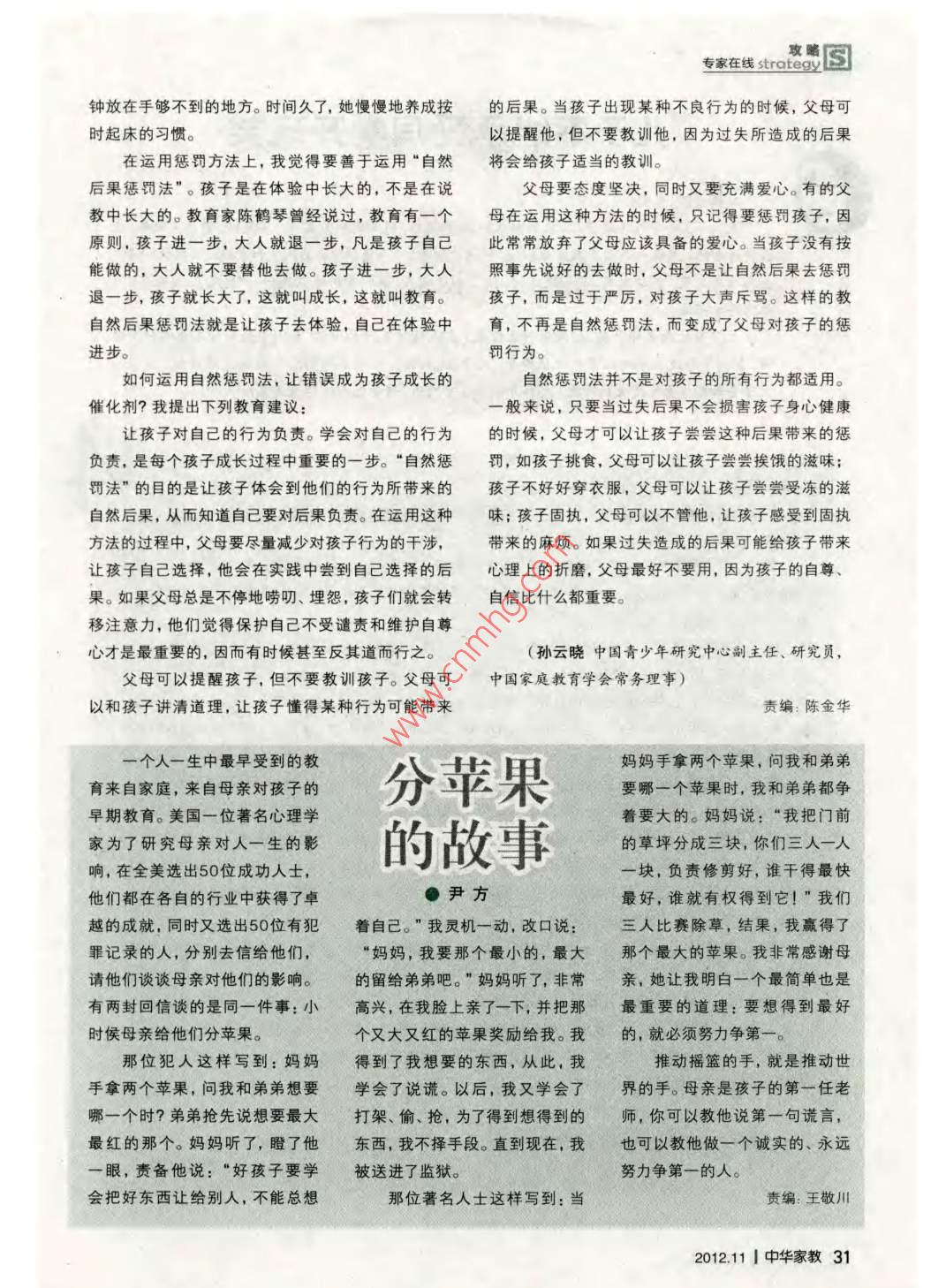 攻專家在線 strate圖鐘放在手夠不到的地方。時(shí)間久了,她慢慢地養(yǎng)成按的后果。當(dāng)孩子出現(xiàn)某種不良行為的時(shí)候,父母可時(shí)起床的習(xí)慣。以提醒他,但不要教訓(xùn)他,因?yàn)檫^失所造成的后果在運(yùn)用懲罰方法上,我覺得要善于運(yùn)用“自然將會給孩子適當(dāng)?shù)慕逃?xùn)。后果懲罰法”。孩子是在體驗(yàn)中長大的,不是在說父母要態(tài)度堅(jiān)決,同時(shí)又要充滿愛心。有的父教中長大的。教育家陳鶴琴曾經(jīng)說過,教育有一個(gè)母在運(yùn)用這種方法的時(shí)候,只記得要懲罰孩子,因原則,孩子進(jìn)一步,大人就退一步,凡是孩子自己此常常放棄了父母應(yīng)該具備的愛心。當(dāng)孩子沒有按能做的,大人就不要替他去做。孩子進(jìn)一步,大人照事先說好的去做時(shí),父母不是讓自然后果去懲罰退一步,孩子就長大了,這就叫成長,這就叫教育。孩子,而是過于嚴(yán)厲,對孩子大聲斥罵。這樣的教自然后果懲罰法就是讓孩子去體驗(yàn),自己在體驗(yàn)中育,不再是自然懲罰法,而變成了父母對孩子的懲進(jìn)步。罰行為。如何運(yùn)用自然懲罰法,讓錯(cuò)誤成為孩子成長的自然懲罰法并不是對孩子的所有行為都適用。催化劑?我提出下列教育建議般來說,只要當(dāng)過失后果不會損害孩子身心健康讓孩子對自己的行為負(fù)責(zé)。學(xué)會對自己的行為的時(shí)候,父母才可以讓孩子嘗嘗這種后果帶來的懲負(fù)責(zé),是每個(gè)孩子成長過程中重要的一步。“自然懲罰,如孩子挑食,父母可以讓孩子嘗嘗挨餓的滋味罰法”的目的是讓孩子體會到他們的行為所帶來的孩子不好好穿衣服,父母可以讓孩子嘗嘗受凍的滋自然后果,從而知道自己要對后果負(fù)責(zé)。在運(yùn)用這種味;孩子固執(zhí),父母可以不管他,讓孩子感受到固執(zhí)方法的過程中,父母要盡量減少對孩子行為的干涉,帶來的麻煩。如果過失造成的后果可能給孩子帶來讓孩子自己選擇,他會在實(shí)踐中嘗到自己選擇的后心理上的折磨,父母最好不要用,因?yàn)楹⒆拥淖宰鸸H绻改缚偸遣煌5貒Z叨、埋怨,孩子們就會轉(zhuǎn)自信比什么都重要。移注意力,他們覺得保護(hù)自己不受譴責(zé)和維護(hù)自尊心才是最重要的,因而有時(shí)候甚至反其道而行之。孫云曉中國青少年研究中心副主任、研究員父母可以提醒孩子,但不要教訓(xùn)孩子。父母可中國家庭教育學(xué)會常務(wù)理事)以和孩子講清道理,讓孩子懂得某種行為可能帶來責(zé)編:陳金華個(gè)人一生中最早受到的教媽媽手拿兩個(gè)蘋果,問我和弟弟育來自家庭,來自母親對孩子的分蘋果要哪一個(gè)蘋果時(shí),我和弟弟都爭早期教育。美國一位著名心理學(xué)著要大的。媽媽說:“我把門前家為了研究母親對人一生的影的草坪分成三塊,你們?nèi)艘蝗隧?在全美選出50位成功人士的故事塊,負(fù)責(zé)修剪好,誰干得最快他們都在各自的行業(yè)中獲得了卓●尹方最好,誰就有權(quán)得到它!”我們越的成就,同時(shí)又選出50位有犯著自己?!蔽异`機(jī)一動,改口說:三人比賽除草,結(jié)果,我贏得了罪記錄的人,分別去信給他們,“媽媽,我要那個(gè)最小的,最大那個(gè)最大的蘋果。我非常感謝母請他們談?wù)勀赣H對他們的影響。的留給弟弟吧?!眿寢屄犃?非常親,她讓我明白一個(gè)最簡單也是有兩封回信談的是同一件事:小高興,在我臉上親了一下,并把那最重要的道理:要想得到最好時(shí)侯母親給他們分蘋果。個(gè)又大又紅的蘋果獎(jiǎng)勵(lì)給我。我的,就必須努力爭第一那位犯人這樣寫到:媽媽得到了我想要的東西,從此,我推動搖籃的手,就是推動世手拿兩個(gè)蘋果,問我和弟弟想要學(xué)會了說謊。以后,我又學(xué)會了界的手。母親是孩子的第一任老哪一個(gè)時(shí)?弟弟搶先說想要最大打架、偷、搶,為了得到想得到的師,你可以教他說第一句謊言,最紅的那個(gè)。媽媽聽了,瞪了他東西,我不擇手段。直到現(xiàn)在,我也可以教他做一個(gè)誠實(shí)的、永遠(yuǎn)一眼,責(zé)備他說:“好孩子要學(xué)被送進(jìn)了監(jiān)獄。努力爭第一的人。會把好東西讓給別人,不能總想那位著名人士這樣寫到:當(dāng)責(zé)編:王敬川2012111中華家教31