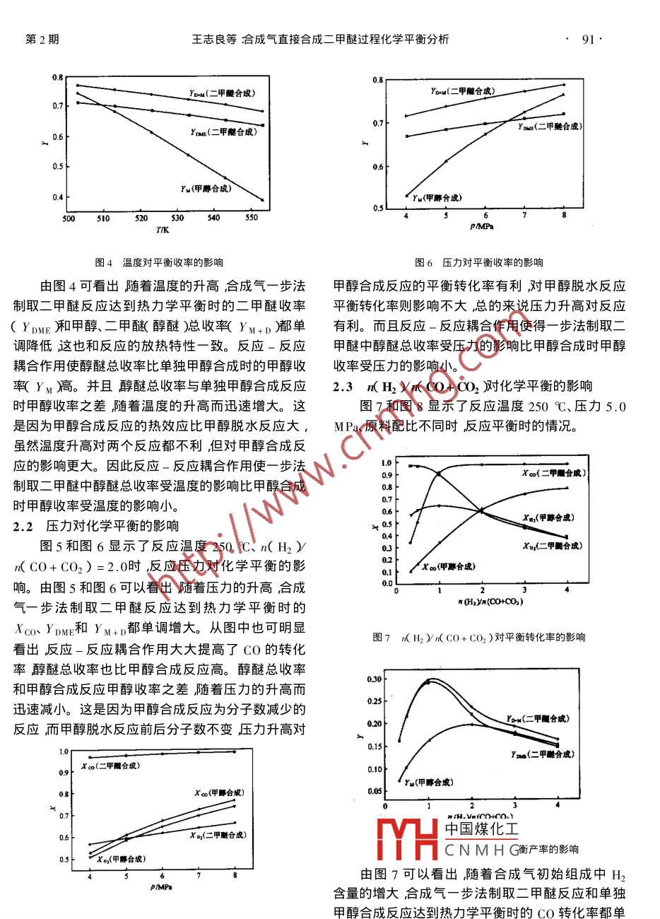 石油化工2002年第31卷第2期PETROCHEMICAL TECHNOLOGY合成氣直接合成二甲醚過程化學(xué)平衡分析王志良王金福刁杰韓明漢金涌清華大學(xué)化工系北京100084)摘要]選用合適的熱力學(xué)模型對合成氣直接合成二甲醚的反應(yīng)進行了化學(xué)平衡分析。主要考察了反應(yīng)溫度、壓力和原料組成等因素對化學(xué)平衡的影響。通過分析獲得了該過程更深入的反應(yīng)熱力學(xué)規(guī)律為二甲醚合成過程反應(yīng)器的模擬計算和研究開發(fā)提供了必要的理論依據(jù)。[關(guān)鍵詞]二甲醚洱醇合成氣北學(xué)平衡[文章編號]1000-81442002)2-0089-06中圖分類號]TQ223.24[文獻標識碼]A二甲醚是一種重要的清潔能源和環(huán)保產(chǎn)品由應(yīng)系統(tǒng)理想狀態(tài)下旳平衡常數(shù)可由或5川算。于其十六烷值高于柴油,且燃燒過程可實現(xiàn)低NOdIn K= In Kr-In Kr298 15 (5)和無硫排放,因此可作為柴油的理想替代燃料1-3J。二甲醚在低壓下壓縮為流體性質(zhì)與石油7△,H盒液化氣相近因此還可作為民用燃料以緩解我國石298.15R2d油液化氣與煤氣的不足451。它還可替代氟里昂用其中作氣霧劑、發(fā)泡劑且對臭氧層的破壞系數(shù)(ODP)為6~9]In Ko298△G215298.15R(6)由合成氣直接合成二甲醚由于反應(yīng)協(xié)同效應(yīng),G品2815=1AG濕285+1△G品M2815甲醇一經(jīng)生成馬上進行脫水反應(yīng)轉(zhuǎn)化成二甲醚突yA△GaA2915-yB△1GB298.15破了單純甲醇合成中的熱力學(xué)平衡限制增大了反應(yīng)推動力使CO轉(zhuǎn)化率較單純甲醇合成時大幅度理想氣體狀態(tài)的反應(yīng)熱或標準反應(yīng)熱△,H可提高。該法具有流程短、設(shè)備規(guī)模小、操作壓力低和以由恒壓熱容計算得到。CO單程轉(zhuǎn)化率高等特點,設(shè)備投資和操作費用大a-△,HR298△CdT(8)大減少生產(chǎn)成本較兩步法大大降低。本工作通過理論計算對合成氣直接合成二甲式8沖△,H2915為298,15K時的標準反應(yīng)醚過程的化學(xué)反應(yīng)平衡進行了較系統(tǒng)的研究和分熱即產(chǎn)物與反應(yīng)物于298,15K時的標準生成熱析獲得了一些必要的基礎(chǔ)數(shù)據(jù)和理論可用于二甲△HR:2985之差醚合成反應(yīng)器的模擬計算和研究開發(fā)?!?H298.15=∑v△H298.15(9)由標準反應(yīng)熱和恒壓熱容數(shù)據(jù)10-12,可計算化學(xué)反應(yīng)平衡常數(shù)的計算出理想氣體狀態(tài)的化學(xué)平衡常數(shù)K。文獻13-191步法合成二甲醚過程中采用甲醇合成和甲醇中也給出了一系列計算該反應(yīng)系統(tǒng)化學(xué)平衡常數(shù)的脫水兩類活性中心的復(fù)合催化劑。在復(fù)合催化劑關(guān)聯(lián)式上用醇合成反應(yīng)1水煤氣變換反應(yīng)2)甲醇脫為計算平衡組成還需知道組分的逸度系數(shù)水反應(yīng)(3扃同時進行由于組分i的逸度f等于分壓p1與逸度系數(shù)的CO+2H,+CH3OH(1)乘積即CO+H20FCO2+H2(2)中國煤化工(10)2CH3 OH CH3OCH3 +H2O則CNMHG可將以上方程寫成通式A+vBB(4)[收稿日期1201-03-29[修改稿日期12001-05-16[作者簡介]王志良(1971-)男河北省玉田縣人博士電話010式4)中A、B表示反應(yīng)物,L、M表示產(chǎn)物,A、vB62789041電郵 wangzu@263,net聯(lián)系人王金福電話010v1、M分別液物和產(chǎn)物的化學(xué)計量系數(shù)。該反62785464石油化工PETROCHEMICAL TECHNOLOG Y2002年第31卷中s M(PLy (PMyaA中B(PAy(PBy080PplsM y'LyM中∮驗值(513K各組分的逸度系數(shù)可由以下熱力學(xué)關(guān)系式結(jié)合狀態(tài)方程計算得到RTIny:=RT. Vdv=lu圖2壓力對平衡轉(zhuǎn)化率的影響T, V n[i]12)型進行理論計算與實驗結(jié)果吻合很好所以此后的宋維端等應(yīng)用 SHBWR狀態(tài)方程計算加壓模擬計算均選用Red的熱容數(shù)據(jù)和SRK方程的熱下甲醇合成的反應(yīng)熱和平衡常數(shù)計算結(jié)果精度較力學(xué)平衡模型高。但由于 SHBWR方程計算復(fù)雜所以較少采用。2反應(yīng)熱力學(xué)平衡趨勢分析在計算中通常使用Peng- Robinson PR方程2和Soave- Redlich- Kwon SRK方程21根據(jù)以上建立的化學(xué)反應(yīng)熱力學(xué)平衡模型汁計依據(jù)文獻1的熱力學(xué)數(shù)據(jù)分別采用PR和算了反應(yīng)溫度壓力和原料氣組成(包括n(H2SRK方程計算合成氣初始組成為n(H2yn(CO)m(CO+CO2)、CO2含量和H2O含量對二甲醚反n(CO2)=0.6670.3200/0.0133的反應(yīng)體系在應(yīng)體系化學(xué)平衡的影響。通過計算求得了反應(yīng)的250℃和5.0MPa條件下的平衡組成其結(jié)果如表平衡轉(zhuǎn)化率、收率和選擇性并將部分結(jié)果與相應(yīng)條1所示。表1中的數(shù)據(jù)表明對于二甲醚合成體系,件下甲醇合成時達到的平衡結(jié)果進行了對比。使用PR和SRK方程得到的計算結(jié)果基本一致。2.1溫度對化學(xué)平衡的影響在相應(yīng)的計算中本文均采用SRK方程。在反應(yīng)壓力為50MPan(H2)n(CO+CO2)表1PR方程和SRK方程計算結(jié)果比較=2.0即n(C0)n(CO2)=0.96/0.04的條件下,計算了反應(yīng)溫度對平衡轉(zhuǎn)化率和收率的影響結(jié)果組成yH、0yCH OH yPR方程0.26340.00770.03640.01830.1101如圖3和圖4所示。SRK方程0.27010,00850.03400.01690,1095在空速300ml(gh)nH2)n(CO+CO2)xc二甲合成)2.60的條件下按照文獻13-19提供的各種平衡常08卜x∞(甲酈合成〕數(shù)計算式及SRK方程對甲醇合成反應(yīng)體系進行模擬并與實驗結(jié)果進行比較如圖1和圖2所示。結(jié)x(二甲合成)果表明采用Rei的熱容數(shù)