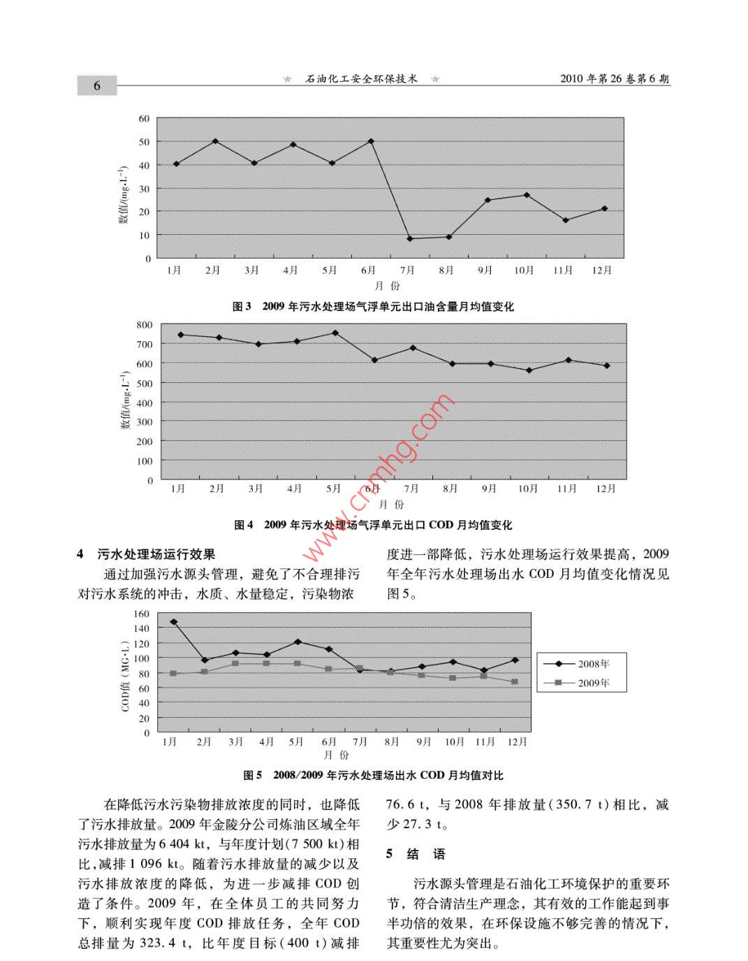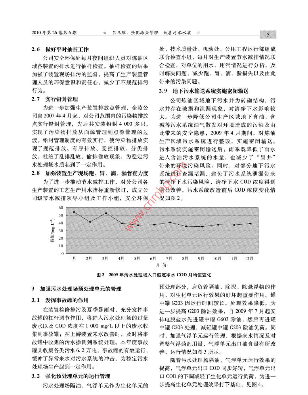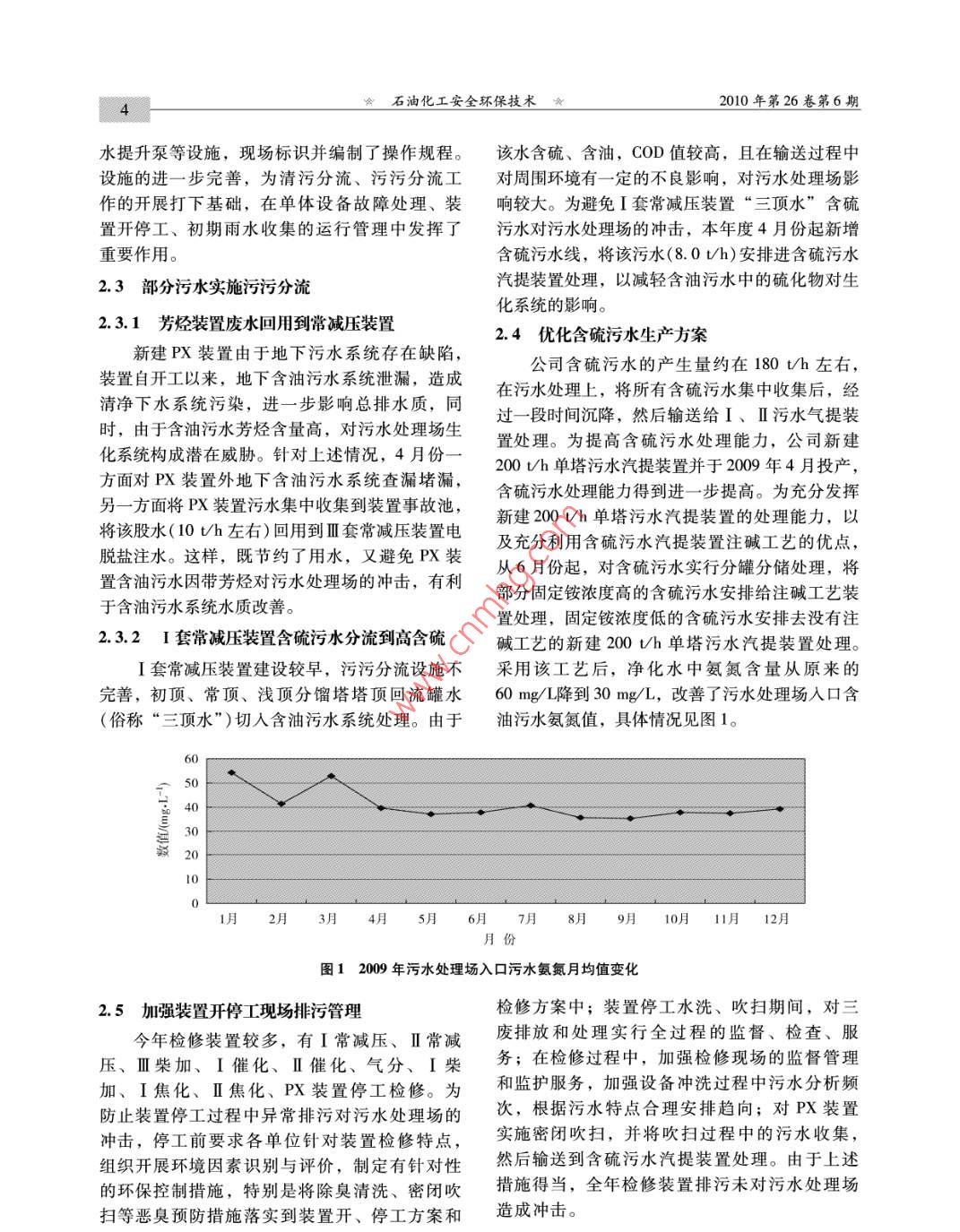 石油化工安全環(huán)保技術(shù)2010年第26卷第6期PETROCHEMICAL SAFETY AND ENVIRONMENTAL PROTECTION TECHNOLOGY清潔生產(chǎn)與綜合治理強(qiáng)化源頭管理改善污水水質(zhì)呂三雕(中國石油化工股份有限公司金陵分公司,江蘇南京210033)摘要: 金陵分公司通過加強(qiáng)煉油裝置污水源頭管理,避免了不合理排污對(duì)污水處理系統(tǒng)的沖擊,水質(zhì)、水量穩(wěn)定,污染物濃度進(jìn)一步降低,污水處理場運(yùn)行效率提高,為實(shí)現(xiàn)COD減排目標(biāo)創(chuàng)造了條件。關(guān)鍵詞:煉油廠;污水;管理; COD;減排金陵石化公司煉油廠建于上世紀(jì)五十年代,境監(jiān)測工作管理規(guī)定等二十五個(gè)管理制度,建立由于建廠時(shí)間較早,在環(huán)保設(shè)施上的投入相對(duì)不了相應(yīng)的檢查和考核制度,明確了各級(jí)環(huán)保責(zé)任足,環(huán)保設(shè)施技術(shù)含量相對(duì)較低,給企業(yè)的發(fā)展制。尤其在制度修訂中增加了對(duì)供應(yīng)商、承包商帶來困難。近年來,隨著企業(yè)加工能力的提高以以及“廠中廠”的環(huán)保管理規(guī)定。及原油的劣質(zhì)化,環(huán)保工作面臨的壓力越來越突2實(shí)施清污分流、污污分流管理制度出,做好污染物排放點(diǎn)源頭管理工作顯得異常重要。2009年,企業(yè)為了進(jìn)一一步 貫徹執(zhí)行集團(tuán)公司2.1完善 分級(jí)控制制度節(jié)水減排政策,在運(yùn)行好現(xiàn)有治理設(shè)施的基礎(chǔ)為進(jìn)- -步 推行清潔生產(chǎn),加強(qiáng)污水源頭管上,重點(diǎn)放在污水源頭管理,進(jìn)- 一步完善清污分理,確保污水處理場穩(wěn)定達(dá)標(biāo)排放,2009年年初流、污污分流制度,努力降低排放污水污染物濃結(jié)合中石化企業(yè)標(biāo)準(zhǔn)《煉化企業(yè)節(jié)水減排考核指度,為進(jìn)一步提高污水處理效果打下基礎(chǔ),實(shí)現(xiàn)標(biāo)與回用水質(zhì)控制指標(biāo)》以及江蘇省地方標(biāo)準(zhǔn)了COD減排目標(biāo)?!痘瘜W(xué)工業(yè)主要水污染物排放標(biāo)準(zhǔn)》相關(guān)要求,結(jié)合公司各生產(chǎn)裝置的實(shí)際生產(chǎn)情況,修訂了1建立完善的環(huán)保管理制度《廢水分級(jí)控制污染因子及水量排放指標(biāo)》,對(duì)各為了做好清潔生產(chǎn)和環(huán)境保護(hù)工作,保證公排污裝置含油污水、含硫污水、清凈下水、含堿司在生產(chǎn)、經(jīng)營、建設(shè)等活動(dòng)中,認(rèn)真貫徹執(zhí)行污水、電脫鹽水、中和水水量及主要污染因子排國家環(huán)境保護(hù)法律、規(guī)定、標(biāo)準(zhǔn),明確環(huán)境保護(hù)放濃度進(jìn)行了修訂,明確了生產(chǎn)裝置排放污水管管理職責(zé)、規(guī)范工作程序。2008 年7月起,公司.理的內(nèi)容和方向。安全環(huán)保處組織人員重新對(duì)2006年頒布的清潔生2.2完善清污分流、 污污分流設(shè)施產(chǎn)、環(huán)境保護(hù)制度進(jìn)行修訂和完善,逐步建立起為進(jìn)一步開展清污分流、污污分流工作,公司職能部門、運(yùn)行部職能科室、各運(yùn)行部工區(qū)分公司組織和各單位自行組織完善和新建了一的三級(jí)管理制度。本次制度的修訂著重在清潔生批排水系統(tǒng)清污分流(兼水體污染防控)圍堰、產(chǎn)和對(duì)生產(chǎn)全過程的控制,是在以往基礎(chǔ)上的增切換閥、截流閥、初期雨水(污水)收集池、污減、合并和完善、保持了環(huán)境保護(hù)制度的適用.性、有效性和完整性。整合后的內(nèi)容為清潔生產(chǎn)管理規(guī)定、環(huán)境保護(hù)工作管理規(guī)定、企業(yè)負(fù)責(zé)人收稿日期: 2010 -01 -07。環(huán)境保護(hù)責(zé)任制、建設(shè)項(xiàng)目環(huán)境保護(hù)管理規(guī)定、作者簡介:呂三雕,男,1993年畢業(yè)于南京化工學(xué)廢水排放環(huán)保管理規(guī)定、廢氣排放環(huán)保管理規(guī)校精細(xì)化工專業(yè),現(xiàn)在金陵石化安全環(huán)保處工作,定、固體廢物環(huán)保管理規(guī)定、噪聲管理規(guī)定、環(huán)工程師。電話: 025 -58980222石油化工安全環(huán)保技術(shù)★2010年第26卷第6期水提升泵等設(shè)施,現(xiàn)場標(biāo)識(shí)并編制了操作規(guī)程。該水含硫、含油,COD值較高,且在輸送過程中設(shè)施的進(jìn)-一步完善,為清污分流、污污分流工對(duì)周圍環(huán)境有--定的不良影響,對(duì)污水處理場影作的開展打下基礎(chǔ),在單體設(shè)備故障處理、裝響較大。為避免I套常減壓裝置“三頂水”含硫置開停工、初期雨水收集的運(yùn)行管理中發(fā)揮了污水對(duì)污水處理場的沖擊,本年度4月份起新增重要作用。含硫污水線,將該污水(8. 0 Vh)安排進(jìn)含硫污水2.3部分污水實(shí)施污污 分流汽提裝置處理,以減輕含油污水中的硫化物對(duì)生化系統(tǒng)的影響。2.3.1芳烴裝置廢 水回用到常減壓裝置2.4優(yōu)化含硫污水生產(chǎn)方案新建PX裝置由于地下污水系統(tǒng)存在缺陷,公司含硫污水的產(chǎn)生量約在180 t/h 左右,裝置自開工以來,地下含油污水系統(tǒng)泄漏,造成在污水處理上,將所有含硫污水集中收集后,經(jīng)清凈下水系統(tǒng)污染,進(jìn)一步影響總排水質(zhì),同過一段時(shí)間沉降,然后輸送給I、I污水氣提裝時(shí),由于含油污水芳烴含量高,對(duì)污水處理場生置處理。為提高