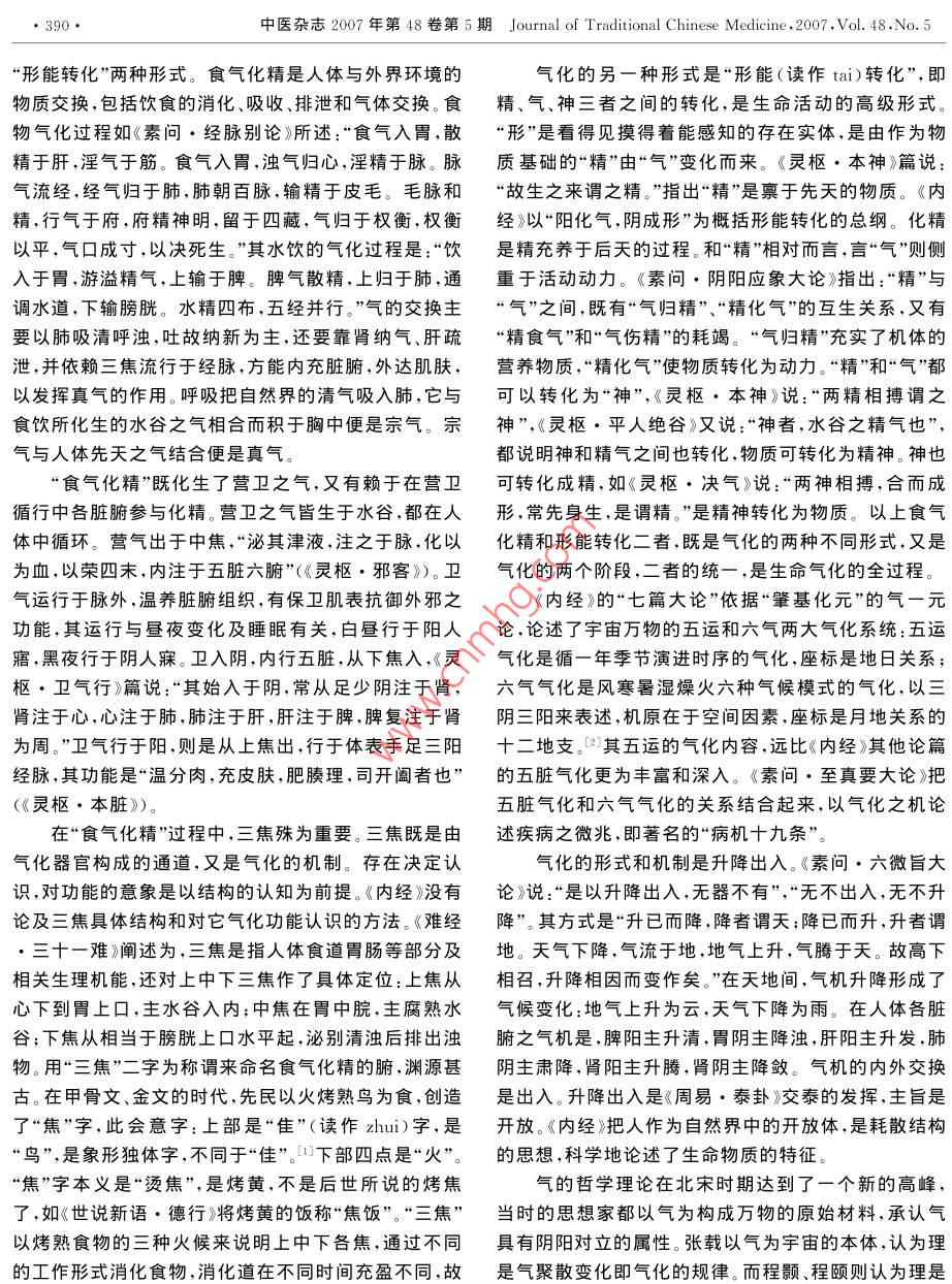 中醫(yī)雜志2007 年第48卷第5期Journal of Traditional Chinese Medicine ,2007 ,Vol.48,No. 5●389.●理論探討●論氣化學(xué)說(shuō)孟慶云(中國(guó)中醫(yī)科學(xué)院基礎(chǔ)理論研究所,北京市東直門(mén)內(nèi)南小街16號(hào),100700)[摘要]氣化學(xué)說(shuō)是以氣的運(yùn)動(dòng)變化來(lái)闡述人體代謝和精氣神轉(zhuǎn)化的理論。自《內(nèi)經(jīng)》>確立氣化概念并以升降出入為基本機(jī)制以后,劉完素以氣化論病機(jī)和藥性,張?jiān)匕l(fā)揮為氣化藥性論,李東垣以脾胃為氣化中樞,繼后孫. -奎把氣化原動(dòng)力歸于命門(mén),遂使氣化理論逐漸完善。氣化學(xué)說(shuō)不僅是辨證論治的指規(guī),也是構(gòu)建中藥藥理學(xué)的理論資源。[關(guān)鍵詞]氣化學(xué)說(shuō);中醫(yī)理論 ;氣化病氣化學(xué)說(shuō)是以氣的運(yùn)動(dòng)變化來(lái)論述人體生命過(guò)程據(jù)之一,以后進(jìn)一步發(fā)揮為氣化感應(yīng)論,之后的氣一元的理論。自從《內(nèi)經(jīng)》構(gòu)建其基本理論以來(lái),后世不斷發(fā)論認(rèn)為,人與自然皆由氣構(gòu)成的同一性,可以由天地之展補(bǔ)充。在晚期匯入《內(nèi)經(jīng)》的“七篇大論”中,氣化概念氣應(yīng)象人體。古人觀測(cè)到天地之運(yùn)動(dòng)是“天左旋,地右更為寬泛,認(rèn)為宇宙萬(wàn)物“各從其氣化也”(《素問(wèn)●氣動(dòng)”《春秋緯●元命苞》),《內(nèi)經(jīng)》又以左升右降為宇宙交變大論》,以氣化為一切自然現(xiàn)象的根本特征,升降氣化的一般規(guī)律,《素問(wèn)●陰陽(yáng)應(yīng)象大論》所謂“左右出入為基本機(jī)制;金元時(shí)代的劉河間,以氣化論病機(jī)和者,陰陽(yáng)之道路也”論臟腑氣化升發(fā)則是“肝生于左,肺藥性,張?jiān)匾蔡岢隽藲饣幮哉?李東垣以脾胃為人藏 于右”《素問(wèn)●刺禁論》),自然界之升降是“清陽(yáng)為體氣化中樞,以少陽(yáng)之氣為啟動(dòng)氣化之先機(jī),創(chuàng)立脾胃天.濁陰為地”,人體則是“清陽(yáng)出上竅,濁陰出下竅”。論,為一些疾病的治療提供了新思路、新方法;明代孫《內(nèi)經(jīng)》中還有 重要的定則,把《素問(wèn)●六微旨大論》提一奎把人身氣化的原動(dòng)力歸于命門(mén),創(chuàng)動(dòng)氣命門(mén)學(xué)說(shuō)。出的“亢害承制論”,作為人體自我調(diào)節(jié)機(jī)制,并非來(lái)自由是而使氣化學(xué)說(shuō)日趨系統(tǒng)完善,成為指導(dǎo)辨證論治人體實(shí)驗(yàn),而是從氣象的氣化規(guī)律推演到人體的。的重要理論。觀念可以開(kāi)發(fā)知覺(jué),古人在氣化意識(shí)的觀察中積1氣化學(xué)說(shuō) 的理論淵源累了自然與生命的氣化現(xiàn)象,例如在一年四季中,人和《內(nèi)經(jīng)》氣化理論有三個(gè)來(lái)源:一是關(guān)于先秦氣論動(dòng)植物都有生、長(zhǎng)、化、收、藏之化之變。除在歸納中發(fā)的哲學(xué)思想;二是天人相應(yīng)的觀念;三是在此二者理念現(xiàn)聯(lián)系之外,又從外而推測(cè)其內(nèi),從內(nèi)而推遠(yuǎn)外,即《靈下對(duì)觀察和實(shí)踐資料的整理提升。樞●外揣》之“若是則內(nèi)外相襲,若鼓之應(yīng)桴,響之應(yīng)氣是中國(guó)古代哲學(xué)的一個(gè)重要概念。先秦諸子百聲,影之似形。故遠(yuǎn)者司外揣內(nèi),近者司內(nèi)揣外。”由以家皆言氣。《左傳》論“六氣”,《國(guó)語(yǔ)>言天地陰陽(yáng)之氣,此 建立了氣化理論的研究方法。氣已經(jīng)是一個(gè)涵蓋自然、社會(huì)和人生的普遍概念?!豆苡缮鲜隼砺?、觀念和方法論構(gòu)建起來(lái)的氣化學(xué)說(shuō),子》的精氣根源論,《鸚冠子》的元?dú)庾匀徽?皆以氣為.也必與之相因,氣化學(xué)說(shuō)的特色有四:一是重視時(shí)間因人和萬(wàn)物之本體。自稱(chēng)老子弟子的文子在所著《文子●素,氣化是一個(gè)過(guò)程,漸變?yōu)榛?,劇化為?在生命世界下德》篇說(shuō):“陰陽(yáng)陶也,萬(wàn)物乘一氣而生。”《莊子●知中,氣化的生命過(guò)程是不可逆的,故《內(nèi)經(jīng)》兩次論及北游》以氣的變化論生命的發(fā)生:“雜乎芒芴之間而有“神轉(zhuǎn)不回”;二是氣化規(guī)律的普適性,認(rèn)為天人一體皆氣,氣變而有形,形變而有生?!薄盾髯印酚诌M(jìn)一步發(fā)展從氣化,例如《素問(wèn)●陰陽(yáng)應(yīng)象大論》所論的“形歸氣,為:“人有氣,有生,有知,亦有義,故為天下貴也?!闭f(shuō)人氣歸精,精歸化”既是食物、藥物在人體氣化的規(guī)律,也的生命就是由于氣而生發(fā),由構(gòu)成論發(fā)展為生成論。是人的高級(jí)生命活動(dòng)生長(zhǎng)發(fā)育的規(guī)律,乃至自然界的人與天地相應(yīng)是氣化理論的意象依據(jù),也是氣化.規(guī)律;三是認(rèn)識(shí)方法的惟象的特征,氣化理論不是來(lái)自學(xué)說(shuō)闡述的規(guī)律之一。遠(yuǎn)古以降從事農(nóng)牧業(yè)的先民們,解剖的分析 ,而是依“象”的認(rèn)知方式推揣而來(lái);四是觀觀察作物及人的生長(zhǎng),和一年春夏秋冬時(shí)序的關(guān)系,萌察推理始終貫穿著動(dòng)態(tài)觀念,以此“氣化流行,生生不:育了“貴時(shí)”觀念?!兑讉鳌裣蟆窆?jié)卦》有“天地節(jié)而四時(shí)息”。這也與《易傳●系辭》“以動(dòng)尚其變”和《易緯》“元成”之