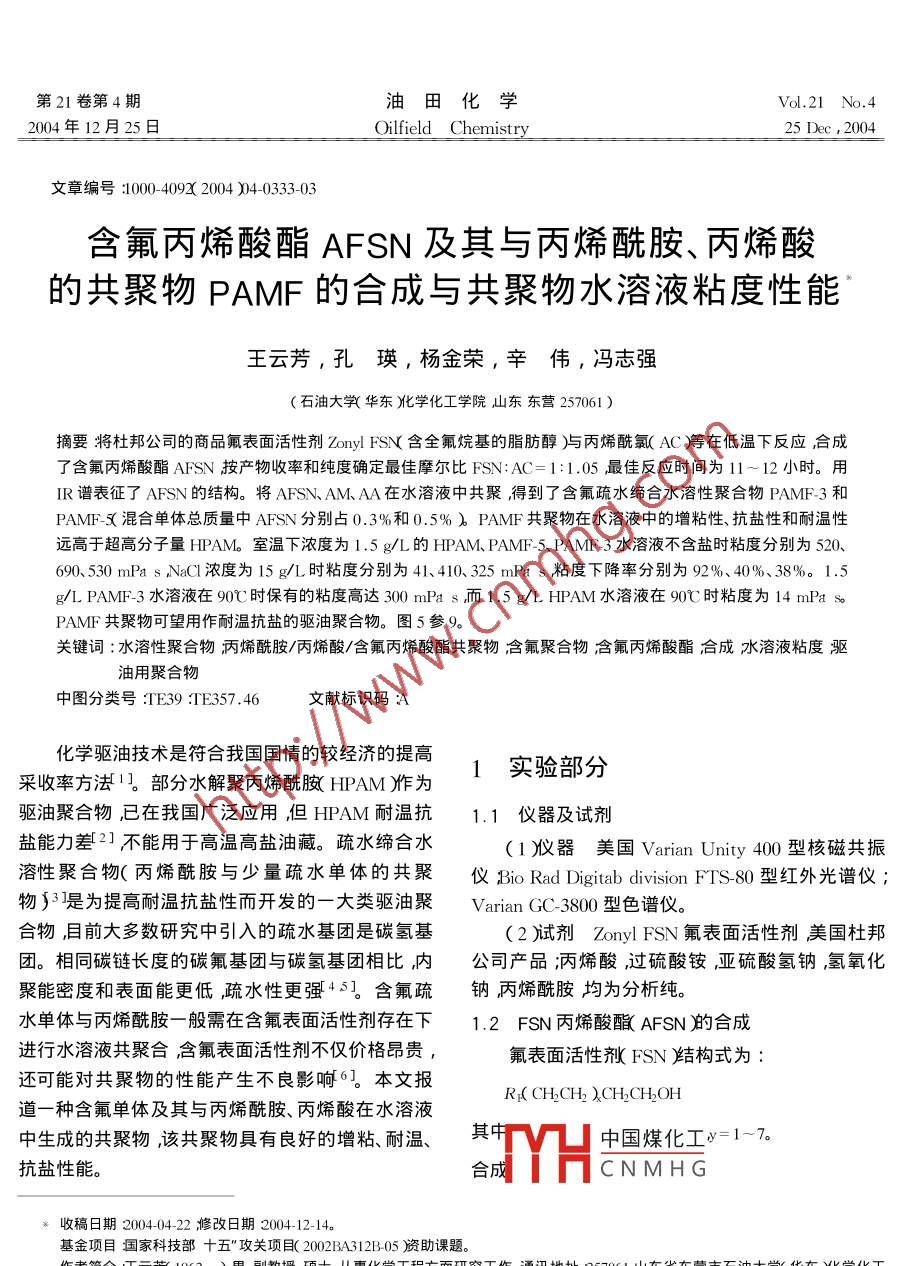 含氟丙烯酸酯AFSN及其與丙烯酰胺、丙烯酸的共聚物PAMF的合成與共聚物水溶液粘度性能