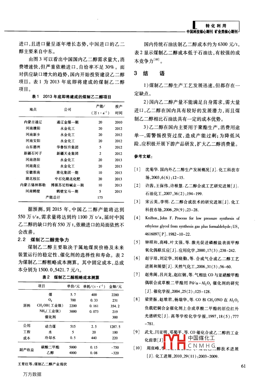 轉(zhuǎn)化利用國科技核心期刊礦業(yè)類核心期刊媒制乙二醇產(chǎn)業(yè)現(xiàn)狀王育紅,谷小虎(中國平煤神馬能源化工研究院,河南平頂山467000)摘要:乙二醇是一種重要的有機(jī)化工原料,主要以石油為原料進(jìn)行生產(chǎn)。中國特殊的能源結(jié)構(gòu)使煤制乙二醇研究熱度日益高漲。闡述了3種煤制乙二醇工藝路線及優(yōu)缺點(diǎn),詳細(xì)介紹了C0催化偶聯(lián)法制乙二醇生產(chǎn)技術(shù)。通過分析國內(nèi)乙二醇的供需形勢、投資建設(shè)情況,認(rèn)為煤制乙二醇擁有成本優(yōu)勢,具有一定的競爭力,但不可盲目開發(fā)投資,謹(jǐn)防產(chǎn)能過剩,且仍需開拓下游產(chǎn)品,拓寬利用途徑,抵抗市場風(fēng)險(xiǎn)。關(guān)鍵詞:煤;乙二醇;工藝技術(shù);產(chǎn)業(yè)化中圖分類號(hào):TQ223;TD849文獻(xiàn)標(biāo)識(shí)碼:A文章編號(hào):1006-6772(2013)06-0059-03Status and development of synthesis of ethylene glycol from coalWANG Yuhong, GU XiaohuChina Pingmei Shenma Group Research Institute of Energy and Chemical, Pingdingshan 467000, China)Abstract: Ethylene glycol is an important organic raw material for chemistry industry. It's mainly developed fromtroleum.Limited by the energy structure in China, the research of coal to ethylene glycol become urgent. Introduceseveral main coal to ethylene glycol processes and their merits and demerits. Detail co catalytic coupling methodas well as domestic ethylene glycol supply and demand situation, investment status. The results show that, coalto ethylene glycol industry has cost advantage. To prevent overcapacity, the investment should be intelligent. Thedevelopment of downstream products is also important, whichto resist riskKey words: coal; ethylene glycol; technology industrialization0引言2009—2013年掀起了建設(shè)高潮。本文介紹了煤制乙二醇生產(chǎn)工藝及優(yōu)缺點(diǎn),認(rèn)為開展煤制乙二醇技乙二醇(EG)是一種重要的石油化工基礎(chǔ)有機(jī)原術(shù)研究十分必要,但在技術(shù)完全成熟前需控制生產(chǎn)料,又名甘醇、亞乙基二醇分子式為HOCH2CH2OH,規(guī)模。是無色透明、稍帶甜味的黏稠液體。乙二醇是最簡單和最重要的脂肪族二元醇,主要用于生產(chǎn)聚酯和1煤制乙二醇工藝各類抗凍劑,前者用于制造纖維、薄膜和聚對苯二以煤為原料制取乙二醇,主要有3種工藝,3種甲酸乙二醇酯(PET)樹脂;其它用途則包括解凍液、工藝最初的步驟均為采用煤氣化技術(shù)制取合成氣表面涂層、照像顯影液、水力制動(dòng)用液體以及油墨(CO+H2)。等行業(yè)。高純乙二醇可用做過硼酸銨的溶劑和介1)由合成氣一步直接合成乙二醇。其化學(xué)反質(zhì),還可用于生產(chǎn)特種溶劑乙二醇醚3)。應(yīng)方程式為面對乙二醇對外需求度過高的現(xiàn)狀,國內(nèi)在2CO+3H2一→HOCH2CH2OH收稿日期:2013-07-08責(zé)任編輯:宮在芹基金項(xiàng)目:河南省重大科技專項(xiàng)(0030700)H中國煤化工作者簡介:王育紅(1968),女河南平頂山人,高級(jí)工程師,畢業(yè)于安徽工業(yè)大學(xué),主要從事CNMHGuQ163. com引用格式:王育紅,谷小虎煤制乙二醇產(chǎn)業(yè)現(xiàn)狀[潔凈媒技術(shù),2013,19(6):59-61王育紅等:煤制乙二醇產(chǎn)業(yè)現(xiàn)狀轉(zhuǎn)化利用此反應(yīng)條件要求苛刻需要催化劑和高溫高壓其含量為CO為25%-90%,亞硝酸酯為5%-40%條件。催化劑的選擇是該工藝的關(guān)鍵43。Al2O3作為載體的鈀催化劑。2)由合成氣生產(chǎn)甲醇,再由甲醇制乙烯,乙烯3)尾氣再生。將分離了草酸酯的反應(yīng)尾氣導(dǎo)氧化得環(huán)氧乙烷,最后由環(huán)氧乙烷水合法制乙二入再生塔,按NO與O2物質(zhì)的量比為41:6.5,配入醇。煤制烯烴已建成多個(gè)示范裝置,其中神華包頭氧氣氧化,按醇與NO的物質(zhì)的量比為2~6送入公司已經(jīng)取得商業(yè)化成功,乙烯制乙二醇工藝和石20%以上的醇水溶液接觸反應(yīng)油法制乙二醇都是成熟完善的技術(shù),但缺點(diǎn)是流程4)亞硝酸酯的回收。長且甲醇制乙烯過程中還會(huì)產(chǎn)生丙烯。5)非反應(yīng)氣體的排放。3)合成氣中的CO催化偶聯(lián)合成草酸二甲酯,圖2為( COOCH3)2的生產(chǎn)流程。草酸二甲酯加氫生成乙二醇。圖1為其工藝流程。CO凈化co度氫草酸二甲酯產(chǎn)品亞硝酸甲酯CO草酸酯圖2( COOCH)2生產(chǎn)流程煤「合成氣精餾以上3種工藝中,第1種為最簡單、直接和有效H2聚酯級(jí)的途徑,即使反應(yīng)選擇性和轉(zhuǎn)化率較低,也具有很大的實(shí)際應(yīng)用價(jià)值,但反應(yīng)條件要求苛刻;直接法圖1co催化偶聯(lián)法制乙二醇工藝2013年尚不能實(shí)現(xiàn)工業(yè)化,如果能有突破,使反應(yīng)第1步為CO與CH2ONO在催化劑的作用下,在較溫和的條件下進(jìn)行,將非常有競爭力。第2種反應(yīng)生成(C0CH13)2和NO,偶聯(lián)反應(yīng)方程式為工藝,流程較長,且甲醇生產(chǎn)乙烯過程中還會(huì)生成2C0+2CH2ONO—→( COOCH3)2+2NO丙烯,能耗較高。第3種方法是最先實(shí)現(xiàn)工業(yè)化的第2步為偶聯(lián)反應(yīng)生成的NO與CH3OH和O2煤制乙二醇路線,但草酸酯加氫催化劑的穩(wěn)定性反應(yīng)生成CH2ONO,反應(yīng)方程式為差,壽命較短;DMo加氫時(shí)氫氣循環(huán)量大、能耗高;2NO+2CH,OH+1/202 -+2CH,3 ONO+H2O產(chǎn)品雜質(zhì)多,精餾效率低;單系列的規(guī)模能力偏低生成的CH3ONO返回偶聯(lián)過程循環(huán)使用。總需多套并聯(lián)運(yùn)行9反應(yīng)