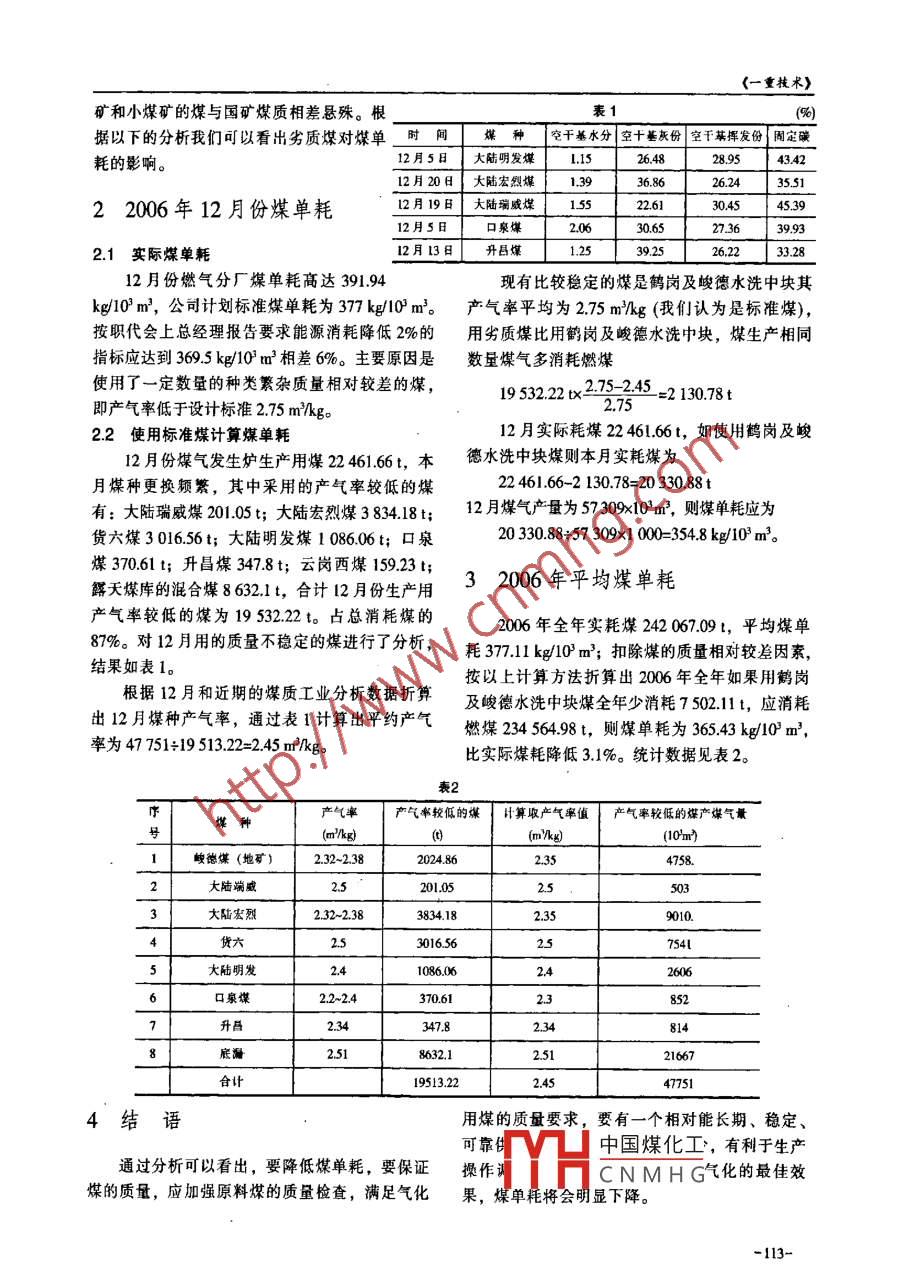 2007年第4期(總118期}煤的產(chǎn)氣率對(duì)煤?jiǎn)魏牡挠绊戫n秀麗,孫魁2(1.黑龍江第一重工股份有限公司燃?xì)夥謴S工程師,黑龍江富拉爾基161042; 2. 黑龍江第一重工股份有限公司燃?xì)夥諭~助理工程師,熙龍江。富拉爾基161042)摘要:優(yōu)質(zhì)燃煤用于氣化生產(chǎn)。煤的產(chǎn)氣率將提商。煤?jiǎn)魏穆狅@降低。關(guān)鍵詞:產(chǎn)氣率;煤氣產(chǎn)量;煤?jiǎn)魏?中圖分類號(hào): TQ545文獻(xiàn)標(biāo)識(shí)碼: B文章編號(hào): 1673-3355 (2007) 04-0061-020燃?xì)夥謴S是向全公司熱加T單位供應(yīng)煤氣的氣化生產(chǎn)、煤的產(chǎn)氣率就高,煤?jiǎn)魏木偷?。因部門,現(xiàn)有20臺(tái)3AA-13型煤氣發(fā)生爐。發(fā)生此, 選報(bào)適合的煤種用于氣化對(duì)于提高煤氣質(zhì)爐煤氣可以用各種不同的尉粘結(jié)性煙煤來制取。量,降低煤?jiǎn)魏氖欠浅S幸饬x的。原設(shè)計(jì)最大瞬時(shí)煤氣流量為11.5xI0* m/h。隨眷集團(tuán)公司總產(chǎn)值的增加,煤氣需求鼂逐年上升,1煤氣生產(chǎn)現(xiàn)狀現(xiàn)在瞬時(shí)流量有時(shí)在11.5x104 m/h還滿足不了熱加工生產(chǎn)的需要。在現(xiàn)有的發(fā)生爐臺(tái)數(shù)和現(xiàn)有的2006年生產(chǎn)煤氣的年產(chǎn)量是64.19x10*x10工藝操作水平基礎(chǔ)上耍提高煤氣產(chǎn)量就必須改善.m',耗煤24.21x10*t,平均每天用煤近700t。隨煤質(zhì),通過對(duì)以往的煤氣生產(chǎn)用煤的不同種類,若煤氣產(chǎn)量的增加,燃料煤的消耗也在逐年增對(duì)煤氣產(chǎn)量影響的情況來看,燃煤質(zhì)量好,用于加。由于煤炭資源緊張,供應(yīng)部門采購(gòu)難度比較大,造成燃料煤的來源比較復(fù)雜,同一產(chǎn)地的地了巨大的經(jīng)濟(jì)效益。們有快速的質(zhì)量反饋系統(tǒng),發(fā)現(xiàn)問題立即整改。3.2:提高使用壽命降低材料消耗在鍛造上減少余量,一-級(jí)品率得到提高。水壓機(jī)股份公司在加強(qiáng)對(duì)耐火材料、煉鋼輔助材料分口2006年頭5個(gè)月,與2005年相比,一級(jí)品的質(zhì)量管理,提高爐體使用壽命,降低耐火材宰平均提高了4.1%,不良品率下降1.3%。料、煉鋼輔助材料的消耗等方面取得了顯著的成績(jī)。”據(jù)財(cái)務(wù)統(tǒng)計(jì),1~5月份,輔助材料采購(gòu)資金4.結(jié)語(yǔ)累計(jì)降低540萬(wàn)元;其中耐火材料采購(gòu)資金降低質(zhì)量和成本是企業(yè)永恒的主題,質(zhì)量成本工340萬(wàn)元。最為明顯的是80t電爐的爐體壽命提高了一.作是一項(xiàng)長(zhǎng)期而艱苦的工作,需要從基礎(chǔ)抓起,倍,最高壽命達(dá)到107爐;中間包包底壽命由原多年的實(shí)踐經(jīng)驗(yàn)告訴我們,若要全方位地提高產(chǎn)來的3爐提高到8爐;帽口由原來的1.5爐提高品質(zhì)量,必須從基礎(chǔ)工作抓起,沒有一個(gè)好的基礎(chǔ),只能是“按下葫蘆起來瓢”,貧于應(yīng)付,很到3.1爐,取得了顯著的效果。0難作到集團(tuán)公司整體水平的提高。,但是基礎(chǔ)工作3.3.提高優(yōu)極品率保證產(chǎn)品質(zhì)量”:降低成本不能以犧牲質(zhì)量為代價(jià)。如果采取的提高需要時(shí)間,我們希望在近-兩年內(nèi),在集中國(guó)煤化工努力,我們能夠的措施發(fā)現(xiàn)與質(zhì)量有沖突,我們堅(jiān)決保質(zhì)量。我MYHCN M H G上一個(gè)新臺(tái)階?!笔崭迦掌? 2007-04-26; 修回日期: 2007-05-20-112-《一重技術(shù)》礦和小煤礦的煤與國(guó)礦煤質(zhì)相差懸殊。根表1(%)據(jù)以下的分析我們可以看出劣質(zhì)煤對(duì)煤?jiǎn)蝊時(shí)間煤種空干基水分空十基灰份空干基揮發(fā)份I周定碳耗的影響。12月5日大陸明發(fā)煤L.1526.4828.9543.4212月20日大陸宏烈煤1.3936.8626.2435.512.2006年12月份煤?jiǎn)魏?2月19日大陸瑞戚煤1.5522.6130.4545.39口泉煤2.0630.6527.3639.932.1 實(shí)際煤?jiǎn)魏?12月13日升縣煤1.2539.2526.2233.2812月份燃?xì)夥謴S煤?jiǎn)魏母哌_(dá)391.94現(xiàn)有比較穩(wěn)定的煤是鶴崗及峻德水洗中塊其kg/10' m',公司計(jì)劃標(biāo)準(zhǔn)煤?jiǎn)魏臑?77 kg/10 m'。產(chǎn)氣率平均為2.75 m2/kg (我們認(rèn)為是標(biāo)準(zhǔn)煤),按職代會(huì)上總經(jīng)理報(bào)告要求能源消耗降低2%的用劣質(zhì)煤比用鶴崗及峻德水洗中塊,煤生產(chǎn)相同指標(biāo)應(yīng)達(dá)到369.5 kg/10 m2相差6%。主要原因是數(shù)量煤氣多消耗燃煤使用了一定數(shù)量的種類繁雜質(zhì)量相對(duì)較差的煤,19 532.22 x2.75-2.45-=2 130.78t即產(chǎn)氣率低于設(shè)計(jì)標(biāo)準(zhǔn)2.75 m2/kg。2.752.2 使用標(biāo)準(zhǔn)煤計(jì)算煤?jiǎn)魏?2月實(shí)際耗煤22 461.66t,如使用鶴崗及峻12月份煤氣發(fā)生爐生產(chǎn)用煤22 461.66t,本德水洗中塊煤則本月實(shí)耗煤為月煤種更換顏繁,其中采用的產(chǎn)氣率較低的煤22 461.66-2 130.78=20 330.88t有:大陸瑞威煤201.05 t;大陸宏烈煤3 834.18t;12月煤氣產(chǎn)量為57 309x10*m',則煤?jiǎn)魏膽?yīng)為貨六煤3016.56t;大陸明發(fā)煤1 086.06t;口泉20 330.88+57 309x1 000 :354.8 kg/10 m'。煤370.61t;升昌煤347.8t;云崗西煤159.23 t; .3 2006年平均煤?jiǎn)魏酿偺烀簬?kù)的混合煤8632.1t,合計(jì)12月份生產(chǎn)用產(chǎn)氣率較低的煤為19532.22t。占總消牦煤的2006年全年實(shí)耗煤242 067.09t,平均煤?jiǎn)?7%。對(duì)12月用的質(zhì)量不穩(wěn)定的煤進(jìn)行了分析,耗377.11 kg/10 m';扣除煤的質(zhì)量相對(duì)較差因索,結(jié)果如表