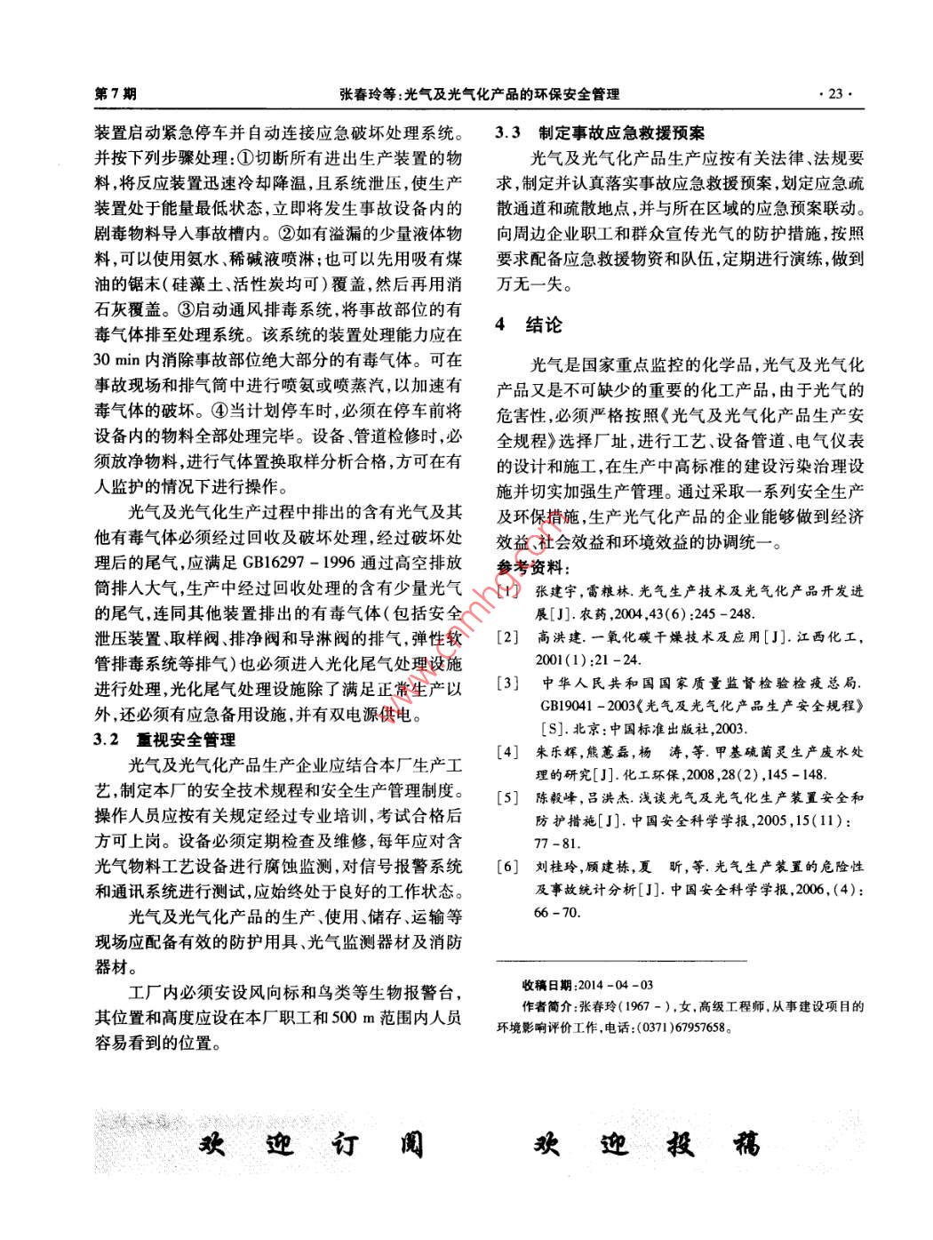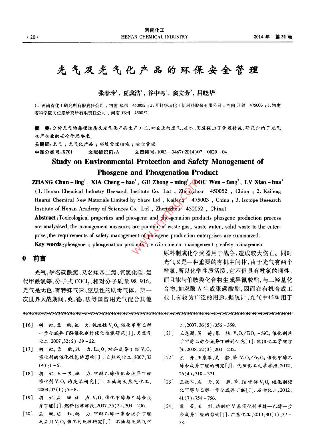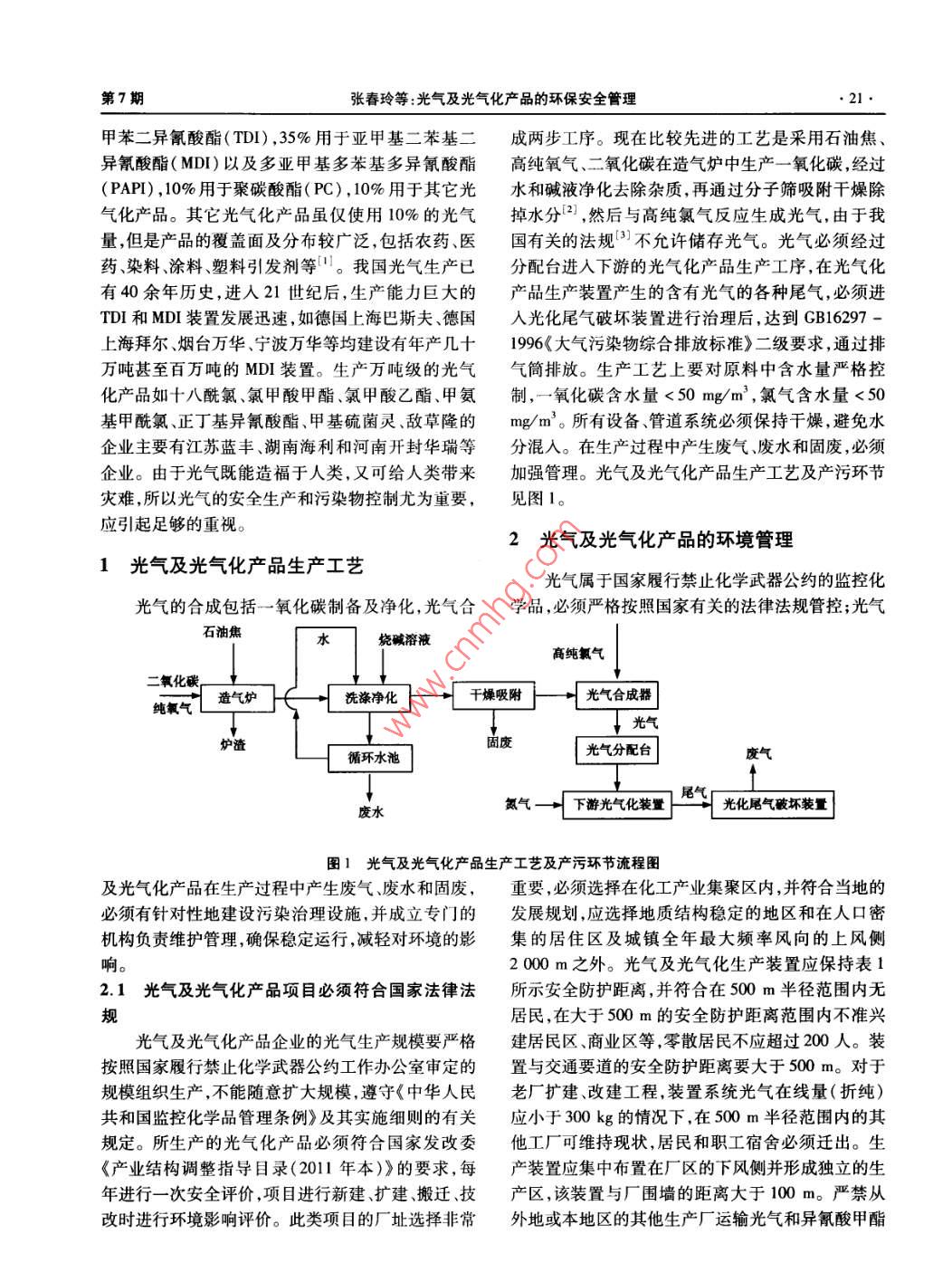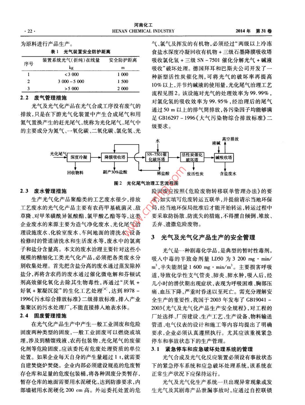 河南化工.HENAN CHEMICAL INDUSTRY2014年第31卷光氣及光氣化產(chǎn)品的環(huán)保安全管理張春玲',夏成浩',谷中鳴',竇文芳,呂曉華’(1.河南省化工研究所有限責(zé)任公司,河南鄭州450052 ;2.開(kāi)封華瑞化工新材料股份有限公司,河南開(kāi)封475003 ;3.河南省科學(xué)院同位素研究所有限責(zé)任公司,河南鄭州450052)摘要:分析光氣的毒理性質(zhì)及光氣化產(chǎn)品生產(chǎn)工藝,對(duì)企業(yè)的廢氣、廢水、固廢提出了管理措施,研究歸納了光氣生產(chǎn)企業(yè)的安全管理要求。關(guān)鍵詞:光氣;光氣化產(chǎn)品;環(huán)境管理措施;安全管理中圖分類號(hào):X701文獻(xiàn)標(biāo)識(shí)碼:A文章編號(hào):1003 - 3467(2014)07 -0020 -04Study on Environmental Protection and Safety Management ofPhosgene and Phosgenation ProductZHANG Chun- ling' , XIA Cheng - hao',GU Zhong - ming',DOU Wen -fang', LV Xiao - hua'(1. Henan Chemical Industry Research Institute Co. Ltd ,Zhengzhou 450052, China ; 2. KaifengHuarui Chemical New Materials Limited by Share Lad,Kaifeng475003,China ; 3. Isotope ResearchInstitute of Henan Academy of Sciences Co. Ltd , Zhengzhou 450052 ,China)Abstract : Toxicological properties and phosgene and phosgenation products phosgene production processare analysised , the management measures are pointout of waste gas, waste water, solid waste to the enter-prise ,the requirements of safety management of phosgene production enterprises are summarzed.Key words : phosgene ; phosgenation products ; environmental management ; safety management原料制成化學(xué)武器用于戰(zhàn)爭(zhēng),造成較大傷亡。同時(shí)0前言光氣又是一種重要的有機(jī)中間體,由于光氣有兩個(gè)光氣,學(xué)名碳酰氯,又名羰基二氯、氧氯化碳、氯酰氯,所以化學(xué)性質(zhì)活潑,它不但具有酰氯的通性,代甲酰氯等,分子式COCl2,相對(duì)分子質(zhì)量98. 916。而且能與伯胺類化合物生成異氰酸酯,與二羥基化光氣是無(wú)色、有特殊氣味、窒息性的劇毒氣體。第一合物,如雙酚A生成聚碳酸酯,因而在有機(jī)合成工次世界大戰(zhàn)期間,英、德、法等國(guó)曾用光氣配合其他業(yè)上有較為廣泛的用途。據(jù)統(tǒng)計(jì),光氣中45%用于*<<*<*<+*<+*<*<*<*<+<+<+<+*<+<+<+<+<+<+*+<+<+*<+<+*<+*<*<*<*<+<*<*<+<+<+<+<+<*+<+<+<*<*<<[16] 胡虹,孟璇,施力.鈮改性V203催化甲醇乙醇工,2007 ,36(5) :356 - 359.-步合成異丁醛催化劑的催化性能研究[J].天然氣[21] 王惠穎,吳 靜,張軼.V20,/Ti02 -SiO,催化劑用化工,2007 ,32(2) :39 -22.于甲醇乙醇合成異丁醛的研究[J].沈陽(yáng)化工學(xué)院學(xué)[17] 胡虹,孟璇,施力.La2O,對(duì)合成異丁醛V203報(bào),2008 ,22(3) :200 -202.催化劑的催化性能的影響[J].天然氣化工,2007 ,32[22] 左丹,王康軍,吳 靜,等. V20/Fe2O,催化甲醇乙(4):1-5.醇合成異丁醛的研究[J].沈陽(yáng)化工大學(xué)學(xué)報(bào),2012,[18] 胡虹,王一男,施 力.甲醇乙醇催化合成異丁醛26(4):318 -321.催化劑V2O3的失活研究[J].石油與天然氣化工,[23]王康軍,左丹,吳靜,等.Fe修飾 V20,摧化劑催2008 ,37(1):5-8.化甲醇與乙醇一步合成異丁醛[J].石油化工,2012,[19]胡虹,孟璇,施力.V2O,催化甲醇與乙醇合成41(7):754 - 756.異丁醛[J].燃料化學(xué)學(xué)報(bào),2007 ,35(2) :203 - 206.24] 裴芳,王剛.助劑對(duì)V基催化劑甲醇一乙醇一步[20] 孟璇,胡虹,施力甲醇乙醇一步合成異丁醛合成異丁醛的影響[J].廣東化工,2013 ,40(1):37 -反應(yīng)用V20,催化的改性研究[J].石油與天然氣化第7期張春玲等:光氣及光氣化產(chǎn)品的環(huán)保安全管理.21.甲苯二異氰酸酯(TDI) ,35%用于亞甲基二苯基二成兩步工序。現(xiàn)在比較先進(jìn)的工藝是采用石油焦、異氰酸酯(MDI)以及多亞甲基多苯基多異氰酸酯高純氧氣、二氧化碳在造氣爐中生產(chǎn)一氧化碳,經(jīng)過(guò)(PAPI) ,10%用于聚碳酸酯( PC), 10%用于其它光水和堿液凈化去除雜質(zhì),再通過(guò)分子篩吸附干燥除氣化產(chǎn)品。其它光氣化產(chǎn)品雖僅使用10%的光氣掉水分口,然后與高純氯氣反應(yīng)生成光氣,由于我量,但是產(chǎn)品的覆蓋面及分布較廣泛,包括農(nóng)藥、醫(yī)國(guó)有關(guān)的法規(guī)(3)不允許儲(chǔ)存光氣。光氣必須經(jīng)過(guò)藥、染料、涂料、塑料引發(fā)劑等”。我國(guó)光氣生產(chǎn)已分配臺(tái)進(jìn)入下游的光氣化產(chǎn)品生產(chǎn)工序,在光氣化有40余年歷史,進(jìn)人21世紀(jì)后,生產(chǎn)能力巨大的產(chǎn)品生產(chǎn)裝置產(chǎn)生的含有光氣的各種尾氣,必須進(jìn)TDI和MDI裝置發(fā)展迅速,如德國(guó)上海巴斯夫、德國(guó).人光化尾氣破壞裝置進(jìn)行治理后,達(dá)到GB16297-上海拜爾煙臺(tái)萬(wàn)華、寧波萬(wàn)華等均建設(shè)有年產(chǎn)幾十1996<大氣污染物綜合排放標(biāo)準(zhǔn)》二級(jí)要求,通過(guò)排萬(wàn)噸甚至百萬(wàn)噸的MDI裝置。生產(chǎn)萬(wàn)噸級(jí)的光氣氣筒排放。生產(chǎn)工藝上要對(duì)原料中含水量嚴(yán)格控化產(chǎn)品如十八酰氯、氯甲酸甲酯、氯甲酸乙酯、甲氨制,一氧化碳含水量<50 mg/m' ,氯氣含水量<50基甲酰氯、正丁基異氰酸酯、甲基硫菌靈、敵草隆的mg/m'。所有設(shè)備、管道系統(tǒng)必須保持干燥,避免水企業(yè)主要有江蘇藍(lán)豐、湖南海利和河南開(kāi)封華瑞等分混入。在生產(chǎn)過(guò)程中產(chǎn)生廢氣、廢水和固廢,必須企業(yè)。由于光氣既能造福于人類,又可給人類帶來(lái)加強(qiáng)管理。光氣及光氣化