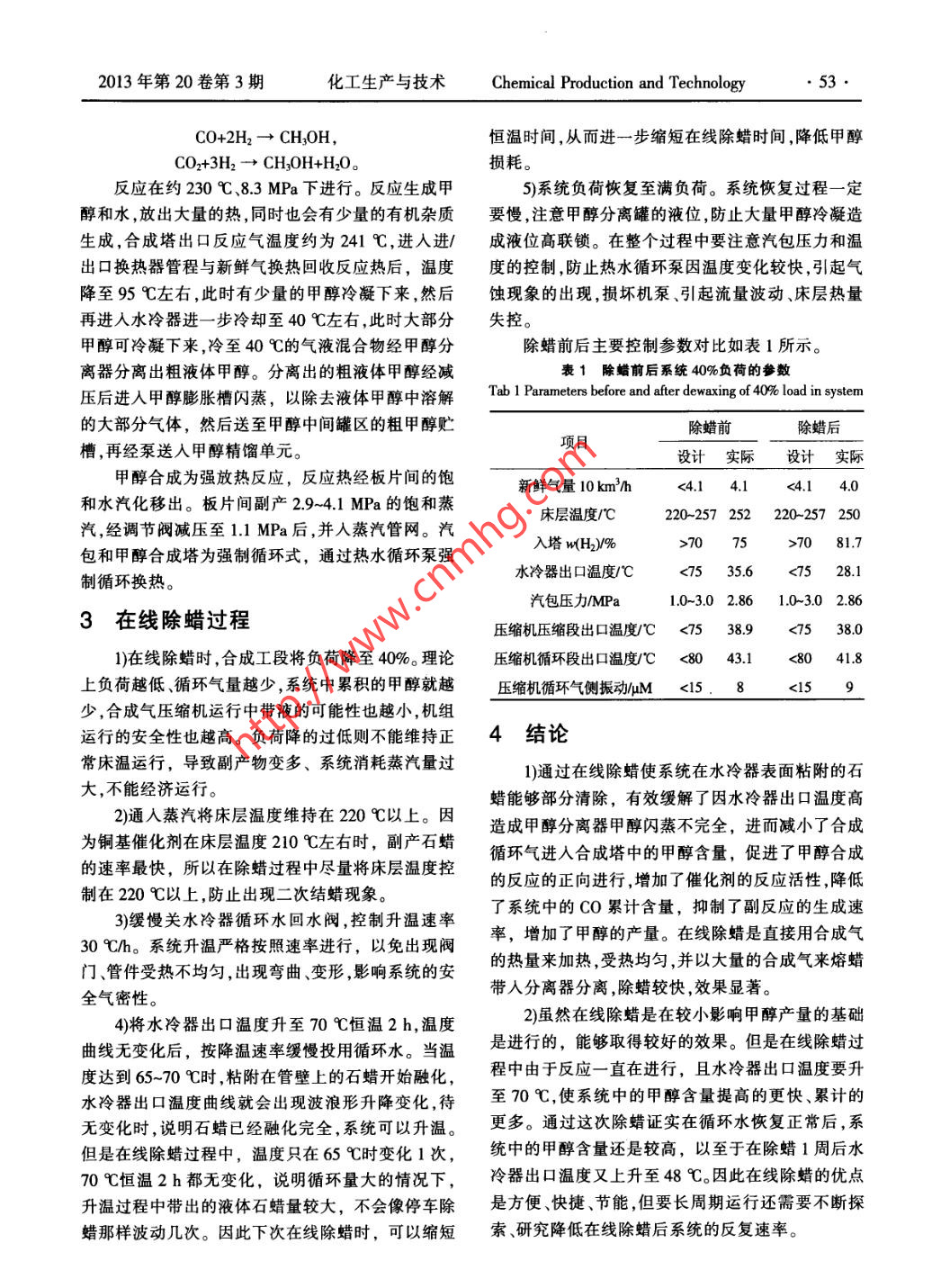 甲醇合成在線除蠟