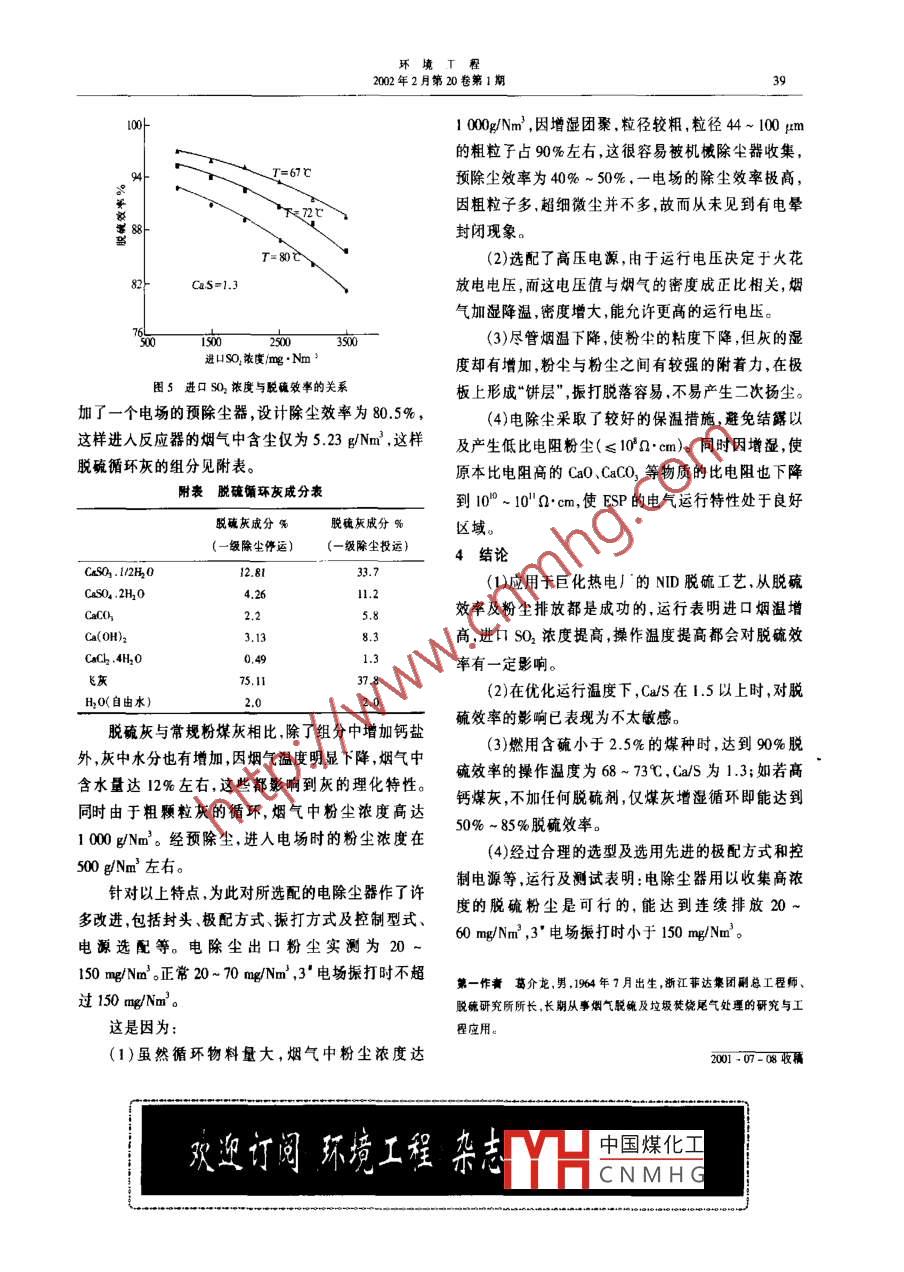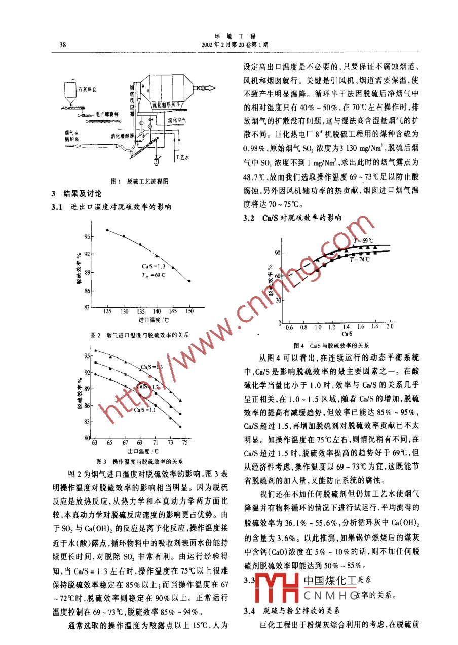 環(huán)境L程2002年2月第20卷第1期NID工藝在國內(nèi)的應(yīng)用與研究葛介龍王新龍李文勇(浙江菲達(dá)機電集團公司,諸31800)A擴要通過ND工藝在巨化熱電廠70MW煙氣脫硫中的工程應(yīng)用,研究了電除塵器收樂高濃度粉塵的可行性,操作溫度、鈣硫比、進口煙氣溫度、進口SO2濃度與脫硫效率的關(guān)系等。關(guān)鍵詞ND工藝工程應(yīng)用研究鍋爐蒸發(fā)量在煙氣脫硫工藝中,循環(huán)半干法煙氣脫硫工藝由進口煙氣量300410Nm3/h于投資低、占用空間小、脫硫效率高、經(jīng)濟性能指標(biāo)優(yōu)最小煙氣量150205Nm3/h等原因越來越受到重視,也成為國家重點推廣的6種進口煙氣溫度138℃脫硫技術(shù)之一。這類技術(shù)包括 ALSTOM的NID工藝;進口粉塵濃度26 g/NmLug公司的CFB工藝;Wuf公司的RCFB工藝及丹進口SO2濃度3 130 mg/Nm麥 Smith公司的SD工藝等。這些工藝正在中國300設(shè)計煤種含硫0.98%MW以下機組的煙氣脫硫工程中成為首選工藝。例設(shè)計脫硫效率如NID工藝已用于巨化熱電廠70MW機組的脫硫工煙氣含氧5%程上;GSD工藝也已用于云南小龍?zhí)峨姀S。巨化脫硫煙氣含水7.95%工程自2001年2月正式投運以來,無論是脫硫效率在脫硫裝置穩(wěn)定運行后,吸收劑改成用電石渣還是粉塵排放都優(yōu)于設(shè)計指標(biāo)。并于2001年8月29粉。因為巨化公司電化廠副產(chǎn)大量電石渣,因此在電日通過浙江省環(huán)保局組織的性能驗收,且移交電廠。廠附近建有一個于燥制粉車間以生產(chǎn)電石渣粉,其主通過調(diào)整工程參數(shù)進行了大量研究,證明NID系統(tǒng)具要成分為Ca(OH2。干燥制得的電石渣粉理化參數(shù)有布置靈活操作簡便;煤種易適應(yīng);性能價格比好,為:純度80~92%,粒徑8-23pm,密度0.55脫硫效率高等特點并具有在火電廠25-300MW機0.6g/cm3(含水<2%),比表面積17.1-19.4m2組上推廣的良好前景;到目前為止,此種工藝在垃圾其脫硫工藝流程見圖1。焚燒尾氣處理上具有很高的市場占有率。該工程2001年2月投人正式運行,出口溫度62工程概況73℃,Ca/S=1.2~1.3脫硫效率85%~94%,出口巨化熱電廠8機爐是新建工程主要設(shè)計參數(shù)粉塵濃度20-150mg/Nm3如下某水泥廠生料磨煙氣除塵中使用的管式電除塵器,正2劉后啟林宏電收塵器.北京:中國建筑工業(yè)出版社,983常運行已達(dá)4a,除塵器的除塵效率高達(dá)98%以上,每3±成漢澤[美HJ懷特著工業(yè)電收塵北京:冶金工業(yè)出版社,年回收生料原料8001取得了明顯的經(jīng)濟效益和社4李向陽,羅魁元XDC型組合式多管旋流電除塵器在某廠應(yīng)用的改會效益。管式電除塵器應(yīng)用于中小型窯爐煙氣的治進工業(yè)安全與防塵,1997理是切實可行的,其運行穩(wěn)定可靠具有推廣價值。參考文獻第一作者中國煤化工業(yè)于中南工業(yè)大學(xué)譚天佑,梁鳳珍.工業(yè)通風(fēng)除塵技術(shù)北京:中國建筑工業(yè)出版社,工學(xué)學(xué)士CNMHG2001-05-24收稿環(huán)境T程2002年2月第20卷第1期定高出口溫度是不必要的,只要保證不腐蝕煙道、風(fēng)機和煙囪就行。關(guān)鍵是引風(fēng)機、煙道需要保溫,使石灰料倉不致產(chǎn)生明顯溫降。循環(huán)半干法因脫硫后凈煙氣中形灰斗7相對濕度只有在70℃左右操作時,排電子螺旋稱流化空氣放煙氣的擴散沒有問題,這與濕法高含濕量煙氣的擴店氣從蝸爐來消化增濕器散不同。巨化熱電廠8‘機脫硫工程用的煤種含硫為0.98%,原始煙氣SO2濃度為3130mgNm2,脫硫后煙工藝水氣中SO濃度不到Img/Nm3,求出此時的煙氣露點為1脫硫工藝流程圖48.7℃,故而我們選取操作溫度69~73℃足以防止酸3結(jié)果及討論腐蝕,另外因風(fēng)機軸功率的熱貢獻,煙囪進囗煙氣溫3.1進出口溫度對脫硫效率的彩響度將達(dá)70~75℃。32CaS對脫硫效率的影響T=69C8由畝南南一進口溫度℃141.6圖2煙氣進冂溫度與脫硫效率的關(guān)系圖4CaS與脫婉效率的關(guān)系從圖4可以看出,在連續(xù)運行的動態(tài)平衡系統(tǒng)中,Ca/S是影響脫碗效率的最主要因素之一。在酸cas堿化學(xué)當(dāng)量比小于1.0時,效率與CaS的關(guān)系幾乎呈正相關(guān),在1.0~1.5區(qū)域,隨著CaS的增加,脫硫器86效率的提高有減緩趨勢,但效率已能達(dá)85%~%5%,CaS超過15,再增加脫硫劑對脫硫效率貢獻已不太明顯。如操作溫度在75℃左右,則情況稍有不同,在出口溫度:℃CaS超過1.5時,脫硫效率提高的趨勢好于69℃,但圖3操作溫度與脫效的關(guān)系圖2為煙氣進口溫度對脫硫效率的影響。圖3表從經(jīng)濟性考慮操作溫度以69-73℃為宜,這既能節(jié)明操作溫度對脫硫效率的影響相當(dāng)明顯。因為脫碗省脫硫劑的加入量,又能防止系統(tǒng)的腐蝕。我們還在不加任何脫硫劑但仍加工藝水使煙氣反應(yīng)是放熱反應(yīng),從熱力學(xué)和本真動力學(xué)兩方面比較本真動力學(xué)對脫硫反應(yīng)速度的影響更占優(yōu)勢。由降溫并有物料循環(huán)的情況下進行試運行,平均測得的于SO2與Ca(OH)2的反應(yīng)是離子化反應(yīng)操作溫度接脫硫效率為36.1%-56%,分析循環(huán)灰中Ca(OH)2近于水(酸)露點循環(huán)物料中的吸收劑表面水份能持的含量為36%。以此推測,如果鍋爐燃燒后的煤灰續(xù)更長時間,對脫除SO2非常有利。由運行經(jīng)驗得中含鈣(CaO)濃度在5%~10%的話則不加任何脫知當(dāng)CS=13左右時操作溫度在75℃以上很難硫劑脫硫效率即能達(dá)到50%-85%保持脫硫效率穩