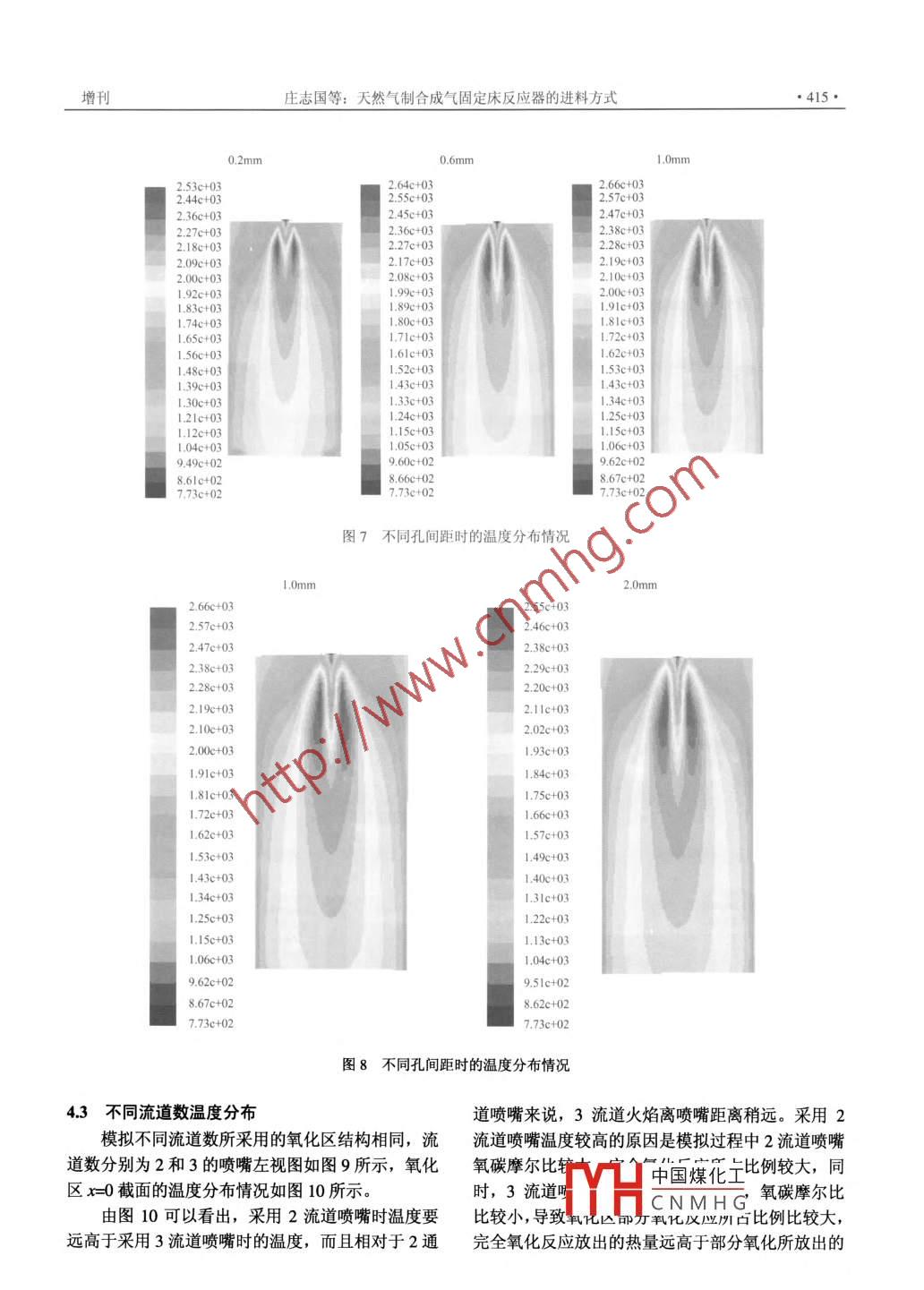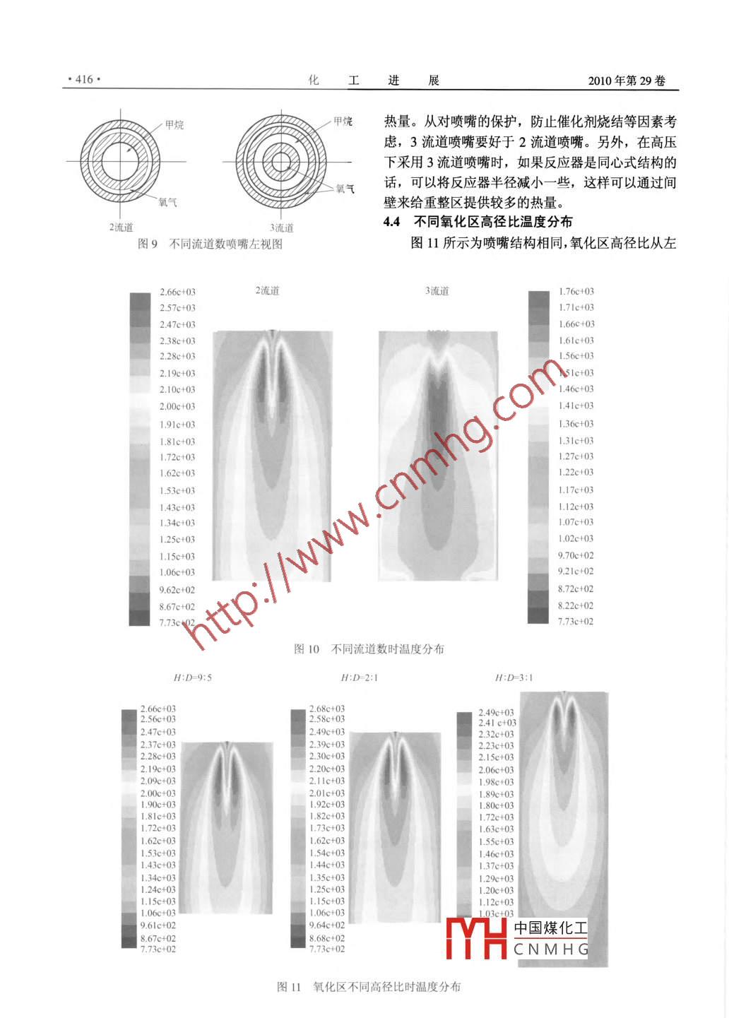 化工進(jìn)展2010年第29卷增刊CHEMICAL INDUSTRY AND ENGINEERING PROGRESS·411·天然氣制合成氣固定床反應(yīng)器的進(jìn)料方式莊志國,魏偉勝,徐建(中國石油大學(xué)(北京)CNPC催化重點(diǎn)實(shí)驗(yàn)室,北京102249)摘要:對(duì)高壓下適于工業(yè)規(guī)模的進(jìn)料方式進(jìn)行了討論,得出采用反應(yīng)器內(nèi)混合進(jìn)料是最佳的進(jìn)料方式。采用CFD軟件 Fluent對(duì)實(shí)驗(yàn)所用噴嘴及反應(yīng)器進(jìn)行了數(shù)值模擬,其中,湍流模型選擇標(biāo)準(zhǔn)k-ε模型,用通用有限速率模型及渦耗散模型計(jì)算組分輸運(yùn)和化學(xué)反應(yīng)。結(jié)果顯示氧化區(qū)內(nèi)氧碳摩爾比與溫度分布和實(shí)驗(yàn)值吻合較好,說明模擬結(jié)果是可信的。通過考察不同噴嘴及氧化區(qū)結(jié)構(gòu)的溫度分布得出:收縮角在10°,15°和20°中,15°為宜,孔間距在0.2~2mm中,0.6mm為宜,3流道噴嘴優(yōu)于2流道噴嘴,而氧化區(qū)采用高徑比為3:1的B型結(jié)構(gòu)較好關(guān)鍵詞:天然氣;合成氣;進(jìn)料方式;CFD模擬;溫度分布天然氣制合成氣是天然氣大規(guī)模利用的主要混合型,天然氣和氧氣反應(yīng)器內(nèi)混合型,氧分布器途徑,合成氣制備過程的設(shè)備投資和操作費(fèi)用占全型以及分步進(jìn)氧型四種類型。過程投資和操作費(fèi)用的50%~75%,改進(jìn)和革新造預(yù)混合型是指原料氣在進(jìn)入反應(yīng)器之前就預(yù)氣過程是天然氣化工利用節(jié)能降耗的關(guān)鍵。合成先混合好,然后一同進(jìn)入反應(yīng)器進(jìn)行反應(yīng)。 Barrio氣的后續(xù)利用過程(包括FT合成,合成氨的生產(chǎn)等6驗(yàn)證催化部分氧化和蒸汽重整反應(yīng)器模型時(shí)以及甲醇的制備)都是在高壓(2MPa以上)條件所采用的就是這種進(jìn)料方式。預(yù)混合可以將原料下進(jìn)行的,原料氣中的天然氣也是通過高壓輸氣管氣充分混合,但是,容易發(fā)生爆炸,操作危險(xiǎn),線輸運(yùn)的,這就要求天然氣制合成氣過程必須在它只適用于實(shí)驗(yàn)室小試或催化劑評(píng)價(jià)實(shí)驗(yàn),而對(duì)高壓下進(jìn)行。但是,合成氣制備的主要反應(yīng)是一于稍大型的實(shí)驗(yàn),因反應(yīng)放熱量大將使原料氣溫個(gè)體積增大的反應(yīng),高壓對(duì)反應(yīng)不利23。為了得度升高,在預(yù)混合過程中就會(huì)出現(xiàn)燃燒反應(yīng),即到和常壓同樣的合成氣收率就需要提高反應(yīng)溫回火問題度,然而,工業(yè)上要想在800~900℃的基礎(chǔ)上提反應(yīng)器內(nèi)混合型與預(yù)混合型正好相反,原料氣高反應(yīng)溫度,供熱是比較困難的,因此,可以通由各自孔道(如噴嘴)分別進(jìn)入反應(yīng)器,在反應(yīng)器過提高原料氣的預(yù)熱溫度來提高反應(yīng)溫度。通過內(nèi)進(jìn)行混合后反應(yīng)。反應(yīng)器內(nèi)混合型雖然不會(huì)有爆熱力學(xué)計(jì)算得出最佳的預(yù)熱溫度為773~923K,炸的危險(xiǎn),但是如果原料氣混合不均勻,就會(huì)產(chǎn)生在如此高的預(yù)熱溫度下,原料氣如何進(jìn)入反應(yīng)器積碳以及高溫?zé)狳c(diǎn)。采用反應(yīng)器內(nèi)混合的關(guān)鍵是如并快速均勻的混合便成了急需解決的問題。如果何實(shí)現(xiàn)原料氣的快速均勻混合原料氣混合不均勻,就會(huì)出現(xiàn)富甲烷區(qū)和富氧區(qū),華東理工大學(xué)發(fā)明的帶有內(nèi)分布器的三流道在富氧區(qū)會(huì)發(fā)生甲烷的完全氧化反應(yīng),放出大量天然氣部分氧化制合成氣噴嘴,主要采用的就是的熱量,造成局部的高溫?zé)狳c(diǎn);在富甲烷區(qū),甲天然氣與氧氣在反應(yīng)器內(nèi)混合的內(nèi)混合型。如圖1烷在高溫下會(huì)發(fā)生高溫裂解而產(chǎn)生積碳,影響過和圖2所示。噴嘴主要由中心流道、內(nèi)環(huán)隙流道程的穩(wěn)定性及整個(gè)反應(yīng)的順利進(jìn)行。另外,天然外環(huán)流道、內(nèi)分布器和冷卻系統(tǒng)諸零部件組合安裝氣在氧氣中的爆炸極限為50%~600%,盡可能而成。由于這一噴嘴在其噴口處形成了兩股天然氣保證最高的安全性是必要的。因此,采用什么樣夾氣化劑(氧氣)的流動(dòng)形態(tài),促進(jìn)了氣化劑與天的進(jìn)料方式對(duì)天然氣催化部分氧化制合成氣過程然氣的快速均勻混合,從而提高天然氣的轉(zhuǎn)化率和至關(guān)重要。氣化爐出口中國煤化工氣體流速和縮適于工業(yè)規(guī)模的進(jìn)料方式小噴口收縮CNMHG撚燒強(qiáng)度。此外通過設(shè)置冷卻系統(tǒng)——水冷夾套,良好地保護(hù)了原料氣的進(jìn)料方式可以分為天然氣和氧氣預(yù)噴嘴,延長(zhǎng)了噴嘴的使用壽命。412·化工進(jìn)展2010年第29卷比如:采用分步進(jìn)氧進(jìn)料的方式中,一段出口處反應(yīng)溫度高達(dá)1073~1273K,在此加入二段氧后很容易立刻發(fā)生均相燃燒反應(yīng),而且催化劑床層的中段仍然存在高溫?zé)狳c(diǎn)。綜上所述,適于工業(yè)規(guī)模的進(jìn)料方式最好采用雙流道外混合型噴嘴。使原料氣通過噴嘴的各流道分別噴入到反應(yīng)器內(nèi),并快速均勻混合2數(shù)值模擬2.1物理模型圖3所示為模擬過程所用的其中一種噴嘴及氧圖1燒嘴外形圖化區(qū)結(jié)構(gòu)示意圖。氧化區(qū)頂部為一雙流道外混合型噴嘴,中心流道走天然氣,外圍流道走氧氣,也可以
