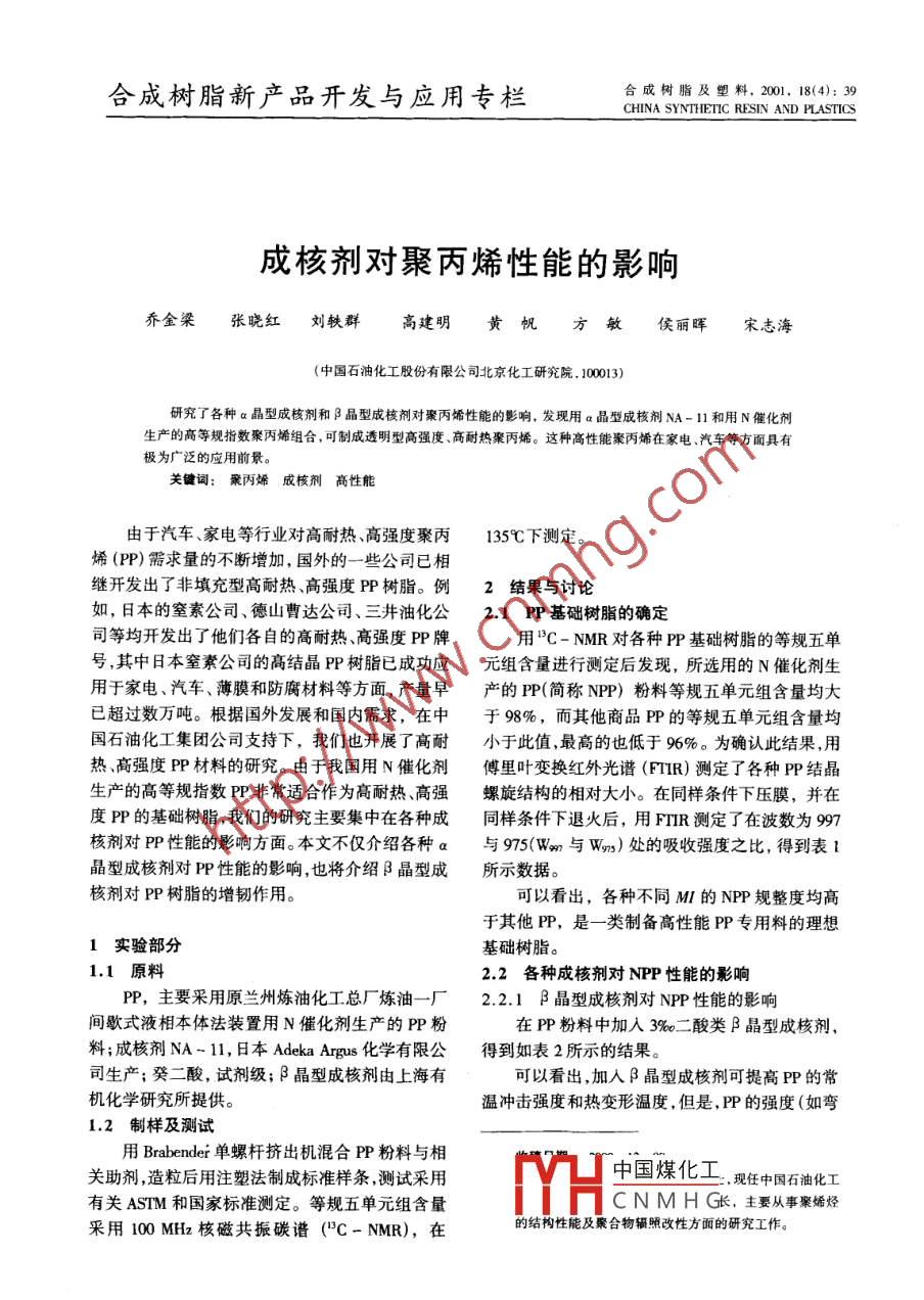 合成樹脂新產(chǎn)品開發(fā)與應(yīng)用專欄合成樹脂及塑料,2001,18(4):39CHINA SYNTHETIC RESIN AND PLASTICS成核劑對聚丙烯性能的影響喬金梁張曉紅劉軼群高建明黃帆方敏侯麗暉宋志海(中國石油化工股份有限公司北京化工研究院,1003)研究了各種a晶型成核劑和阝晶型成核劑對聚丙烯性能的影響,發(fā)現(xiàn)用a晶型成核劑NA-11和用N催化劑生產(chǎn)的高等規(guī)指數(shù)聚丙烯組合,可制成透明型高強(qiáng)度、高耐熱聚丙烯。這種高性能案丙烯在家電、汽車等方面具有極為廣泛的應(yīng)用前景。關(guān)鍵詞:聚丙烯成核劑高性能由于汽車、家電等行業(yè)對高耐熱、高強(qiáng)度聚丙135℃下測定。烯(P)需求量的不斷增加,國外的一些公司已相繼開發(fā)出了非填充型高耐熱、高強(qiáng)度P樹脂。例2結(jié)果與討論如,日本的窒素公司、德山曹達(dá)公司、三井油化公2.1P基礎(chǔ)樹脂的確定司等均開發(fā)出了他們各自的高耐熱、高強(qiáng)度PP牌用C-NMR對各種PP基礎(chǔ)樹脂的等規(guī)五單號,其中日本窒素公司的高結(jié)晶PP樹脂已成功應(yīng)元組含量進(jìn)行測定后發(fā)現(xiàn),所選用的N催化劑生用于家電、汽車、薄膜和防腐材料等方面,產(chǎn)量早產(chǎn)的PP(簡稱NPP)粉料等規(guī)五單元組含量均大已超過數(shù)萬噸。根據(jù)國外發(fā)展和國內(nèi)需求,在中于98%,而其他商品PP的等規(guī)五單元組含量均國石油化工集團(tuán)公司支持下,我們也開展了高耐小于此值最高的也低于96%。為確認(rèn)此結(jié)果,用熱、高強(qiáng)度PP材料的研究。由于我國用N催化劑傅里葉變換紅外光譜(FIR)測定了各種PP結(jié)晶生產(chǎn)的高等規(guī)指數(shù)PP非常適合作為高耐熱、高強(qiáng)螺旋結(jié)構(gòu)的相對大小。在同樣條件下壓膜,并在度PP的基礎(chǔ)樹脂我們的研究主要集中在各種成同樣條件下退火后,用FmR測定了在波數(shù)為99核劑對PP性能的影響方面。本文不僅介紹各種a與975(W與W3)處的吸收強(qiáng)度之比,得到表1晶型成核劑對P性能的影響,也將介紹阝晶型成所示數(shù)據(jù)。核劑對PP樹脂的增韌作用??梢钥闯?各種不同M的NPP規(guī)整度均高于其他PP,是一類制備高性能PP專用料的理想1實驗部分基礎(chǔ)樹脂。1.1原料22各種成核劑對NPP性能的影響PP,主要采用原蘭州煉油化工總廠煉油一廠2.2.1β晶型成核劑對NPP性能的影響間歇式液相本體法裝置用N催化劑生產(chǎn)的PP粉在PP粉料中加人3%二酸類β晶型成核劑料;成核劑NA-1,日本 Adeka Argus化學(xué)有限公得到如表2所示的結(jié)果司生產(chǎn);癸二酸,試劑級;β晶型成核劑由上海有可以看出,加入β晶型成核劑可提高PP的常機(jī)化學(xué)研究所提供。溫沖擊強(qiáng)度和熱變形溫度,但是,PP的強(qiáng)度(如彎1.2制樣及測試用 Brabender單螺桿擠出機(jī)混合PP粉料與相關(guān)助劑,造粒后用注塑法制成標(biāo)準(zhǔn)樣條,測試采用有關(guān)ASIM和國家標(biāo)準(zhǔn)測定。等規(guī)五單元組含量H中國煤化工,現(xiàn)任中國石油化工CNMHG長,主要從事聚烯烴采用100MHz核磁共振碳譜(C-MMR),在能及聚合物輛照改性方面的研究工作合成樹脂及塑料2001年第18卷表1不同PP樹脂W與Ws的比值PpNPP-INPP-2NPP-3 NPP-4體流動指數(shù)(MDAg·(10mn)-1]3.5注0.94:TPP、HPP為國外催化劑生產(chǎn)的PP。表2阝晶型成核劑對PP性能的影響到的高性能PP性能如表5所示。表5NA-11用量對NPP性能的影響性能彎曲模熱變形Dm口沖擊強(qiáng)量/GPa溫度x度/(J·m-1)(23℃)NA-1)用量未加成核劑熱變形溫度℃121132加入β晶型成核劑1.413彎曲模量GPa1.82.12.32.32.3曲模量)下降。彎曲強(qiáng)度MPa40464949502.2.2癸二酸對NPP性能的影響laod口沖擊強(qiáng)度/(J·m1)(23℃)癸二酸是一種成本很低的a晶型成核劑,可有效地提高PP各項性能,加入1%癸二酸的PP可以看出,NA-11用量達(dá)到3%時,PP性能性能如表3所示達(dá)到最佳,NA-11用量超過3%后,PP性能沒有衰3癸二酸對NPP性能的影響新的提高。因此,對NPP而言,NA-11的最佳用量應(yīng)為1‰~3性能熱變形溫I∞峽口沖擊強(qiáng)度/彎曲模彎曲強(qiáng)(·m1)(23℃)量GPa度/MPa2.3.2PP的M對改性NPP性能的影響PP的M對NA-11改性NPP的影響較大未加成核劑116實驗結(jié)果如圖1所示。加入癸二酸130l.7可以看出,加入癸二酸成核劑不但可提高PP的強(qiáng)度和熱變形溫度,還可提高PP的沖擊強(qiáng)度。22,3NA-11對NPP性能的影響本文作者在國內(nèi)首先將NA-1應(yīng)用于PP樹脂的改性研究中,證實它可有效地提高PP的耐熱性和強(qiáng)度。NPP添加3%NA-11后,性能如2表4所示M/g·(10mn)-1衰4NA-11對NPP性能的影響圖1PP的M對改性NPP性能的影響性能熱變形溫x缺峽口沖擊強(qiáng)度/彎曲??淝鷱?qiáng)(2、4:未加成核劑;13:加成核劑)從圖1可以看出,較高M(jìn)的PP對制備高強(qiáng)未加成核劑121211.840度、高耐熱PP有利。這主要是因為高M(jìn)的PP分加入NA-11子量較小,結(jié)晶比較容易,結(jié)晶度較高,因此,強(qiáng)度可以看出,NA-11可大幅度地提高PP的熱和耐熱溫度較高。變形溫度、彎曲模量和彎曲強(qiáng)度,與NP結(jié)合可2.3.3NA-11對共聚NPP性能的影響制備出性能優(yōu)異的高耐熱、高強(qiáng)度PP樹脂NA-11不僅可改善均聚PP的性能,也可改2.3非填充型高耐熱、高強(qiáng)度PP的研制進(jìn)共聚PP的性能。表6為用N催化劑在 Phillips從以上研究可以看出,成核劑NA-11是制環(huán)管裝置生產(chǎn)的抗沖共